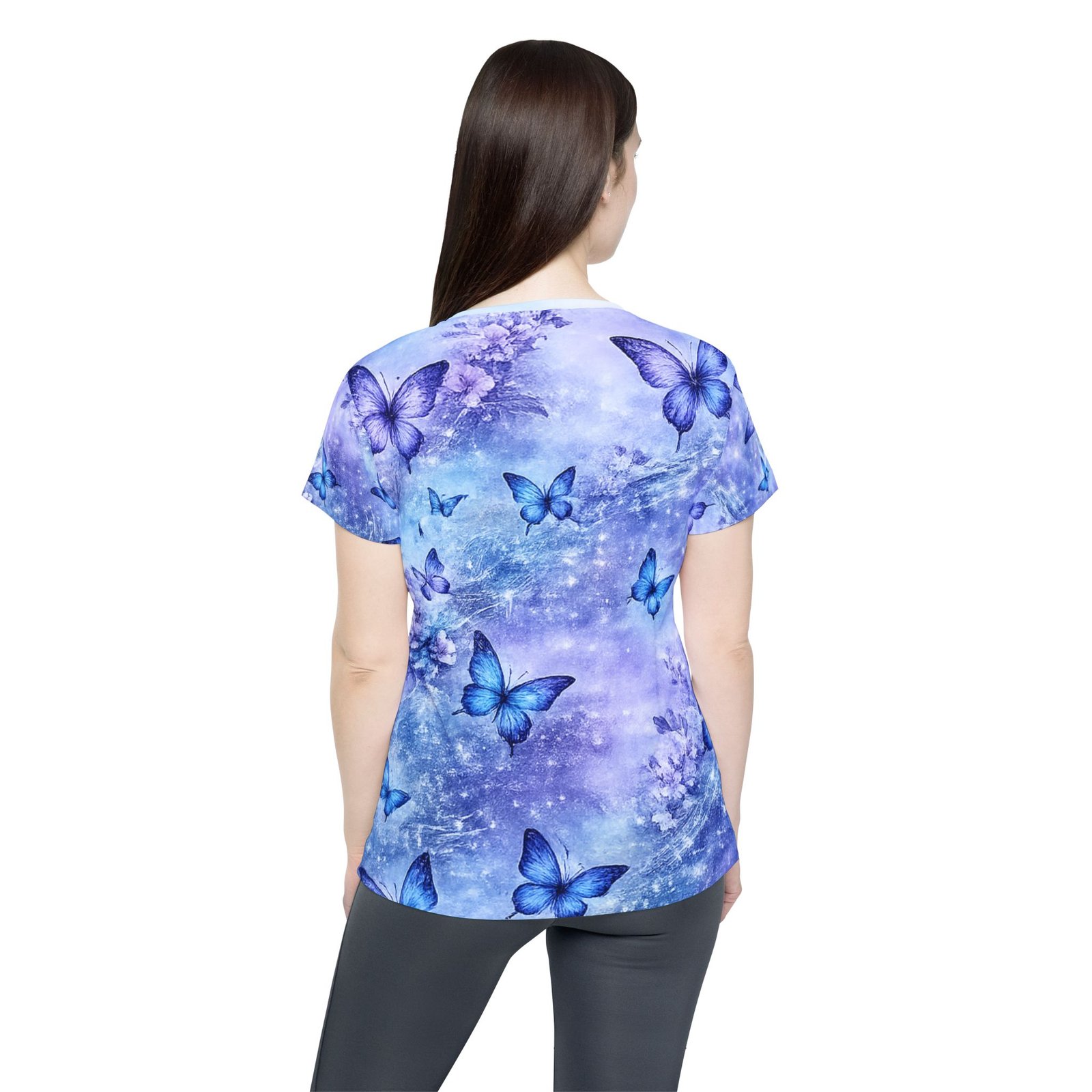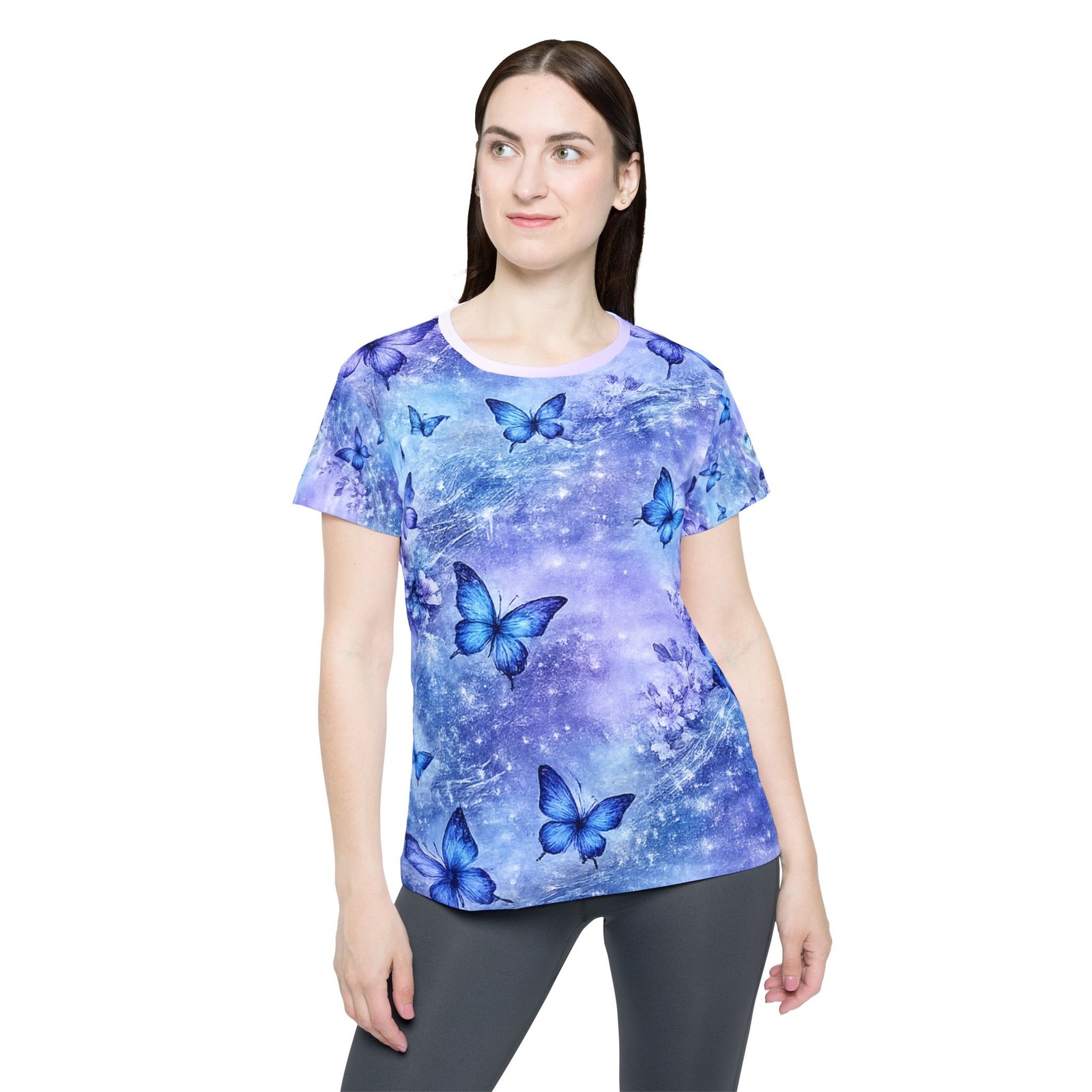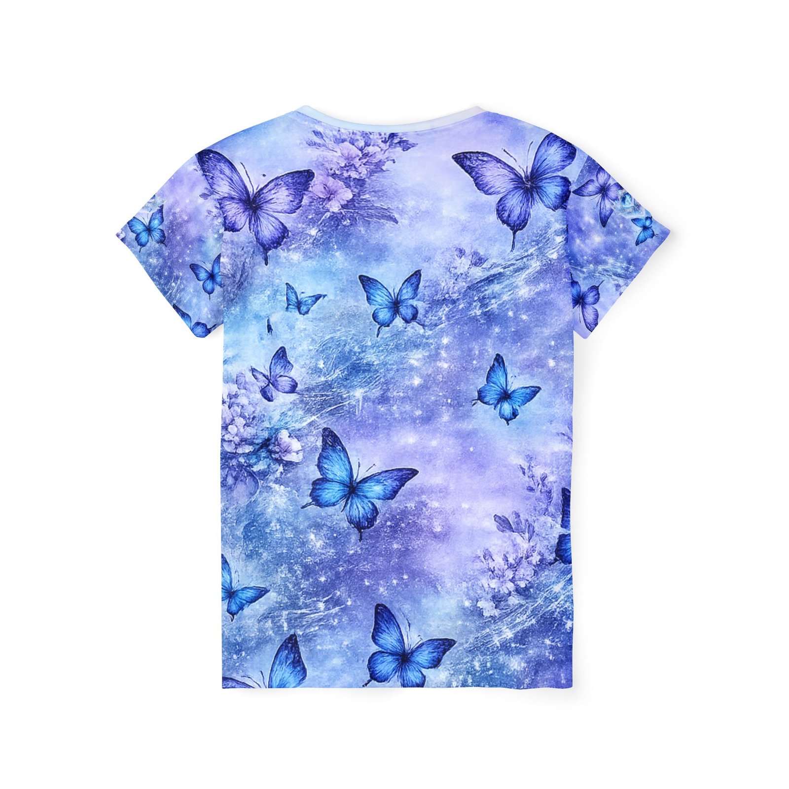 Float into a quiet, shimmering moment with this lightweight sports jersey. Soft, moisture-wicking polyester carries a dreamy wash of lavender and sky blue, where delicate blue butterflies drift across a subtle starry haze. The classic fit and ribbed collar give it a familiar, easy silhouette while the all-over print keeps the design flowing seamlessly around the body. Wear it after a run, during a cool-down walk, or layered under a jacket for a touch of gentle color — it feels airy against the skin and keeps you moving without clinging.