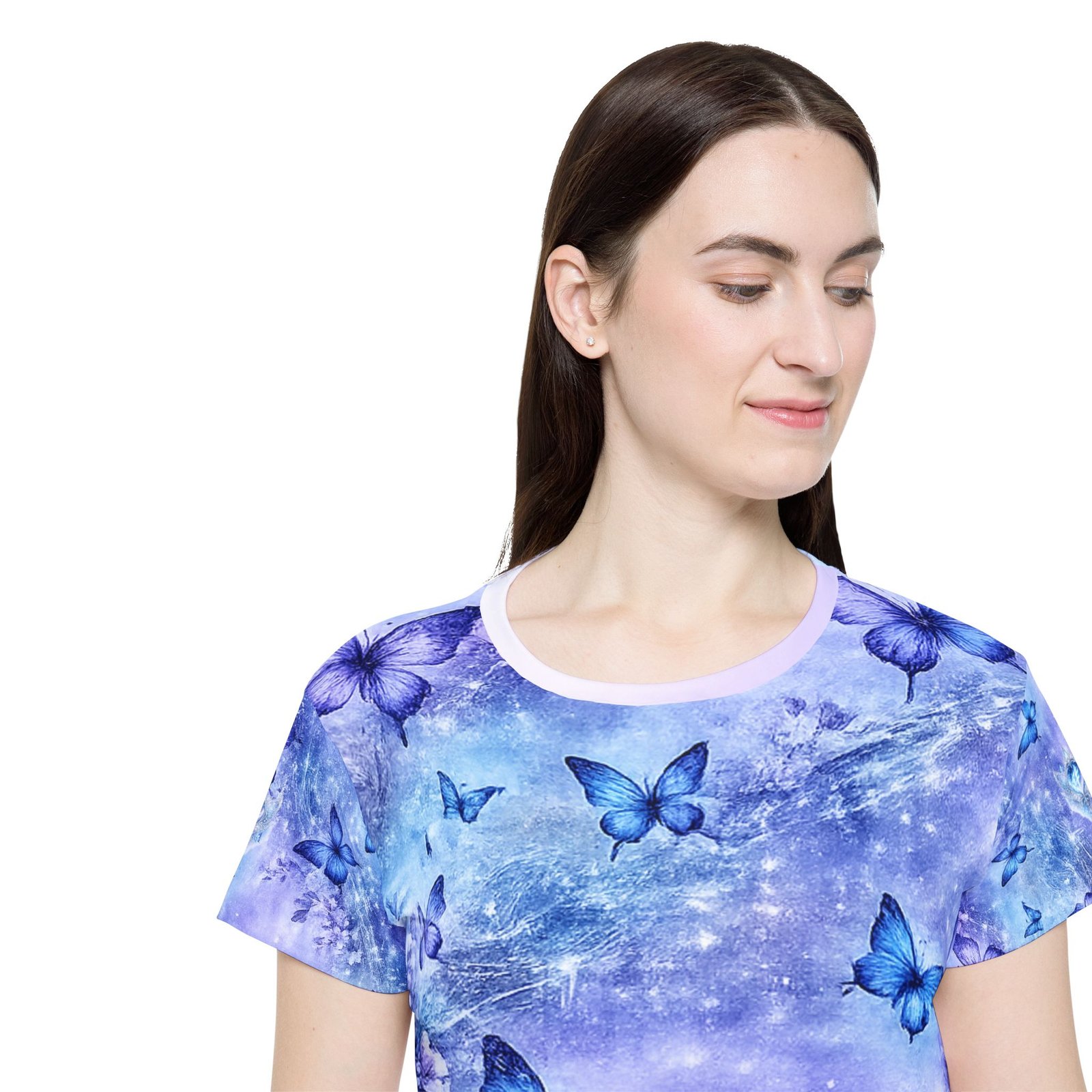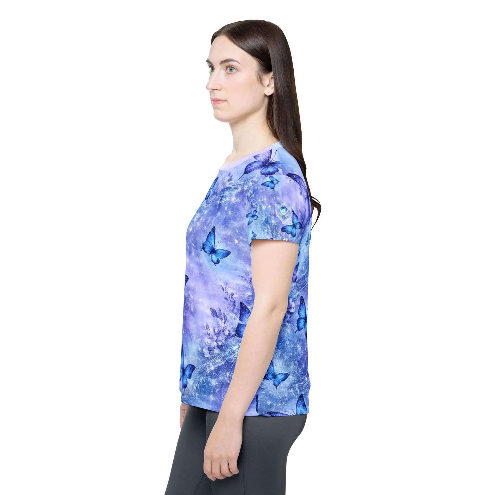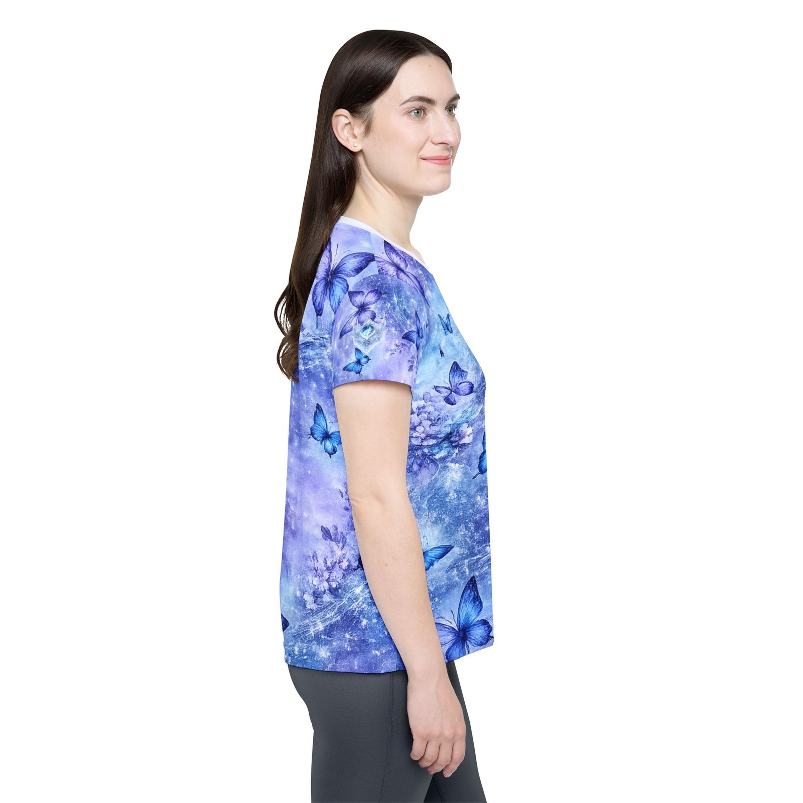 Float into a quiet, shimmering moment with this lightweight sports jersey. Soft, moisture-wicking polyester carries a dreamy wash of lavender and sky blue, where delicate blue butterflies drift across a subtle starry haze. The classic fit and ribbed collar give it a familiar, easy silhouette while the all-over print keeps the design flowing seamlessly around the body. Wear it after a run, during a cool-down walk, or layered under a jacket for a touch of gentle color — it feels airy against the skin and keeps you moving without clinging.