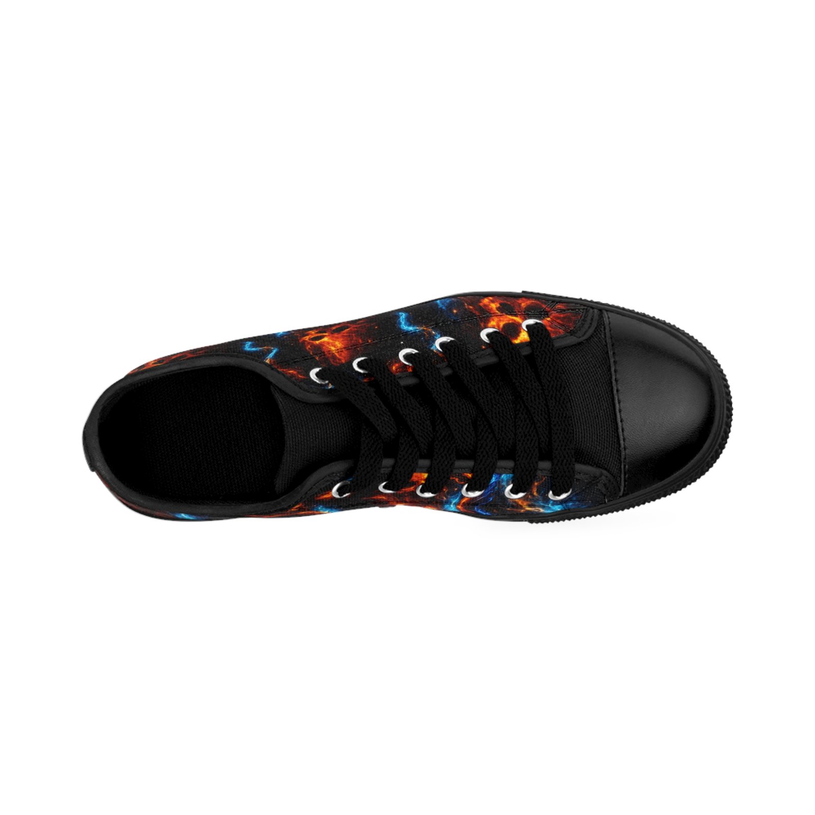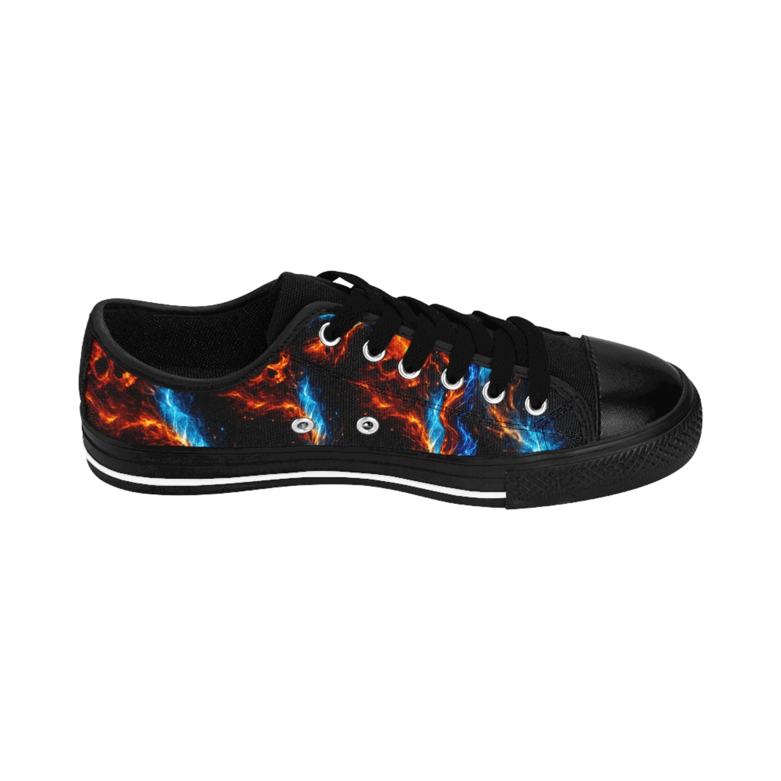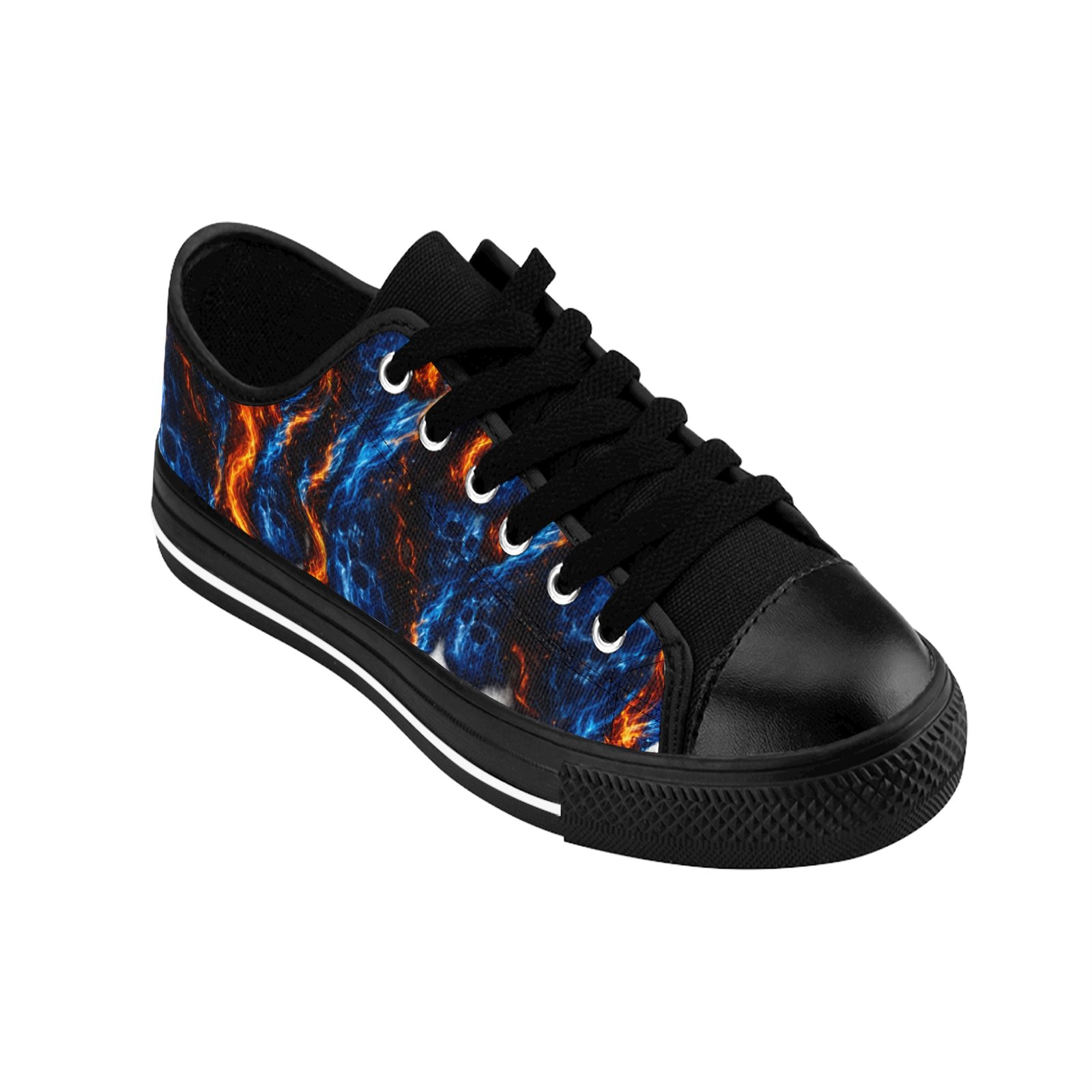These low-top canvas sneakers bring bold, molten energy to everyday wear. Deep blues ripple into ember-orange veins across a durable nylon canvas, creating a fiery, dynamic look that feels alive with movement. The foamed lining and soft foam insole cushion each step and keep feet ventilated, while the pleather-covered round toe and rubber outsole stand up to streetwear wear-and-tear. Metal eyelets and classic lace-up styling add a familiar, gritty edge—great for nights out, art shows, skate sessions, or simply turning heads on the commute.