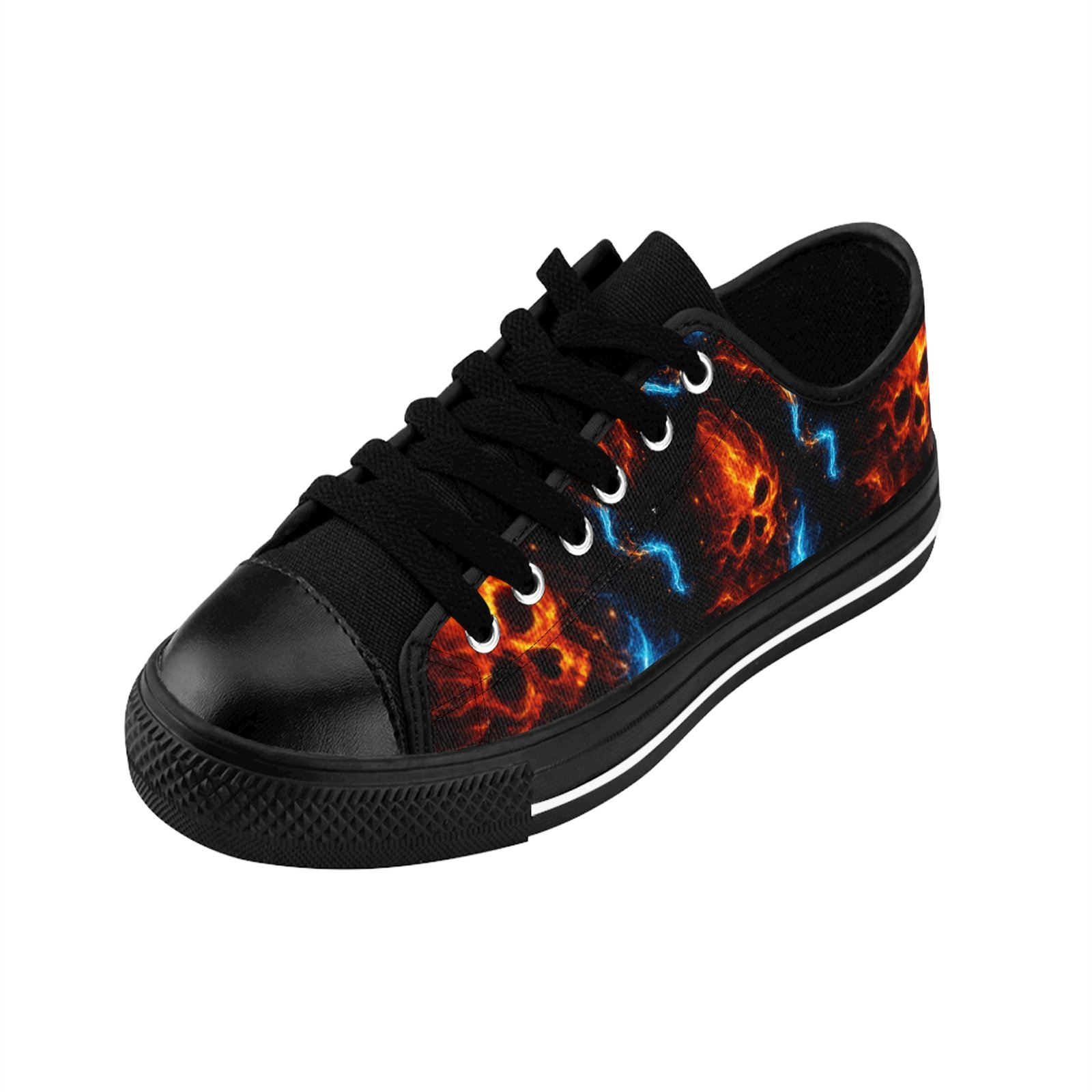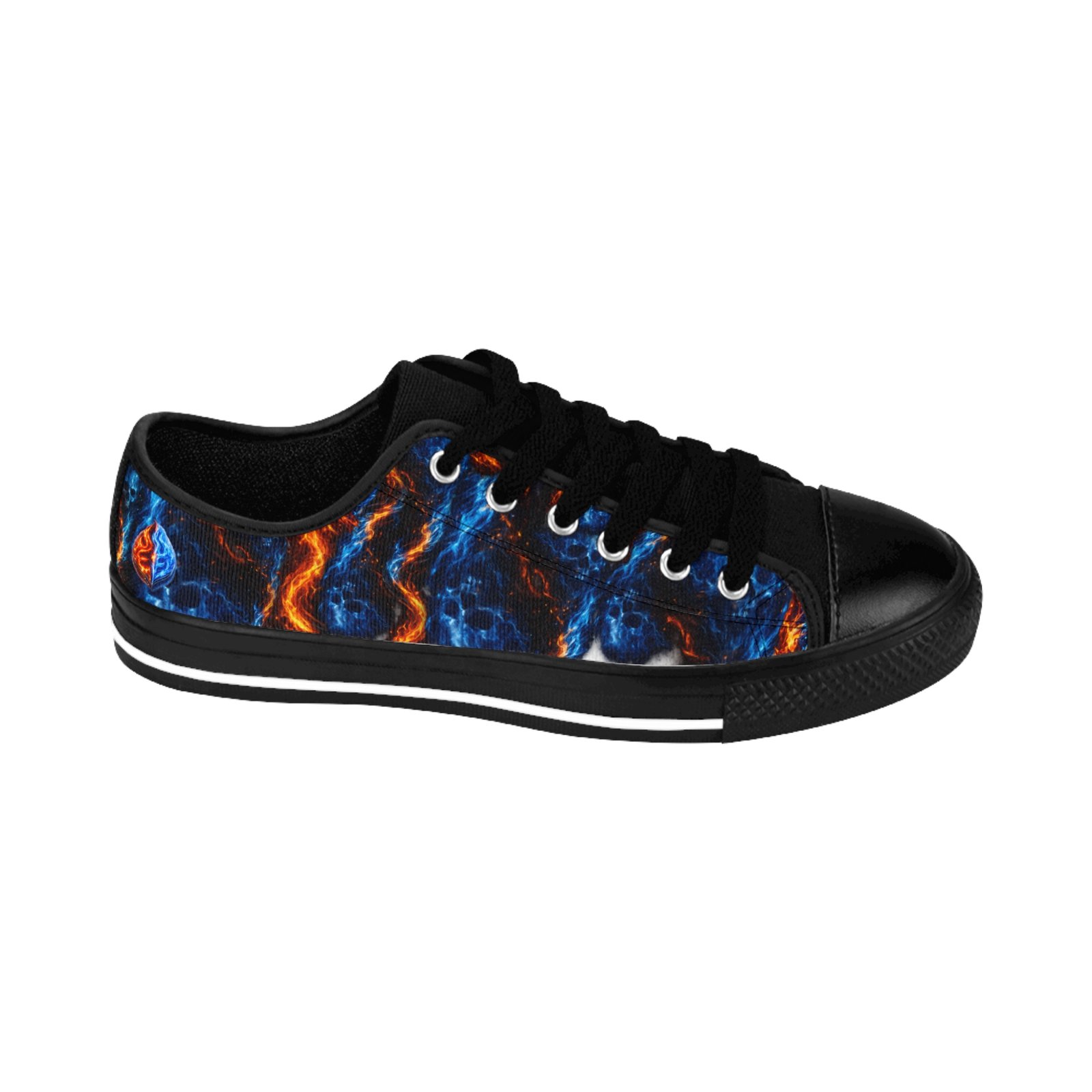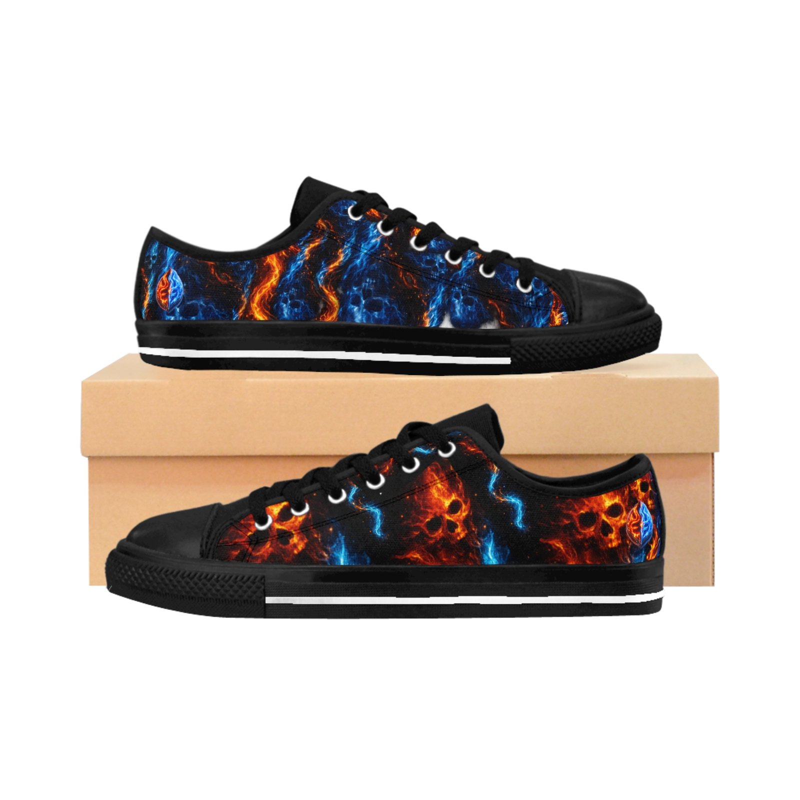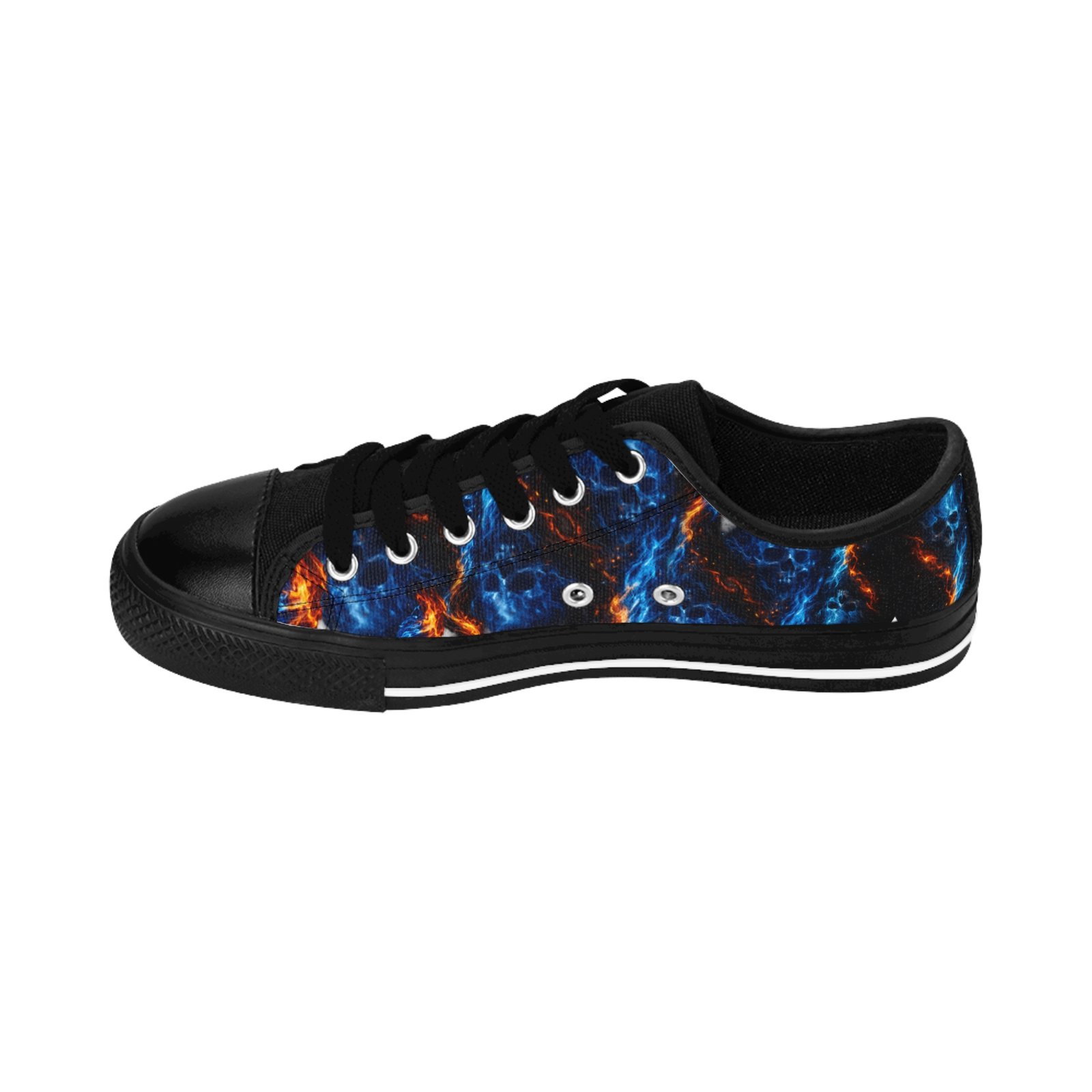 These low-top canvas sneakers bring bold, molten energy to everyday wear. Deep blues ripple into ember-orange veins across a durable nylon canvas, creating a fiery, dynamic look that feels alive with movement. The foamed lining and soft foam insole cushion each step and keep feet ventilated, while the pleather-covered round toe and rubber outsole stand up to streetwear wear-and-tear. Metal eyelets and classic lace-up styling add a familiar, gritty edge—great for nights out, art shows, skate sessions, or simply turning heads on the commute.