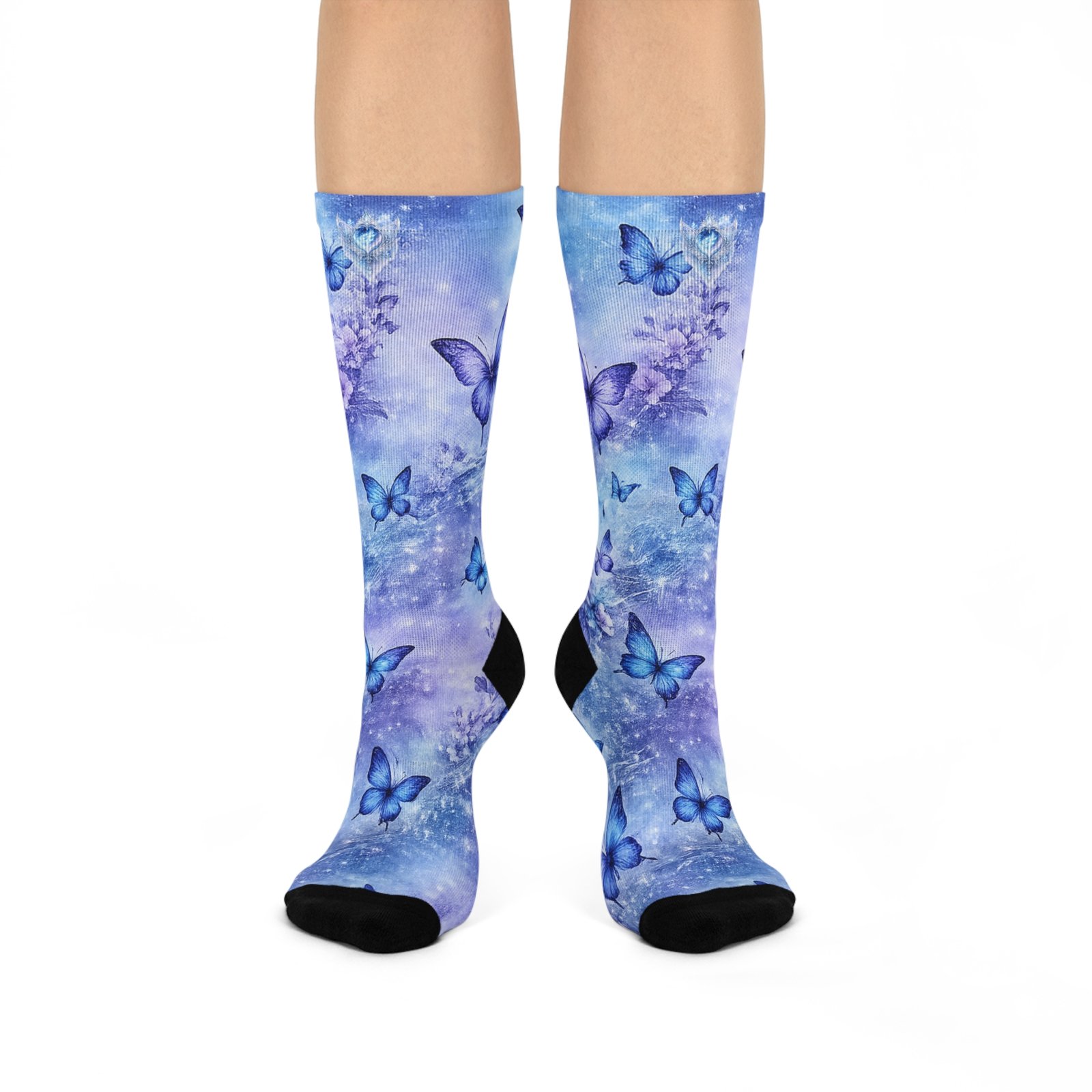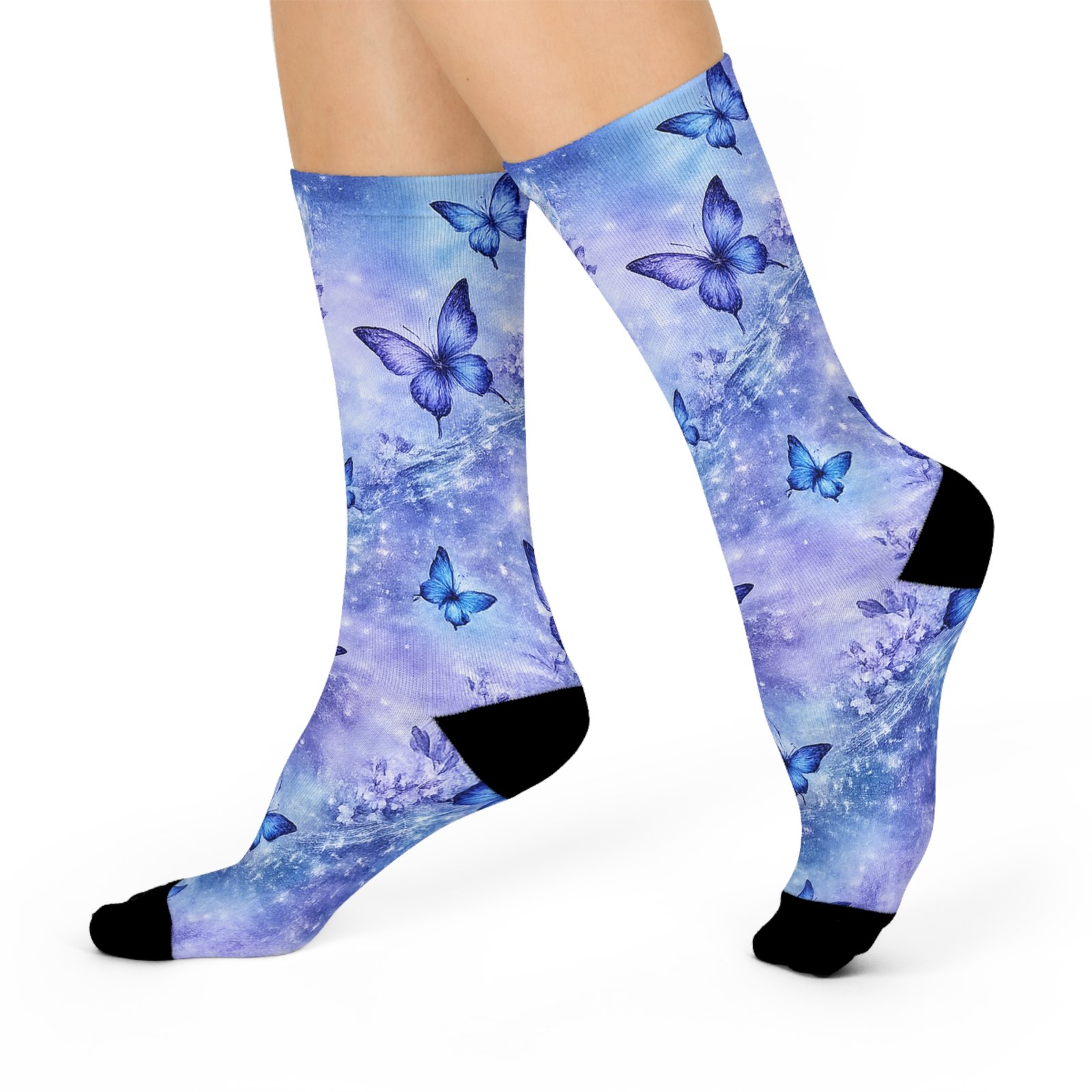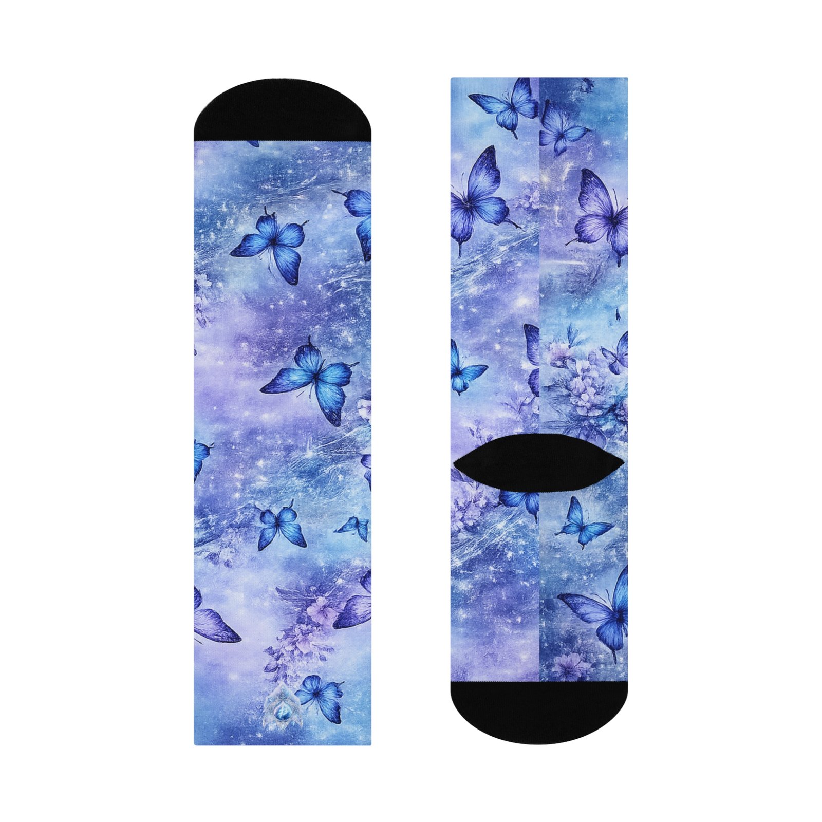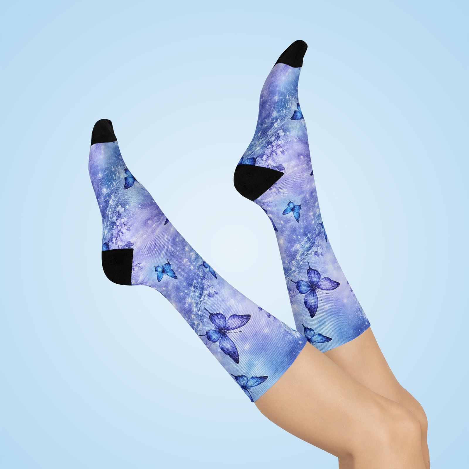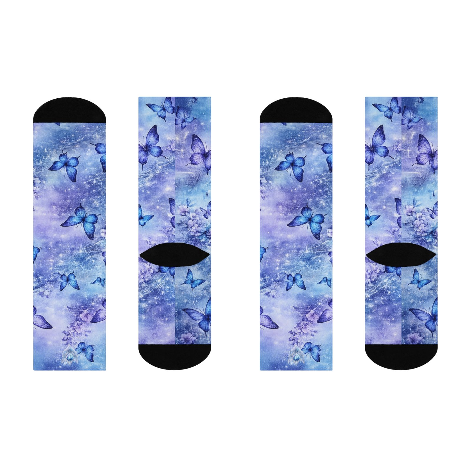 Slide into a pair that feels like a soft, whimsical afternoon. These cushioned crew socks wrap your feet in a dreamy wash of lilac and sky-blue, dotted with delicate blue butterflies that seem to flutter with every step. The plush, padded soles cushion your stride during long days on your feet, while the stretchy, smooth knit keeps the print clear and vibrant. Wear them with cropped jeans or lounge around the house — they bring a gentle, artful touch to quiet mornings, creative studio sessions, or cozy movie nights.
