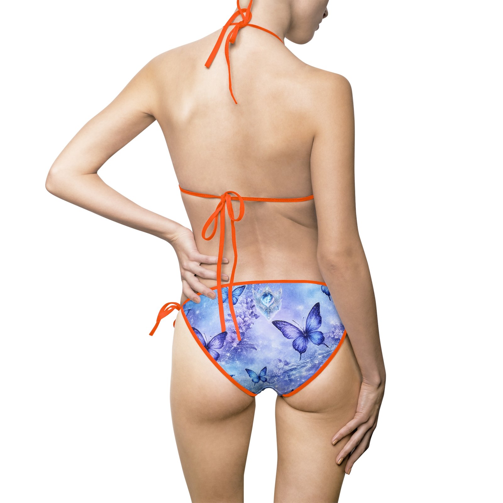 Soft, airy swim that feels like a watercolor day by the shore. Lightweight, stretchy fabric drapes close to the skin and moves with you—no stiffness, just easy confidence. The two-piece tie-side design and adjustable elastic straps let you shape the fit, while removable pads add subtle lift when you want it. The delicate blue-violet wash and tiny butterfly accents read like a seaside sketch, bringing a calm, whimsical touch to long beach afternoons, poolside reads, or warm-weather escapes. Wear it when you want something light, flattering, and quietly playful.
