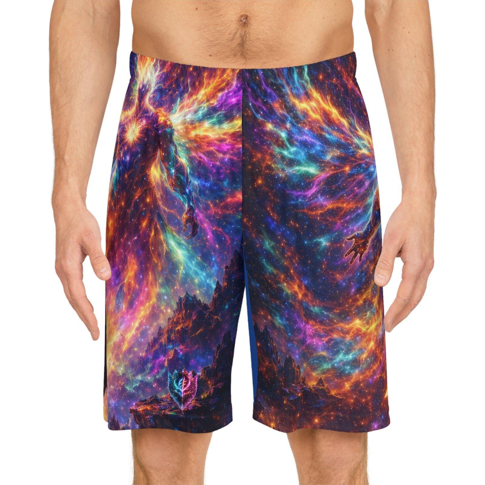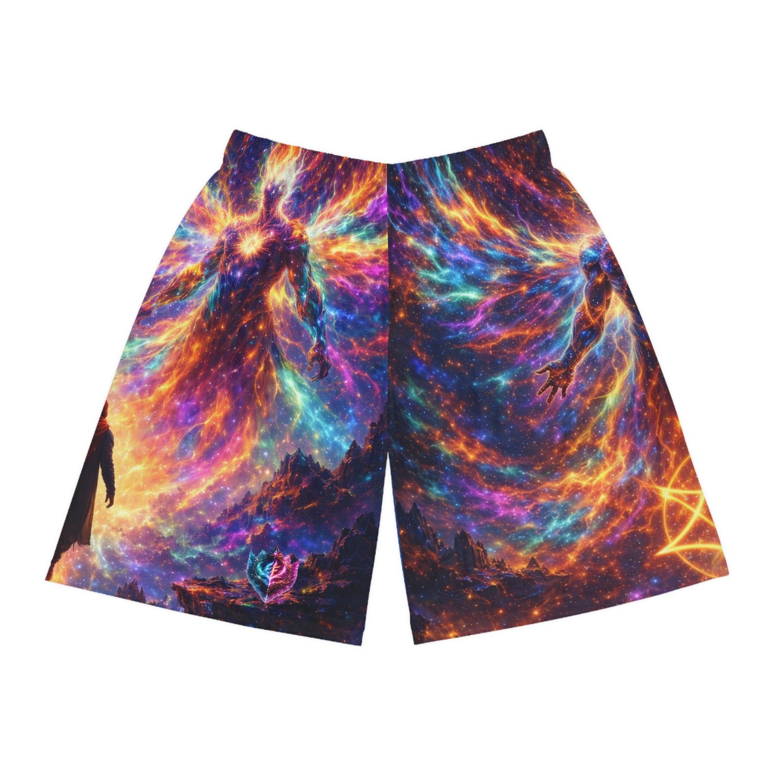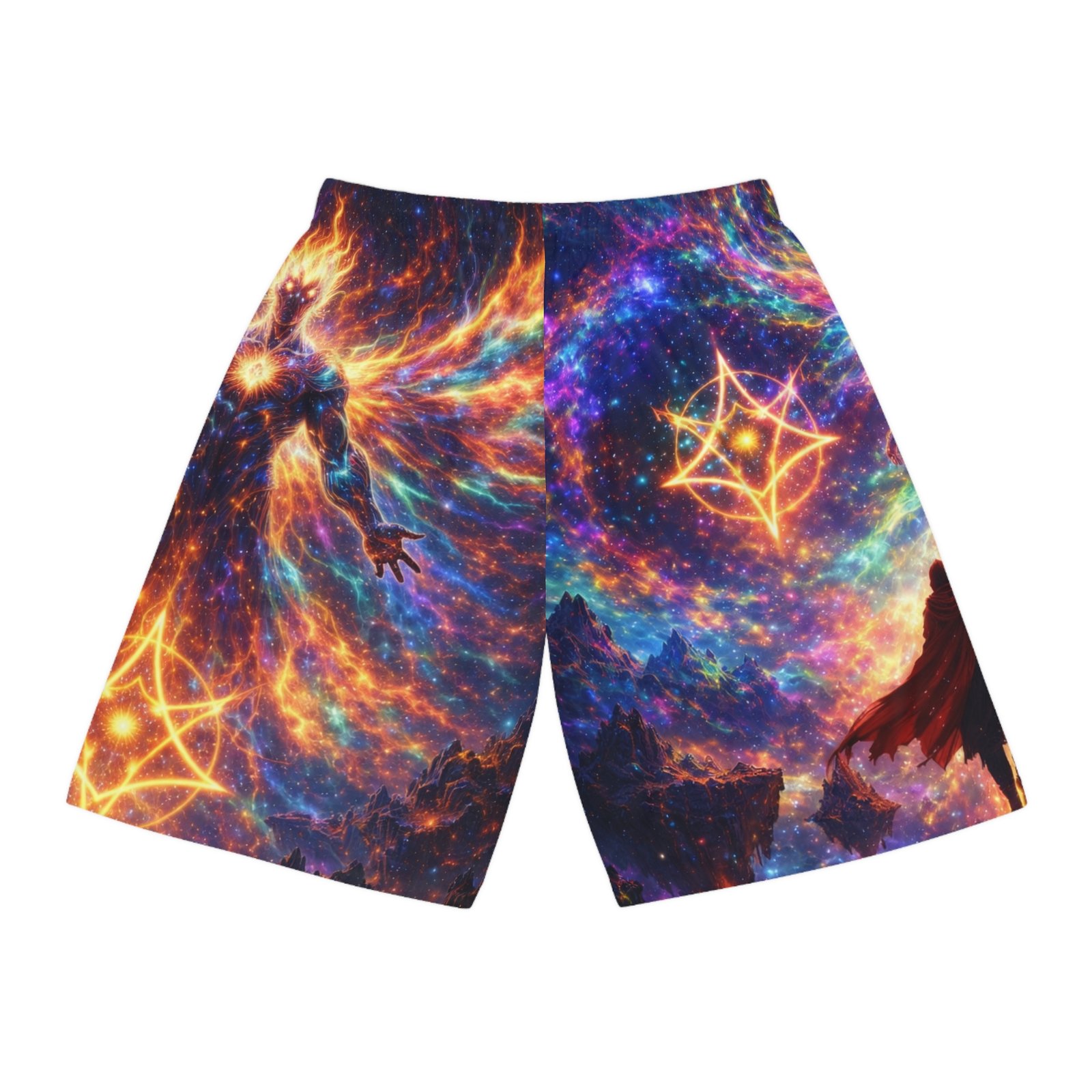These printed basketball shorts bring cosmic energy to every move. Lightweight, quick-dry polyester keeps you cool while the elastic waistband and internal drawstring sit comfortably no matter how intense the game gets. The full-allover design blends nebula swirls, star sigils, and a mythic figure into a high-contrast palette of blues, purples, and molten orange — a bold look that reads like motion even when you’re standing still. Wear them for late-night pick-up games, studio sessions, or when you want athleisure that feels adventurous and tactile. The breathable fabric moves moisture away from skin so you stay focused, and the seamless print means the artwork remains uninterrupted across the panels. These shorts suit someone who leans into statement sportswear — players and creators who want athletic gear that doubles as wearable art. They pair well with sneakers and layered tees for street-ready fits, or with a performance tank when you’re training. The printed care label inside the waistband keeps maintenance straightforward so the colors stay vibrant through washes. Product features – 100% moisture-wicking polyester for fast drying and durability – Extra-light 4 oz/yd² fabric for breathable, movement-friendly wear – Elastic waistband with inside drawstring for secure, adjustable fit – All-over printed design with seam-matched thread for uninterrupted artwork – Printed size and care label inside waistband; assembled in the USA Care instructions – Do not dryclean – Do not iron – Tumble dry: low heat – Do not bleach – Machine wash: cold (max 30C or 90F)