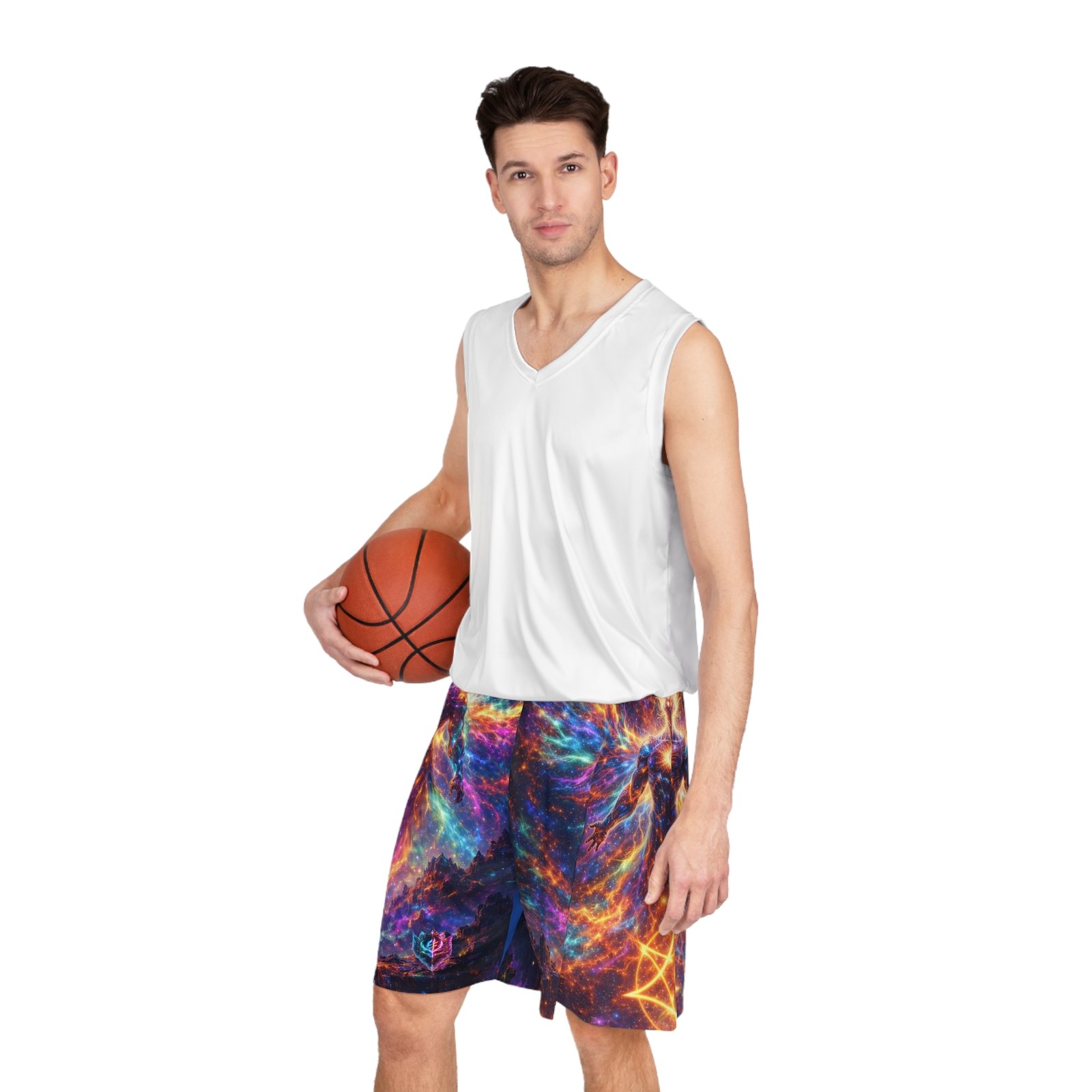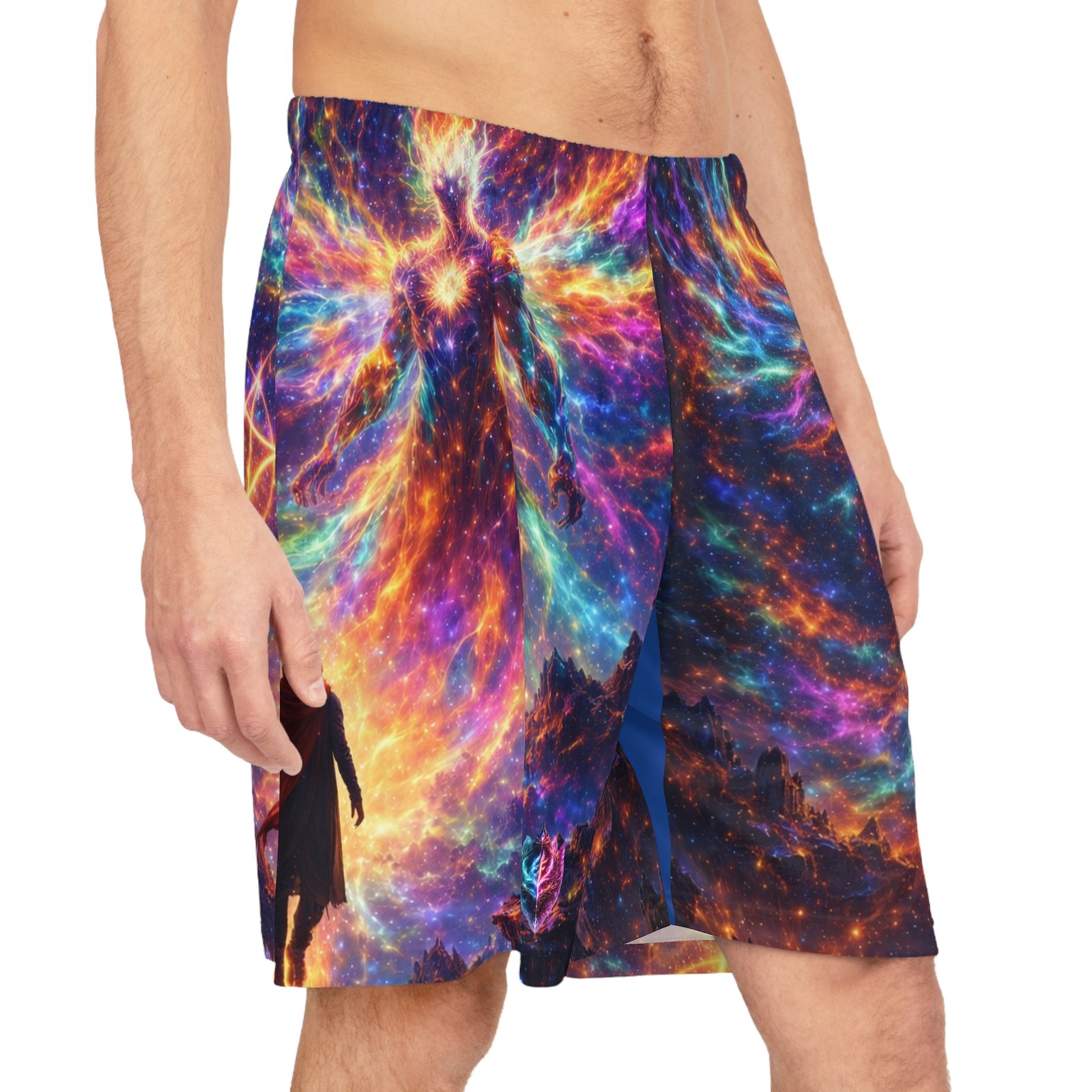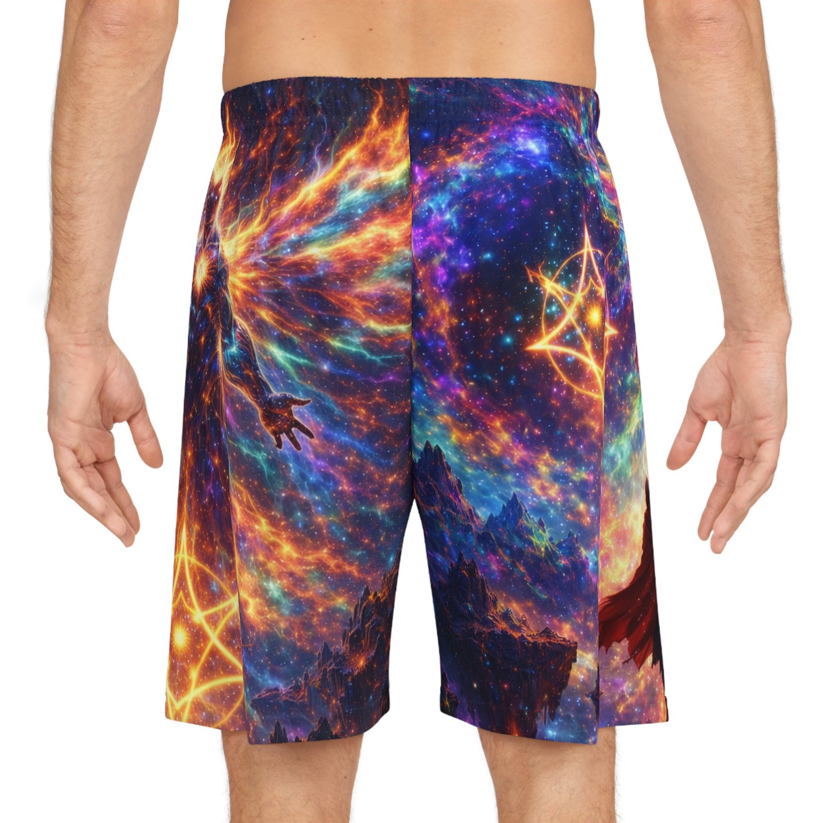 These printed basketball shorts bring cosmic energy to every move. Lightweight, quick-dry polyester keeps you cool while the elastic waistband and internal drawstring sit comfortably no matter how intense the game gets. The full-allover design blends nebula swirls, star sigils, and a mythic figure into a high-contrast palette of blues, purples, and molten orange — a bold look that reads like motion even when you’re standing still. Wear them for late-night pick-up games, studio sessions, or when you want athleisure that feels adventurous and tactile. The breathable fabric moves moisture away from skin so you stay focused, and the seamless print means the artwork remains uninterrupted across the panels. These shorts suit someone who leans into statement sportswear — players and creators who want athletic gear that doubles as wearable art. They pair well with sneakers and layered tees for street-ready fits, or with a performance tank when you’re training. The printed care label inside the waistband keeps maintenance straightforward so the colors stay vibrant through washes. Product features – 100% moisture-wicking polyester for fast drying and durability – Extra-light 4 oz/yd² fabric for breathable, movement-friendly wear – Elastic waistband with inside drawstring for secure, adjustable fit – All-over printed design with seam-matched thread for uninterrupted artwork – Printed size and care label inside waistband; assembled in the USA Care instructions – Do not dryclean – Do not iron – Tumble dry: low heat – Do not bleach – Machine wash: cold (max 30C or 90F)