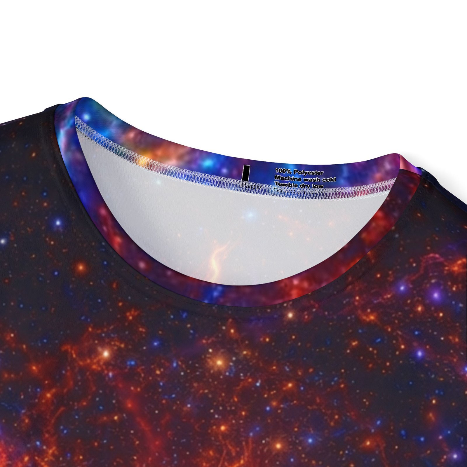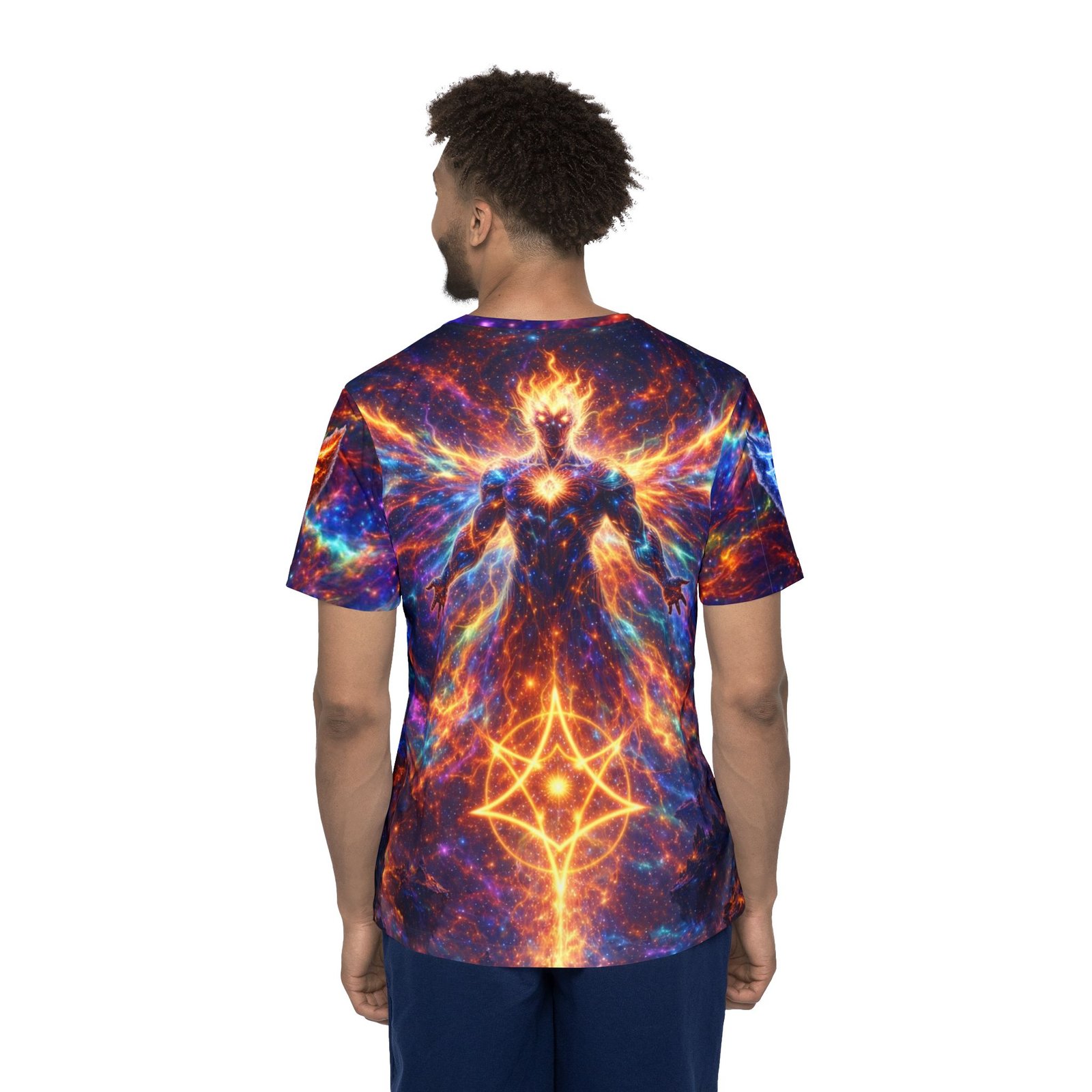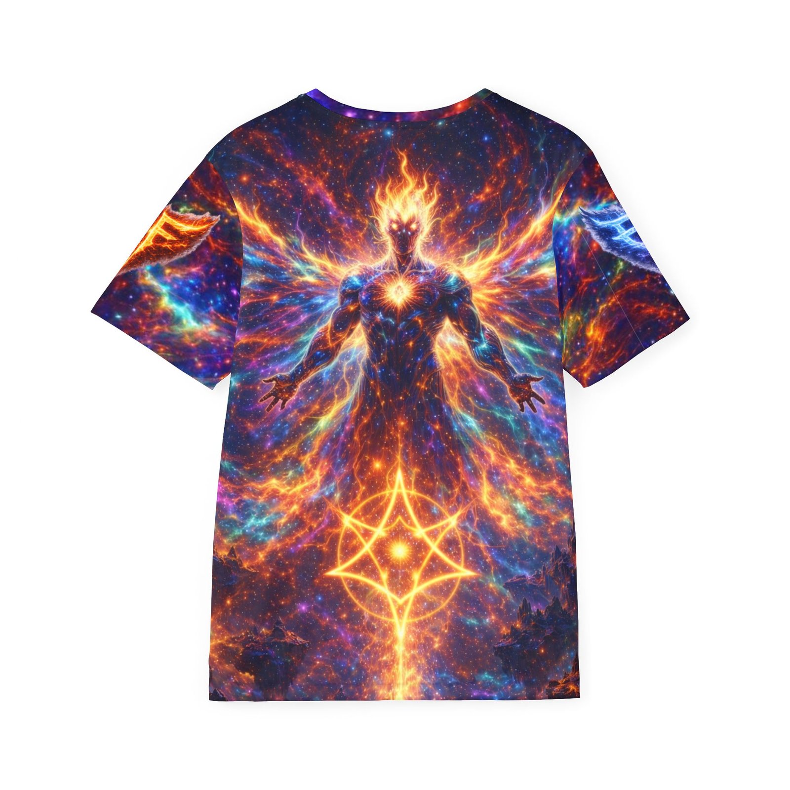 This lightweight sports jersey wraps you in a cosmic blaze — vivid nebula hues and a guardian-like figure rise across the front and back, giving movement to every stride. Breathable, moisture-wicking polyester keeps skin dry during workouts or long festival days, while the 1×1 ribbed collar and armholes stretch on and snap back for a clean fit. The all-over print holds intense color and detail so the artwork stays bold after repeated wears. Wear it for training, raves, or simply when you want to carry that otherworldly energy into town.