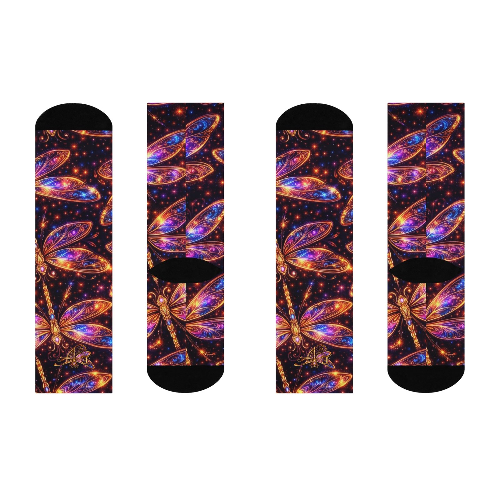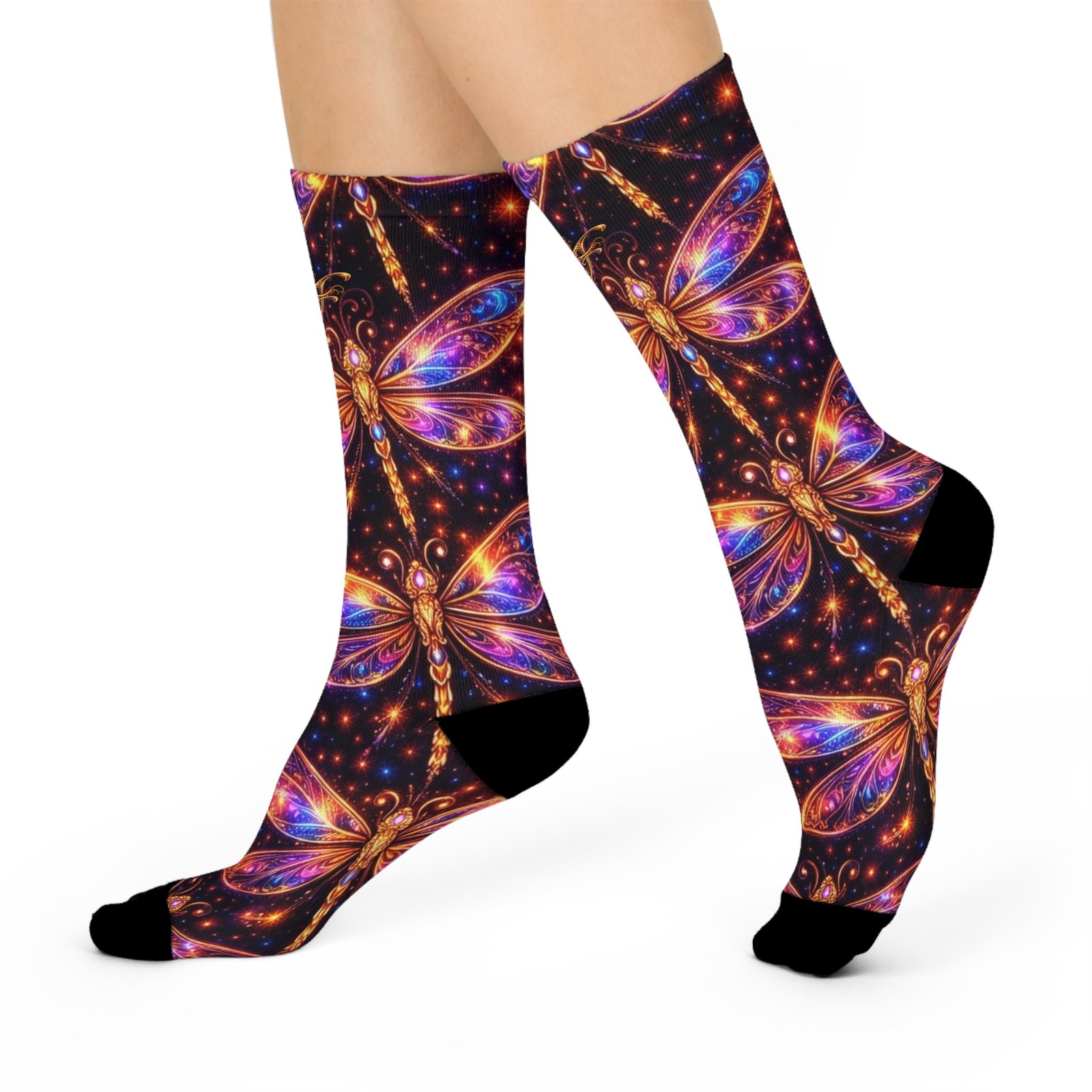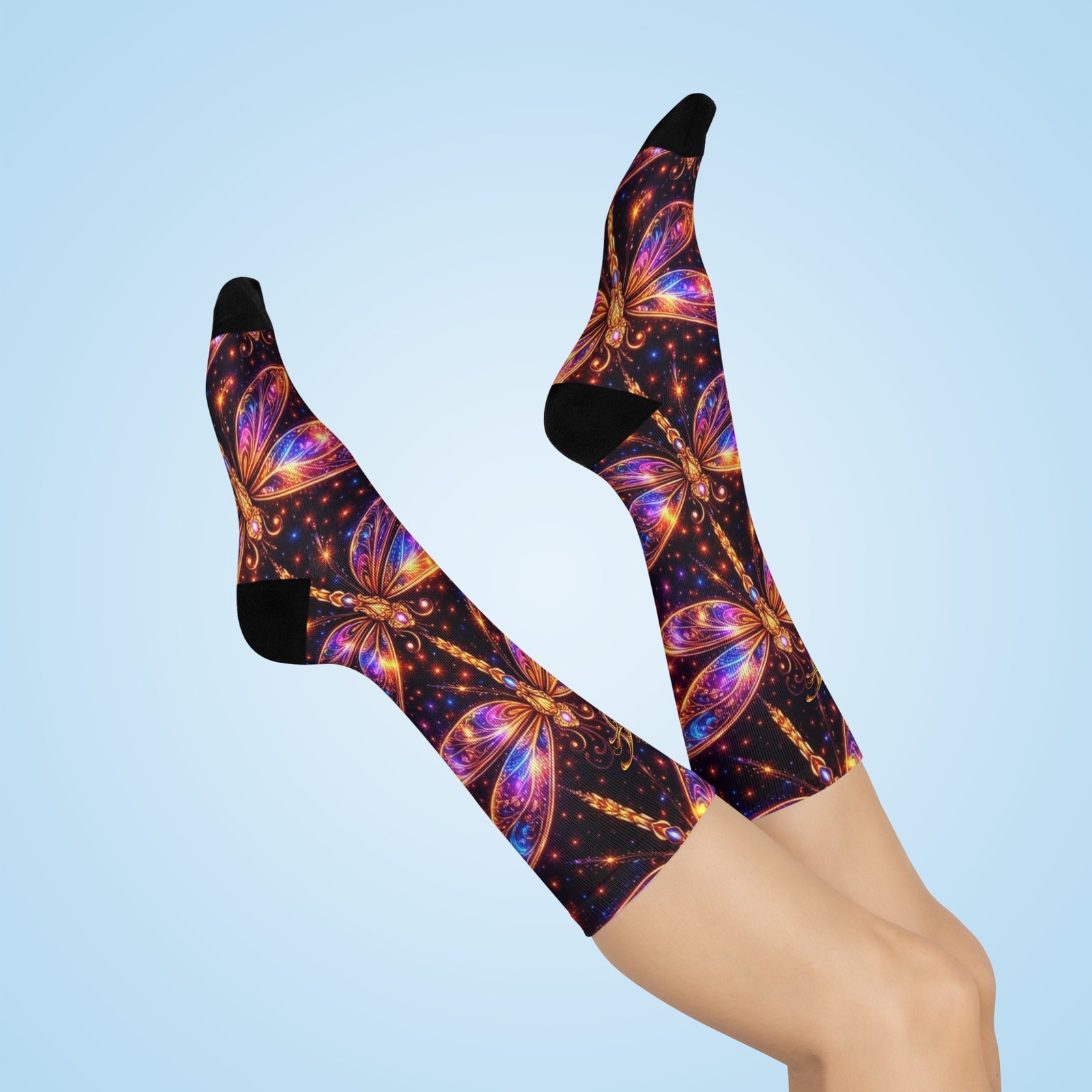 These cushioned crew socks bring a little magic to every step. Rich jewel tones and luminous dragonfly motifs float across a deep, starlit background, creating a wearable mini-canvas that feels both whimsical and refined. The soft, stretchy knit hugs the calf without squeezing, while the plush, cushioned sole keeps feet comfortable through long days of walking, standing, or exploring. Pair them with boots, sneakers, or a flowing skirt to add a surprising splash of color and movement to an everyday outfit or a special night out under the stars.