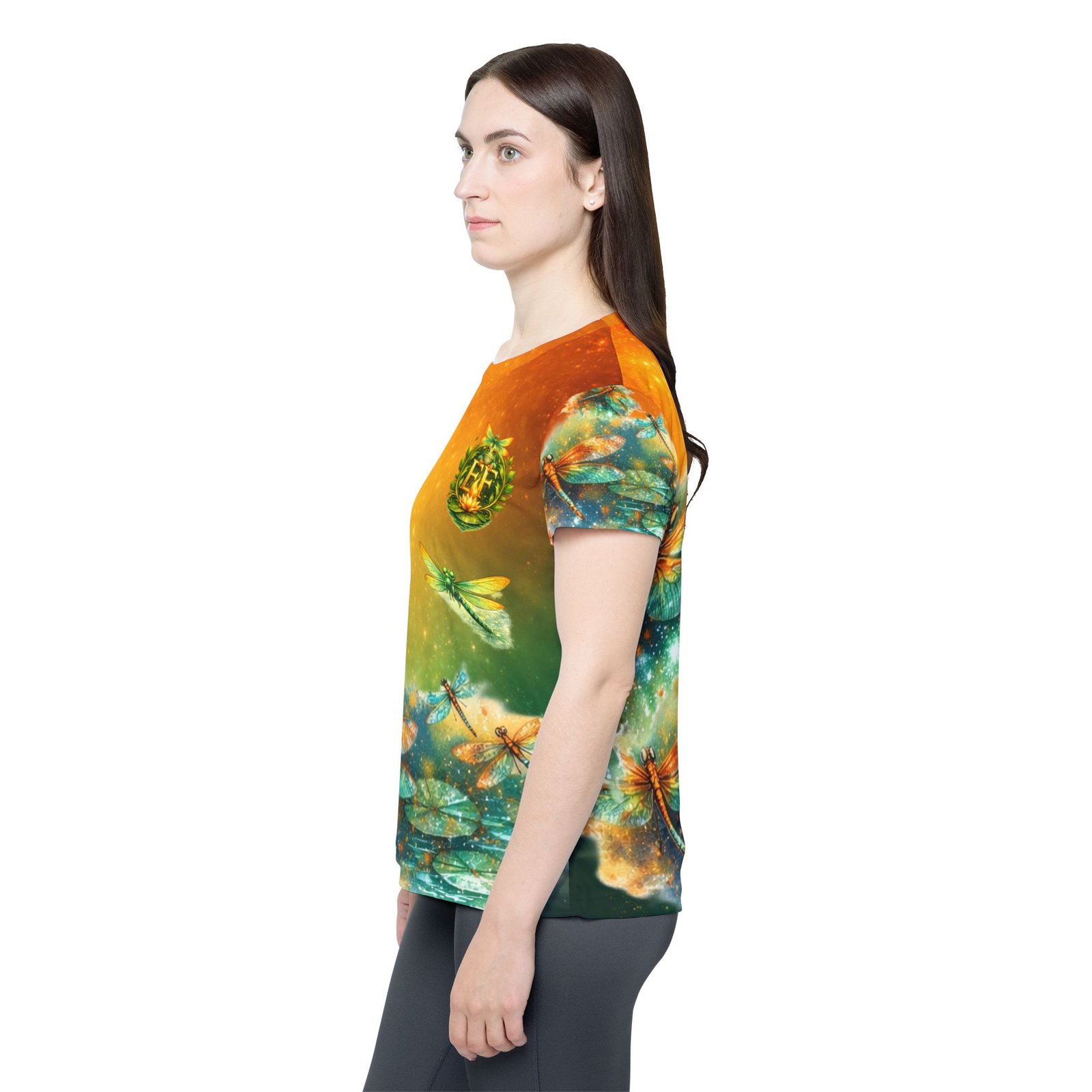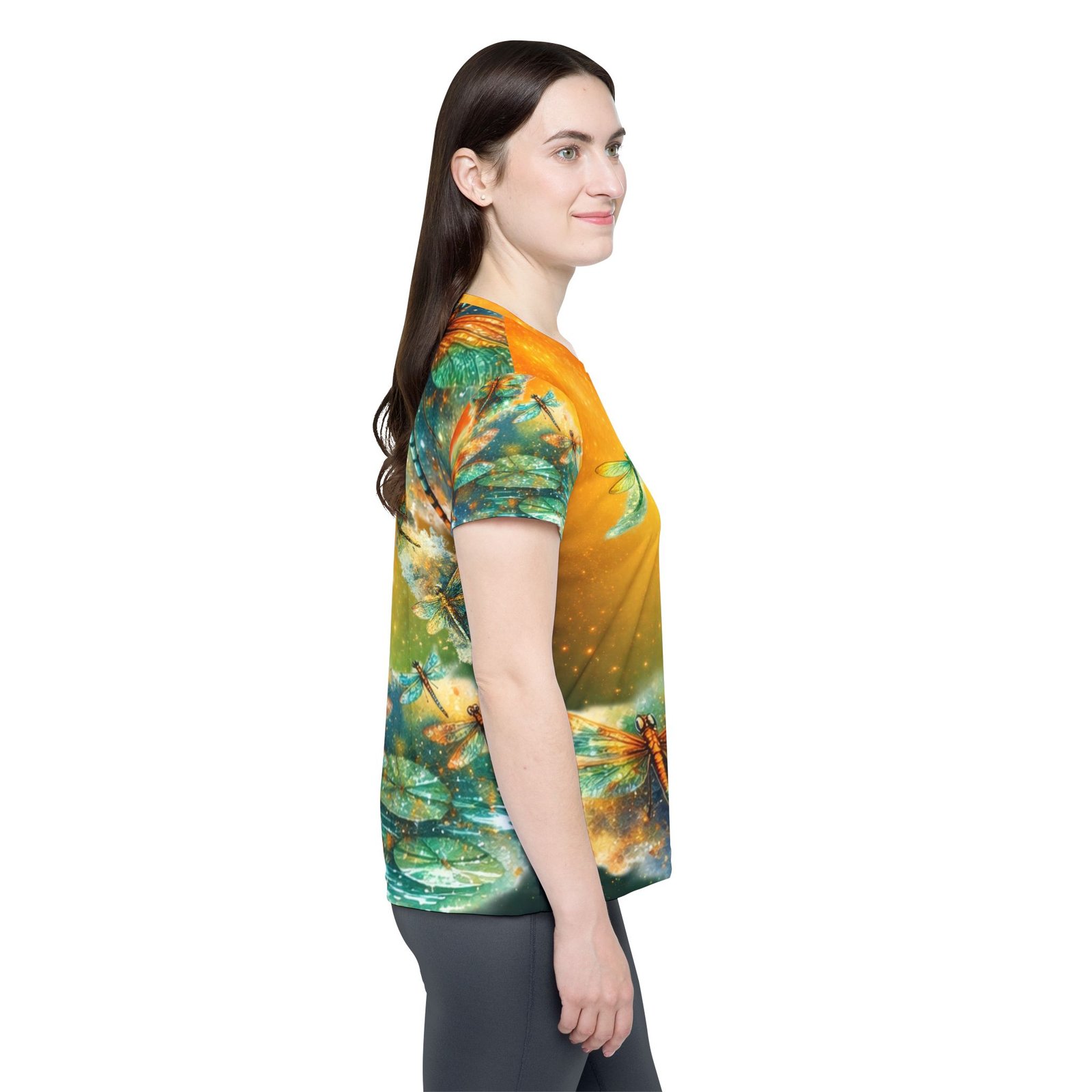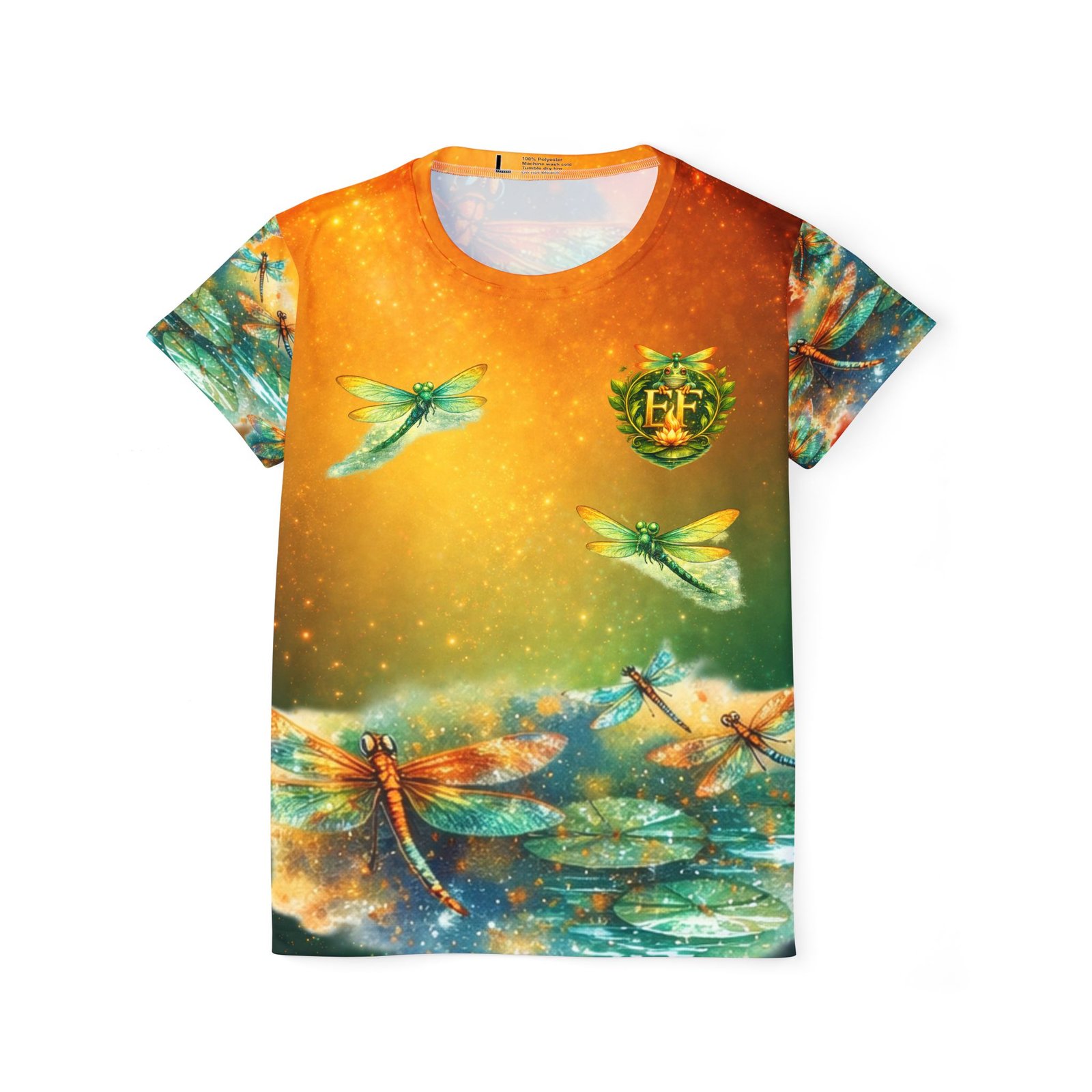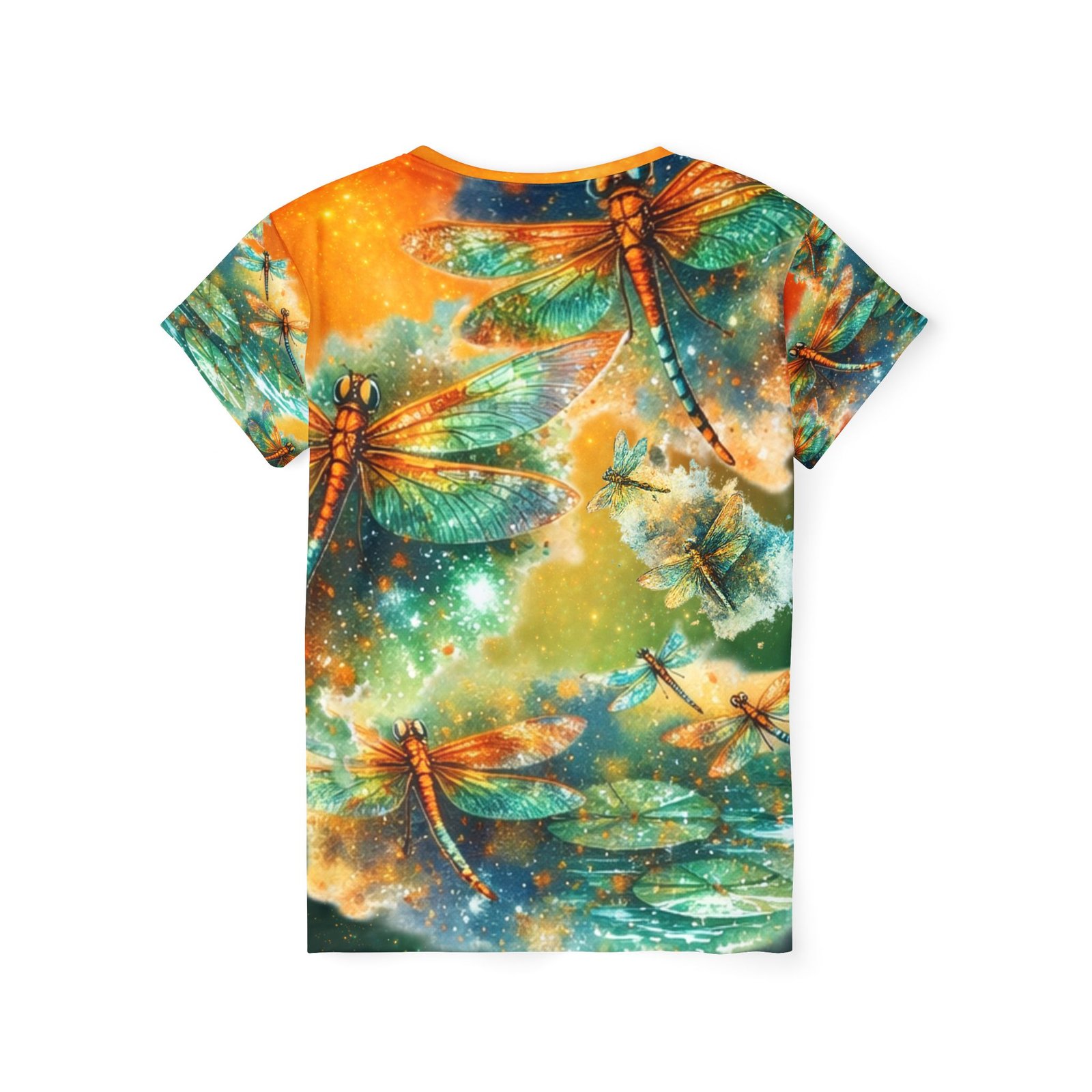 A lightweight, all-over printed sports jersey that feels like a breeze on sunlit afternoons. Soft, moisture-wicking polyester keeps skin cool while luminous teal and amber dragonflies dance across the fabric, giving the top an ethereal, nature-driven energy. The ribbed collar and armholes stretch on and return to shape for a smooth, comfortable fit during movement. Wear it to morning runs, outdoor yoga, or long walks where color and motion lift your spirits — it layers easily under a jacket or stands out solo when you want to feel alive and buoyant.