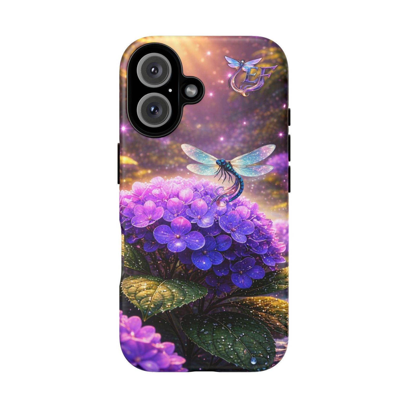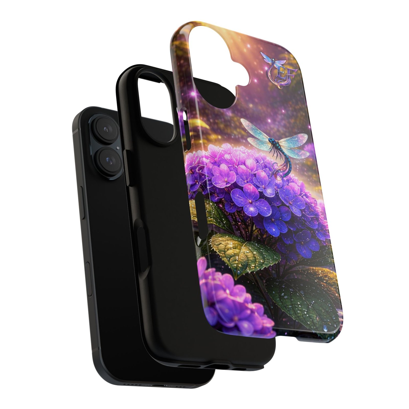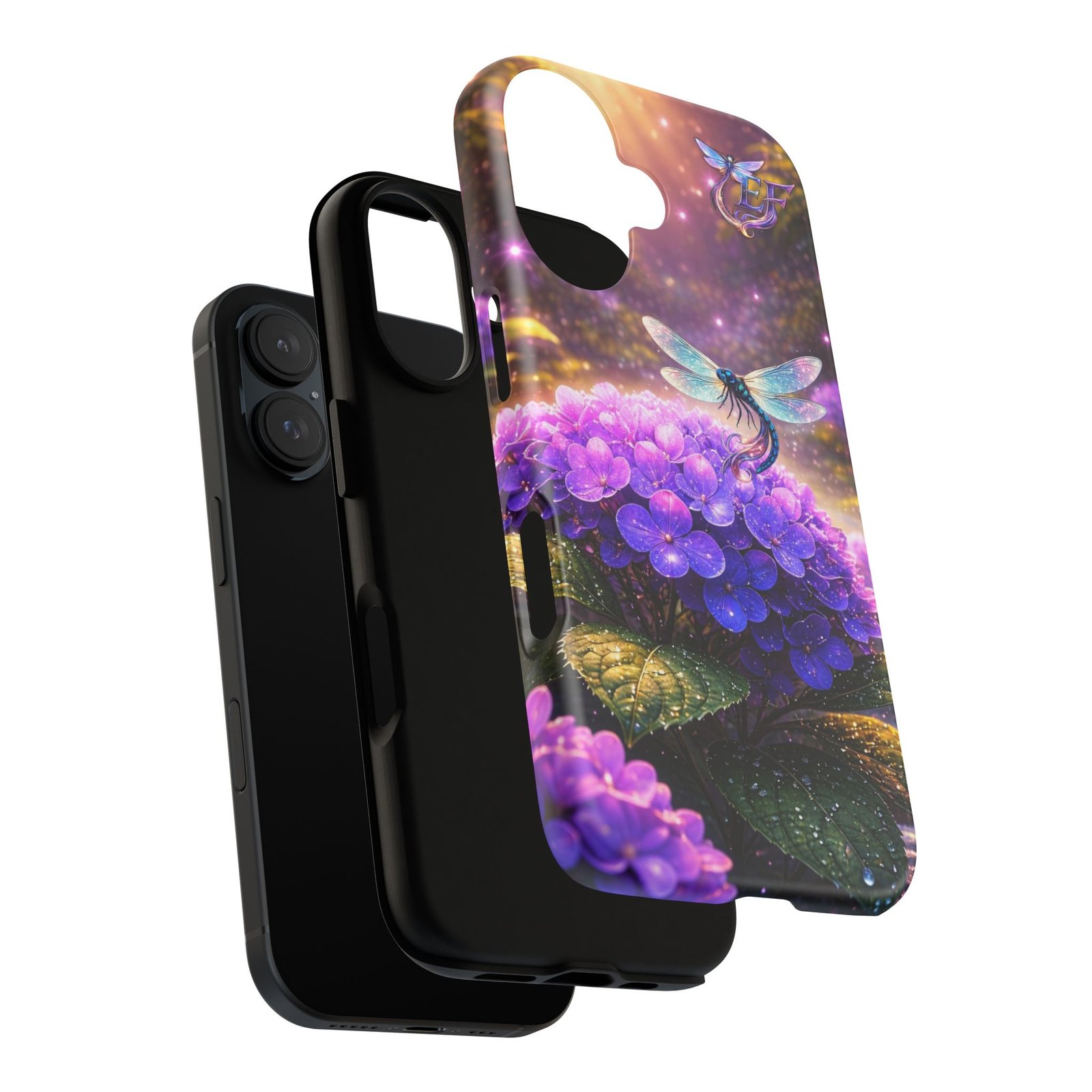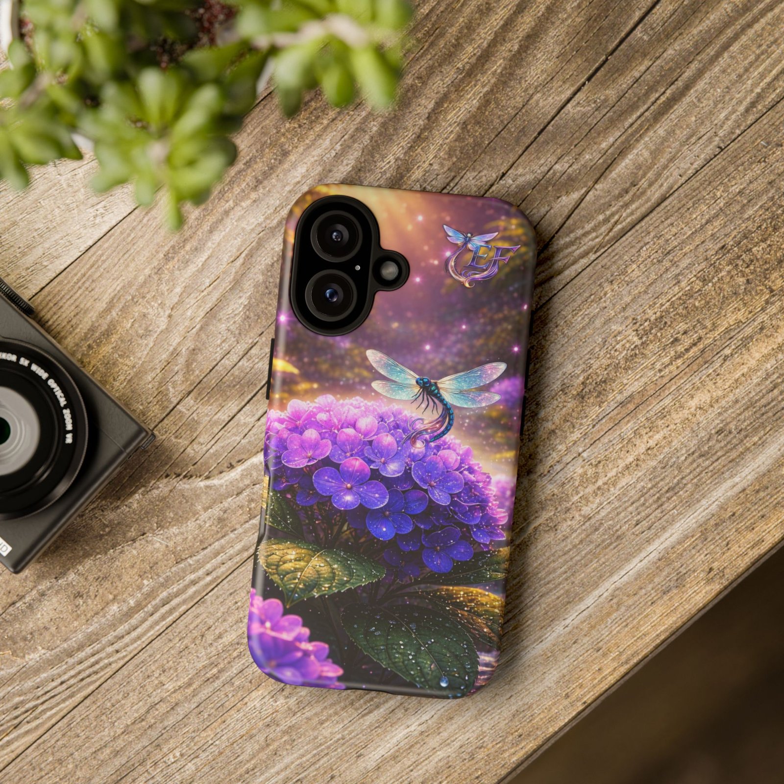 This durable protective phone case wraps your device in a dreamy, enchanted-scene print — a pale blue dragonfly poised above lush violet hydrangeas beneath a warm, starlit sky. The artwork flows across the full 3D-wrap surface for uninterrupted color and depth. Built as a dual-layer shell (polycarbonate exterior with a soft TPU silicone liner), it soaks up shocks while keeping ports clear and wireless charging available. UV protection preserves the vivid tones outdoors, and the glossy or matte finish options let you choose subtle sheen or muted elegance. It’s a functional everyday shield that also brings a small moment of wonder every time you reach for your phone.