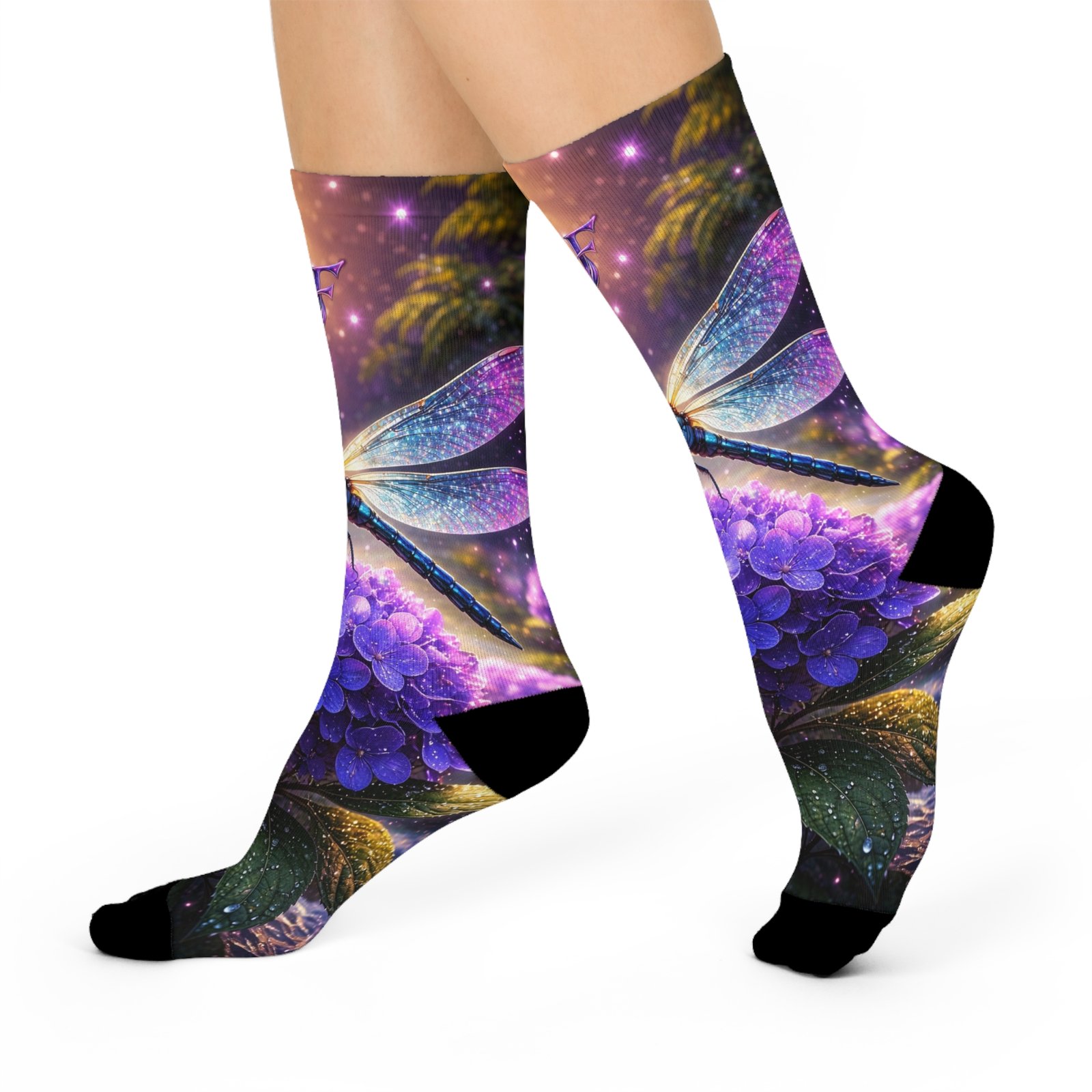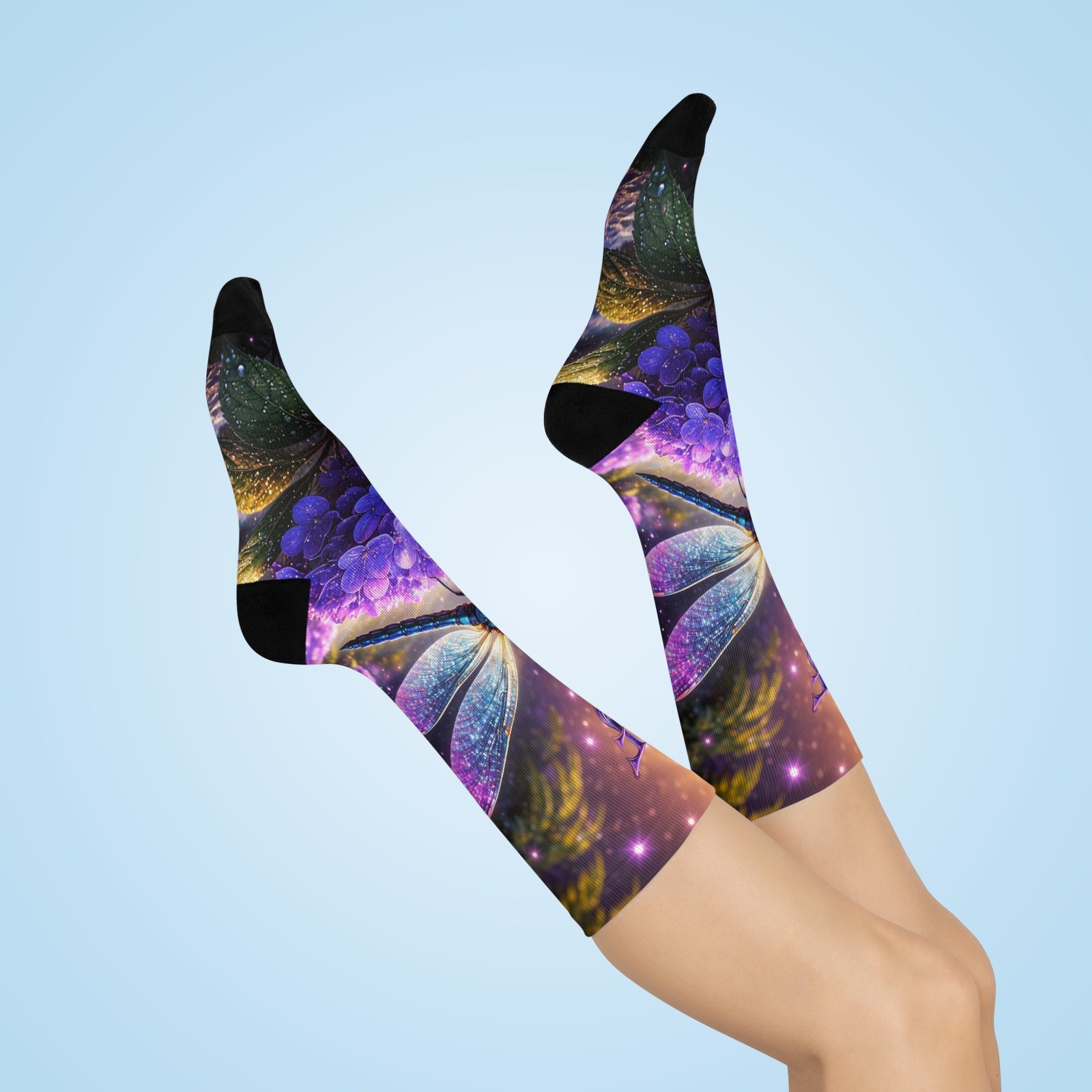 Float through late-summer evenings with these artful crew socks that feel like a small, private escape. Softly cushioned underfoot, they wrap your feet in a stretchy, smooth knit printed edge-to-edge with a luminous dragonfly hovering over jewel-toned hydrangea blooms. The colors shimmer like twilight—purples, blues, and golds blending into a star-speckled background—bringing a delicate, enchanted mood to everyday wear. Lightweight but supportive, they tuck neatly under jeans or peek out from a skirt to add a quiet, whimsical moment to your outfit. Slip them on when you want a touch of wonder during long days on your feet, calm weekend strolls, or late-night reading sessions.