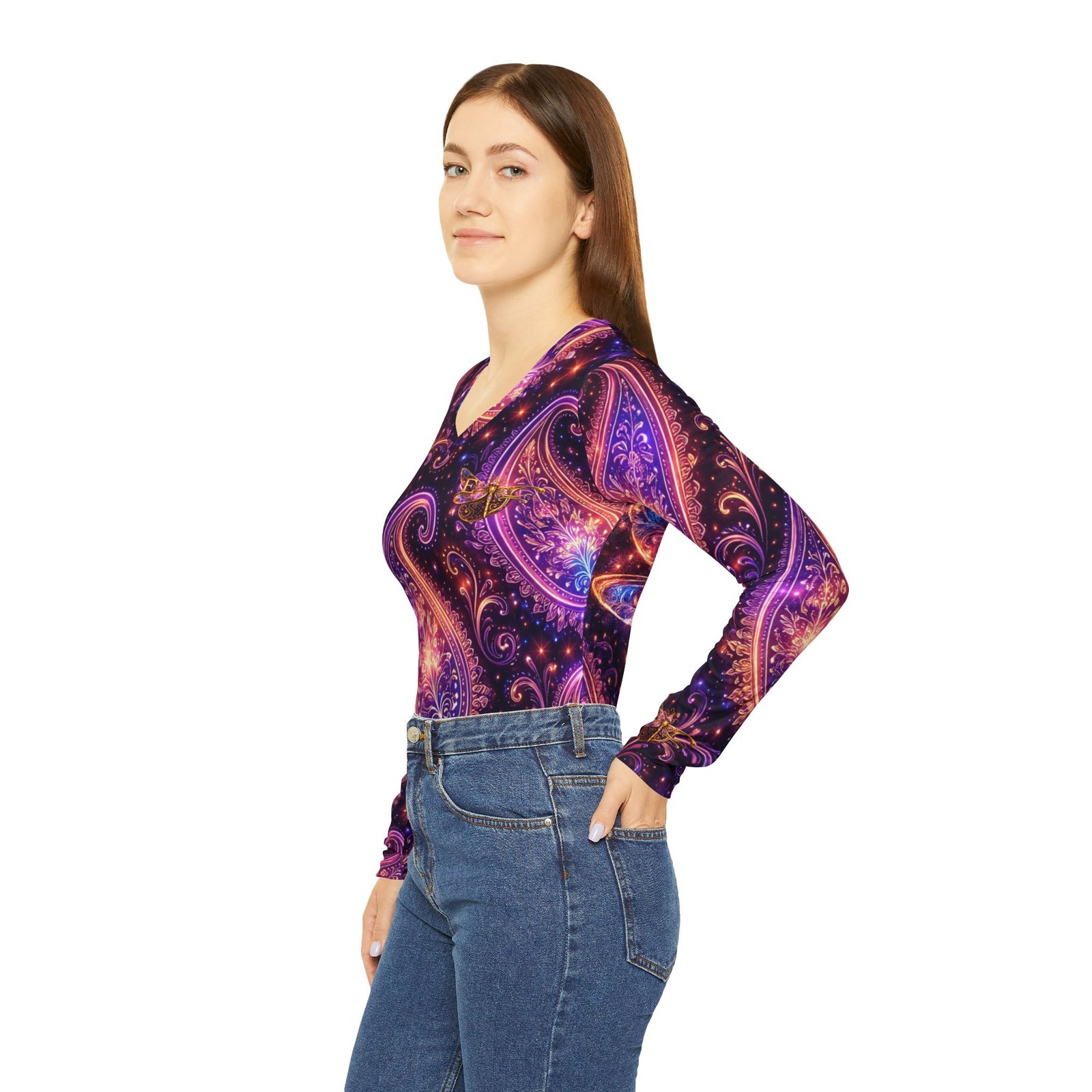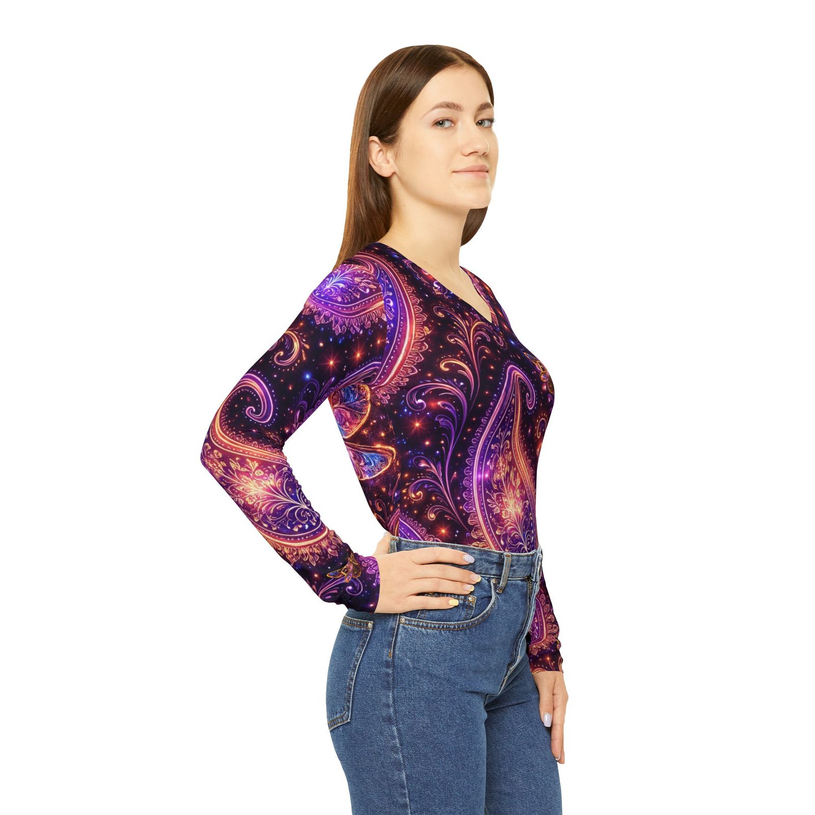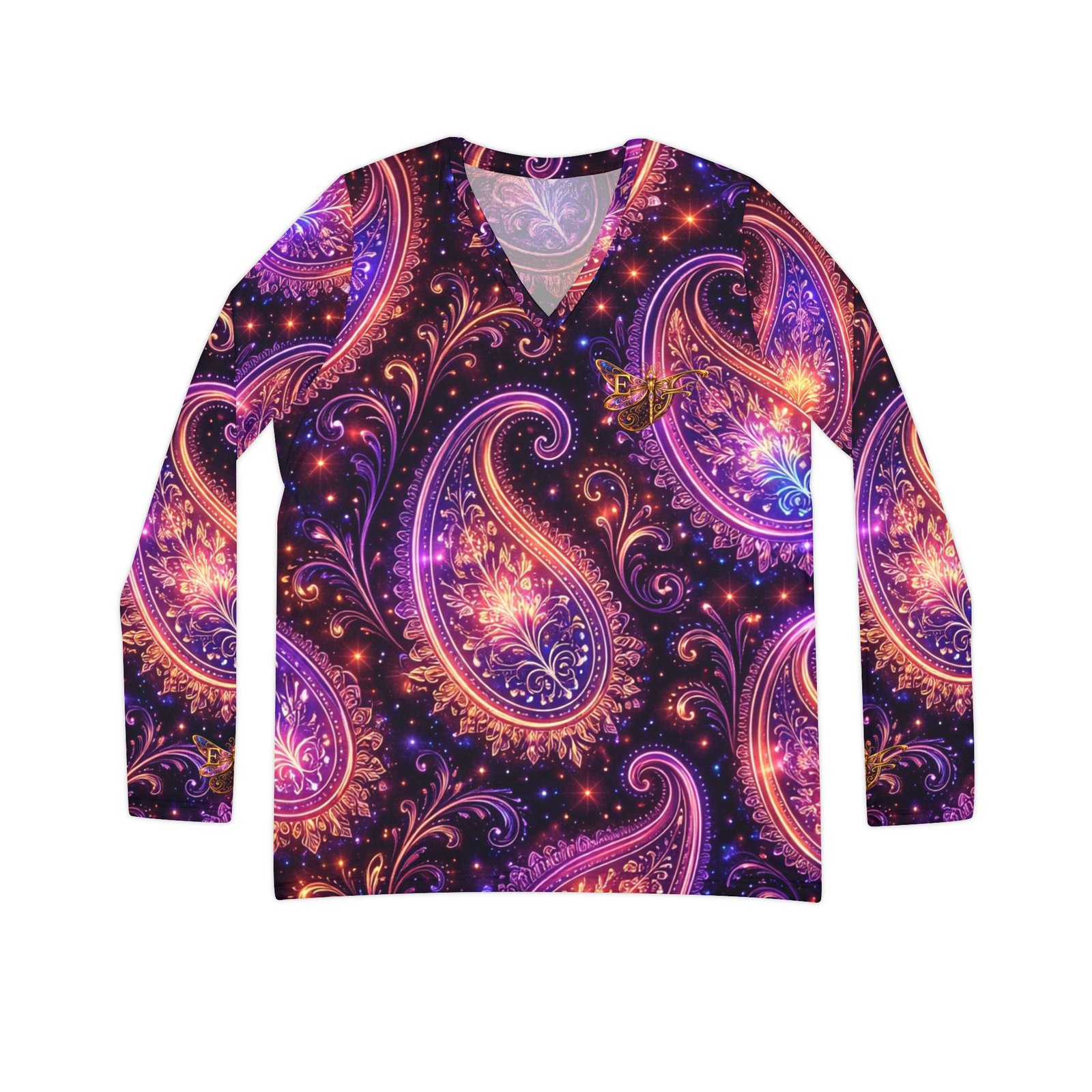 This long-sleeve V-neck brings twilight magic to everyday wear. Swirling paisleys and a luminous dragonfly float across deep purples and warm ambers, like a lantern-lit garden after dusk. It drapes light and soft against skin, moving easily from a quiet evening walk to a cozy night in. Wear it when you want your outfit to feel both whimsical and grounded — the colors glow without shouting, the V-neck frames a favorite necklace, and the all-over print keeps the look artful no matter how you pair it. It feels like slipping into a story: gentle, curious, and a little enchanted.