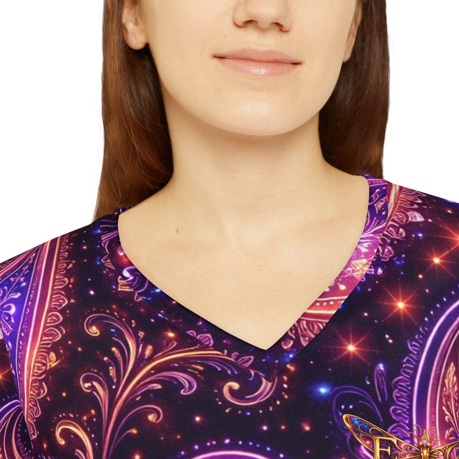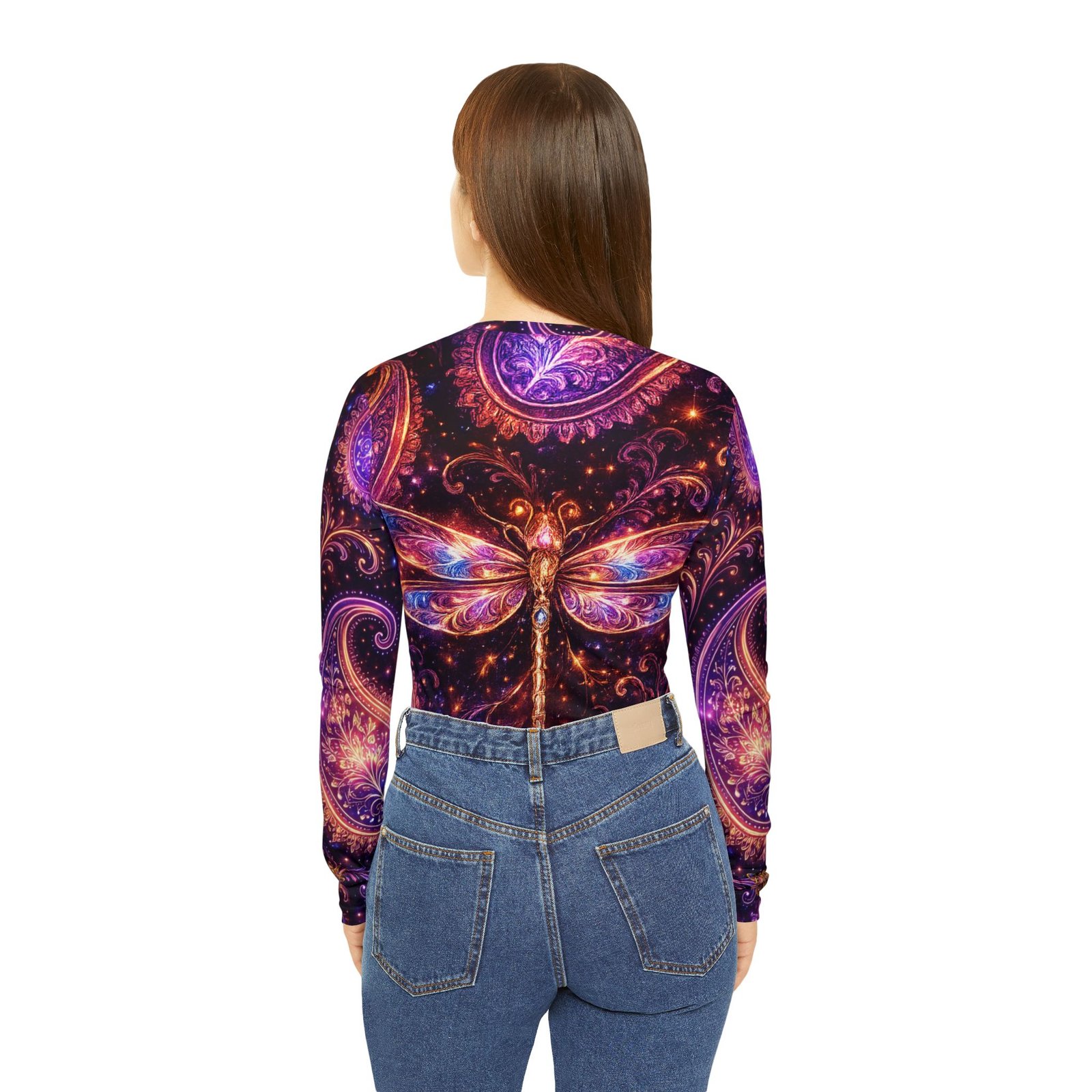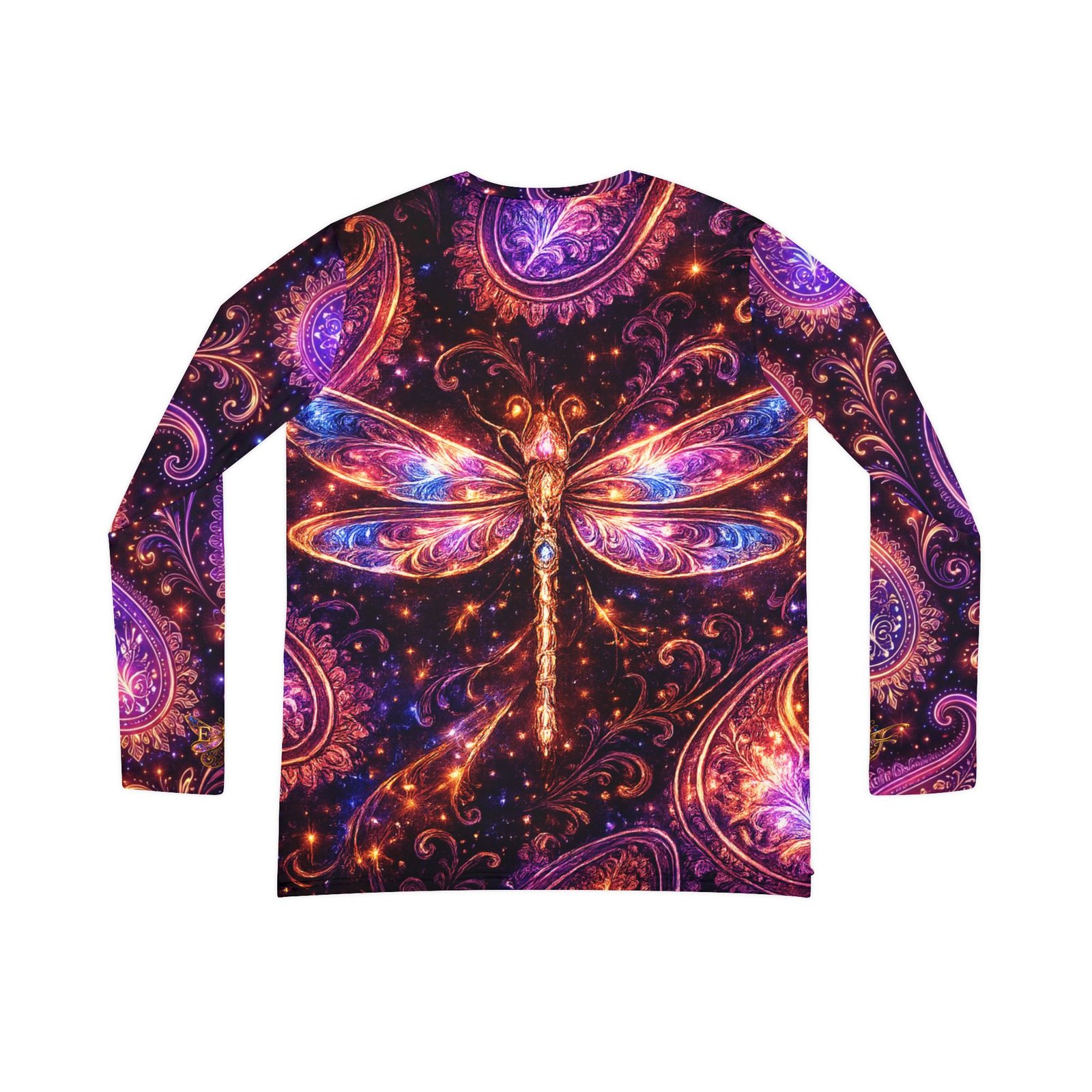 This long-sleeve V-neck brings twilight magic to everyday wear. Swirling paisleys and a luminous dragonfly float across deep purples and warm ambers, like a lantern-lit garden after dusk. It drapes light and soft against skin, moving easily from a quiet evening walk to a cozy night in. Wear it when you want your outfit to feel both whimsical and grounded — the colors glow without shouting, the V-neck frames a favorite necklace, and the all-over print keeps the look artful no matter how you pair it. It feels like slipping into a story: gentle, curious, and a little enchanted.
