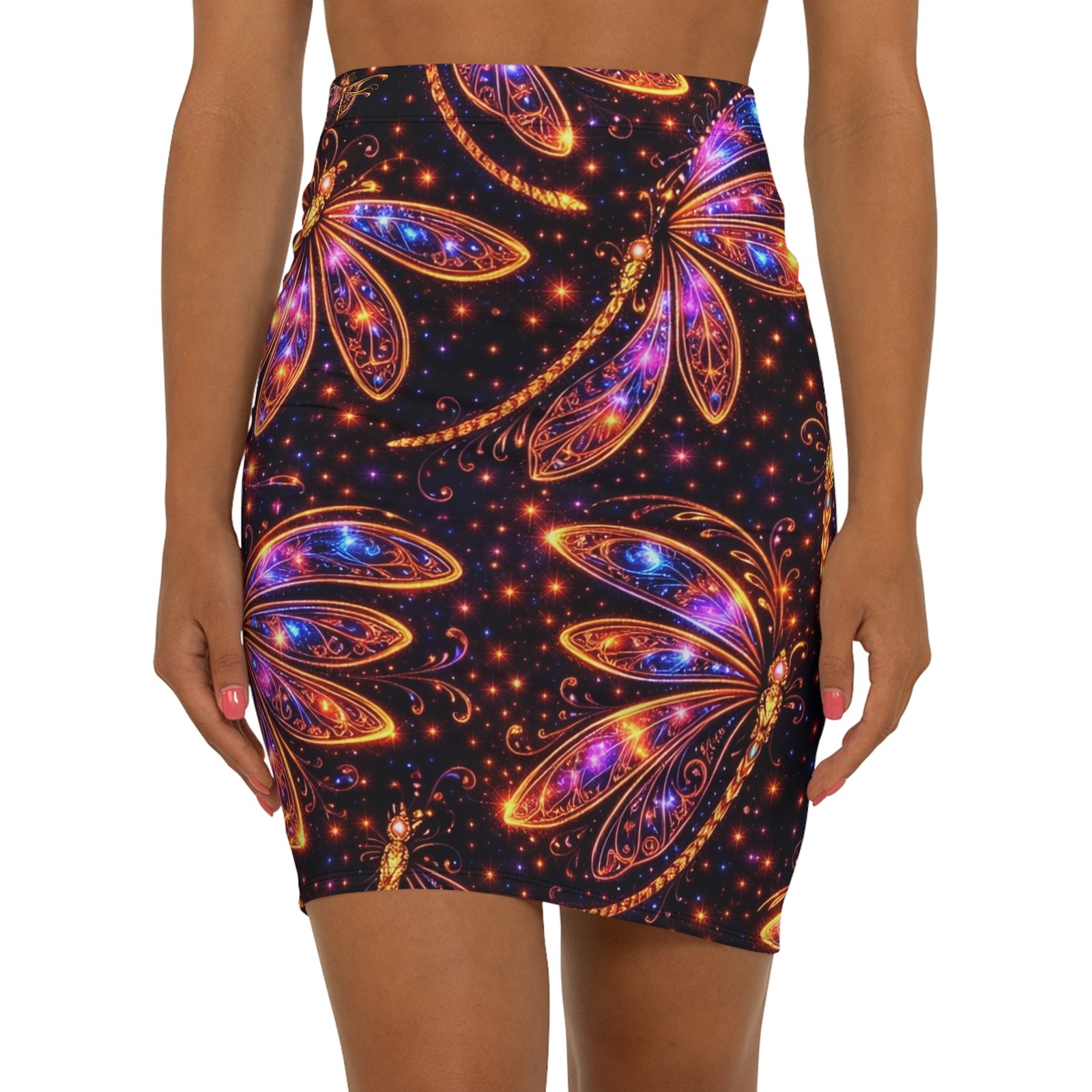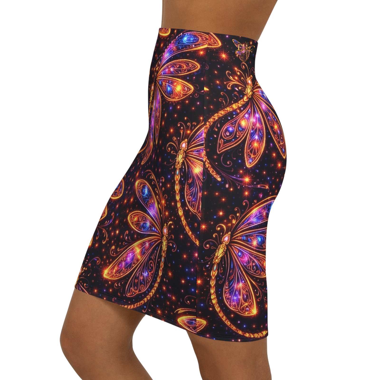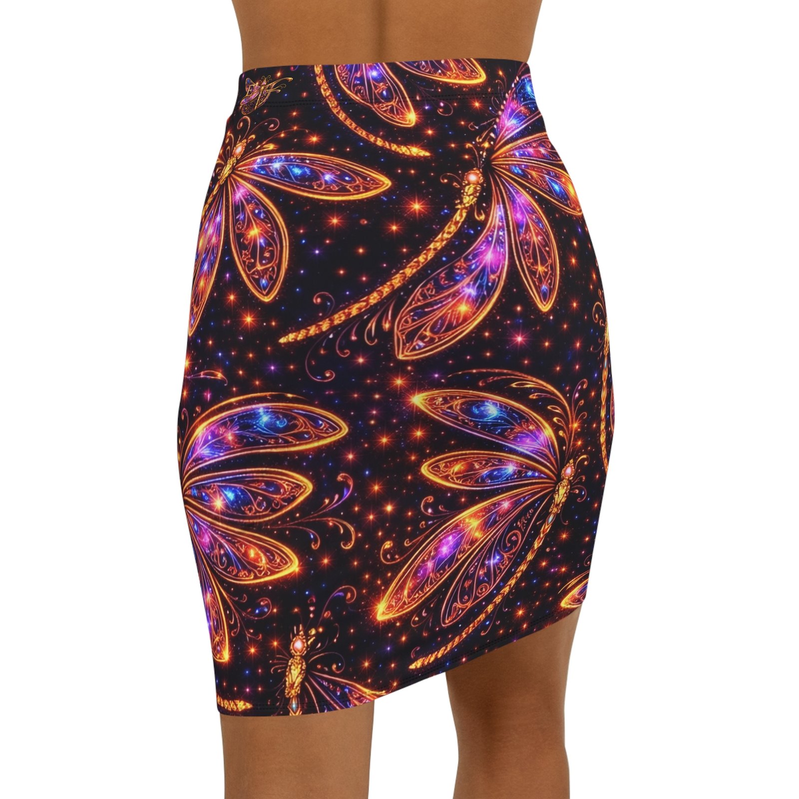 This mid-waist pencil skirt brings a touch of nocturnal magic to everyday style. The all-over print shows luminous, jewel-toned dragonflies and tiny starlit sparks on a deep, inky background—bold yet elegant. The slim, mid-rise cut hugs curves while the elastic waistband and 4-way stretch fabric let you move with ease. Wear it to late-night gatherings, gallery openings, or whenever you want an outfit that feels both mysterious and joyful. The vibrant colors hold up wash after wash, and the sewn-in care label and clean black seams keep the finish polished.
