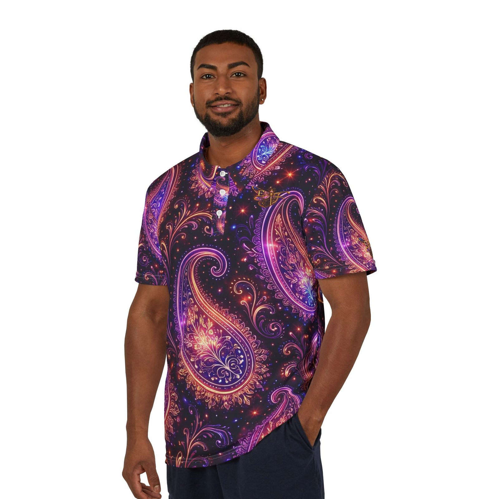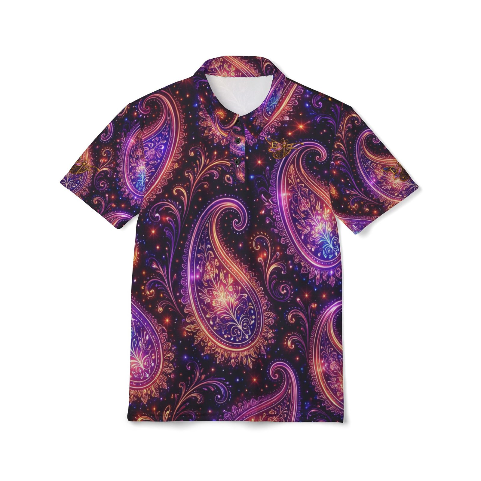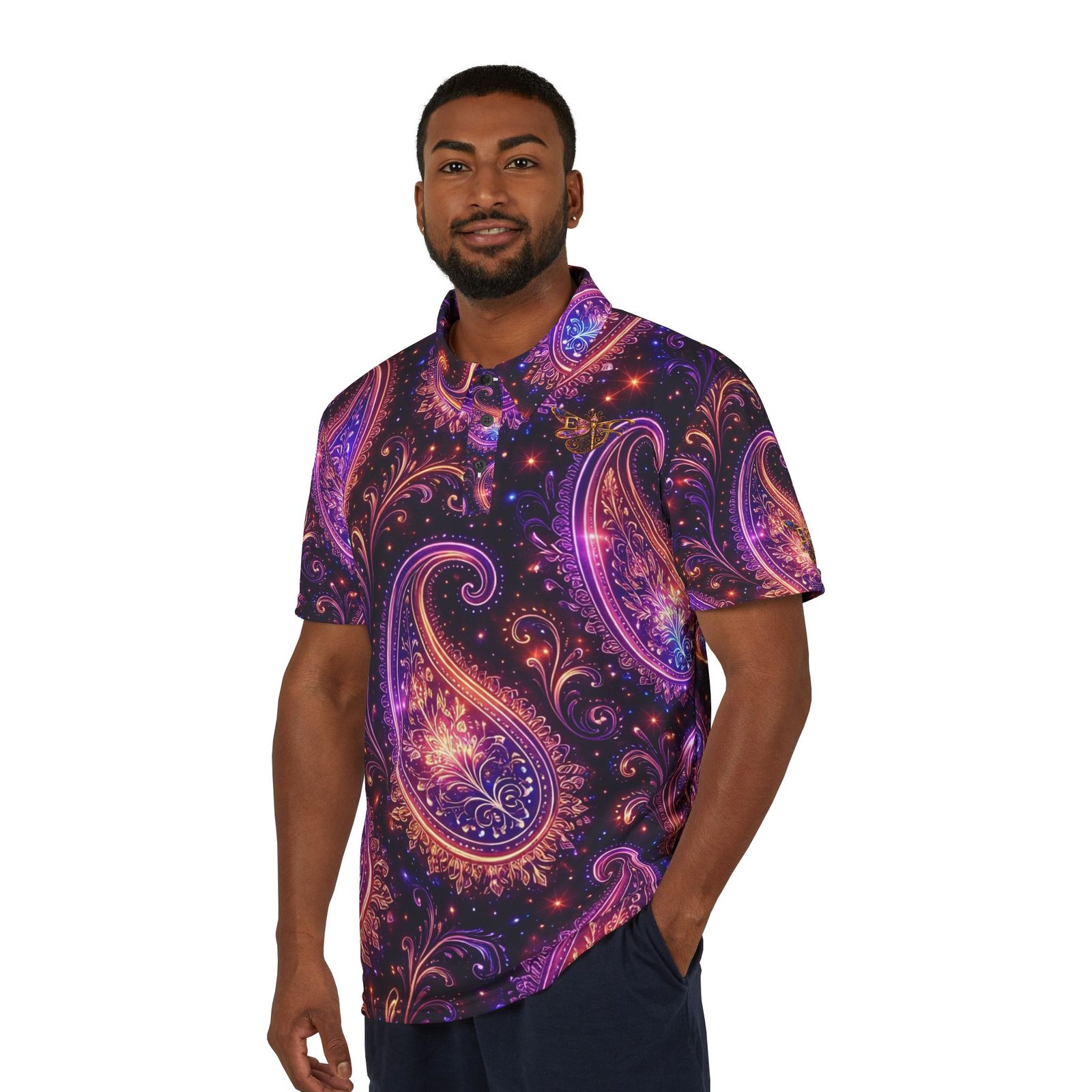 A vibrant, all-over print polo that turns the familiar paisley into something electric. Lightweight and quick-drying, this polo layers easily under a jacket or wears solo on warm evenings. The swirling purple and magenta paisley feels like music you can wear — bold, playful, and a little mysterious. It settles into a weekend rhythm: backyard barbecues, rooftop nights, or a spontaneous road trip where style is part of the story. The pointed collar and three-button placket keep the silhouette classic while the saturated print does the talking. Choose black or white thread and matching buttons to subtly tune the contrast to your look.
