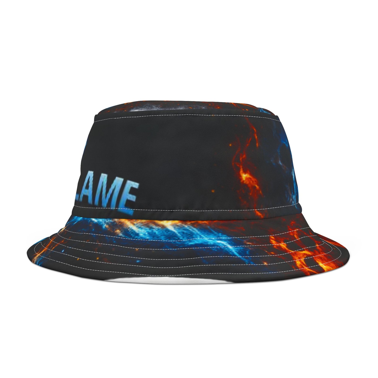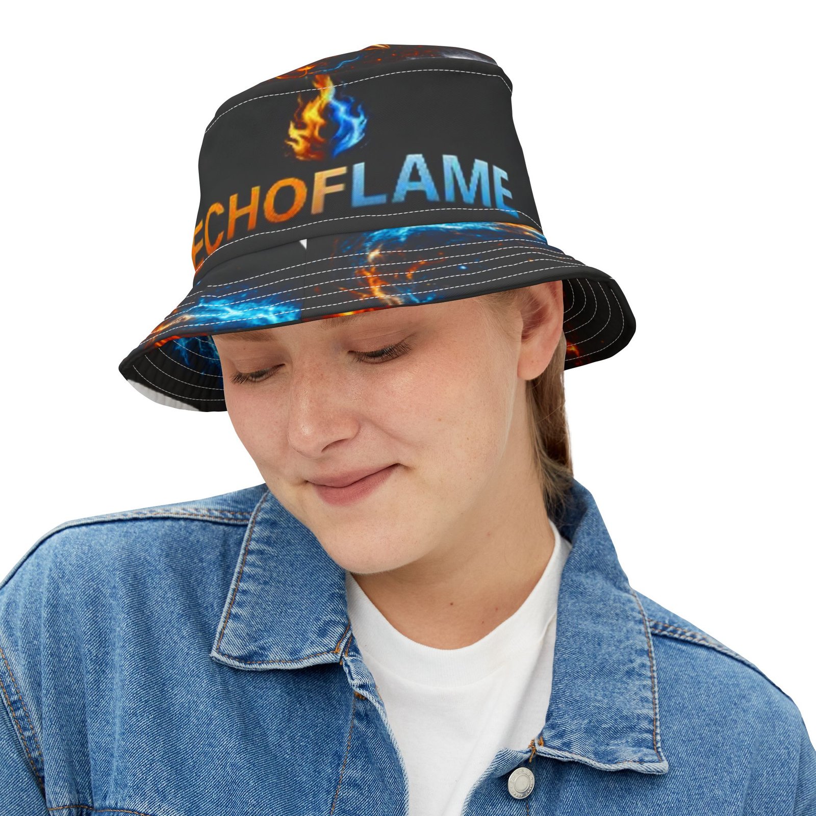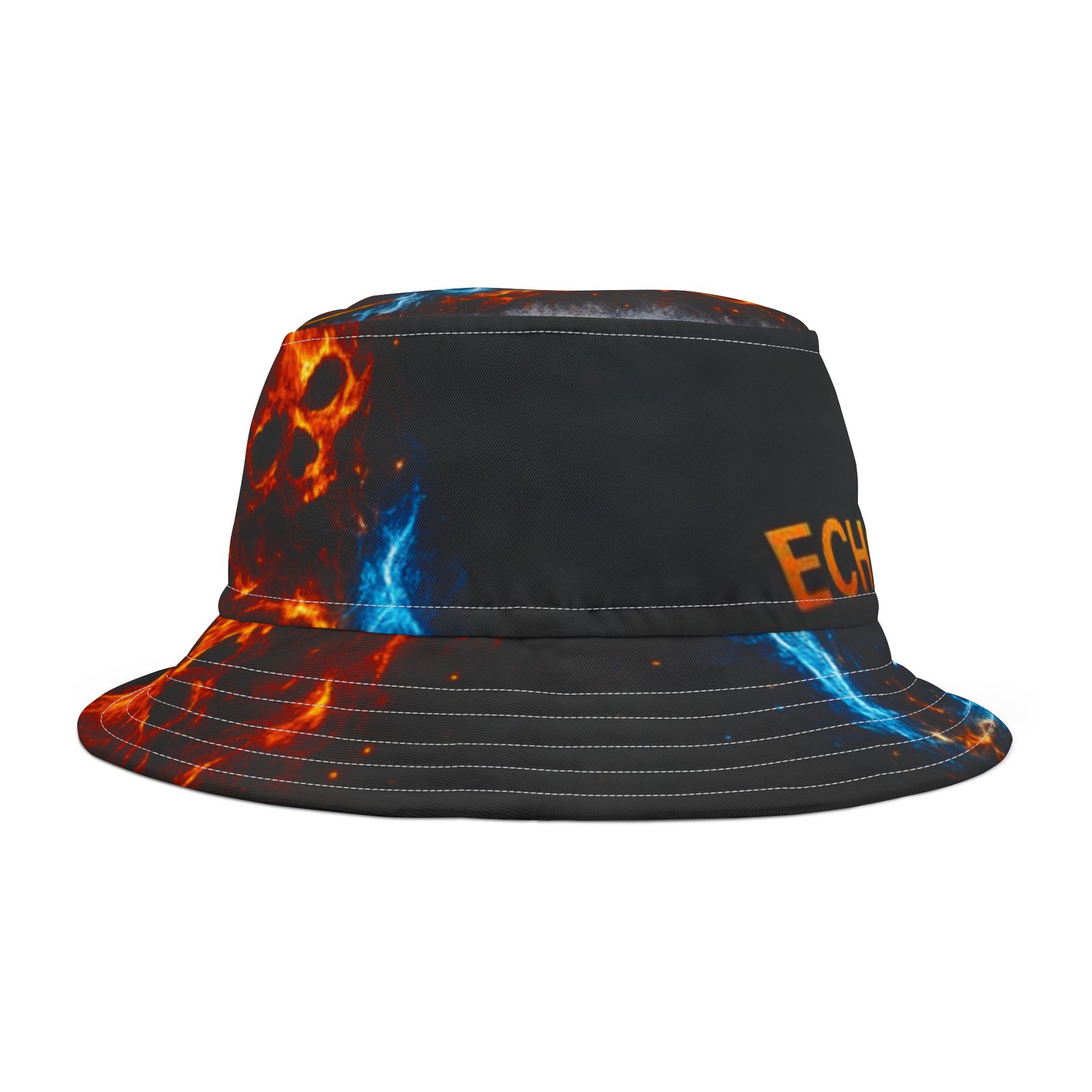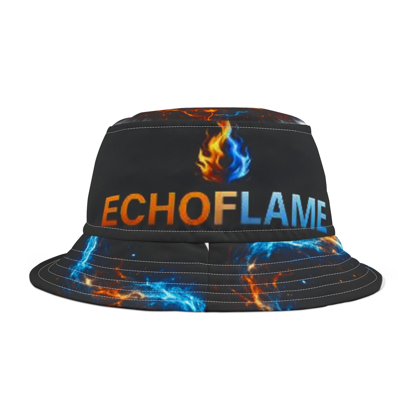 This printed bucket hat brings bold, kinetic energy to everyday wear. A black base lets vivid blue and orange flames pulse around the brim and crown, while the centered flame logo and “ECHOFLAME” lettering add attitude without shouting. Lightweight polyester keeps it packable and breathable; reinforced stitched brims hold shape through festivals, beach days, and street-ready looks. Choose your stitching color and size to make it yours — a wearable pop of color that layers cleanly over casual outfits and amplifies high-energy moments.
