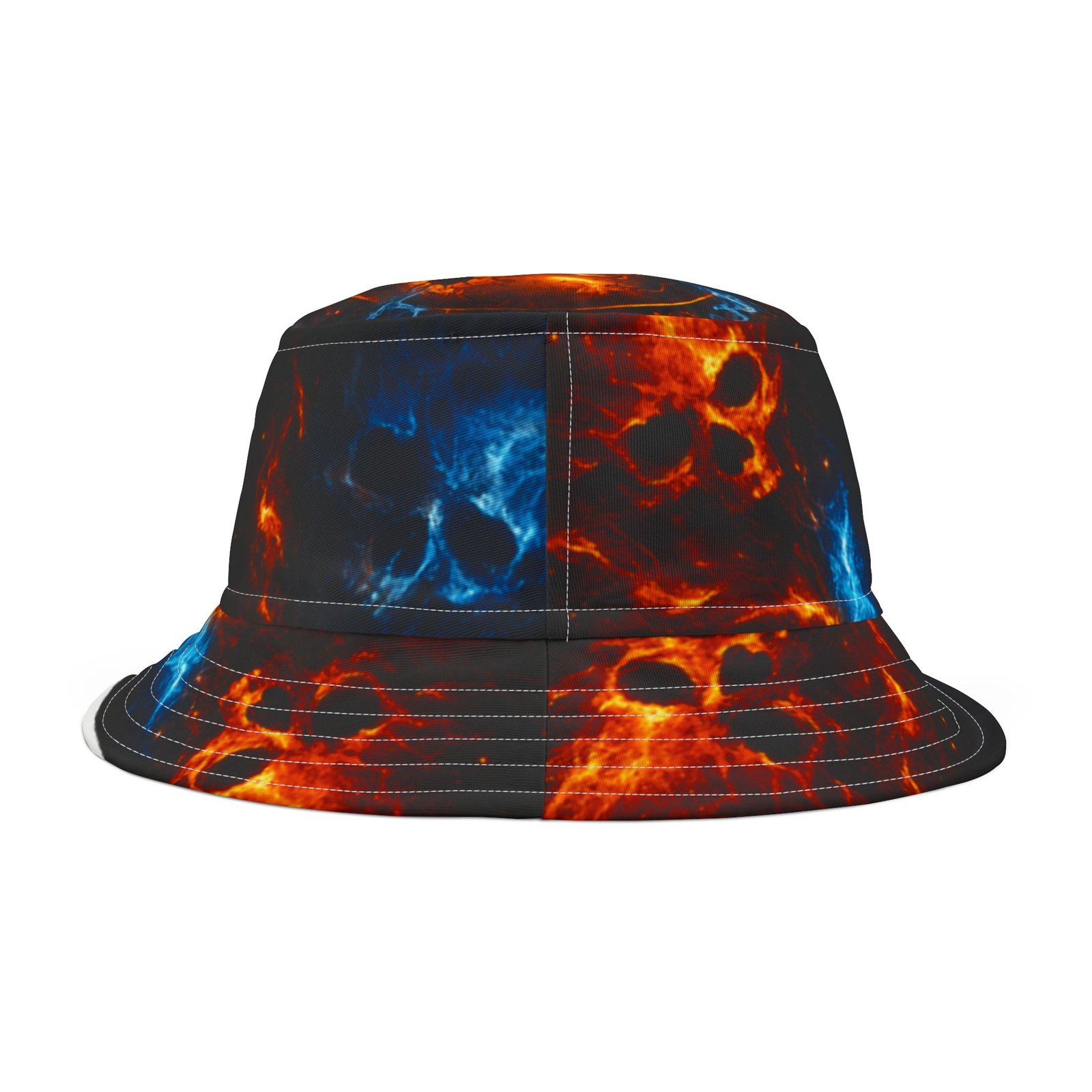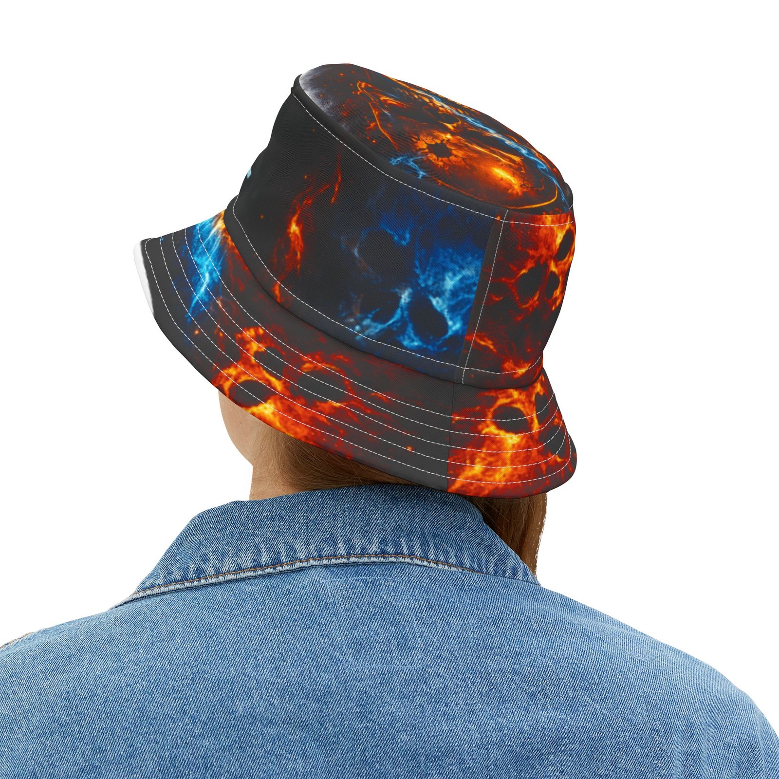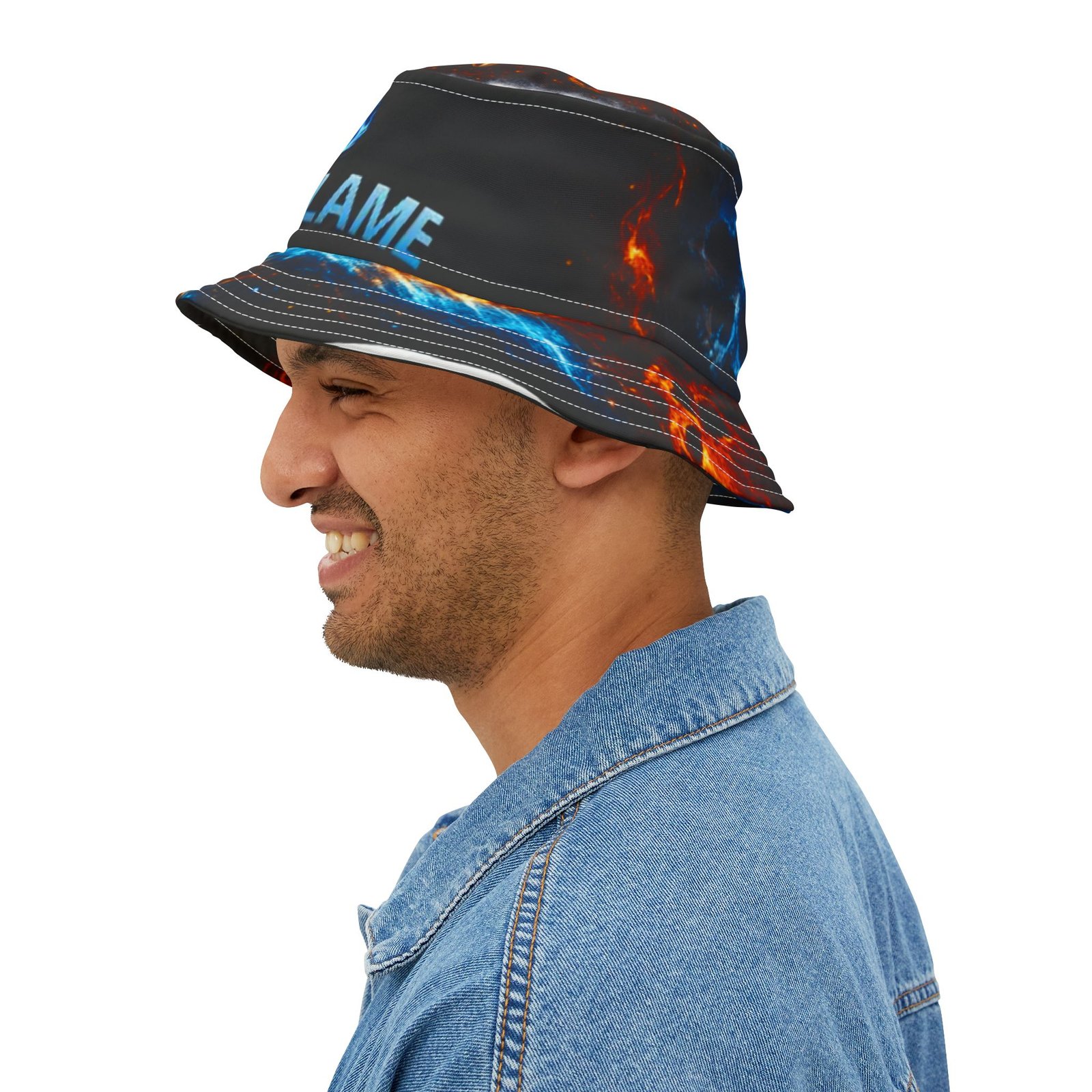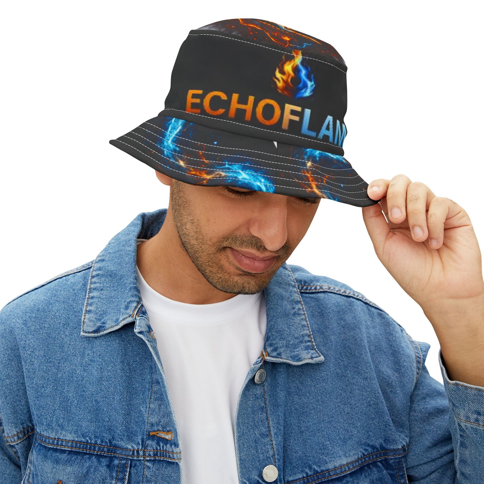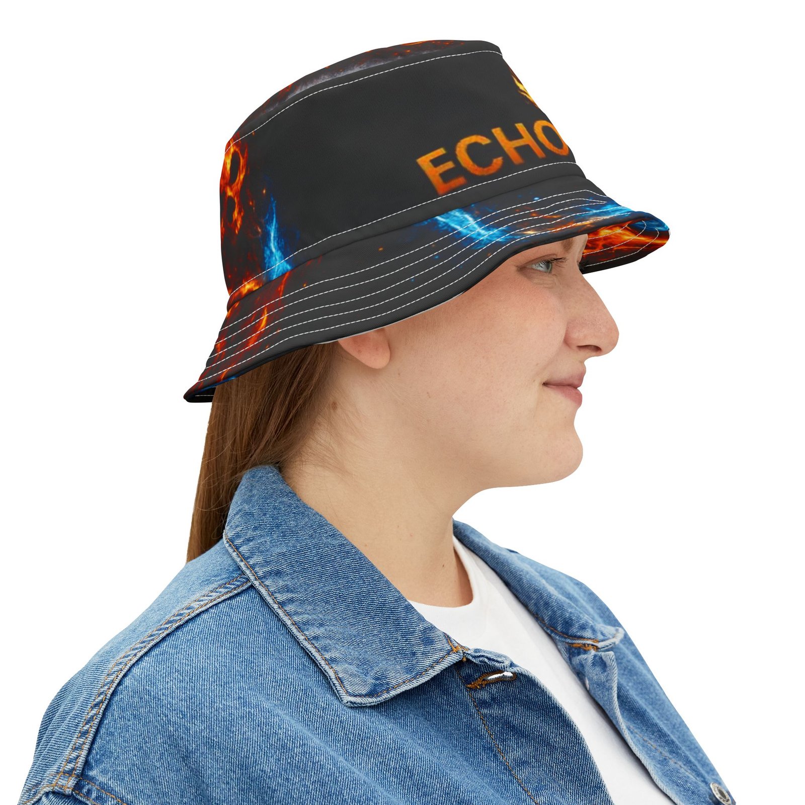 This printed bucket hat brings bold, kinetic energy to everyday wear. A black base lets vivid blue and orange flames pulse around the brim and crown, while the centered flame logo and “ECHOFLAME” lettering add attitude without shouting. Lightweight polyester keeps it packable and breathable; reinforced stitched brims hold shape through festivals, beach days, and street-ready looks. Choose your stitching color and size to make it yours — a wearable pop of color that layers cleanly over casual outfits and amplifies high-energy moments.