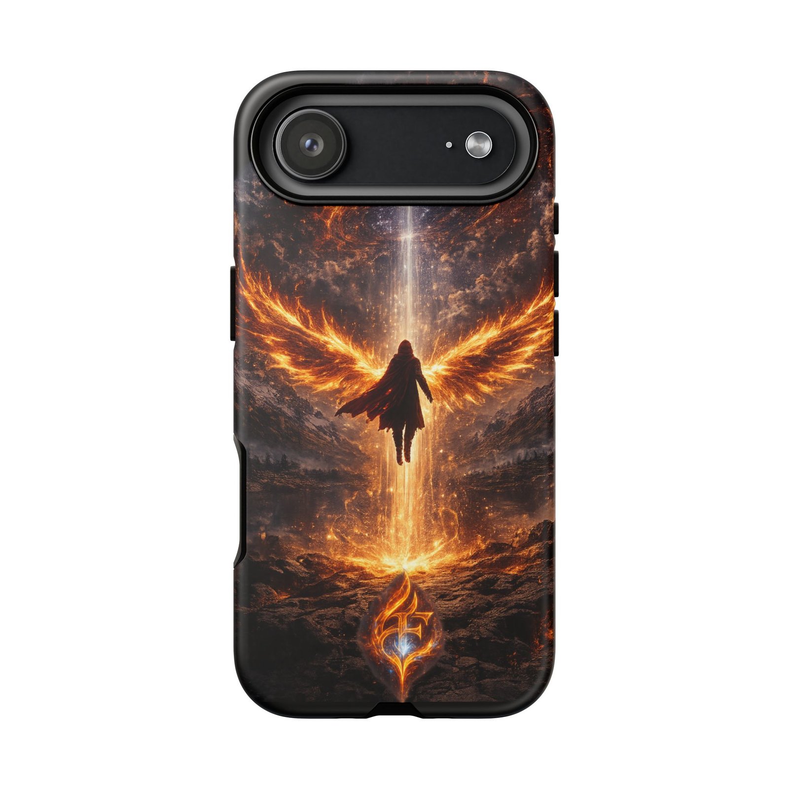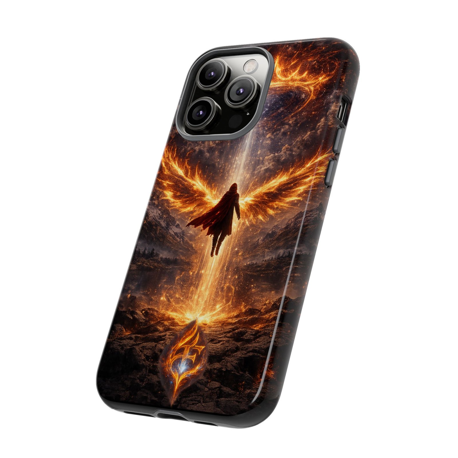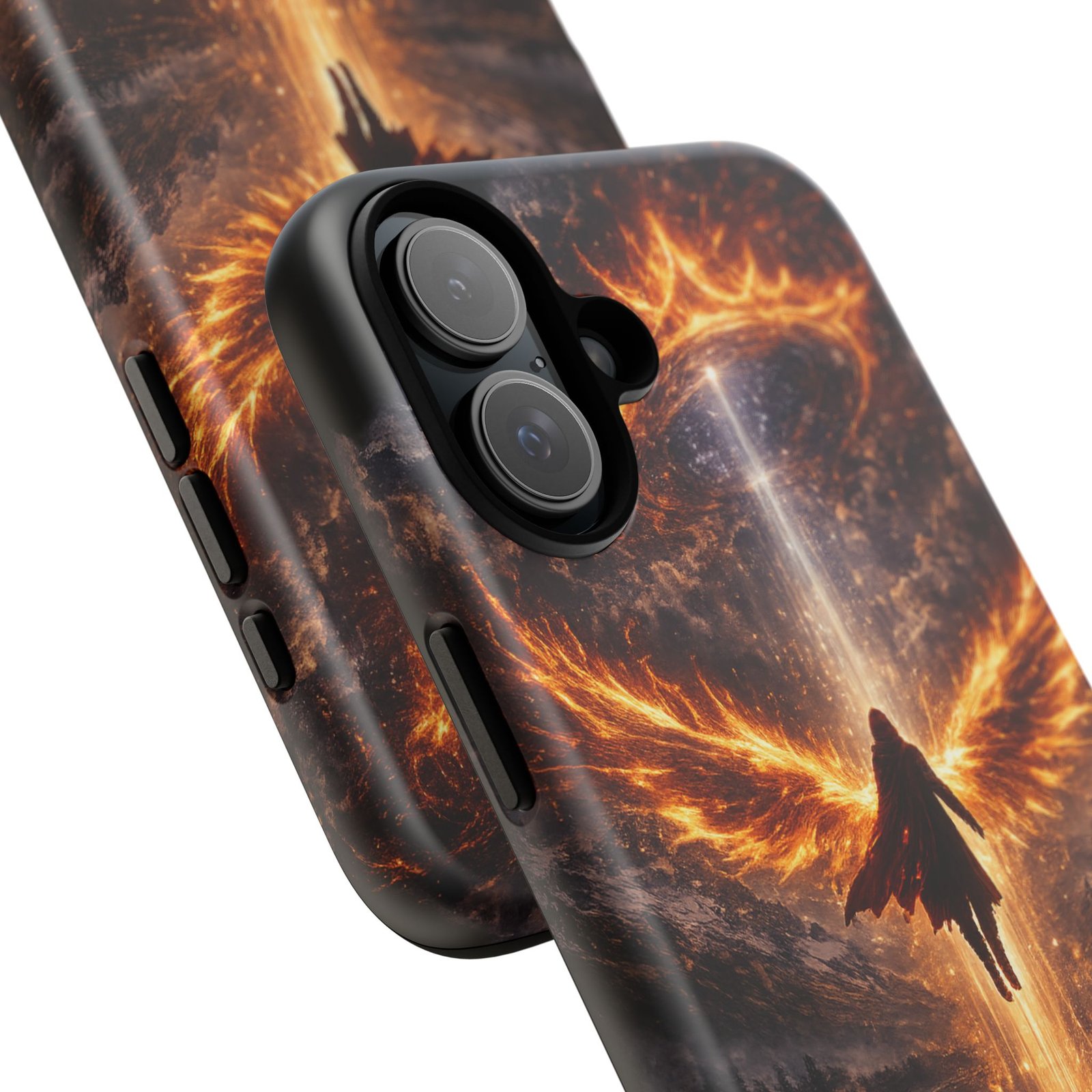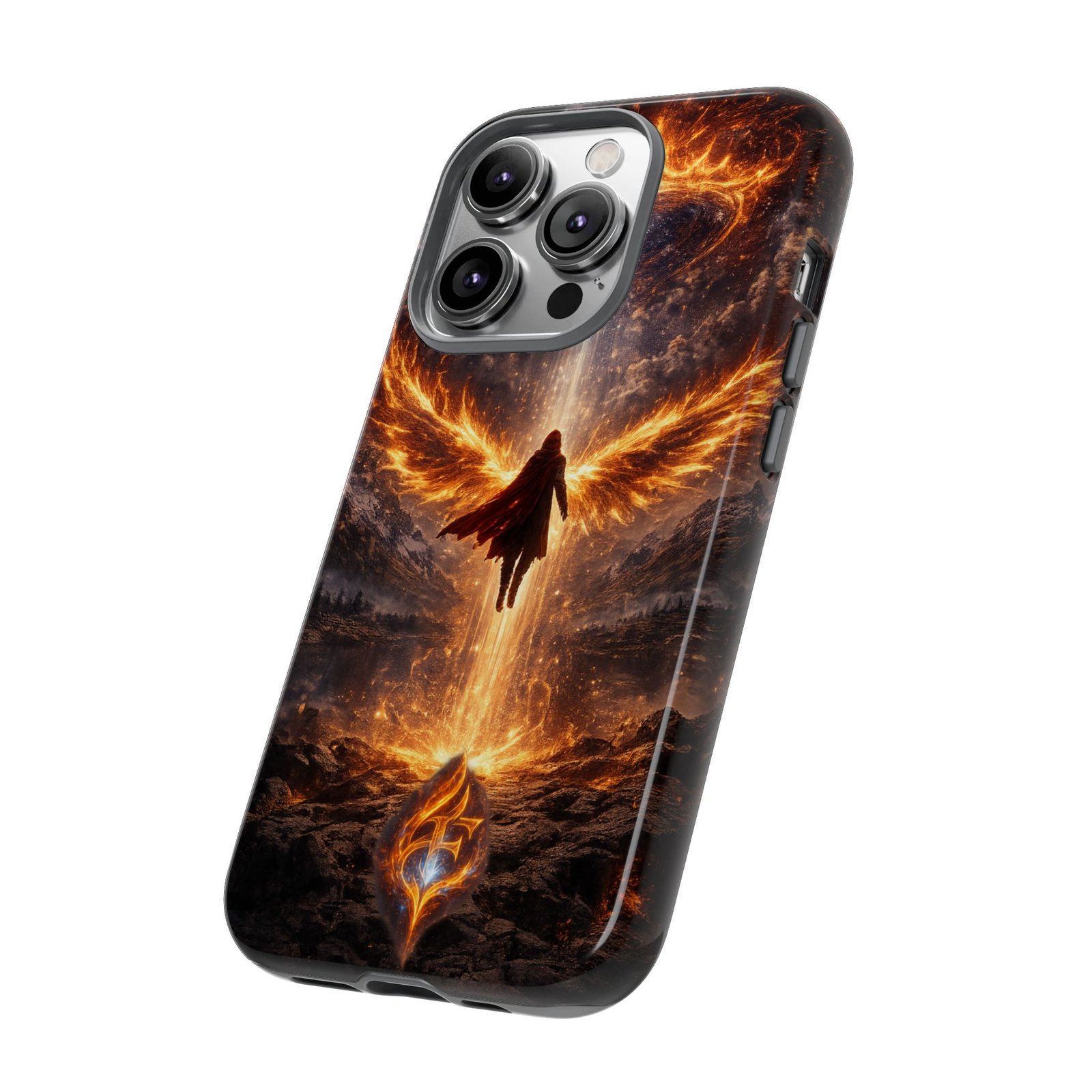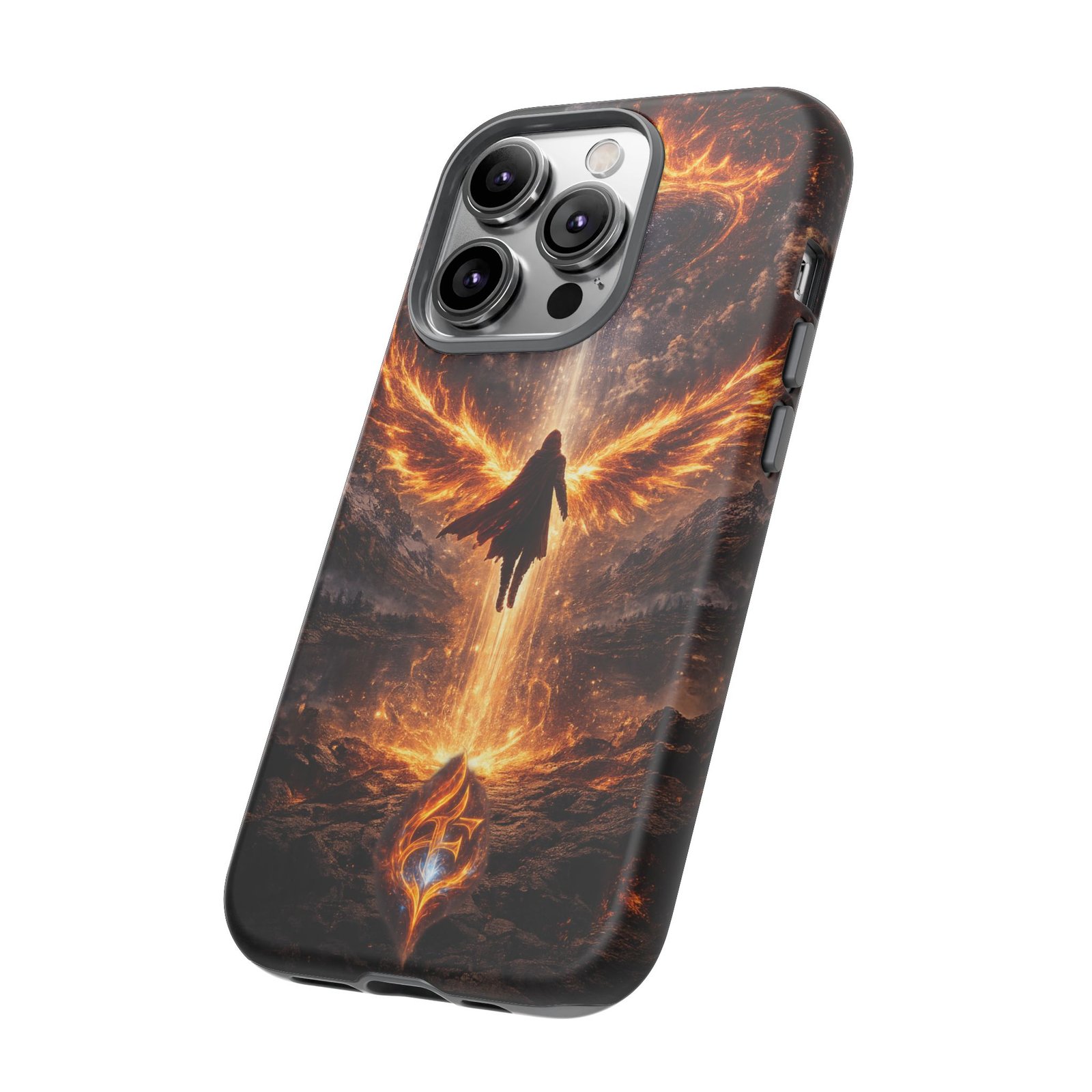 Slide your phone into armor that feels alive. This tough phone case pairs a dual-layer polycarbonate shell with a shock-absorbing TPU liner and a high-density 3D wrap print of a rising, fiery angel — wings unfurling into a halo of flame over a scorched landscape. It reads like a talisman in your hand: resilient, weather-resistant, and made to keep your device intact through daily drops and scrapes while keeping that dramatic artwork vivid. The slim profile preserves wireless charging and clear port access, and finishes are available in glossy or matte to match your look. Follow care notes to keep the colors sharp and the surface pristine.
