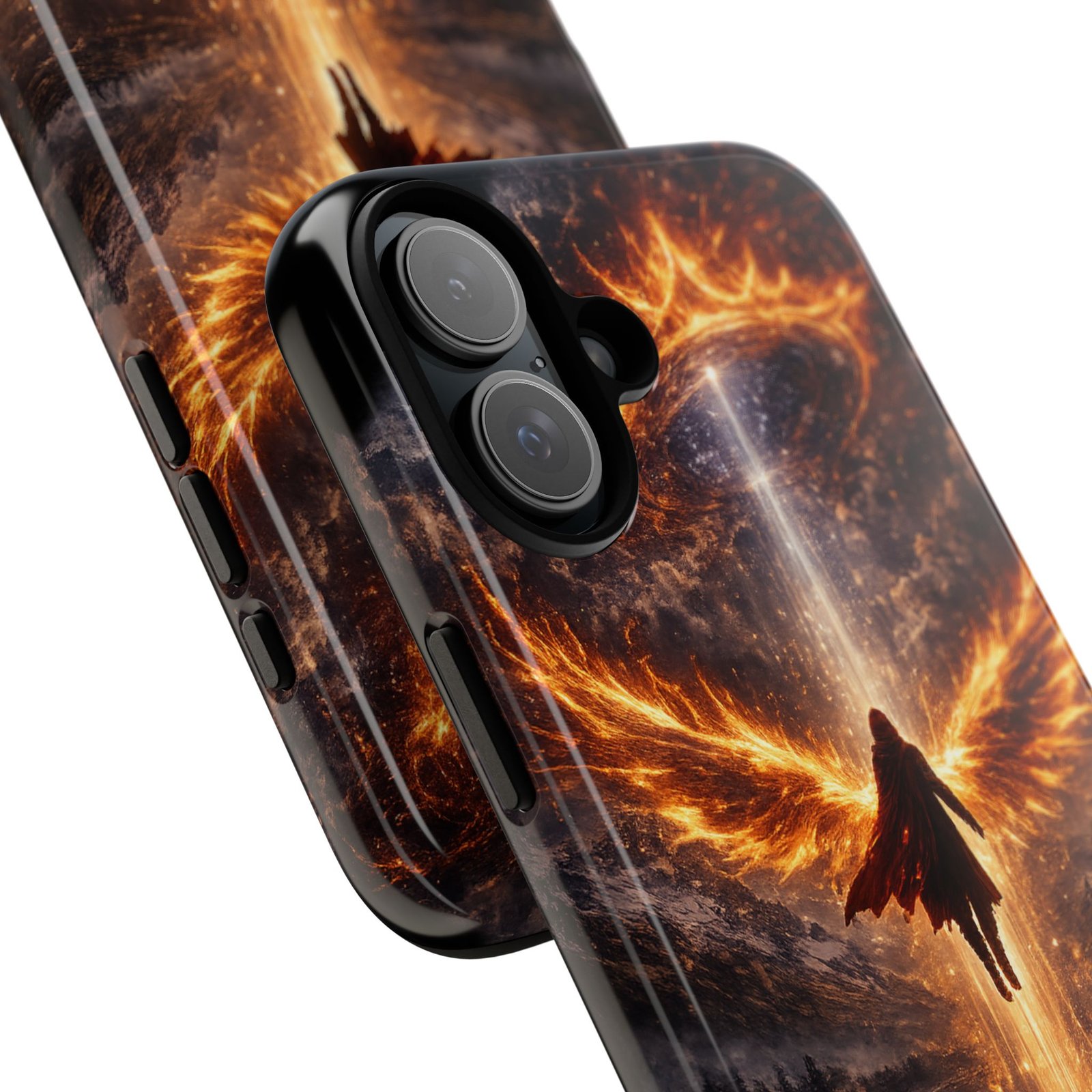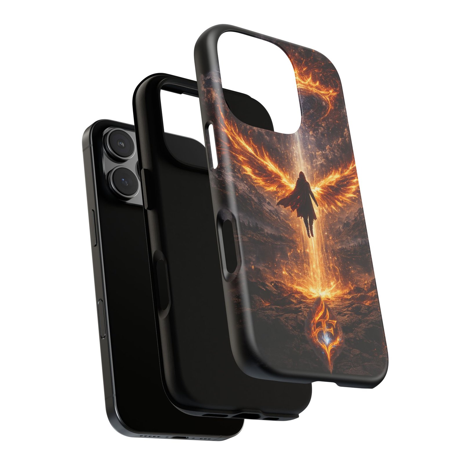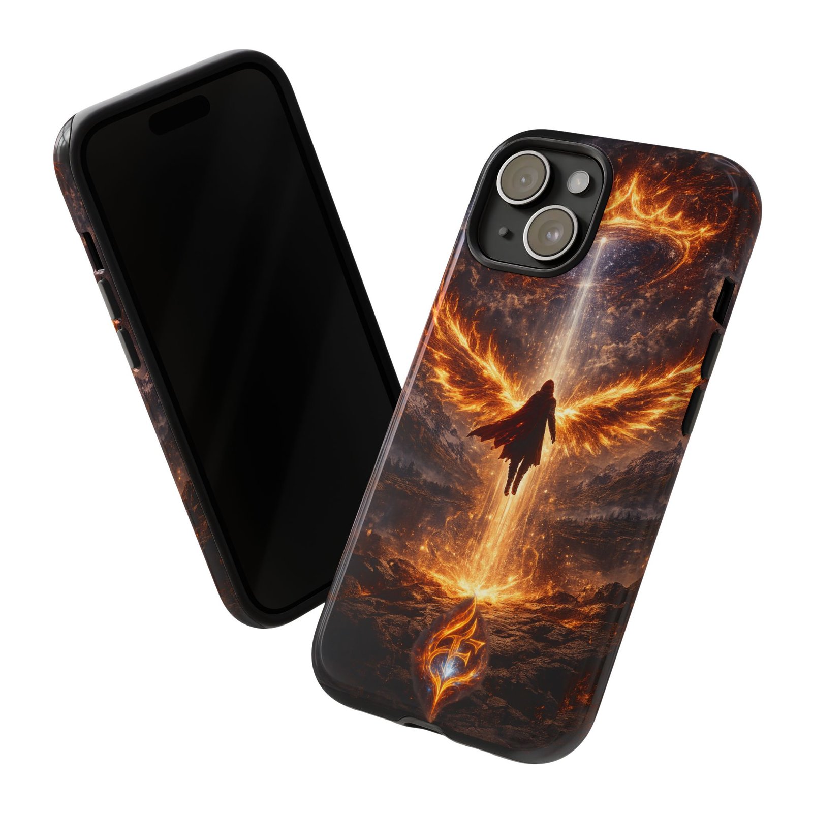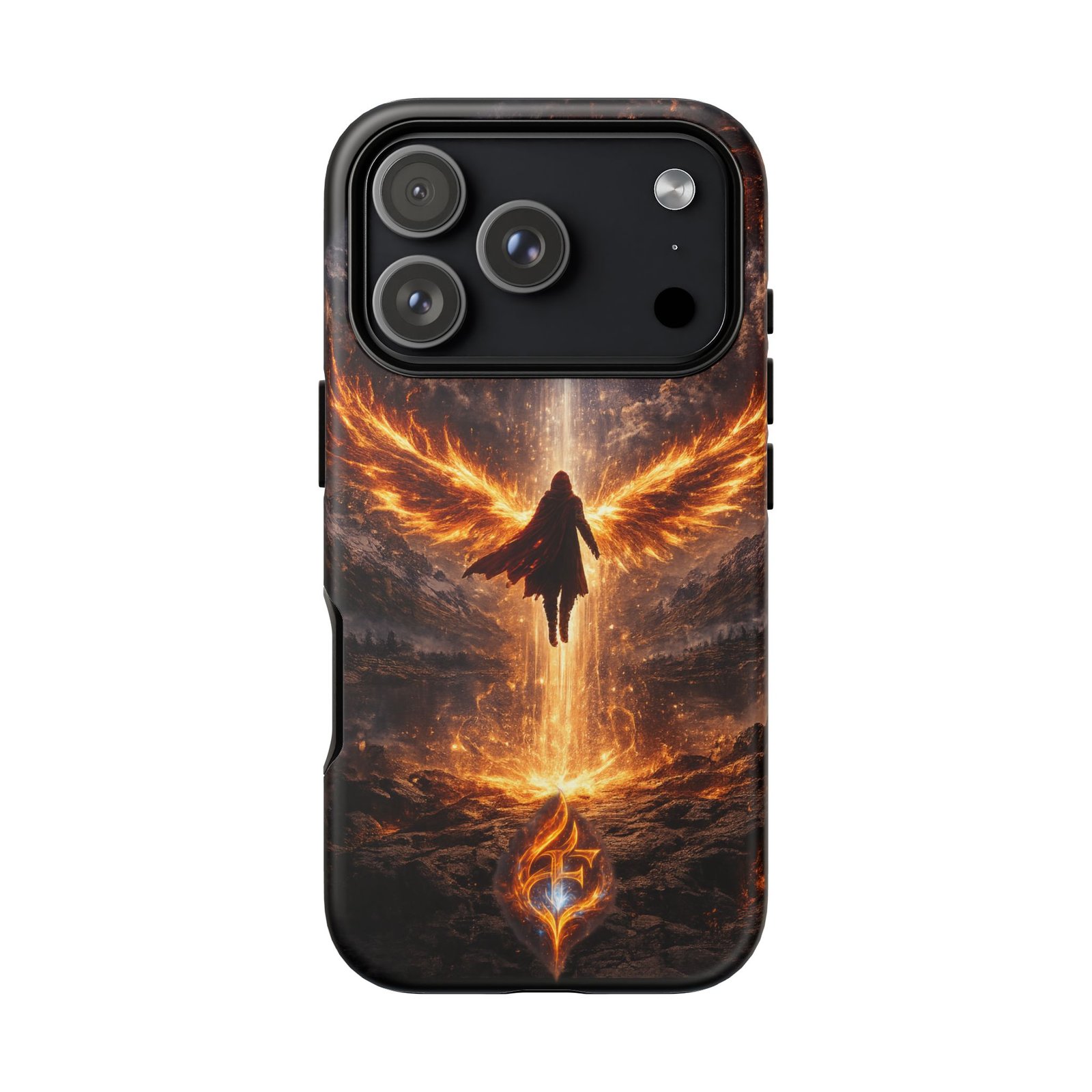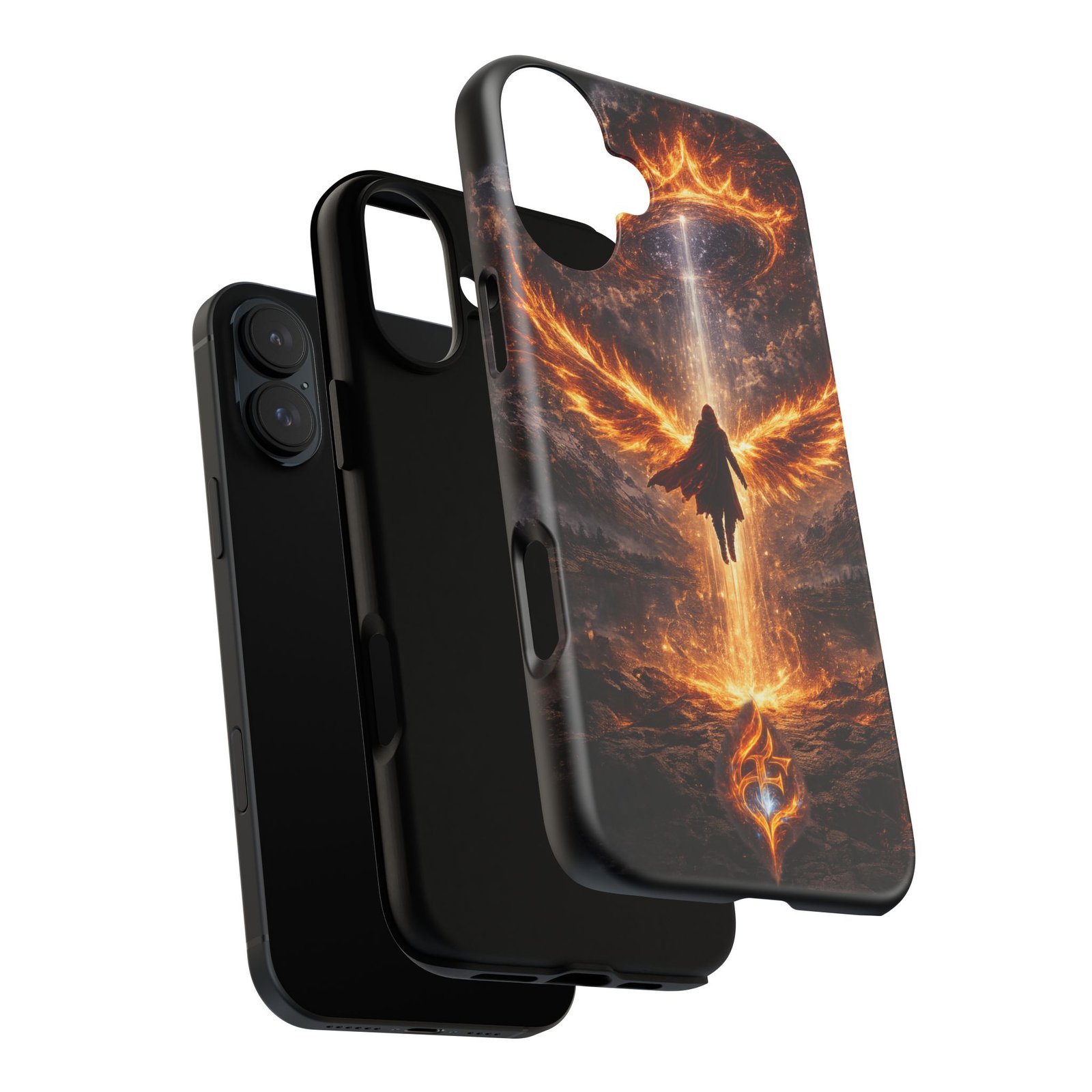Slide your phone into armor that feels alive. This tough phone case pairs a dual-layer polycarbonate shell with a shock-absorbing TPU liner and a high-density 3D wrap print of a rising, fiery angel — wings unfurling into a halo of flame over a scorched landscape. It reads like a talisman in your hand: resilient, weather-resistant, and made to keep your device intact through daily drops and scrapes while keeping that dramatic artwork vivid. The slim profile preserves wireless charging and clear port access, and finishes are available in glossy or matte to match your look. Follow care notes to keep the colors sharp and the surface pristine.
