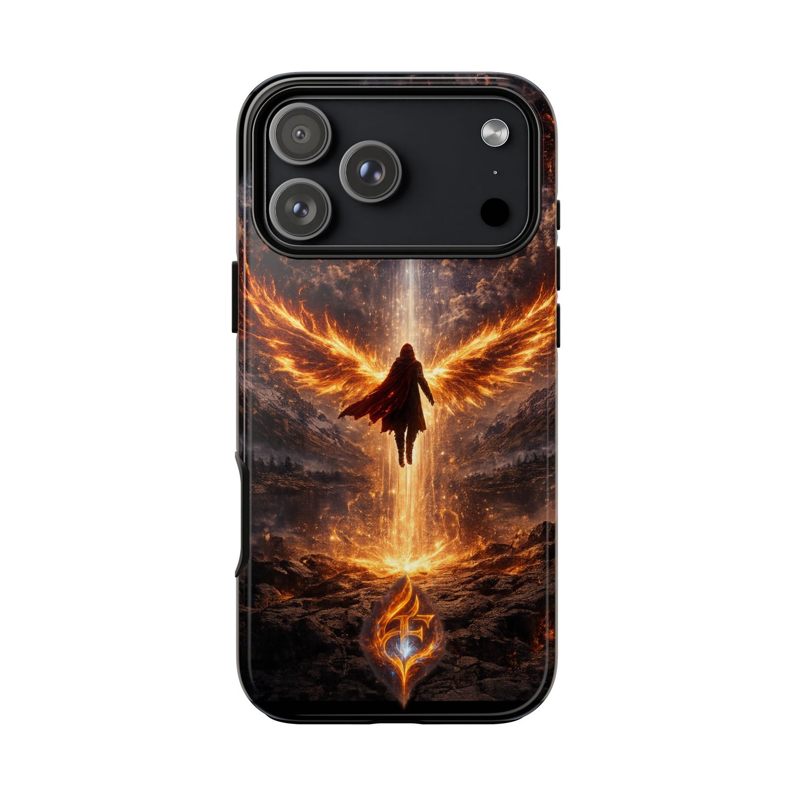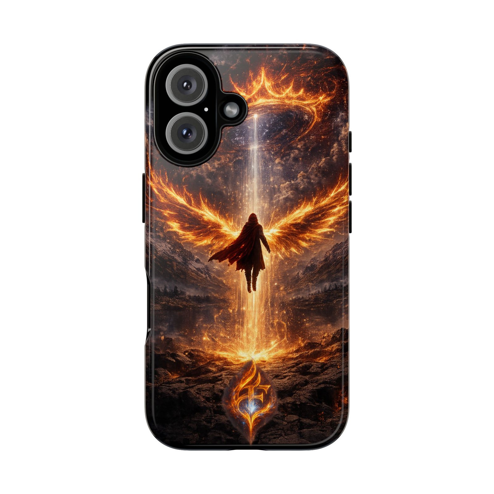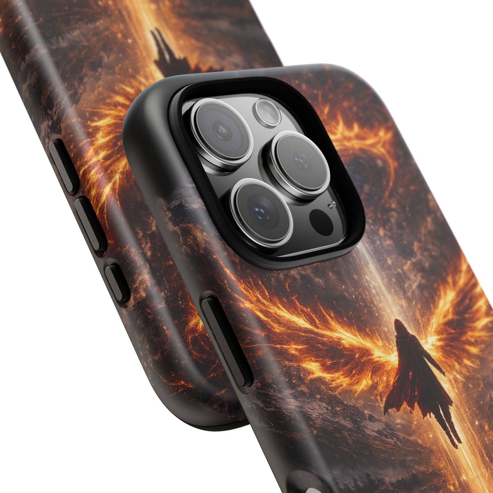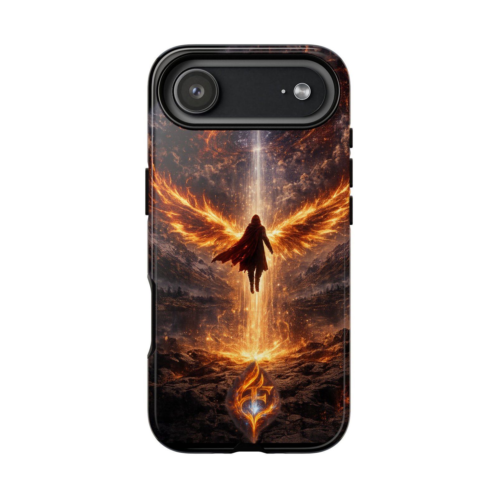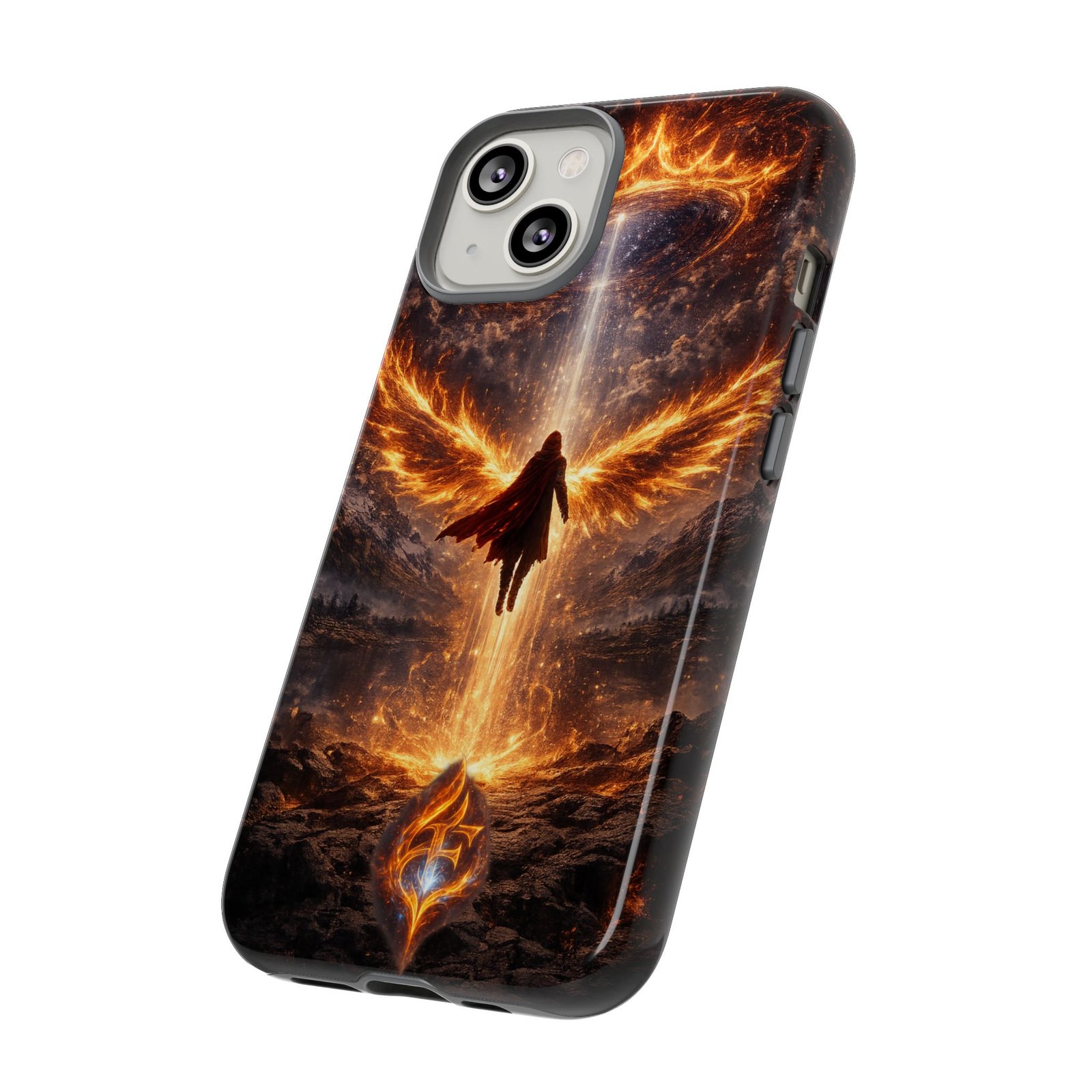 Slide your phone into armor that feels alive. This tough phone case pairs a dual-layer polycarbonate shell with a shock-absorbing TPU liner and a high-density 3D wrap print of a rising, fiery angel — wings unfurling into a halo of flame over a scorched landscape. It reads like a talisman in your hand: resilient, weather-resistant, and made to keep your device intact through daily drops and scrapes while keeping that dramatic artwork vivid. The slim profile preserves wireless charging and clear port access, and finishes are available in glossy or matte to match your look. Follow care notes to keep the colors sharp and the surface pristine.