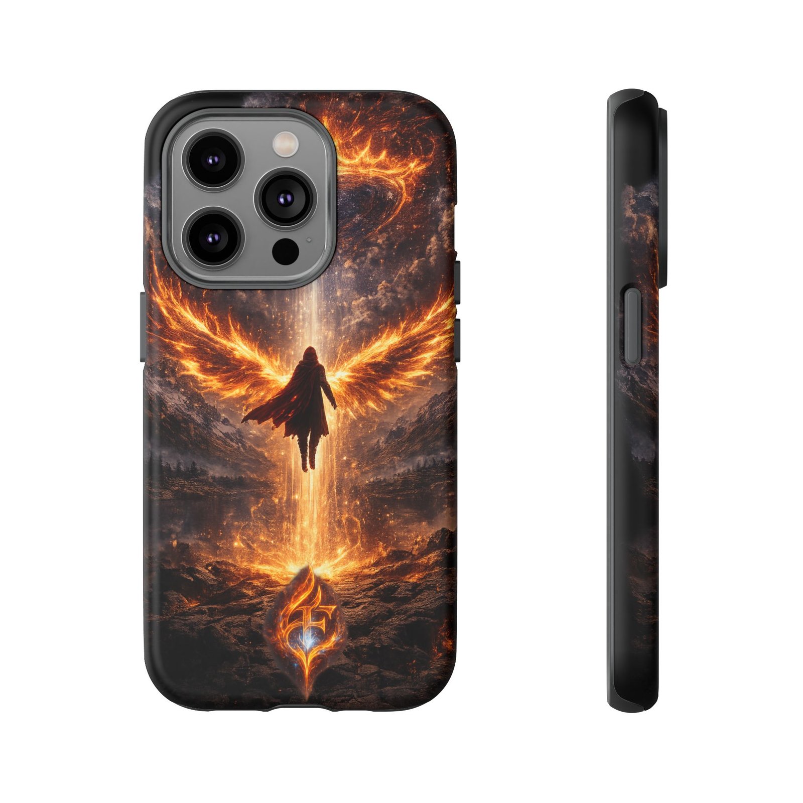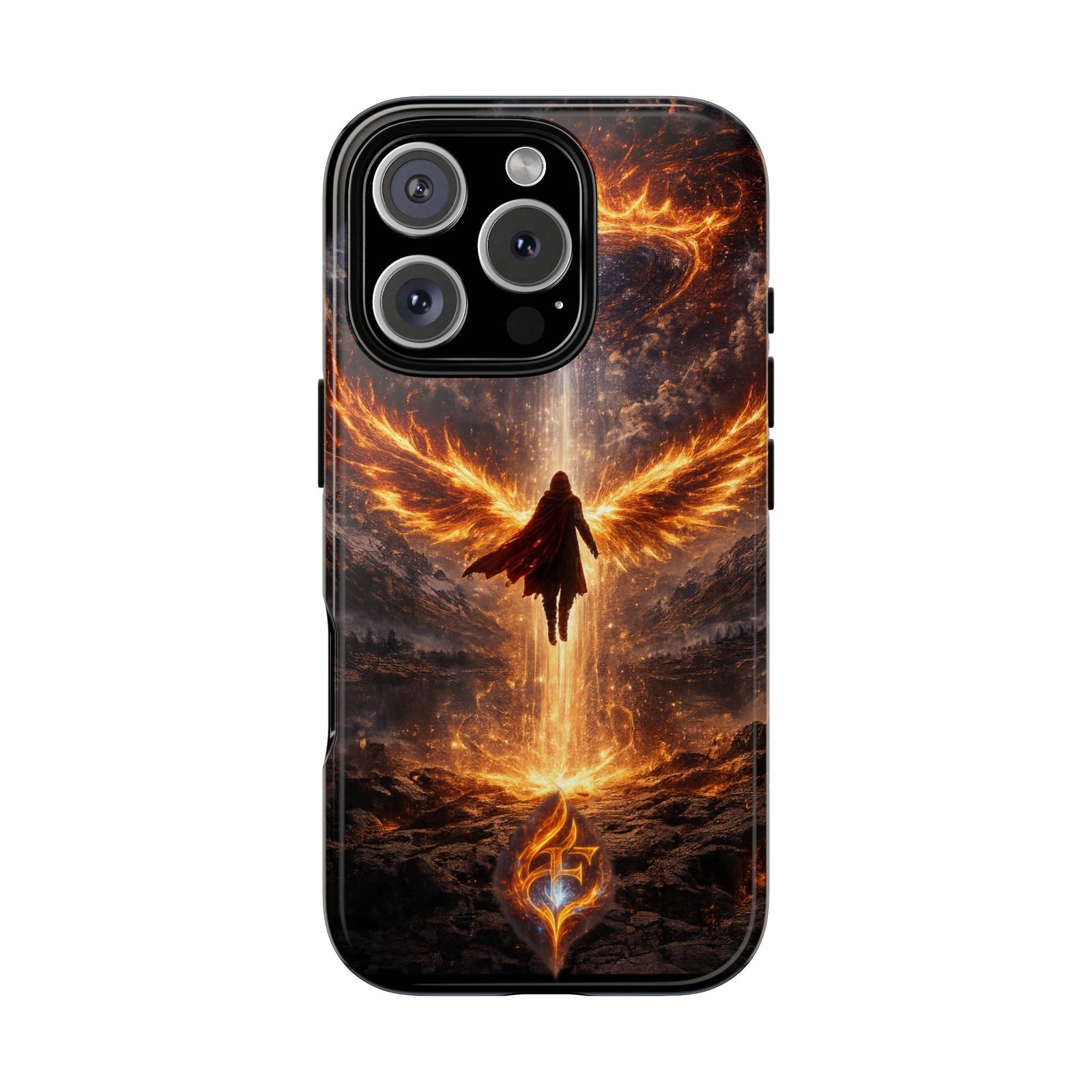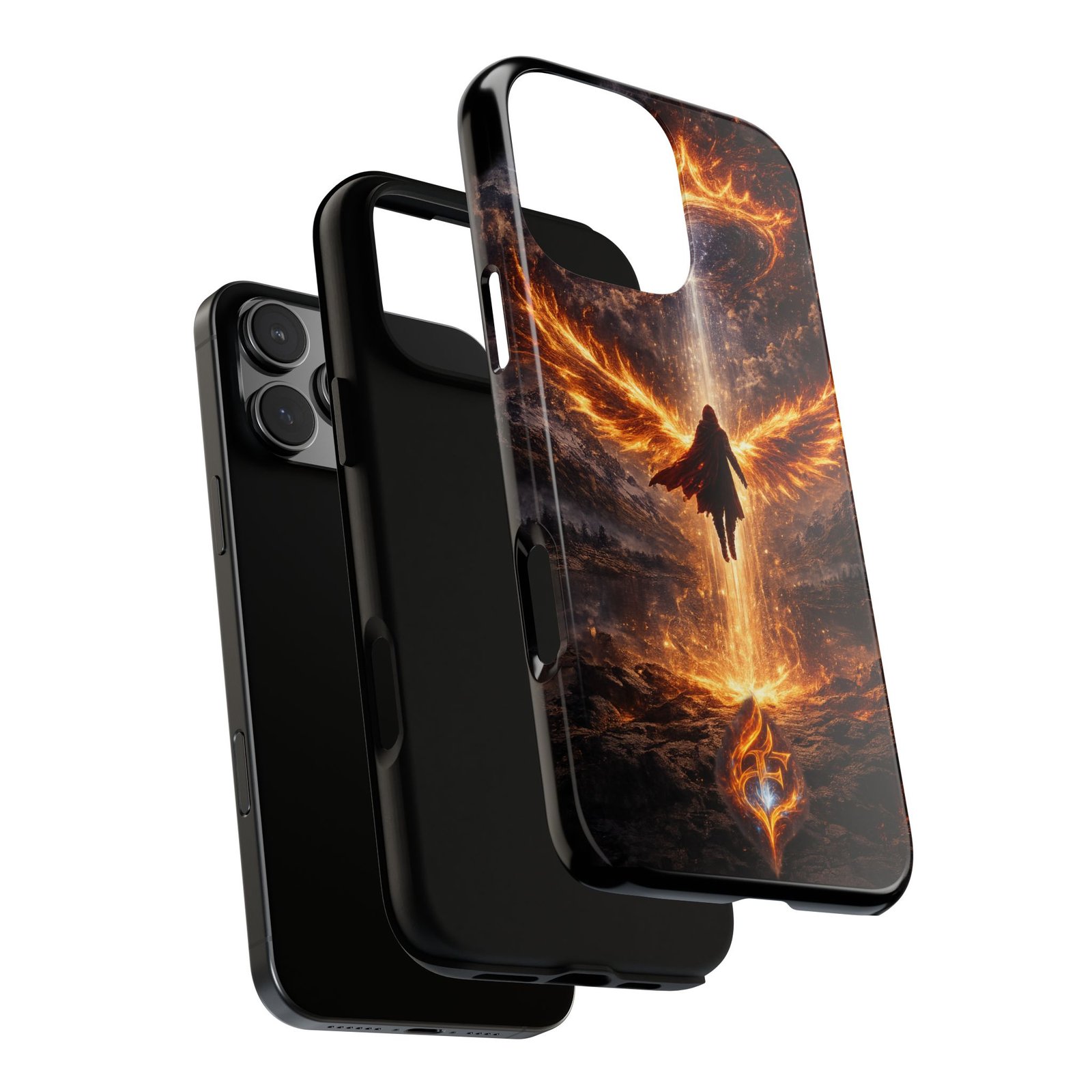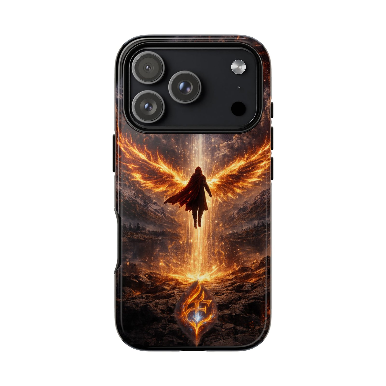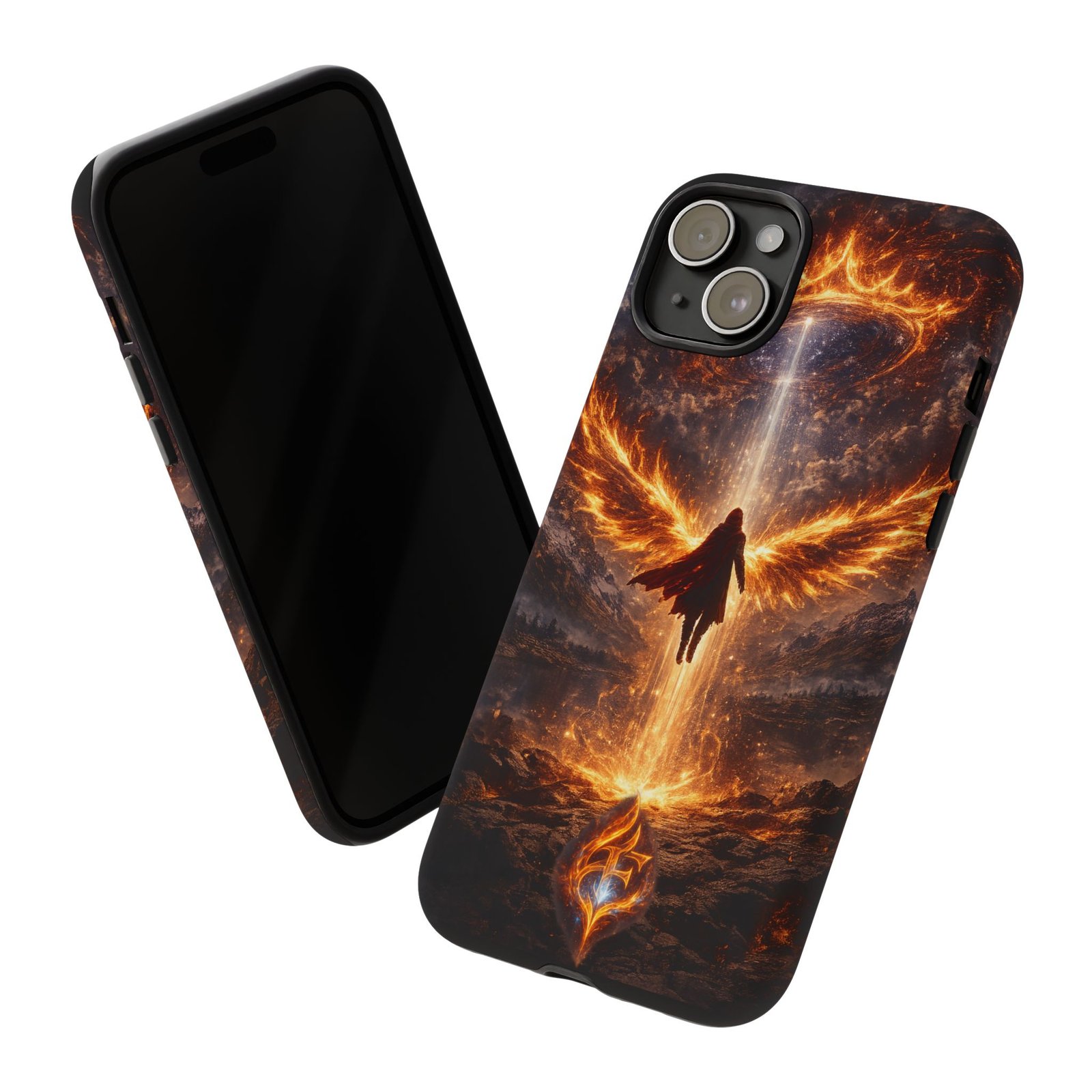 Slide your phone into armor that feels alive. This tough phone case pairs a dual-layer polycarbonate shell with a shock-absorbing TPU liner and a high-density 3D wrap print of a rising, fiery angel — wings unfurling into a halo of flame over a scorched landscape. It reads like a talisman in your hand: resilient, weather-resistant, and made to keep your device intact through daily drops and scrapes while keeping that dramatic artwork vivid. The slim profile preserves wireless charging and clear port access, and finishes are available in glossy or matte to match your look. Follow care notes to keep the colors sharp and the surface pristine.