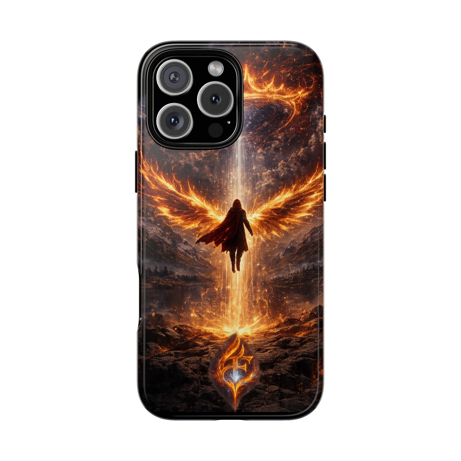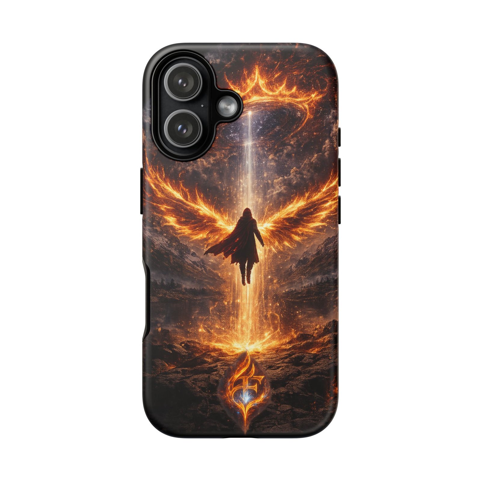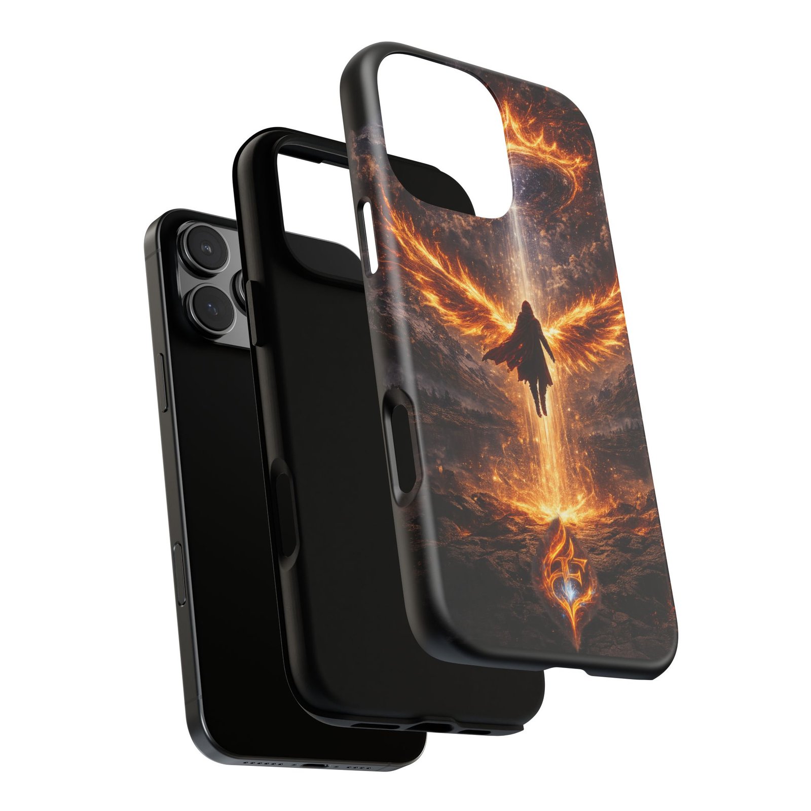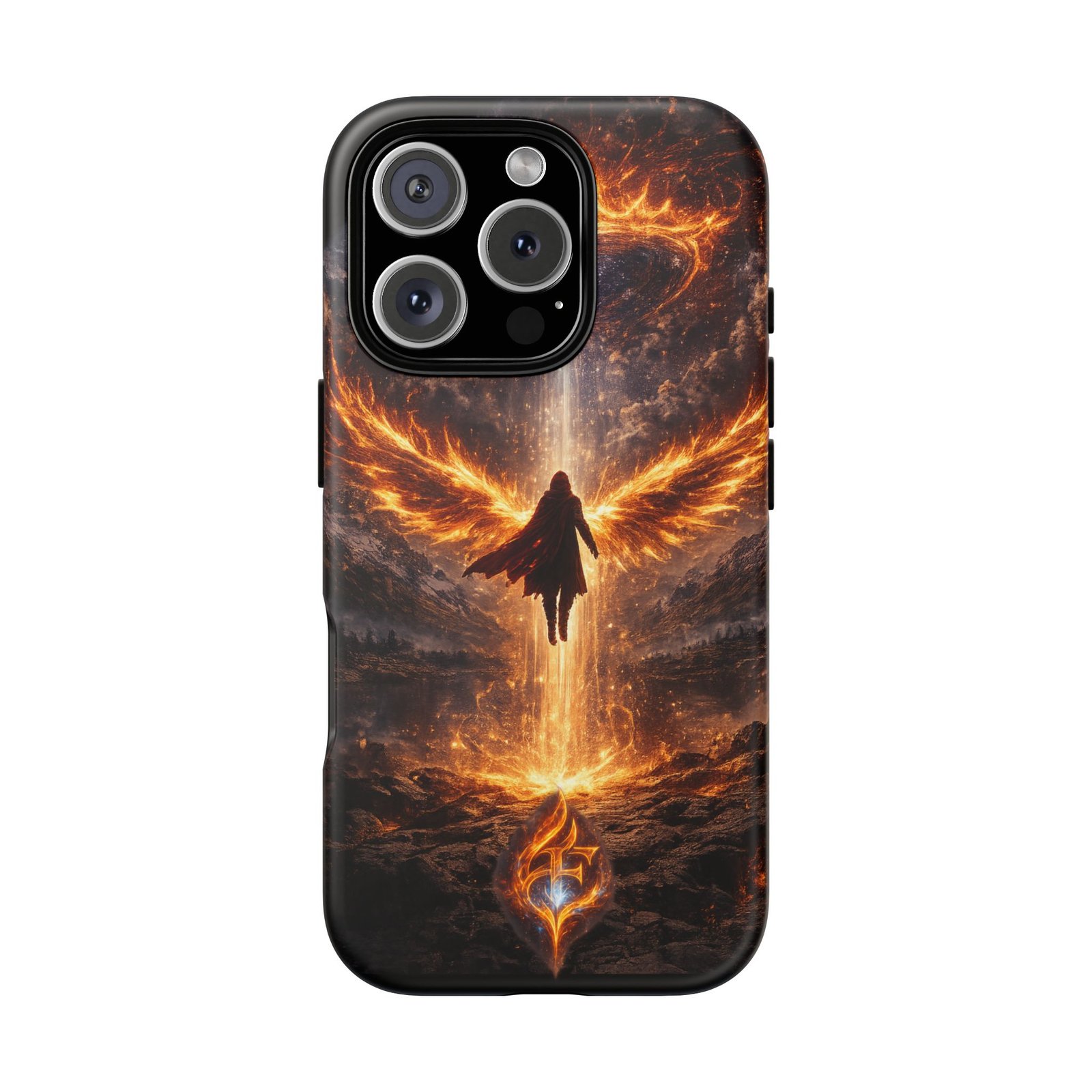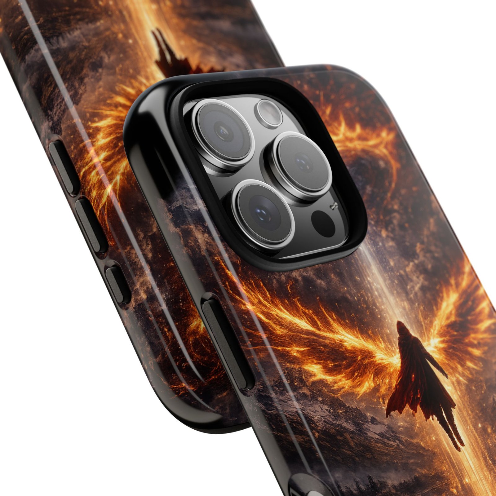 Slide your phone into armor that feels alive. This tough phone case pairs a dual-layer polycarbonate shell with a shock-absorbing TPU liner and a high-density 3D wrap print of a rising, fiery angel — wings unfurling into a halo of flame over a scorched landscape. It reads like a talisman in your hand: resilient, weather-resistant, and made to keep your device intact through daily drops and scrapes while keeping that dramatic artwork vivid. The slim profile preserves wireless charging and clear port access, and finishes are available in glossy or matte to match your look. Follow care notes to keep the colors sharp and the surface pristine.