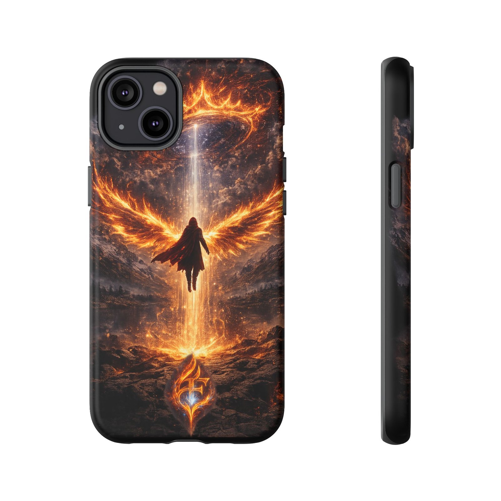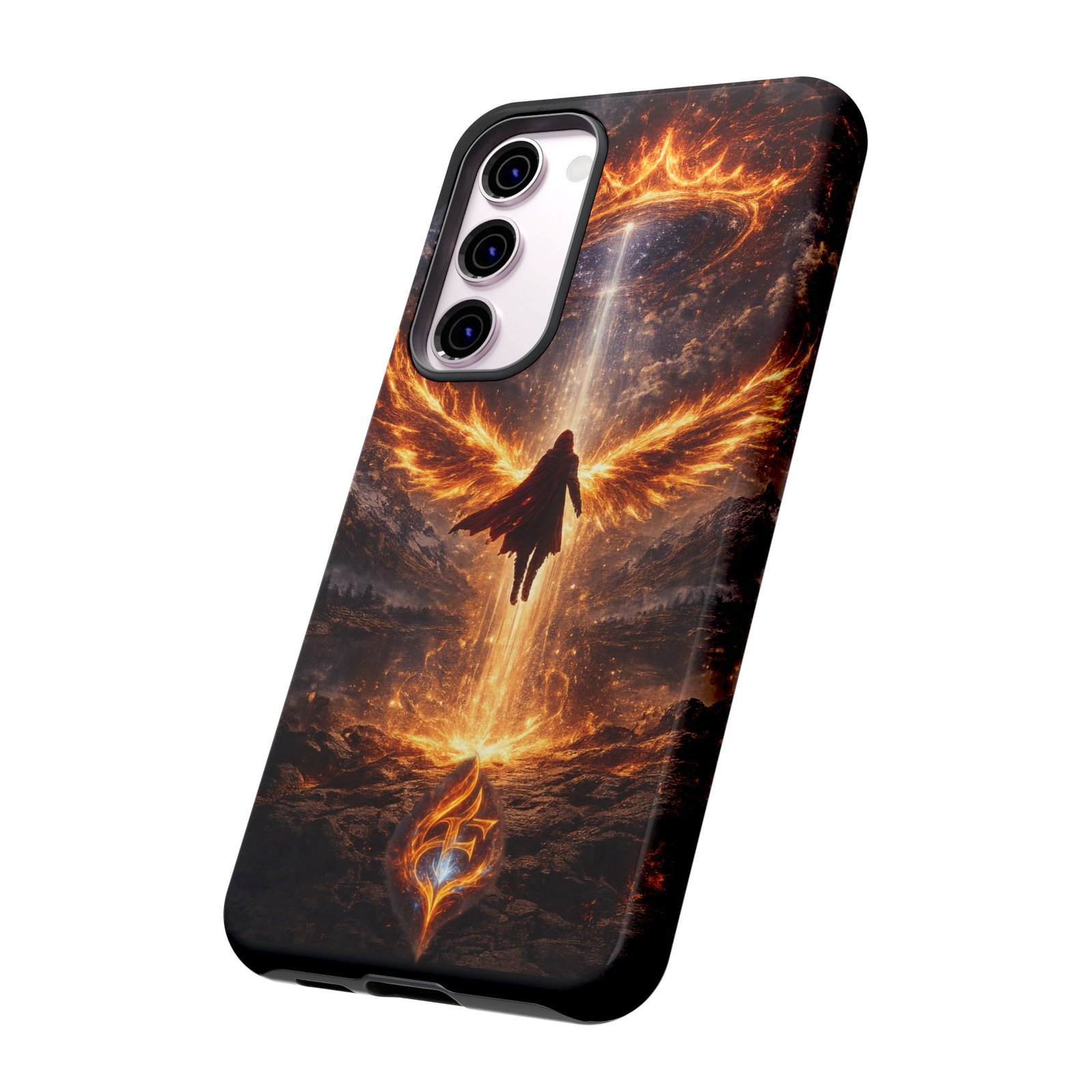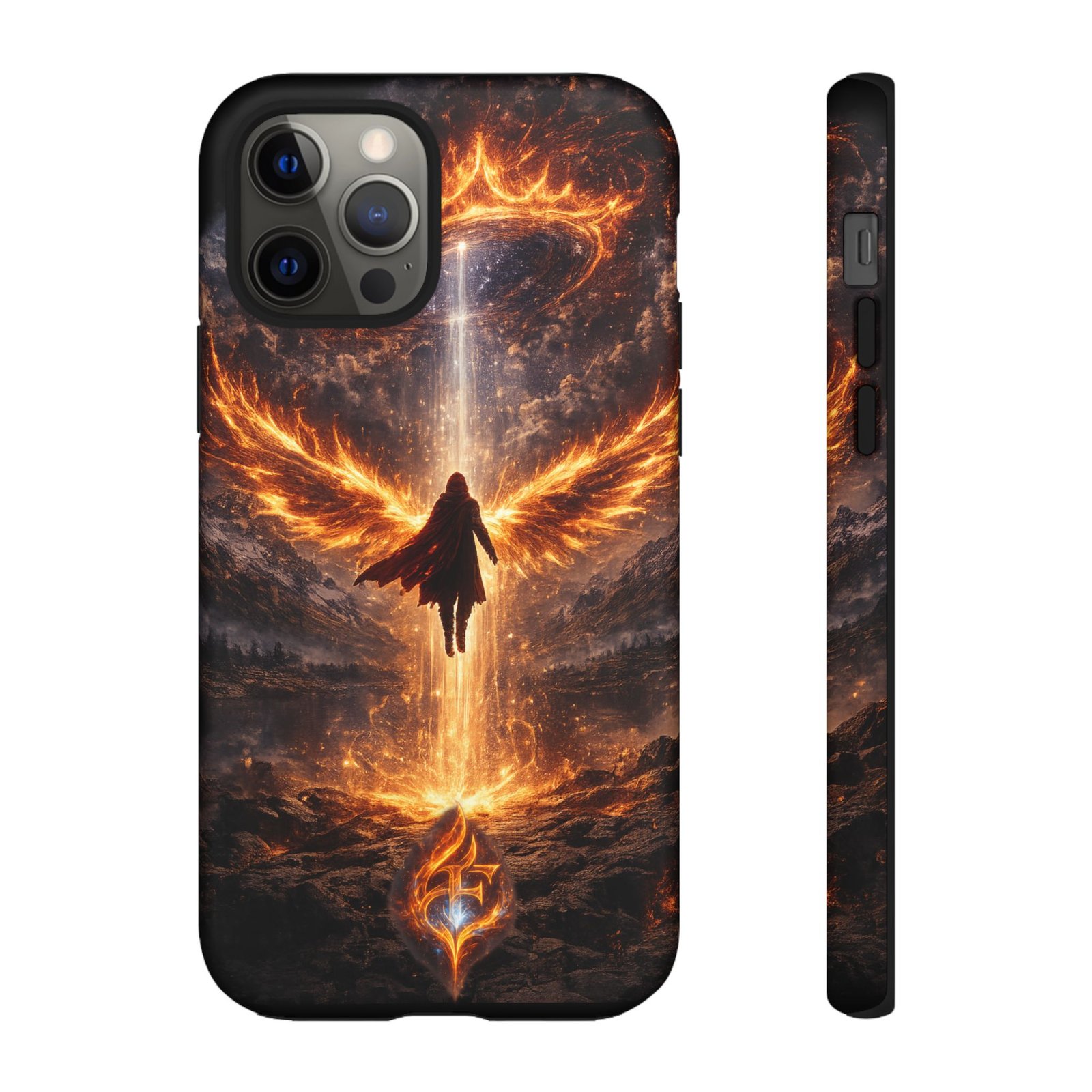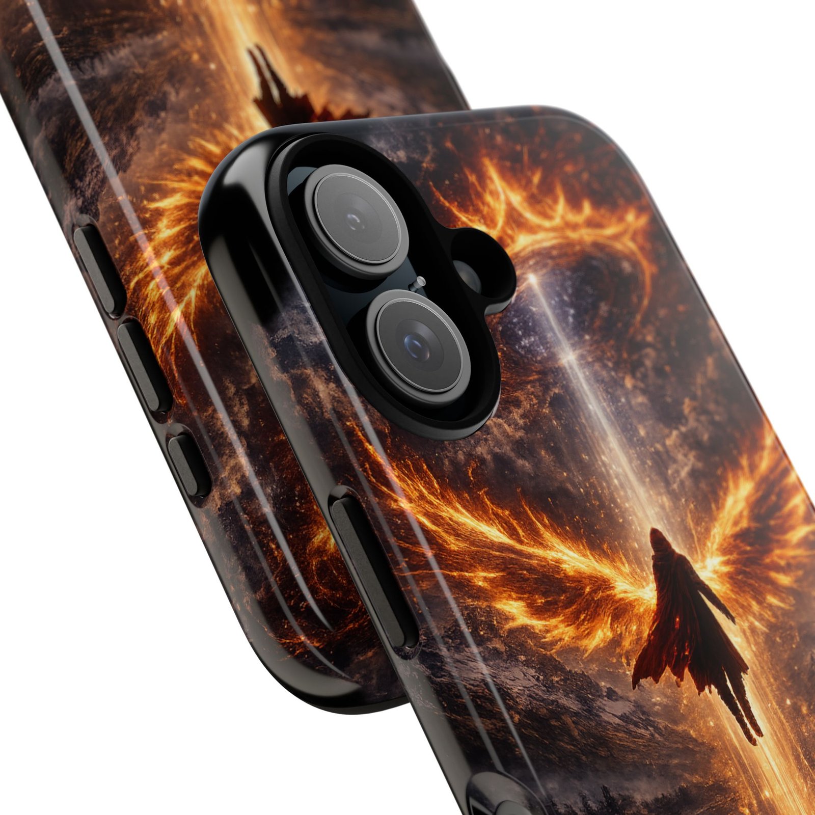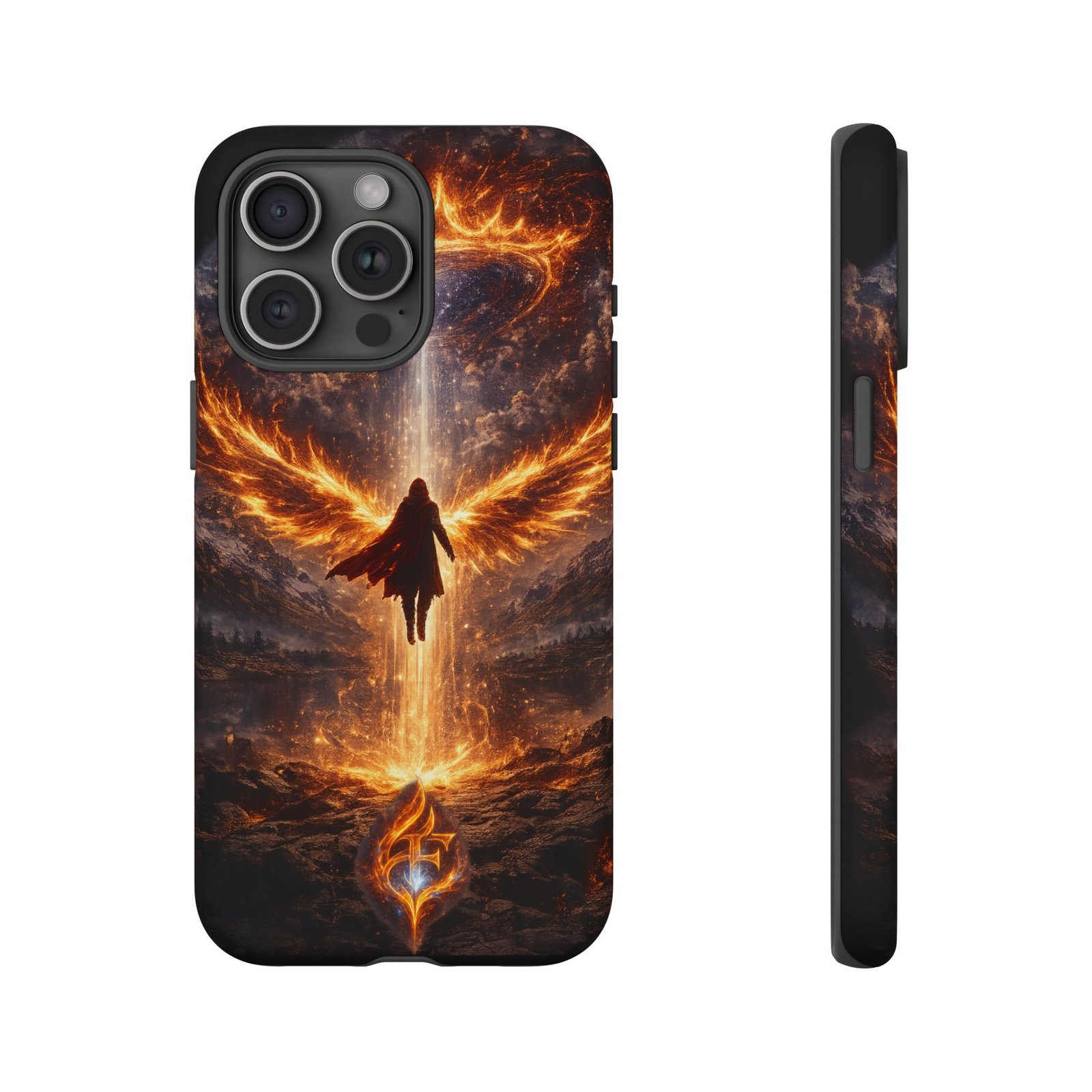 Slide your phone into armor that feels alive. This tough phone case pairs a dual-layer polycarbonate shell with a shock-absorbing TPU liner and a high-density 3D wrap print of a rising, fiery angel — wings unfurling into a halo of flame over a scorched landscape. It reads like a talisman in your hand: resilient, weather-resistant, and made to keep your device intact through daily drops and scrapes while keeping that dramatic artwork vivid. The slim profile preserves wireless charging and clear port access, and finishes are available in glossy or matte to match your look. Follow care notes to keep the colors sharp and the surface pristine.