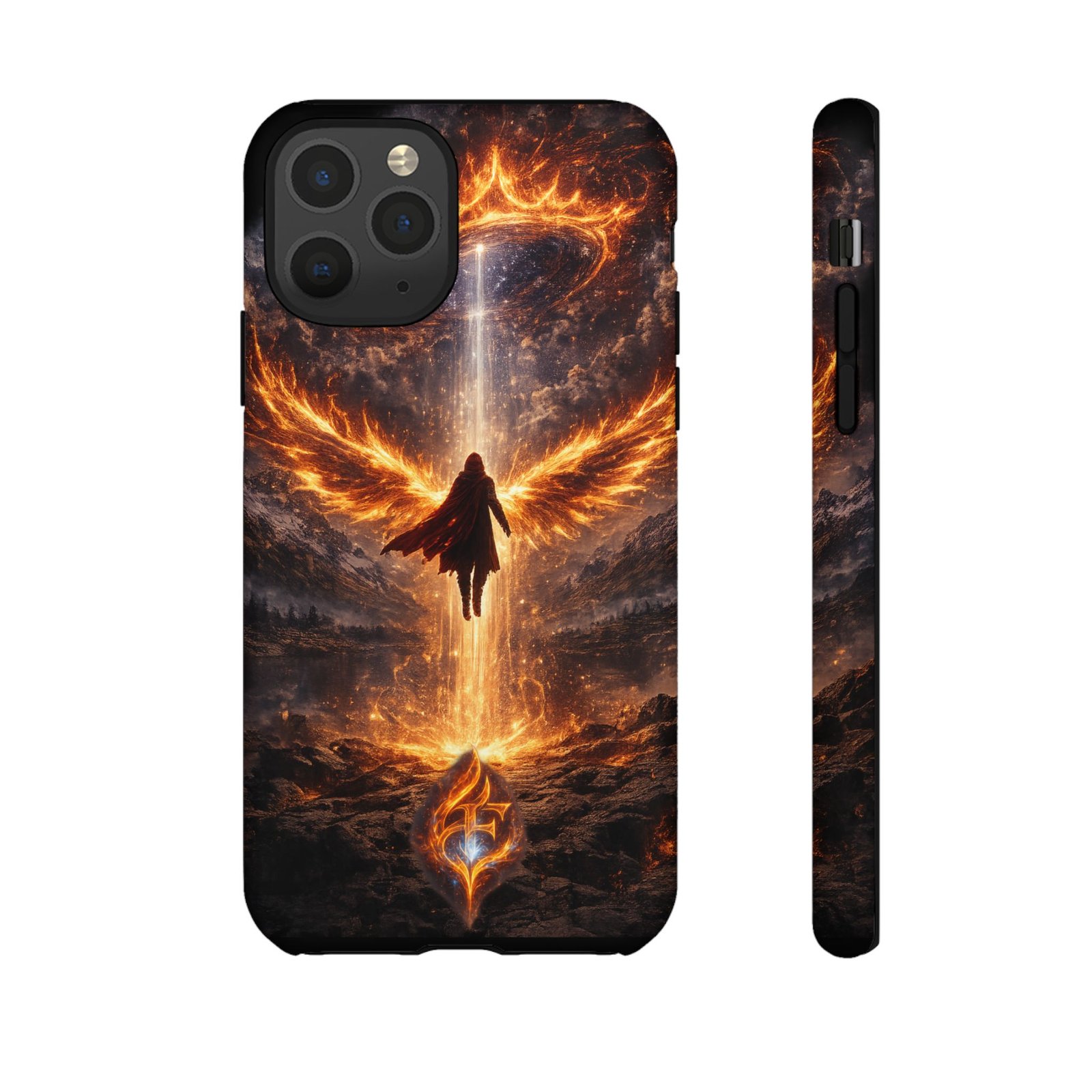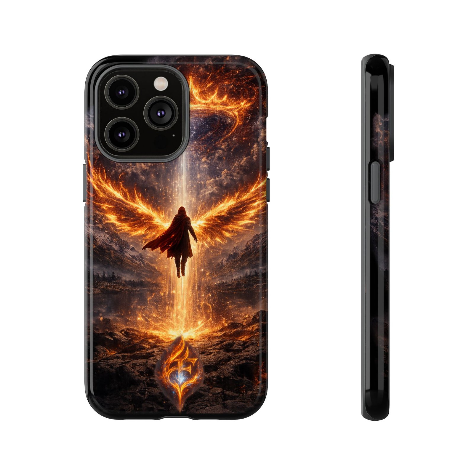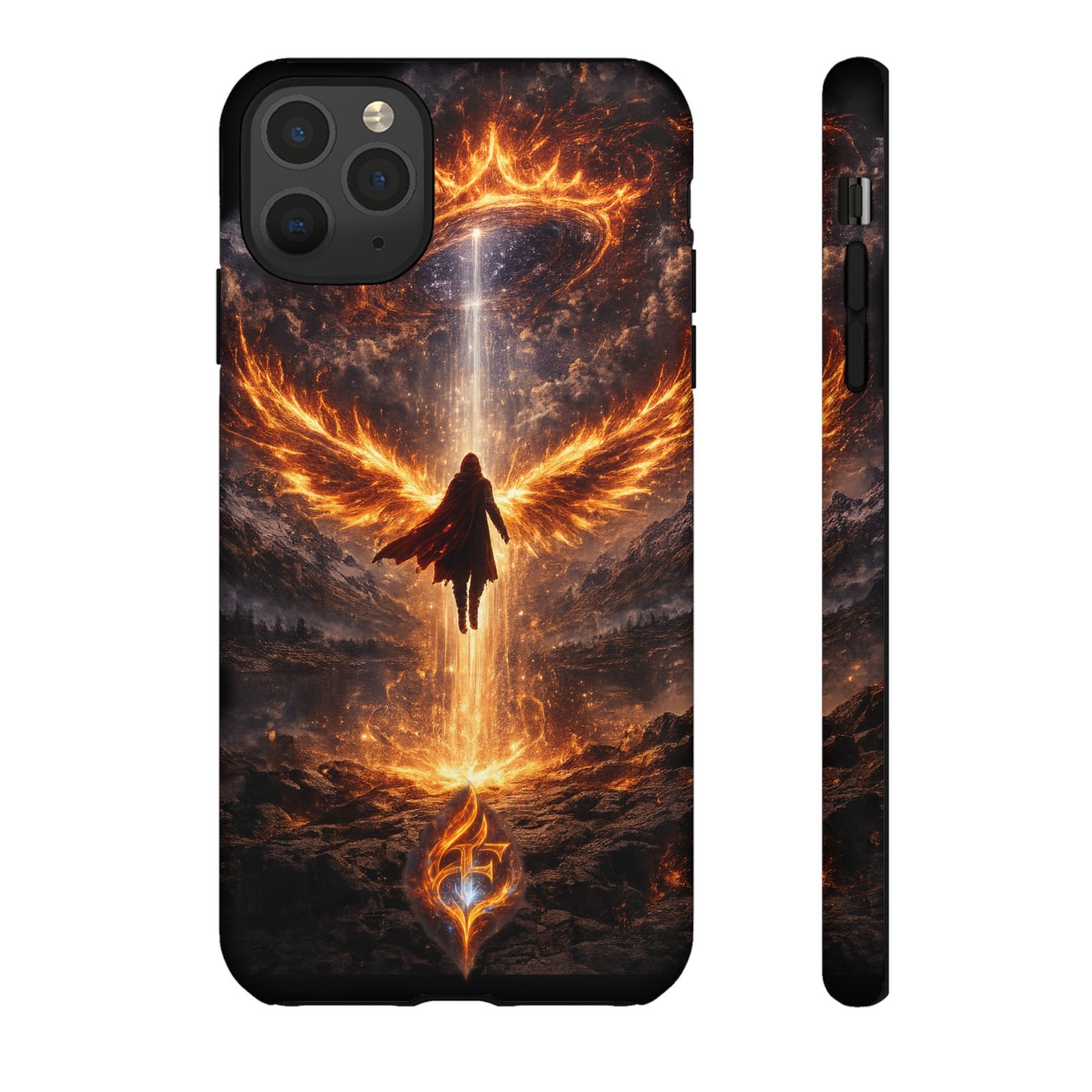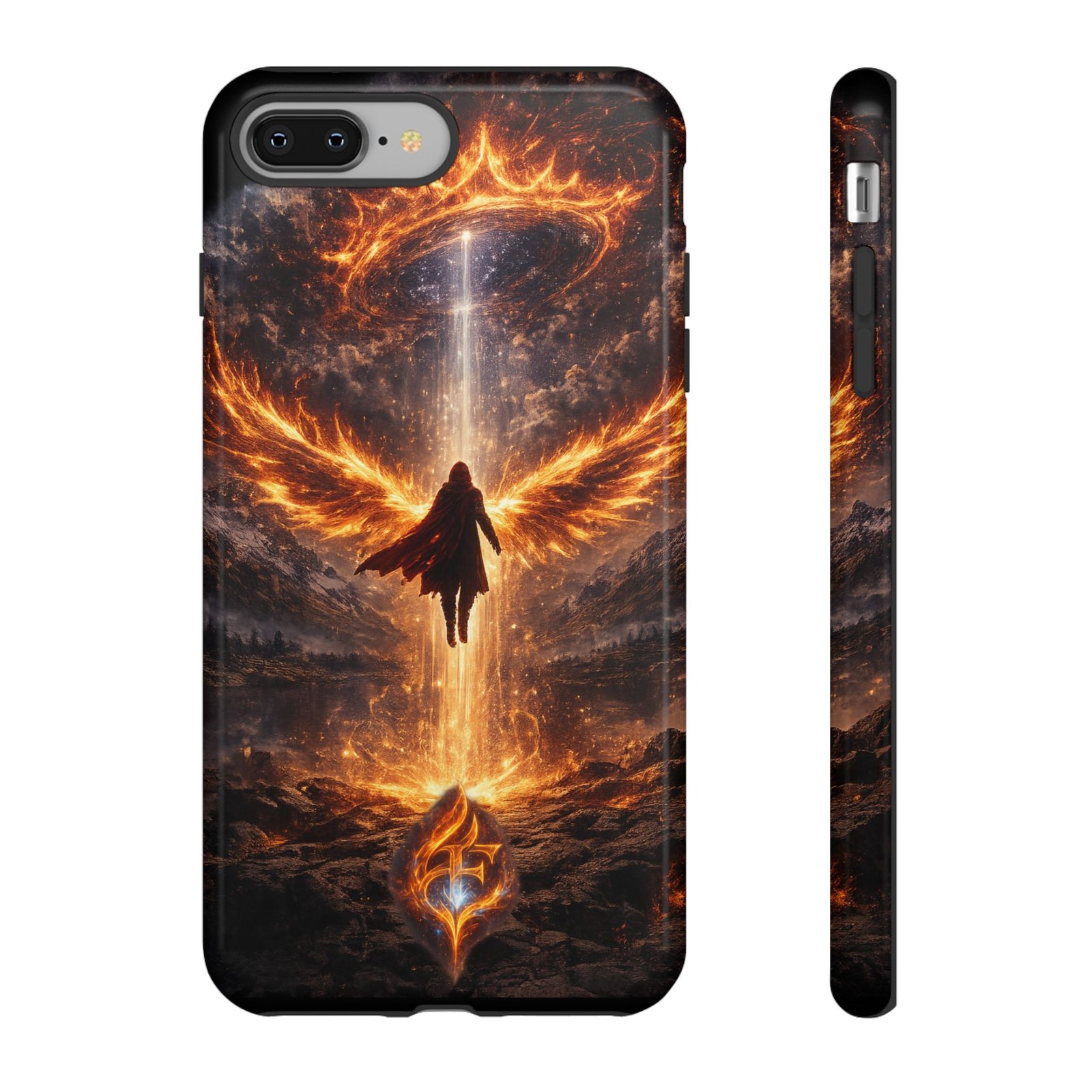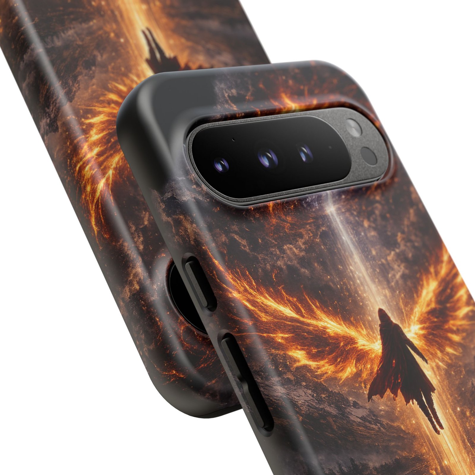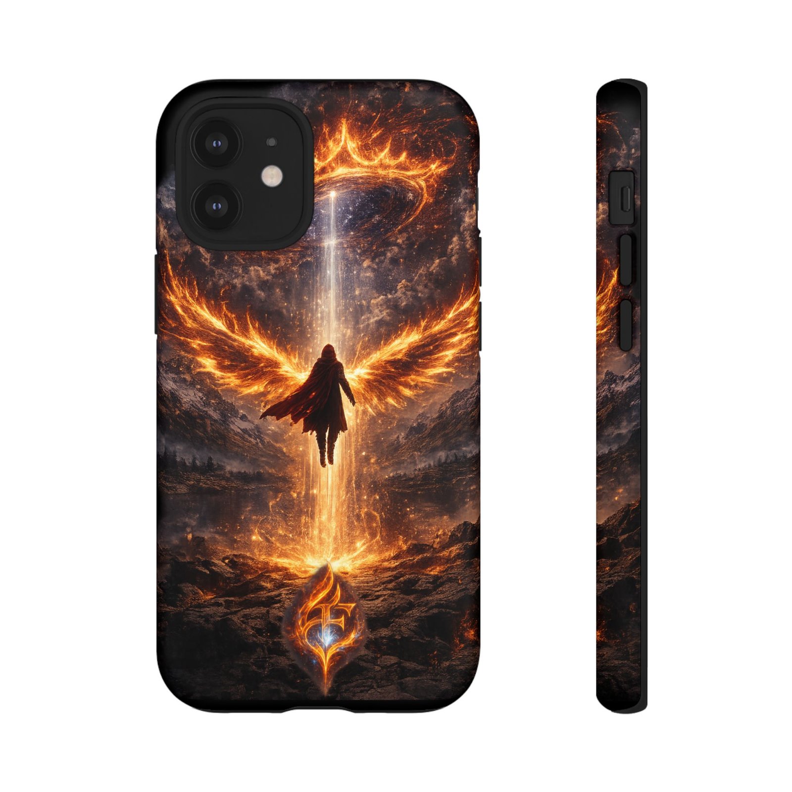 Slide your phone into armor that feels alive. This tough phone case pairs a dual-layer polycarbonate shell with a shock-absorbing TPU liner and a high-density 3D wrap print of a rising, fiery angel — wings unfurling into a halo of flame over a scorched landscape. It reads like a talisman in your hand: resilient, weather-resistant, and made to keep your device intact through daily drops and scrapes while keeping that dramatic artwork vivid. The slim profile preserves wireless charging and clear port access, and finishes are available in glossy or matte to match your look. Follow care notes to keep the colors sharp and the surface pristine.