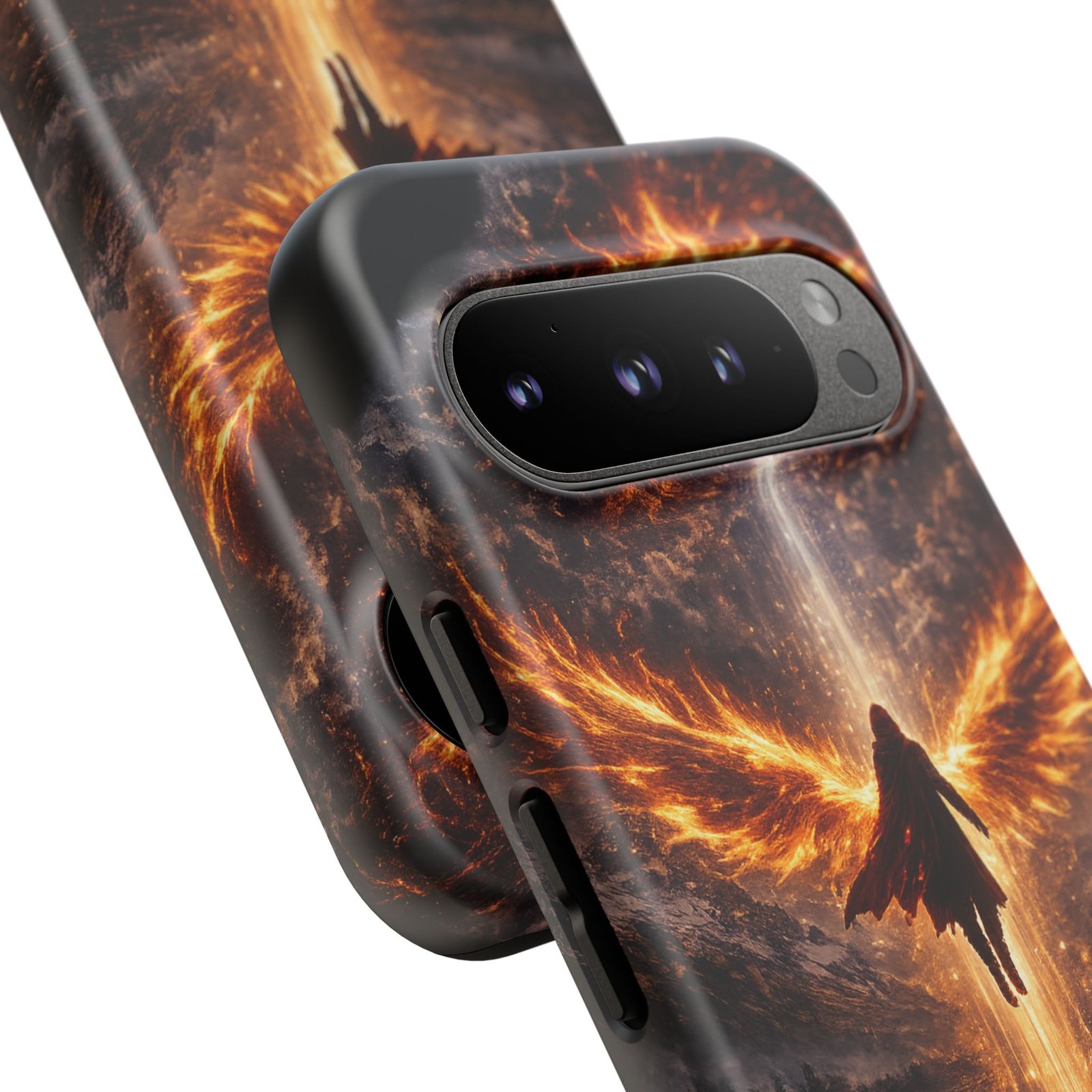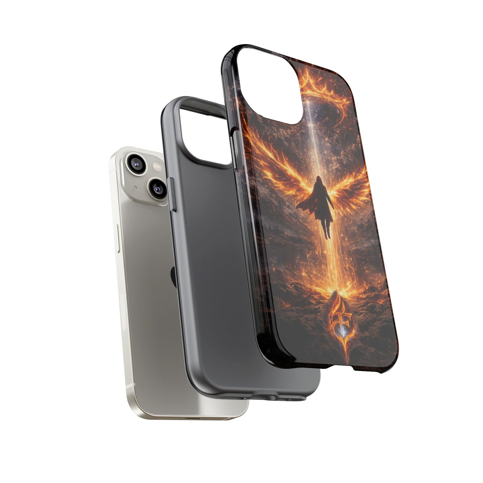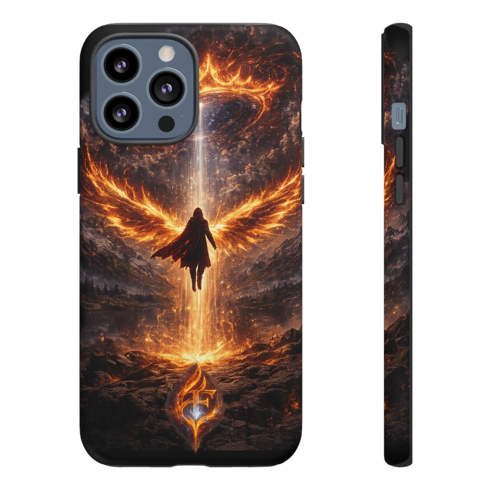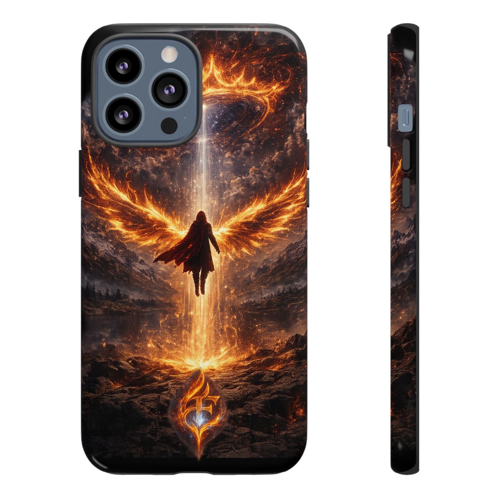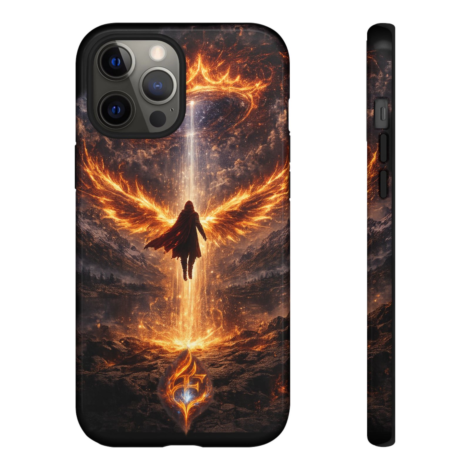 Slide your phone into armor that feels alive. This tough phone case pairs a dual-layer polycarbonate shell with a shock-absorbing TPU liner and a high-density 3D wrap print of a rising, fiery angel — wings unfurling into a halo of flame over a scorched landscape. It reads like a talisman in your hand: resilient, weather-resistant, and made to keep your device intact through daily drops and scrapes while keeping that dramatic artwork vivid. The slim profile preserves wireless charging and clear port access, and finishes are available in glossy or matte to match your look. Follow care notes to keep the colors sharp and the surface pristine.