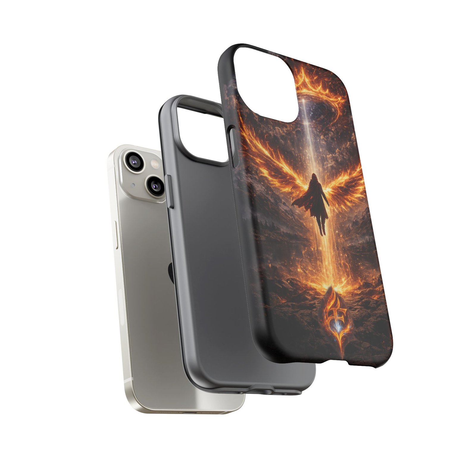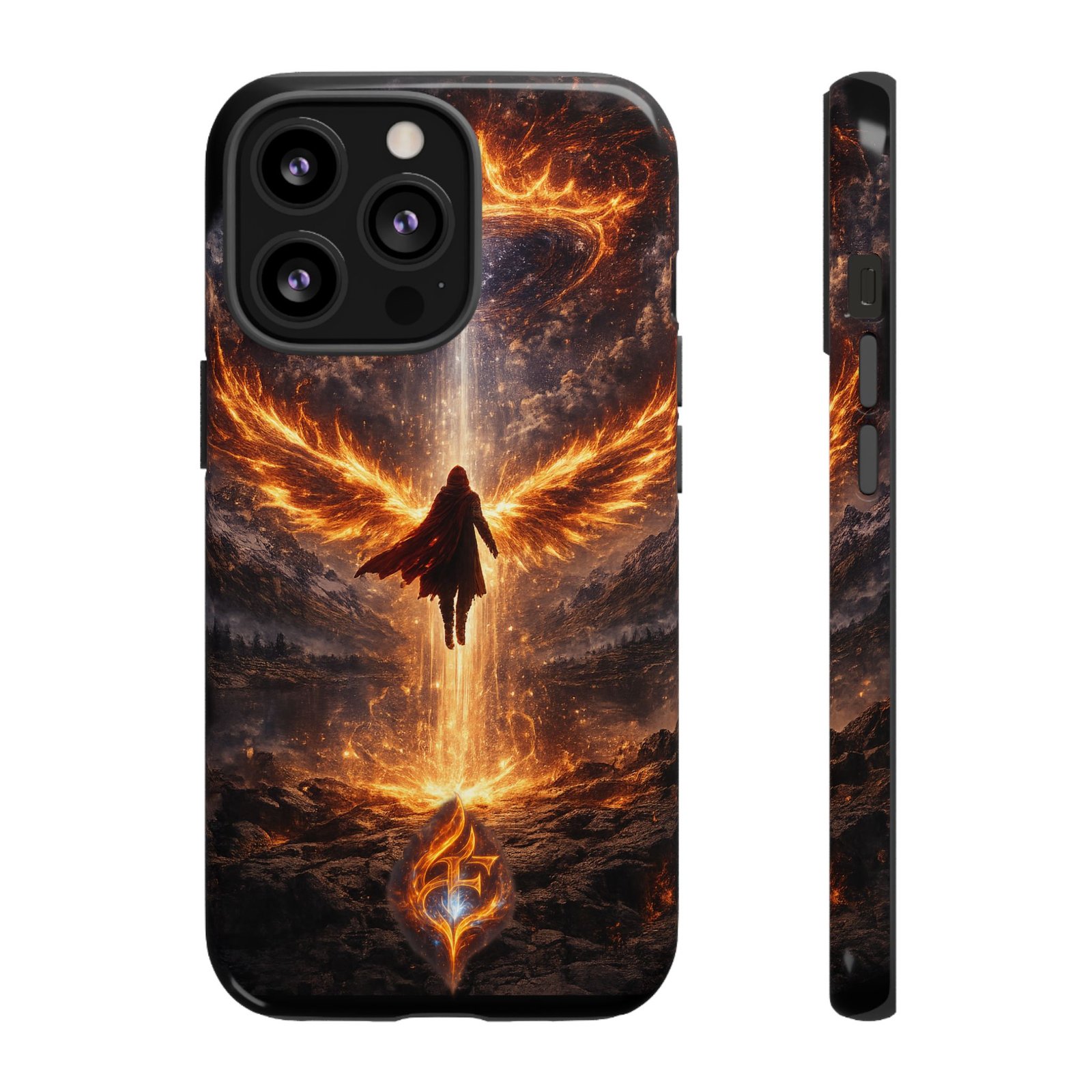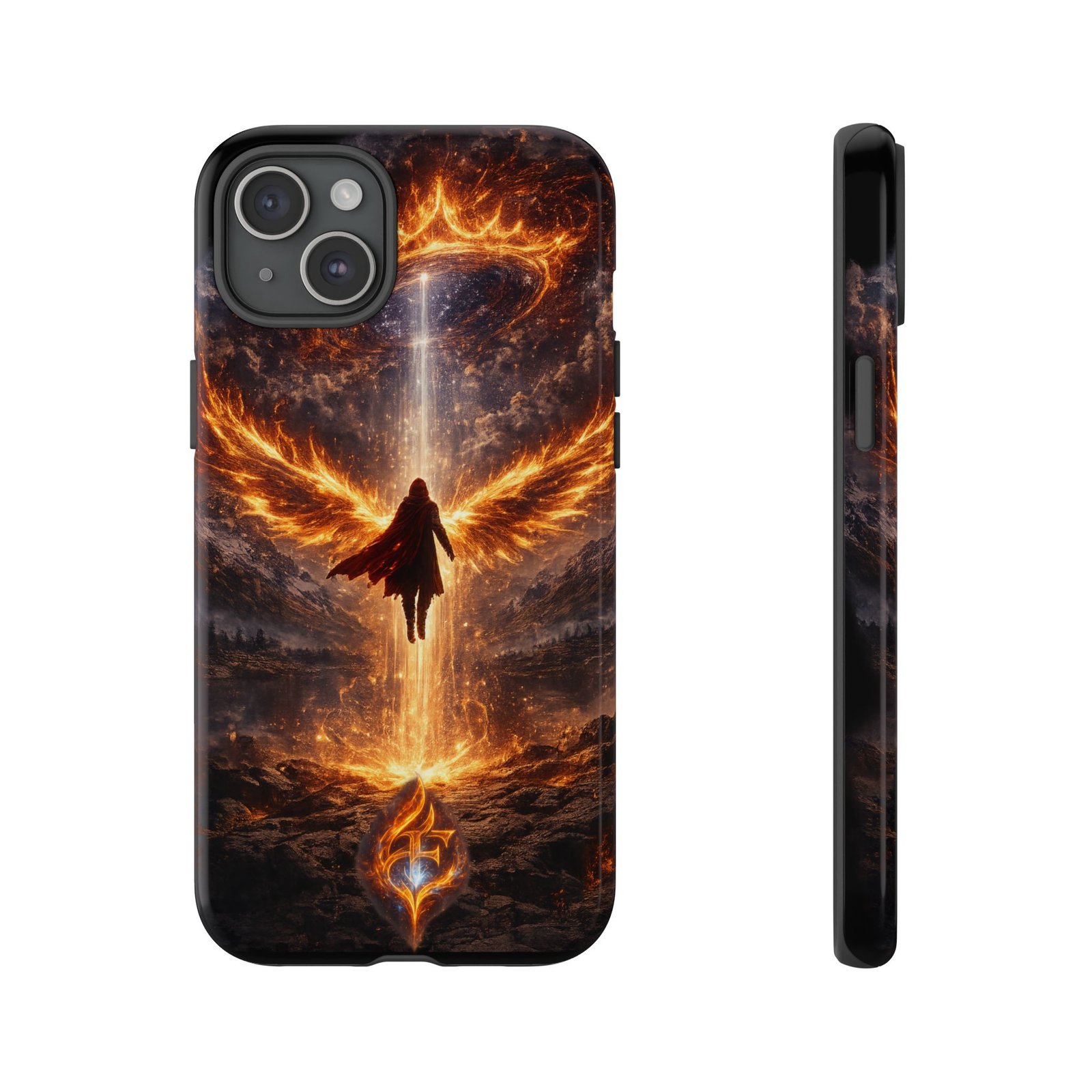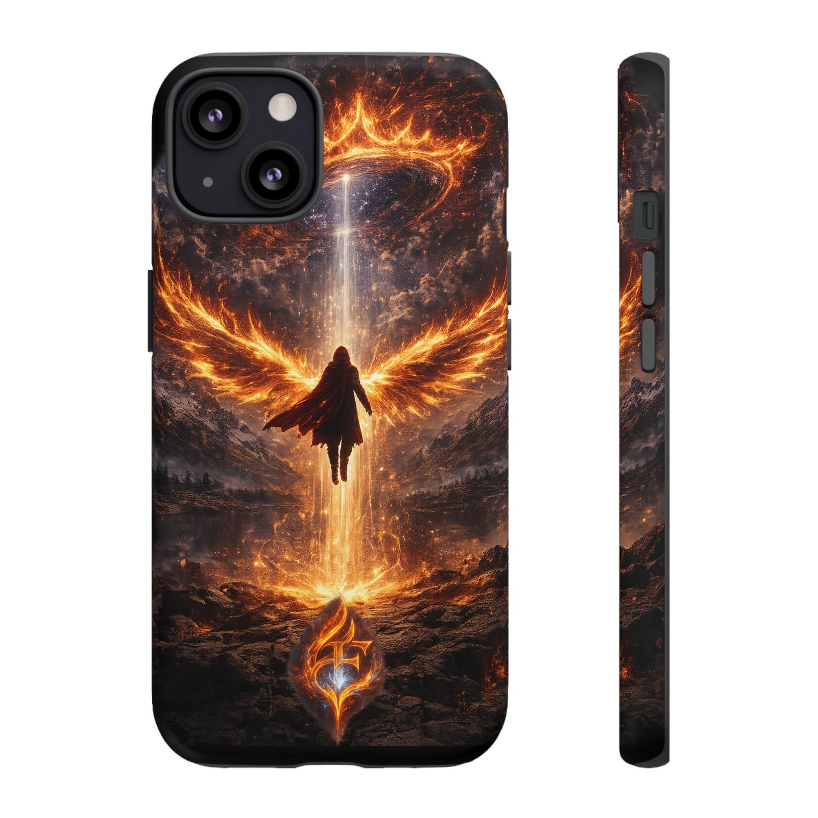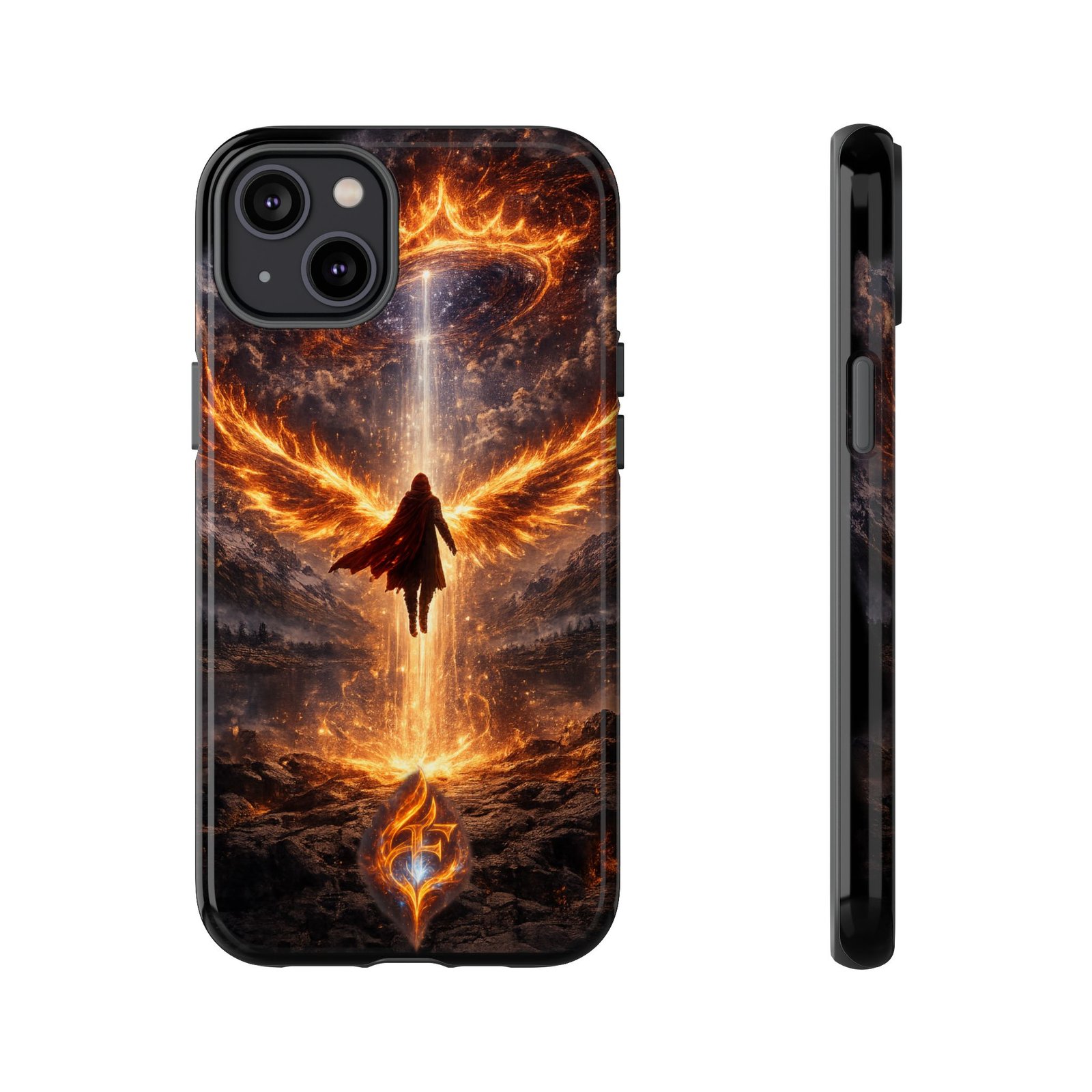 Slide your phone into armor that feels alive. This tough phone case pairs a dual-layer polycarbonate shell with a shock-absorbing TPU liner and a high-density 3D wrap print of a rising, fiery angel — wings unfurling into a halo of flame over a scorched landscape. It reads like a talisman in your hand: resilient, weather-resistant, and made to keep your device intact through daily drops and scrapes while keeping that dramatic artwork vivid. The slim profile preserves wireless charging and clear port access, and finishes are available in glossy or matte to match your look. Follow care notes to keep the colors sharp and the surface pristine.