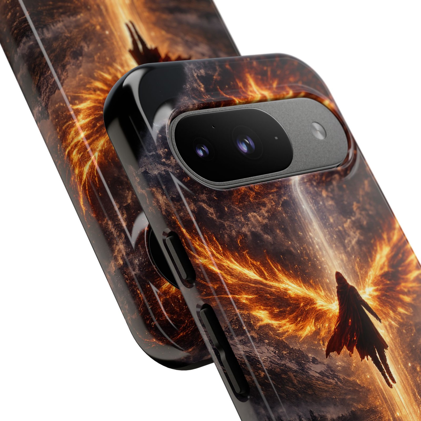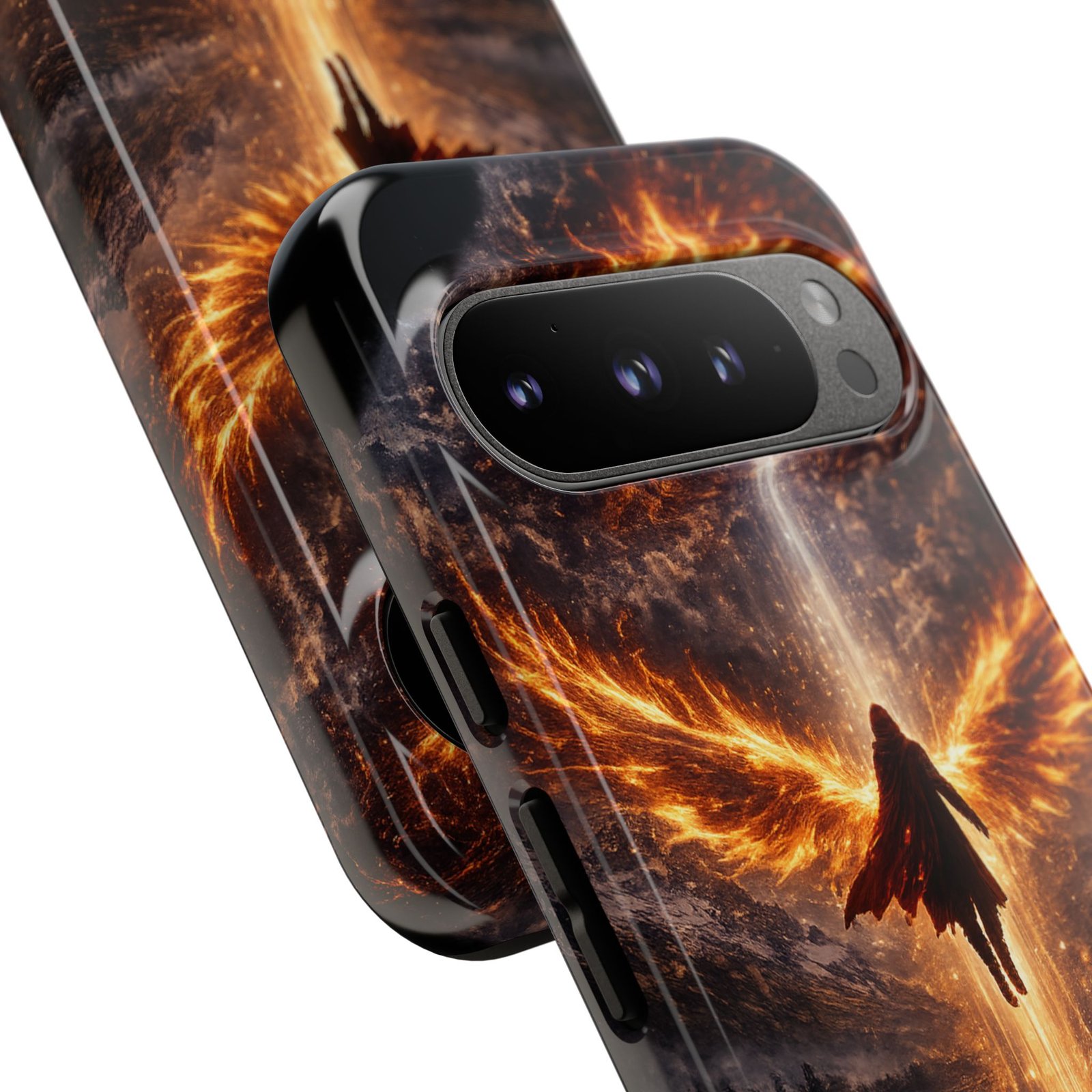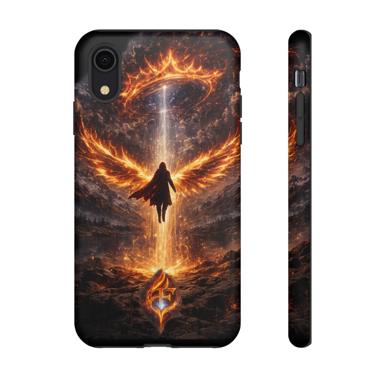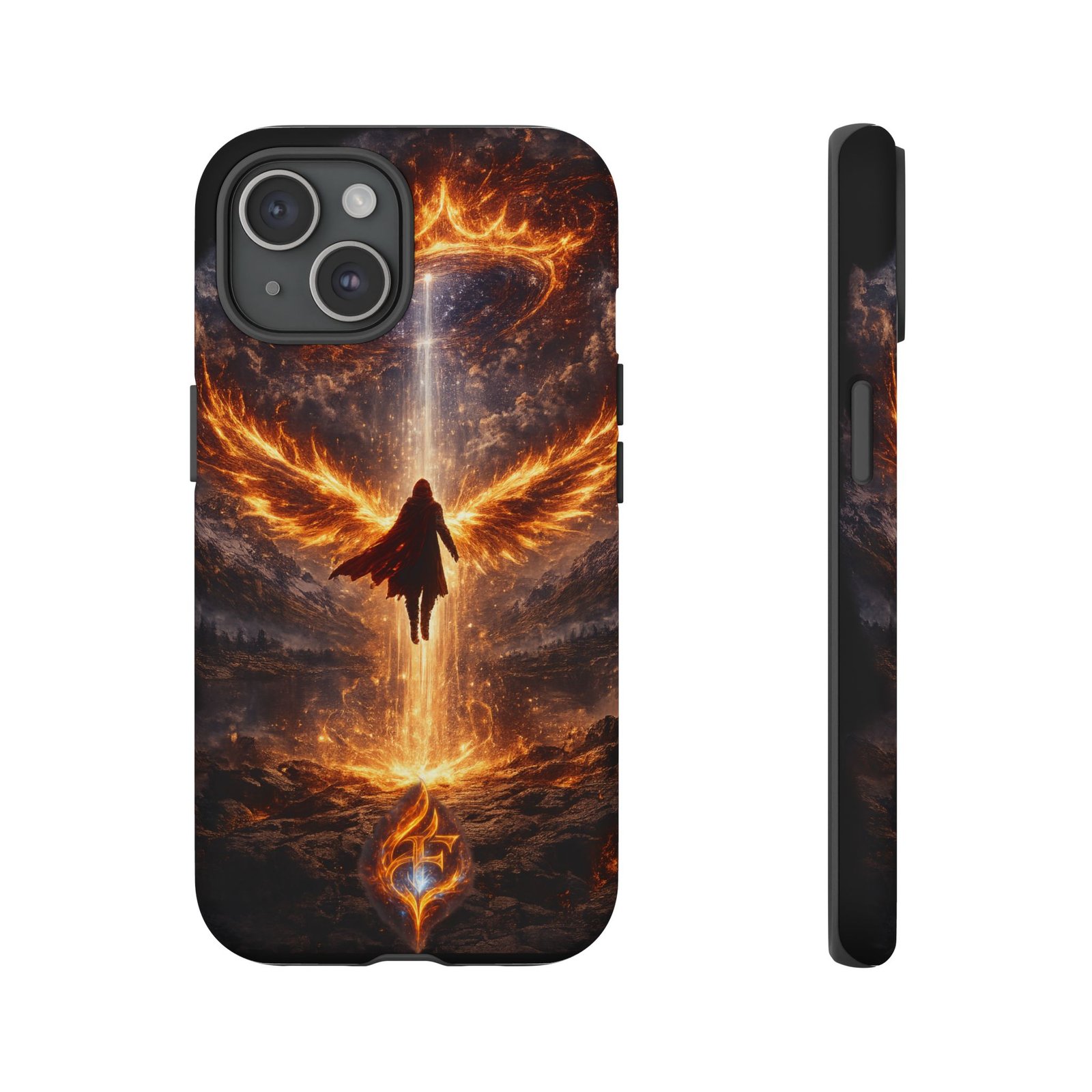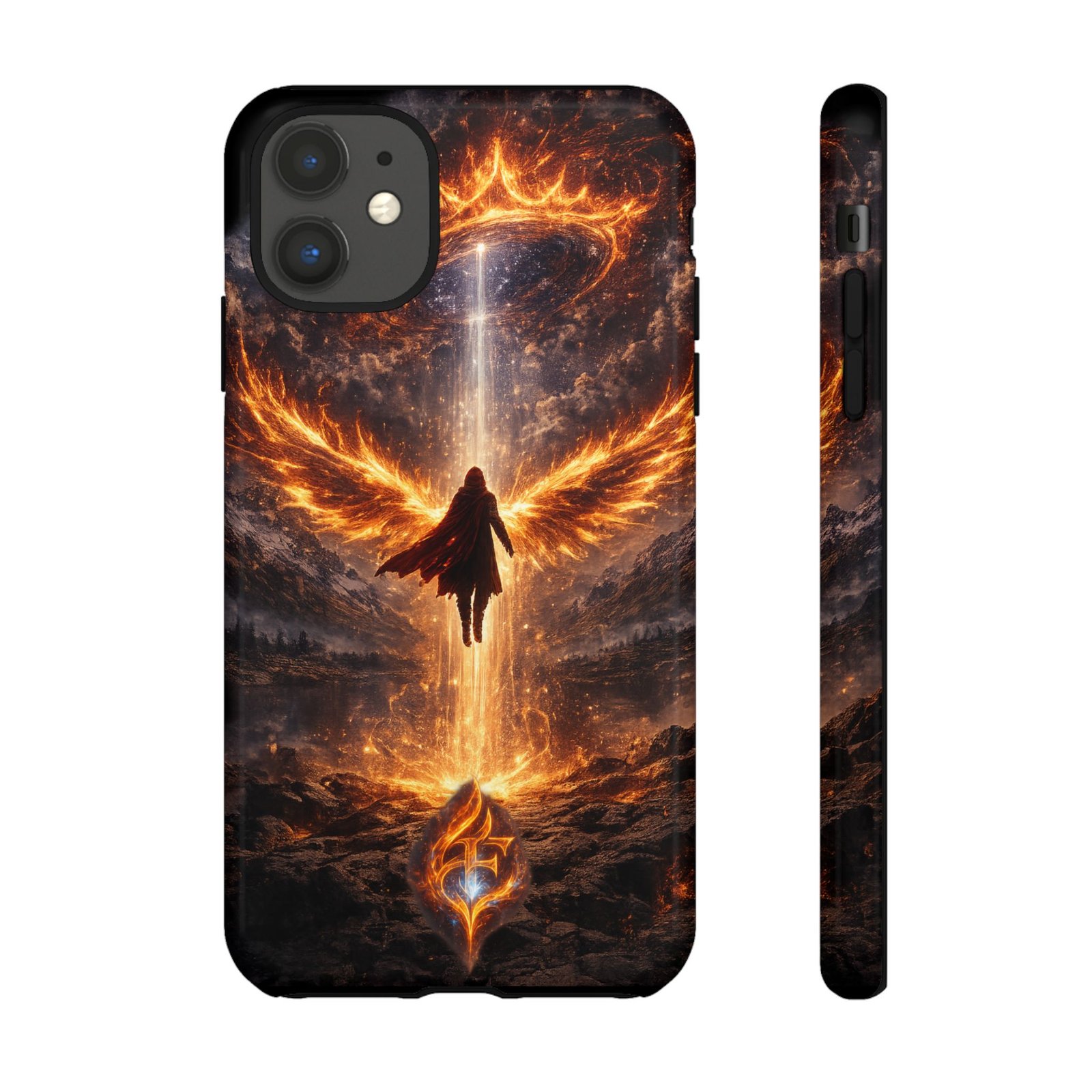 Slide your phone into armor that feels alive. This tough phone case pairs a dual-layer polycarbonate shell with a shock-absorbing TPU liner and a high-density 3D wrap print of a rising, fiery angel — wings unfurling into a halo of flame over a scorched landscape. It reads like a talisman in your hand: resilient, weather-resistant, and made to keep your device intact through daily drops and scrapes while keeping that dramatic artwork vivid. The slim profile preserves wireless charging and clear port access, and finishes are available in glossy or matte to match your look. Follow care notes to keep the colors sharp and the surface pristine.