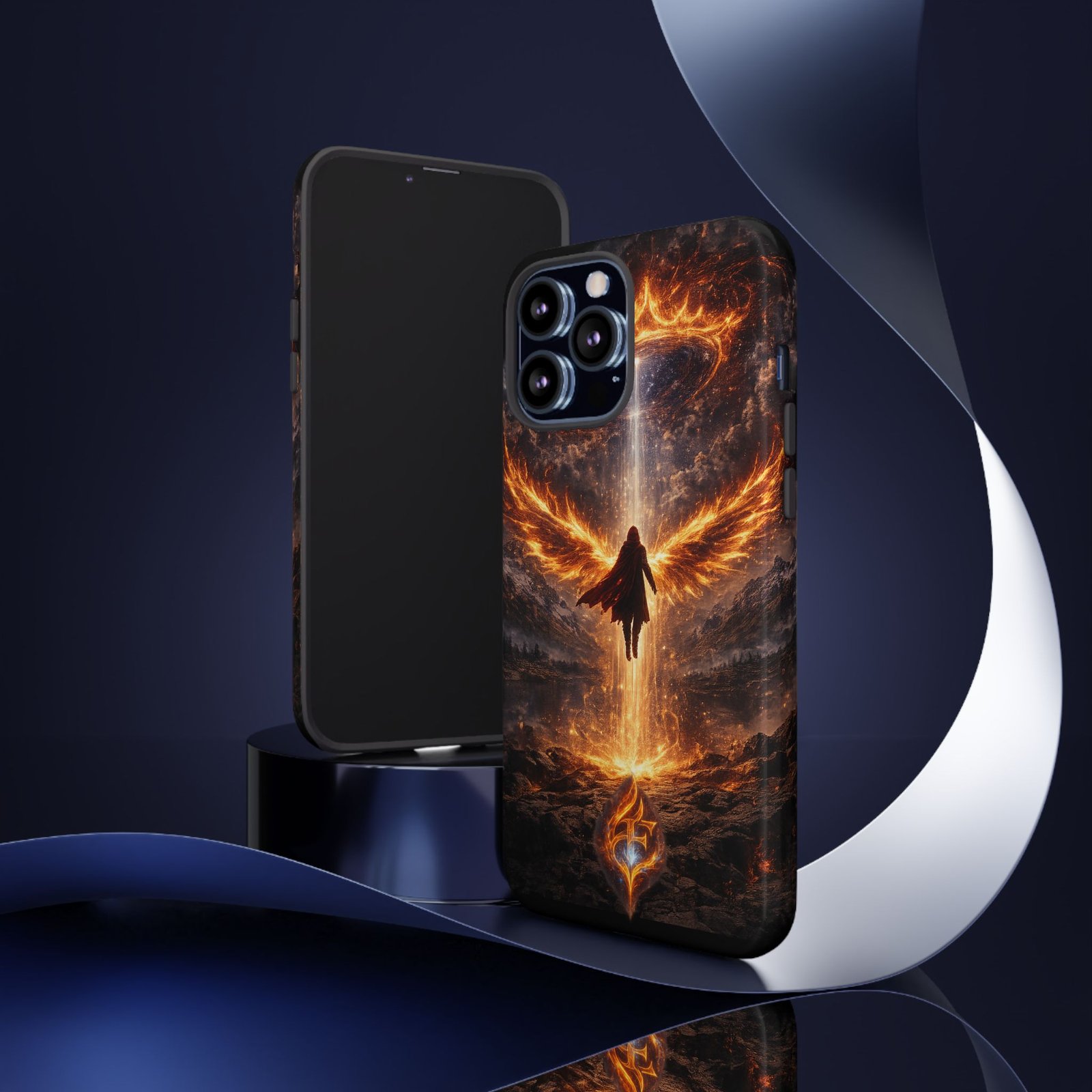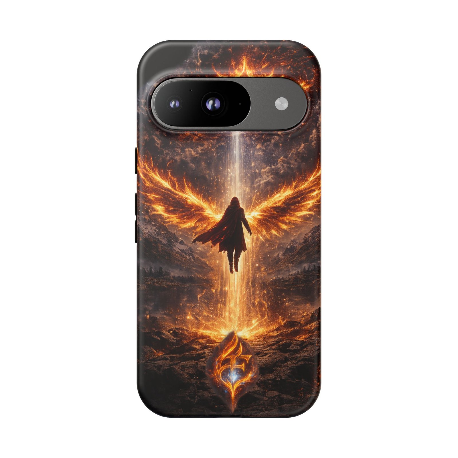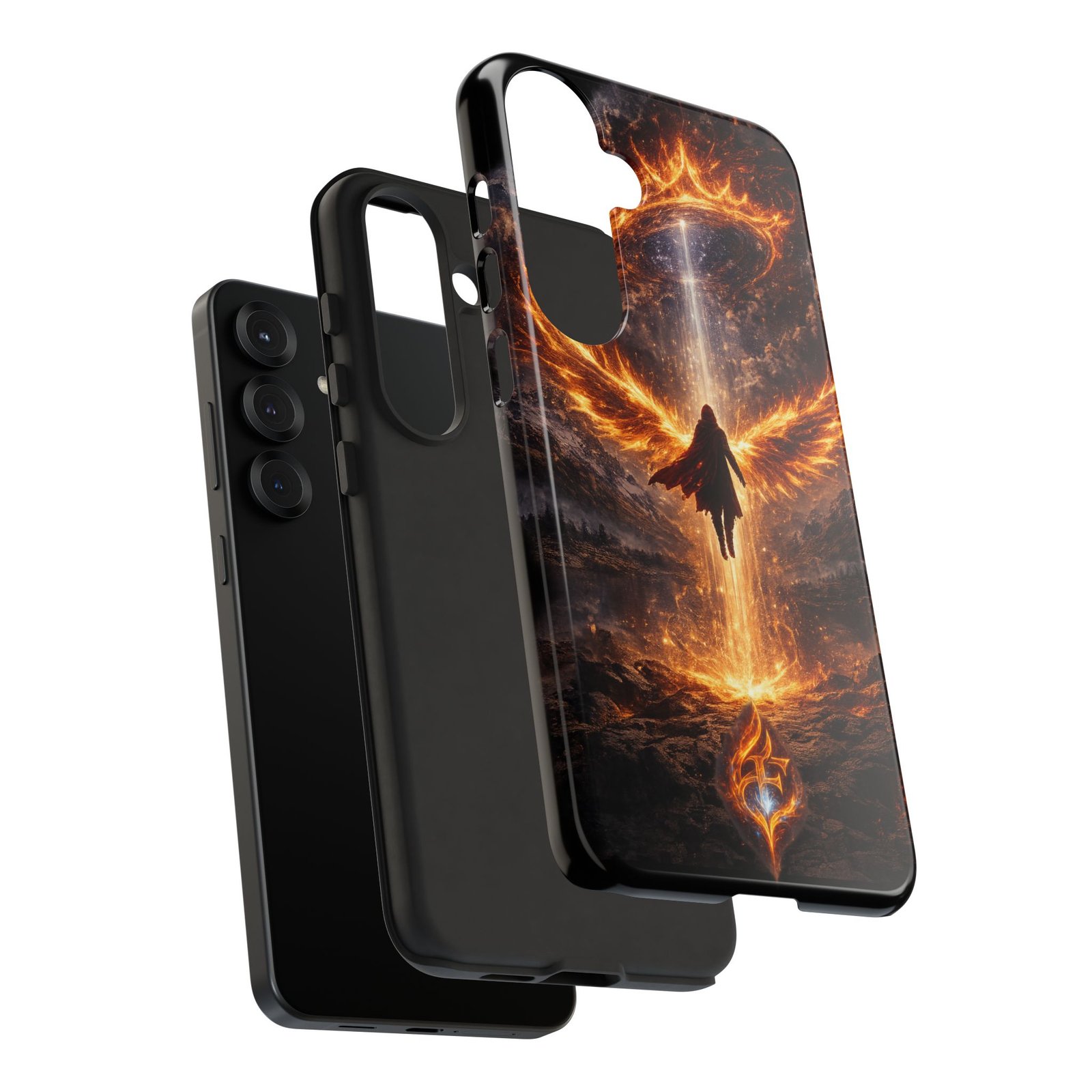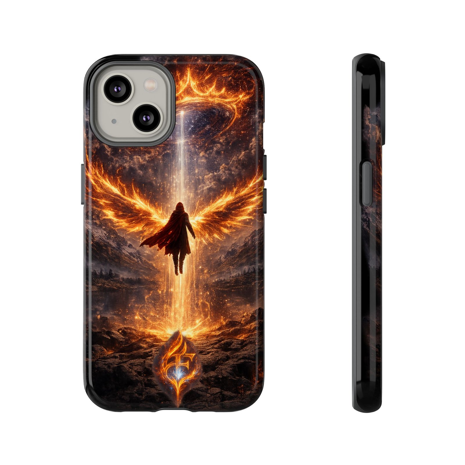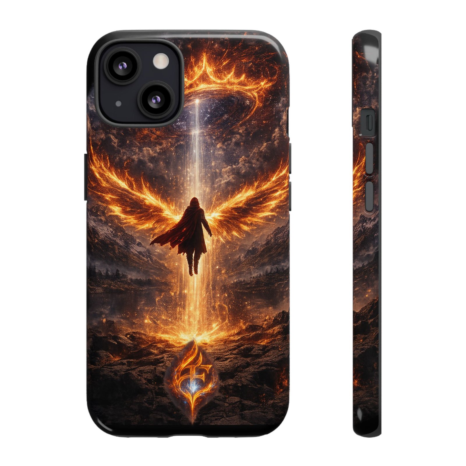 Slide your phone into armor that feels alive. This tough phone case pairs a dual-layer polycarbonate shell with a shock-absorbing TPU liner and a high-density 3D wrap print of a rising, fiery angel — wings unfurling into a halo of flame over a scorched landscape. It reads like a talisman in your hand: resilient, weather-resistant, and made to keep your device intact through daily drops and scrapes while keeping that dramatic artwork vivid. The slim profile preserves wireless charging and clear port access, and finishes are available in glossy or matte to match your look. Follow care notes to keep the colors sharp and the surface pristine.