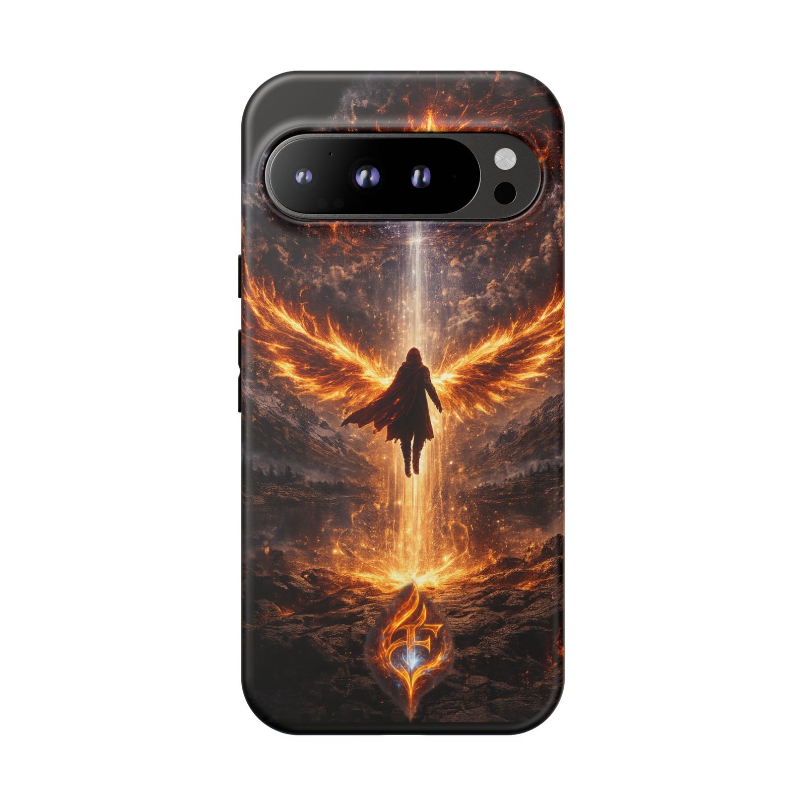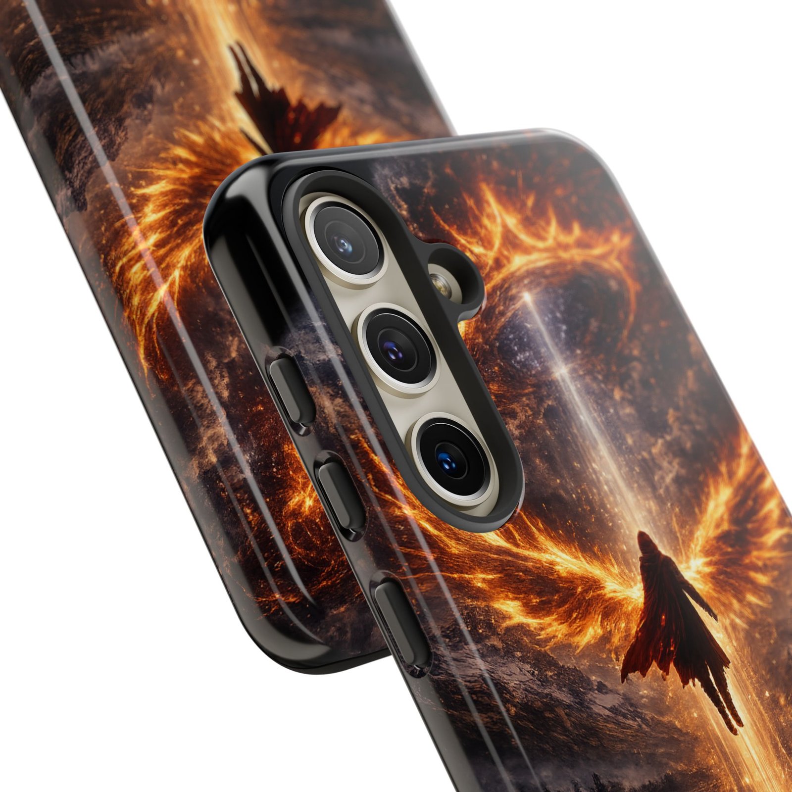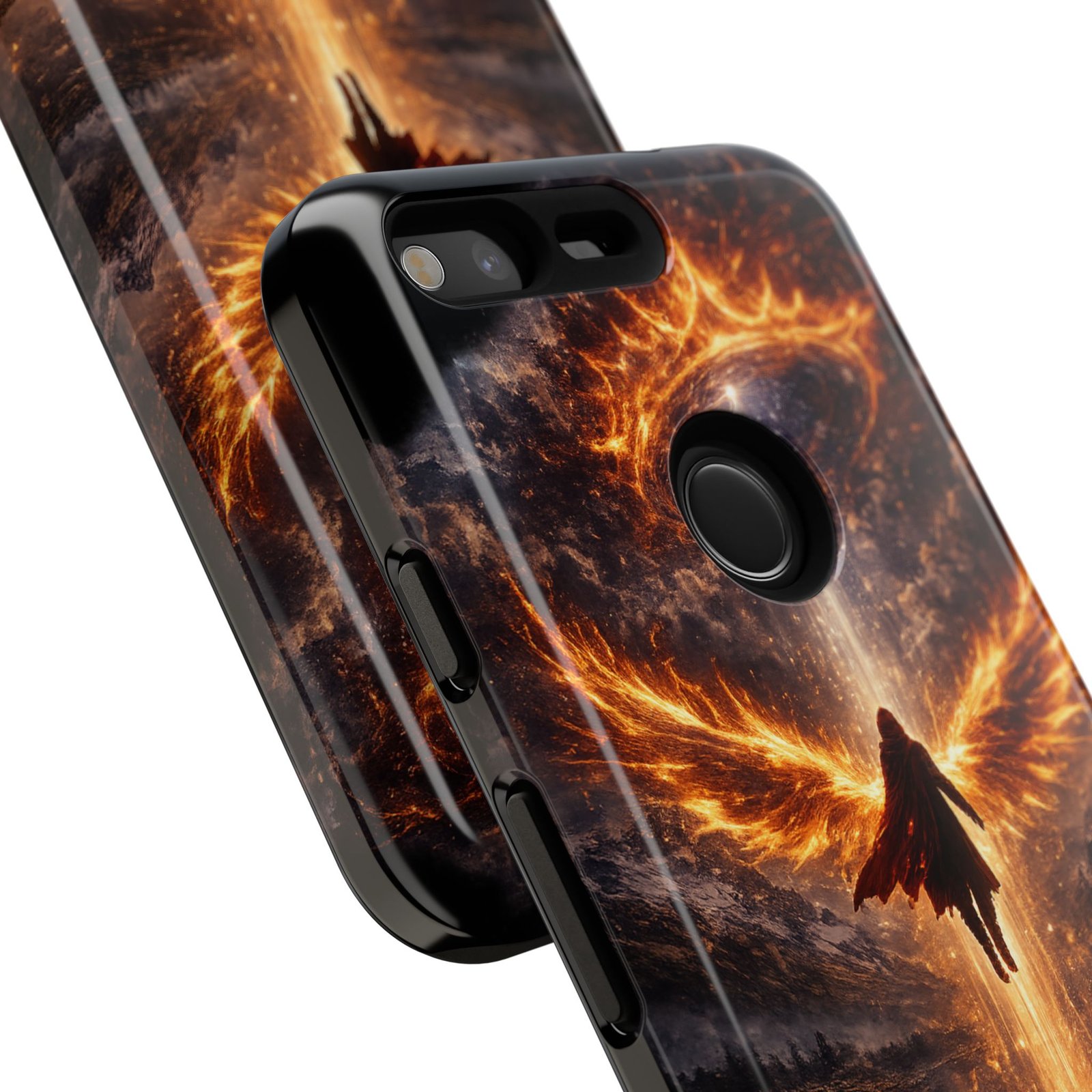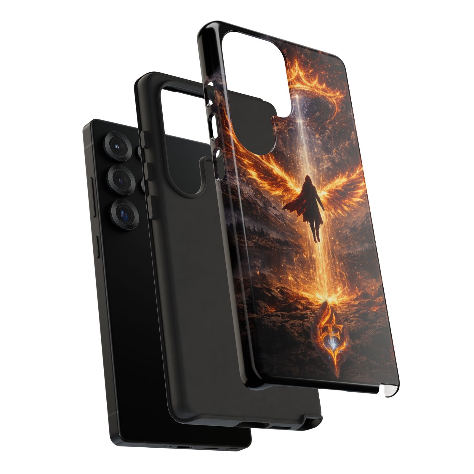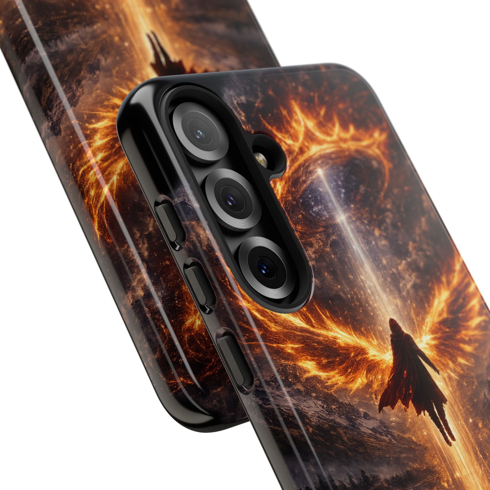 Slide your phone into armor that feels alive. This tough phone case pairs a dual-layer polycarbonate shell with a shock-absorbing TPU liner and a high-density 3D wrap print of a rising, fiery angel — wings unfurling into a halo of flame over a scorched landscape. It reads like a talisman in your hand: resilient, weather-resistant, and made to keep your device intact through daily drops and scrapes while keeping that dramatic artwork vivid. The slim profile preserves wireless charging and clear port access, and finishes are available in glossy or matte to match your look. Follow care notes to keep the colors sharp and the surface pristine.