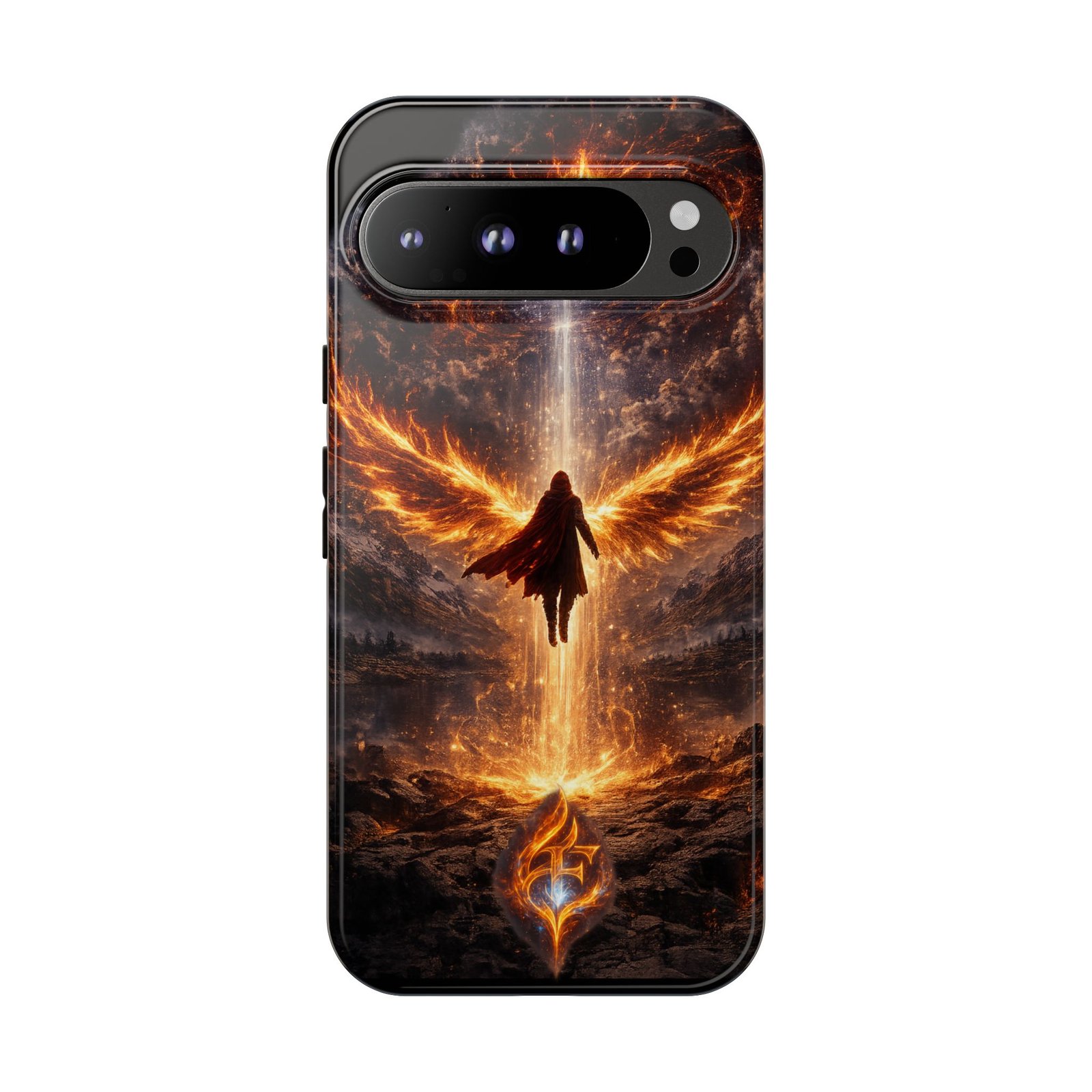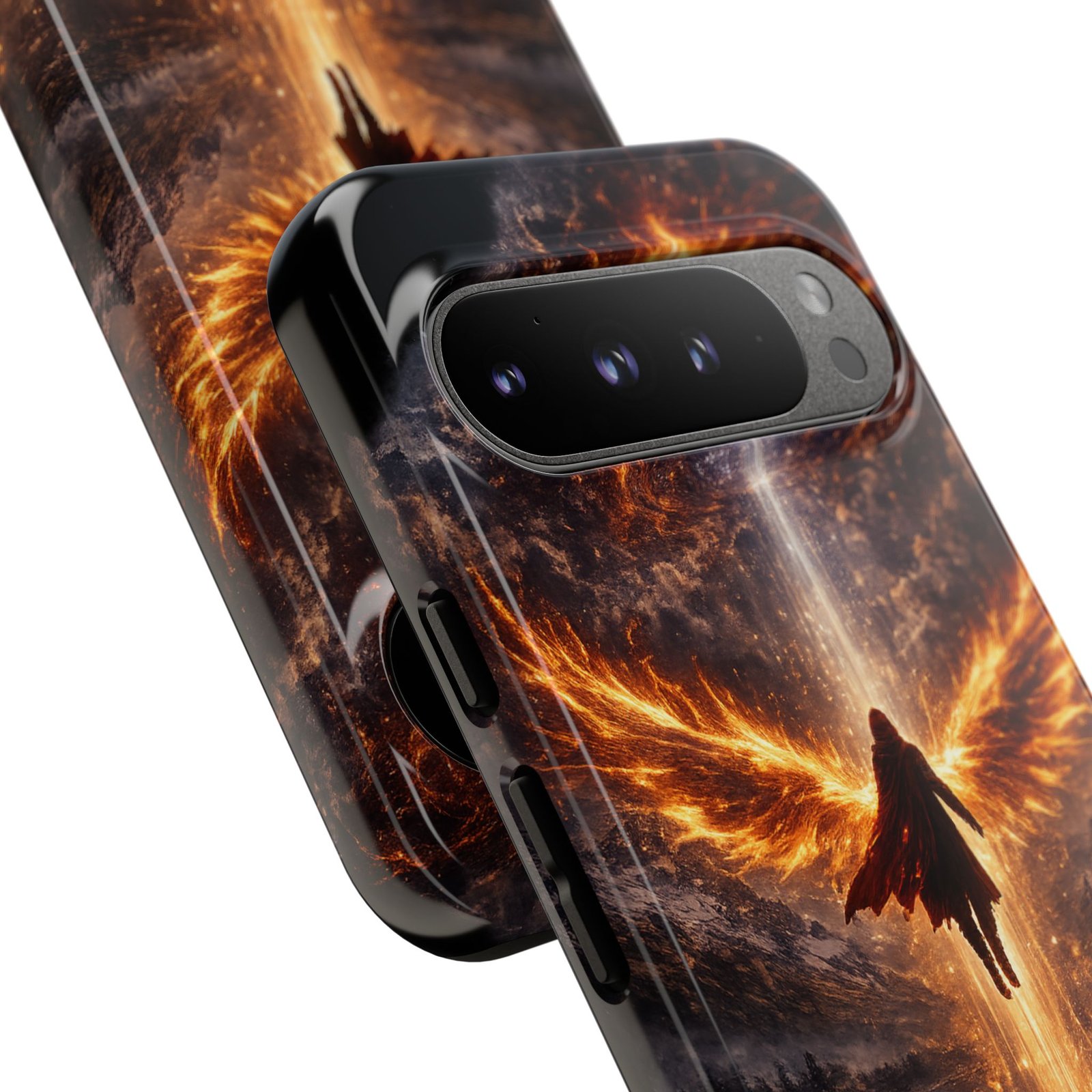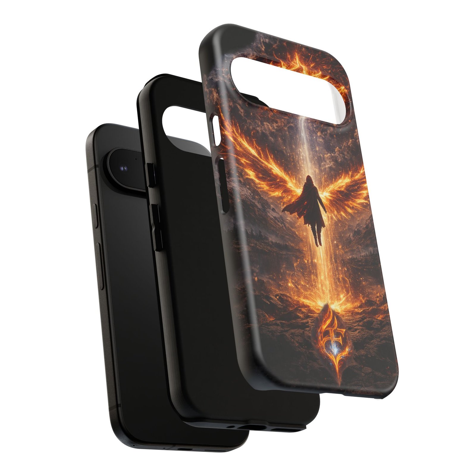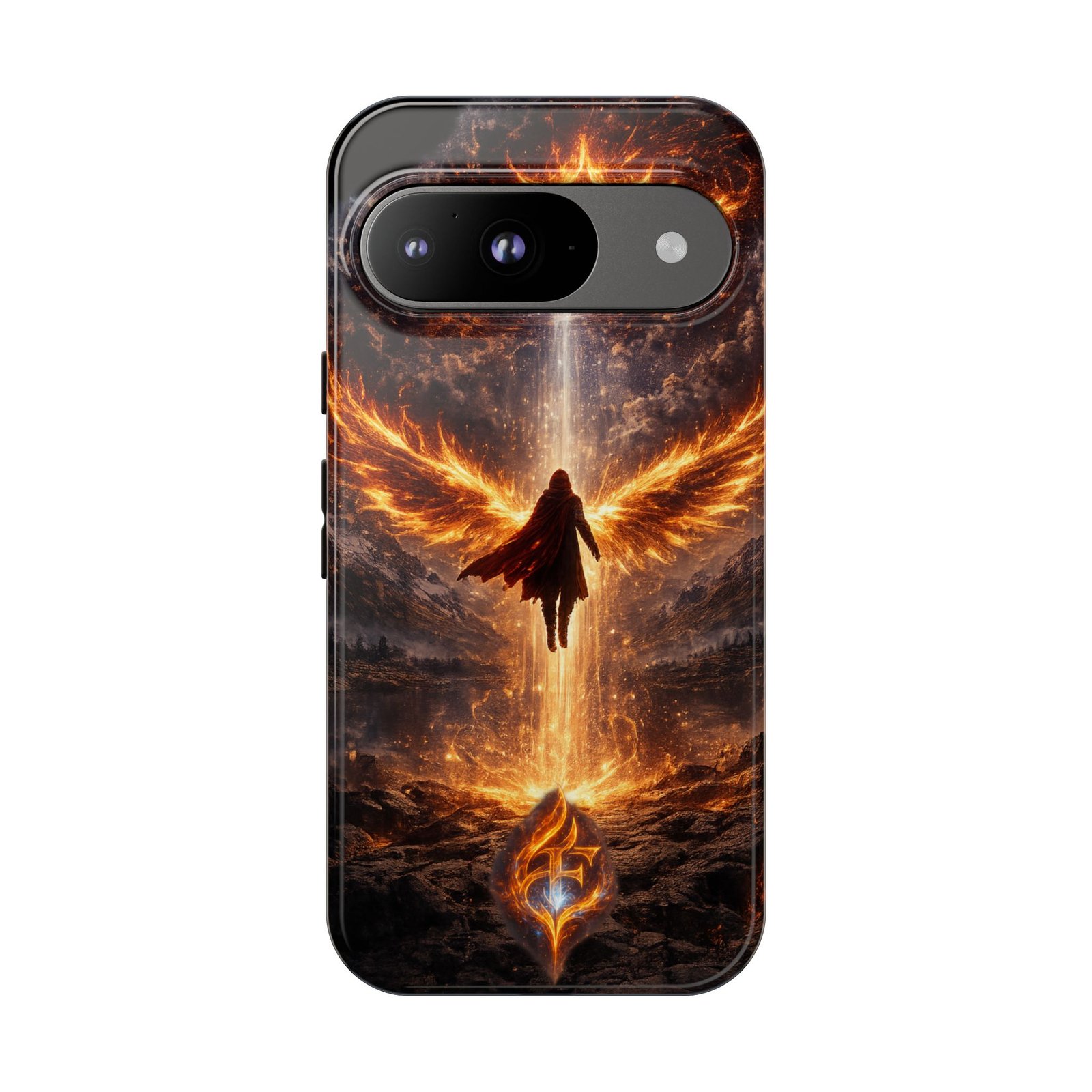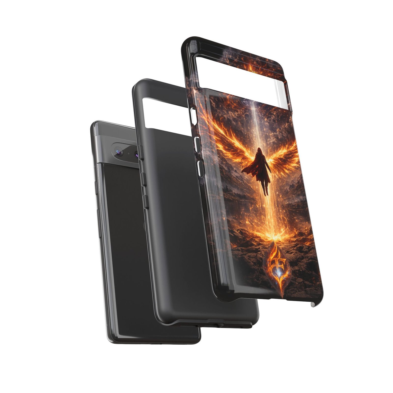 Slide your phone into armor that feels alive. This tough phone case pairs a dual-layer polycarbonate shell with a shock-absorbing TPU liner and a high-density 3D wrap print of a rising, fiery angel — wings unfurling into a halo of flame over a scorched landscape. It reads like a talisman in your hand: resilient, weather-resistant, and made to keep your device intact through daily drops and scrapes while keeping that dramatic artwork vivid. The slim profile preserves wireless charging and clear port access, and finishes are available in glossy or matte to match your look. Follow care notes to keep the colors sharp and the surface pristine.