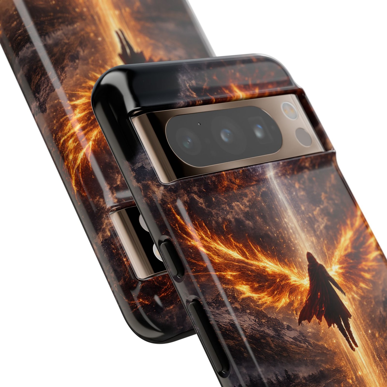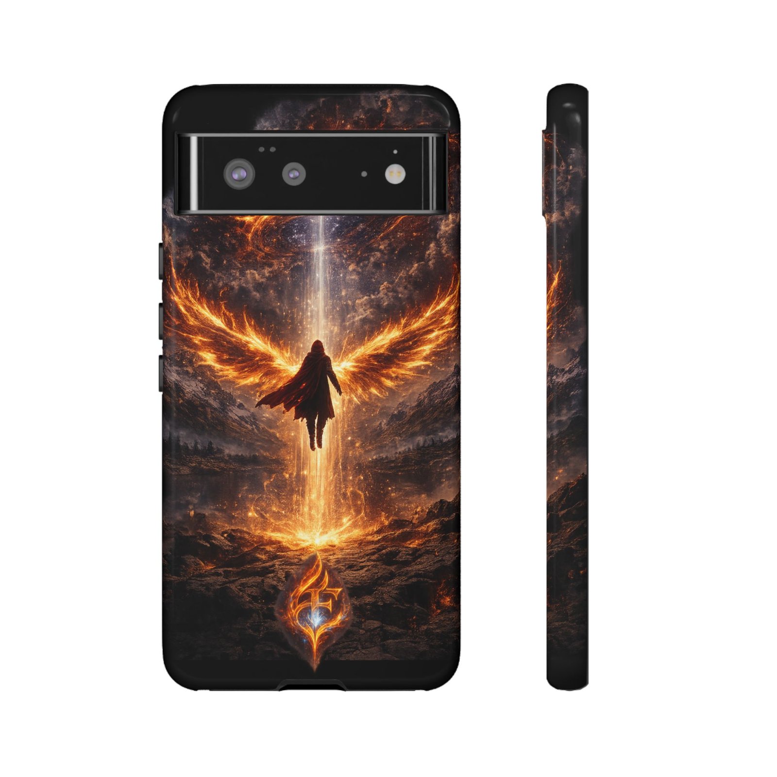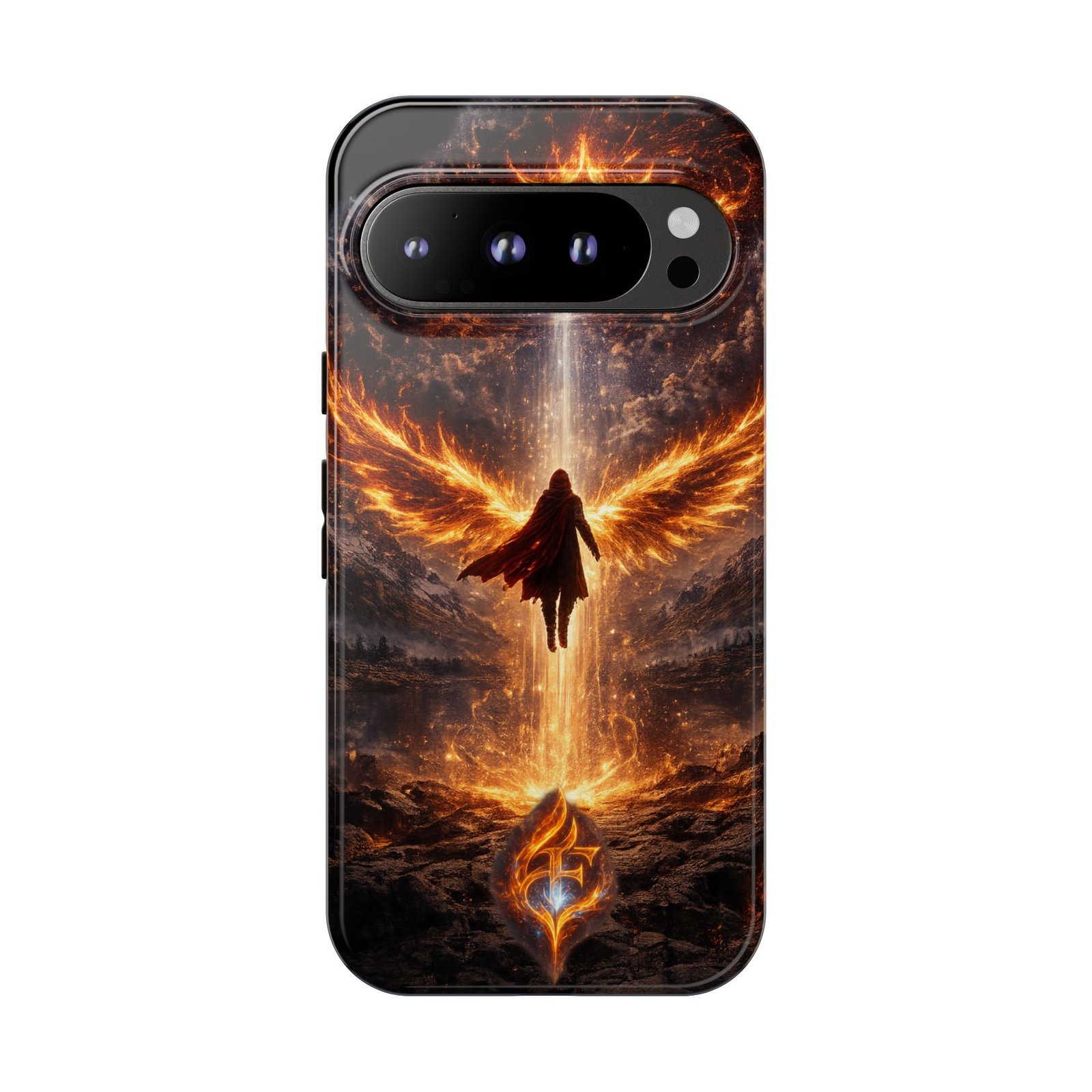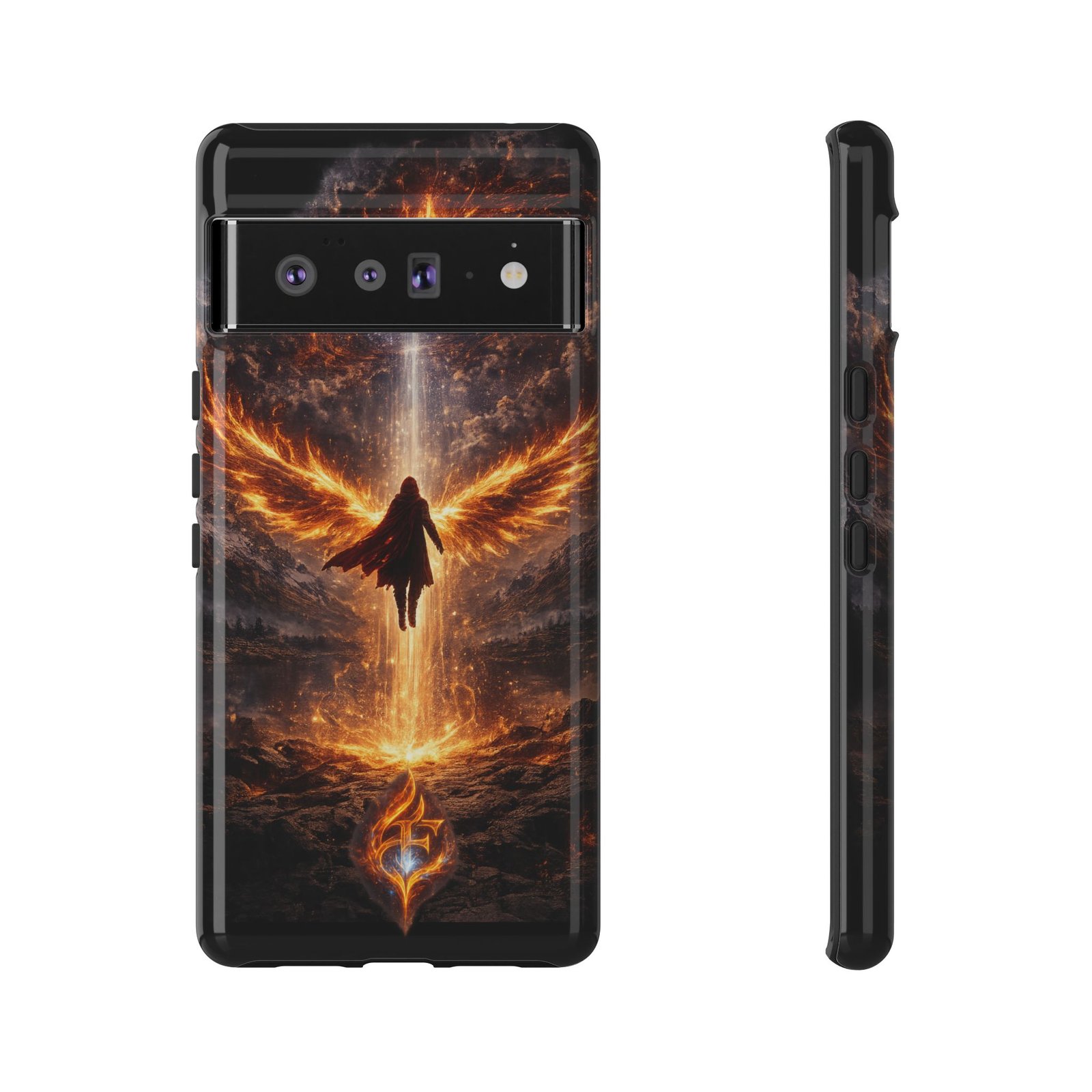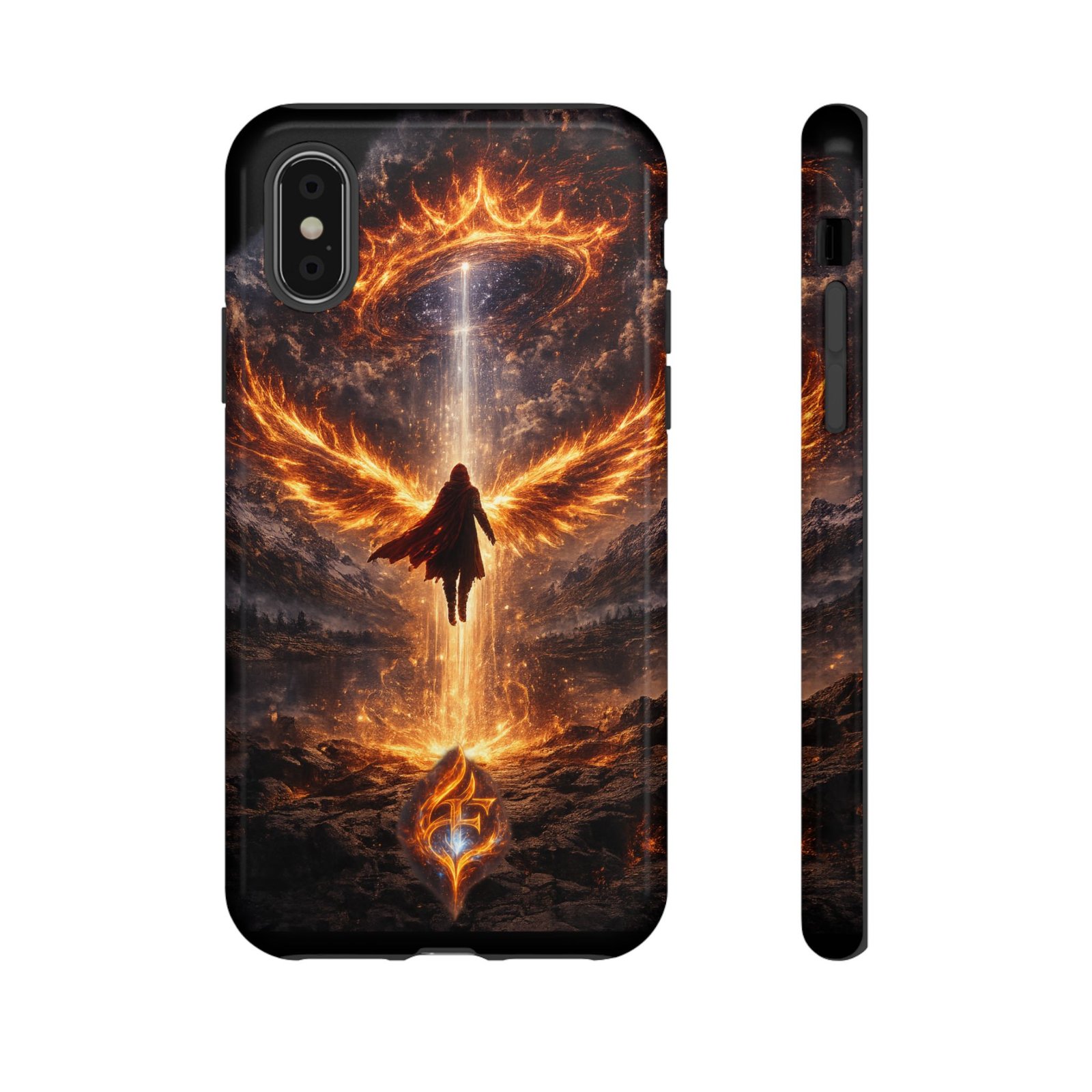 Slide your phone into armor that feels alive. This tough phone case pairs a dual-layer polycarbonate shell with a shock-absorbing TPU liner and a high-density 3D wrap print of a rising, fiery angel — wings unfurling into a halo of flame over a scorched landscape. It reads like a talisman in your hand: resilient, weather-resistant, and made to keep your device intact through daily drops and scrapes while keeping that dramatic artwork vivid. The slim profile preserves wireless charging and clear port access, and finishes are available in glossy or matte to match your look. Follow care notes to keep the colors sharp and the surface pristine.