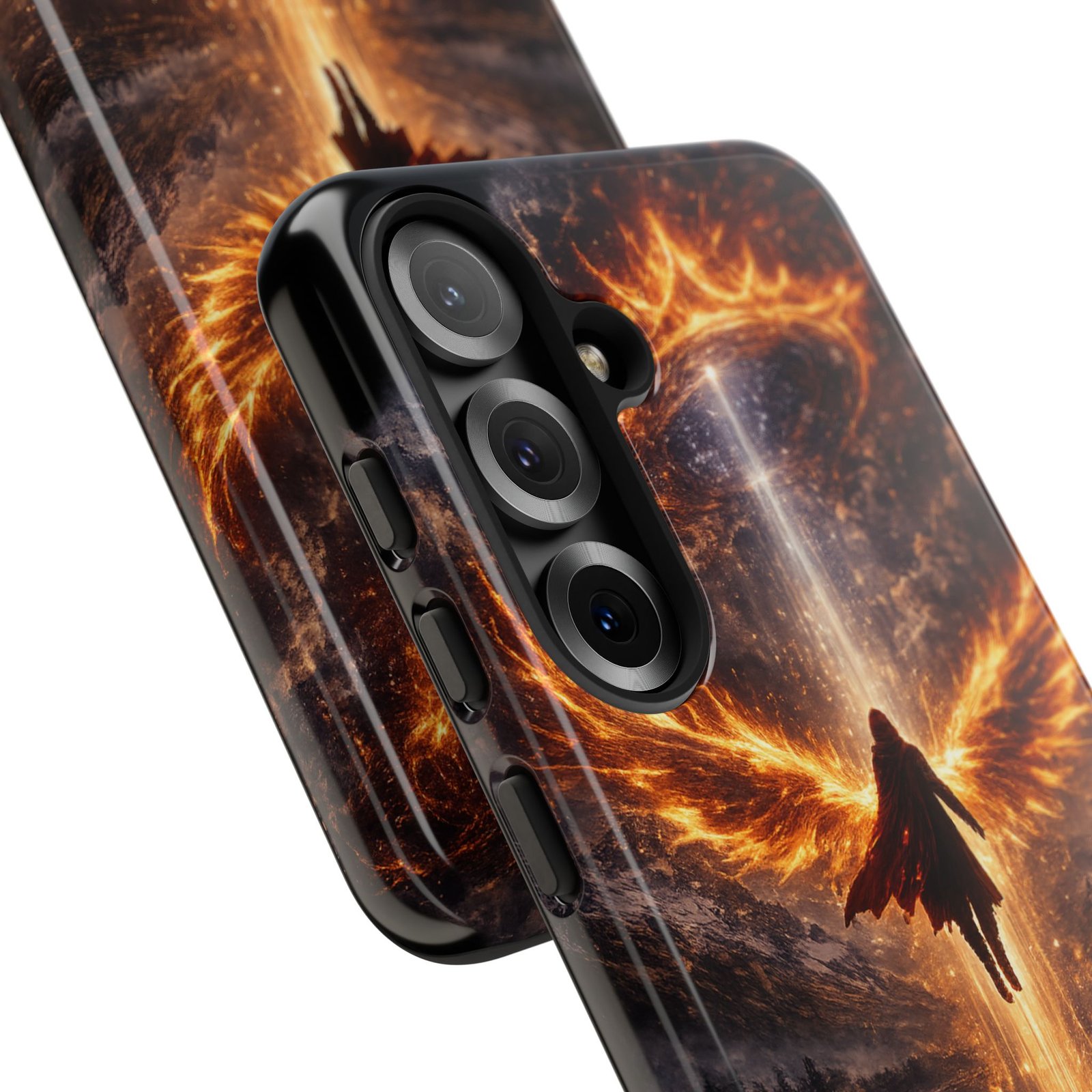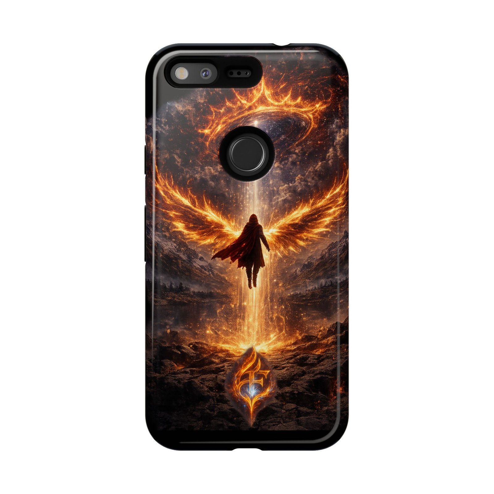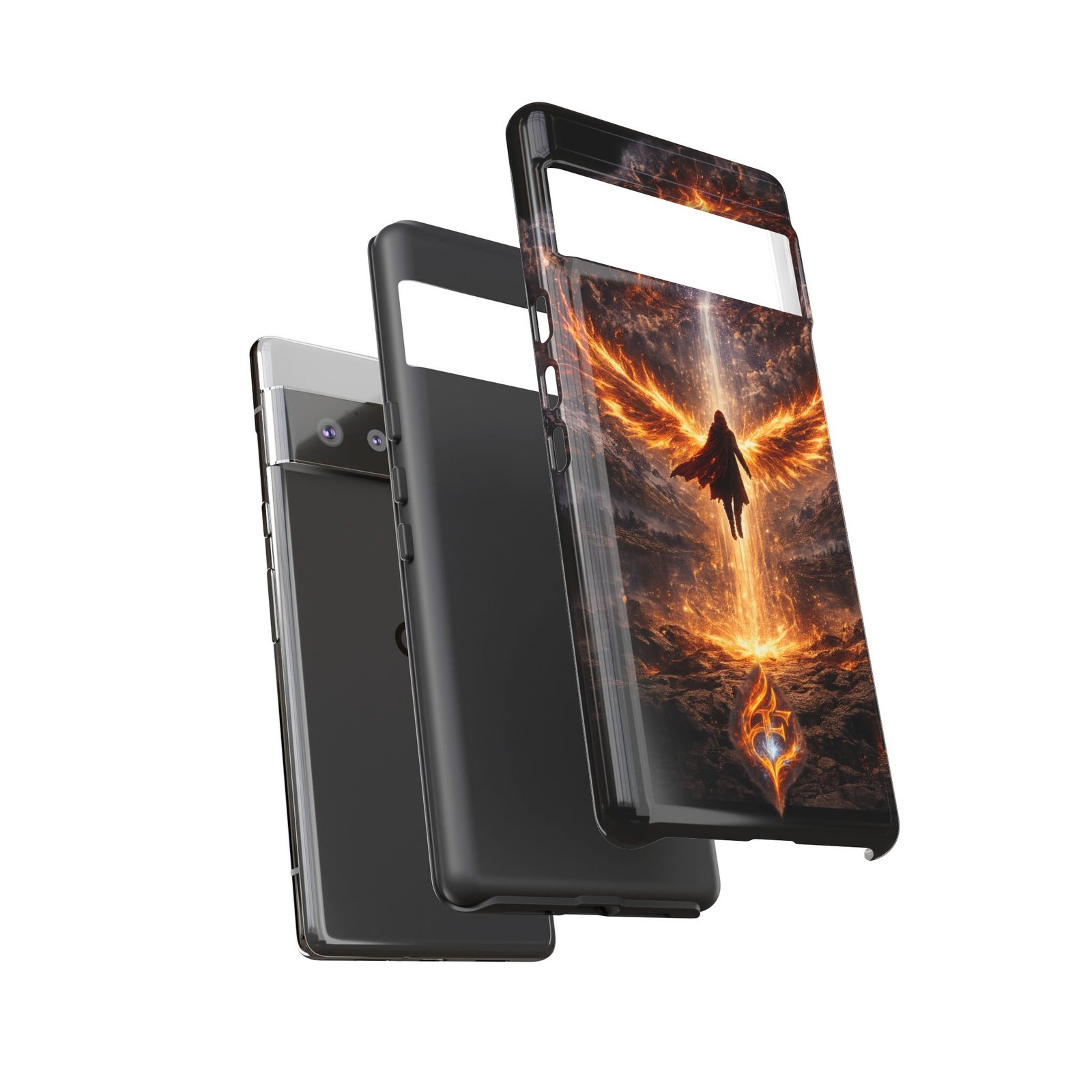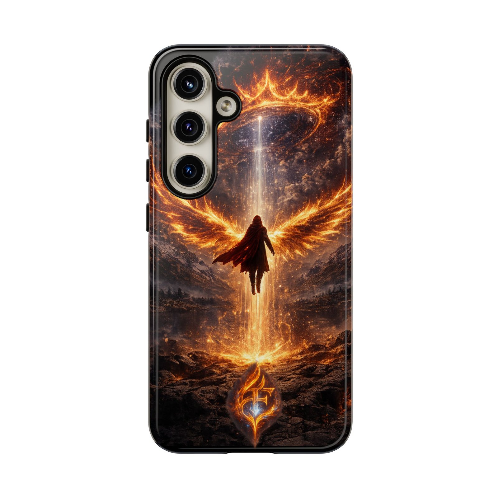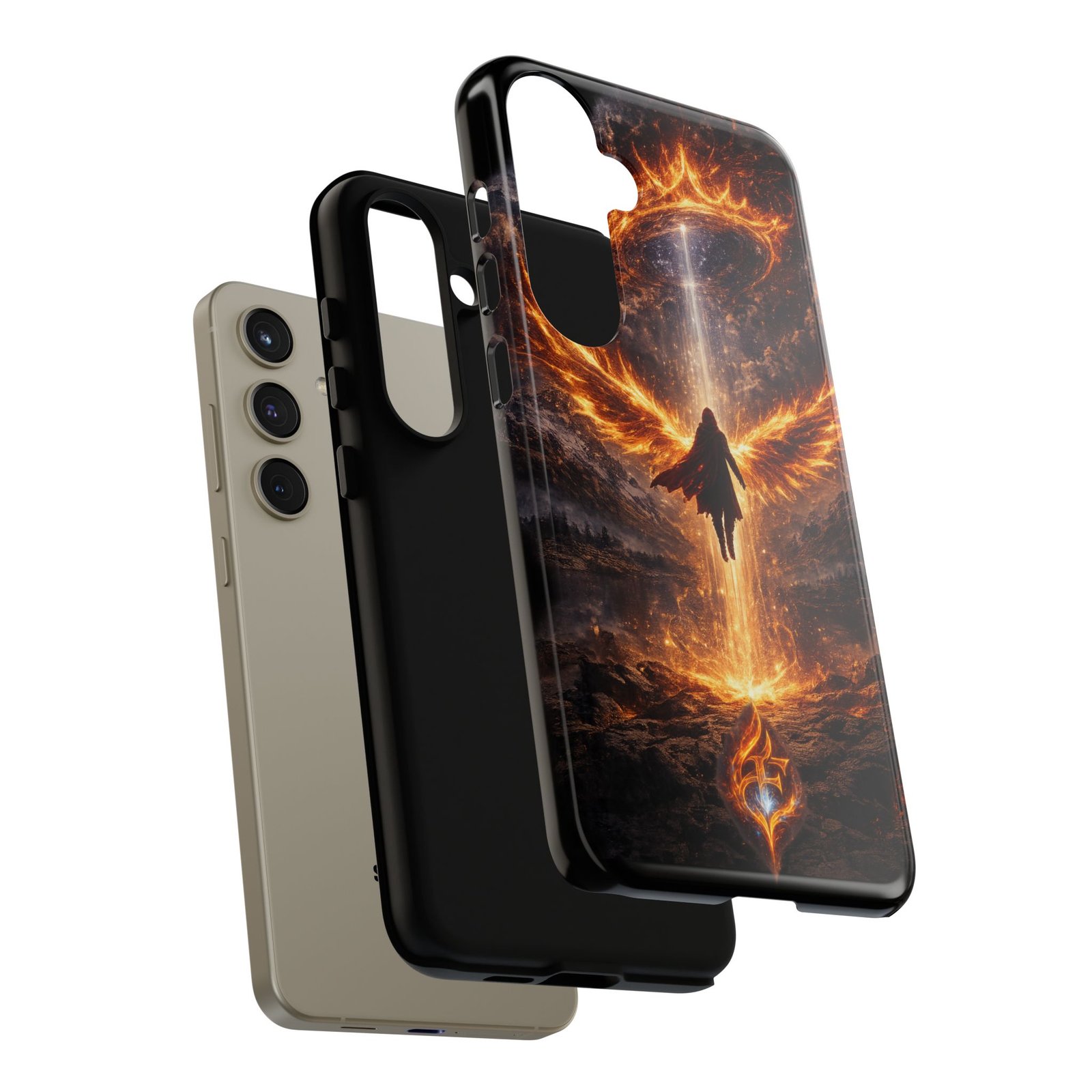 Slide your phone into armor that feels alive. This tough phone case pairs a dual-layer polycarbonate shell with a shock-absorbing TPU liner and a high-density 3D wrap print of a rising, fiery angel — wings unfurling into a halo of flame over a scorched landscape. It reads like a talisman in your hand: resilient, weather-resistant, and made to keep your device intact through daily drops and scrapes while keeping that dramatic artwork vivid. The slim profile preserves wireless charging and clear port access, and finishes are available in glossy or matte to match your look. Follow care notes to keep the colors sharp and the surface pristine.
