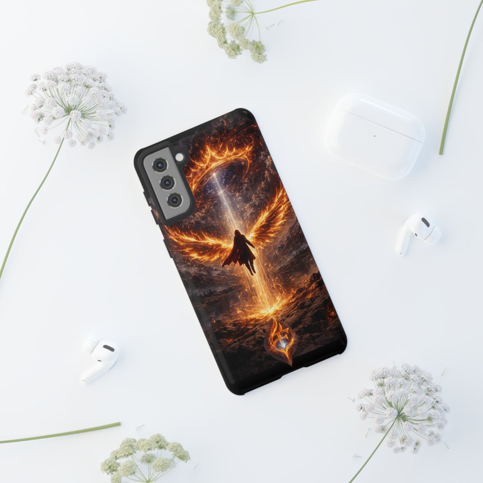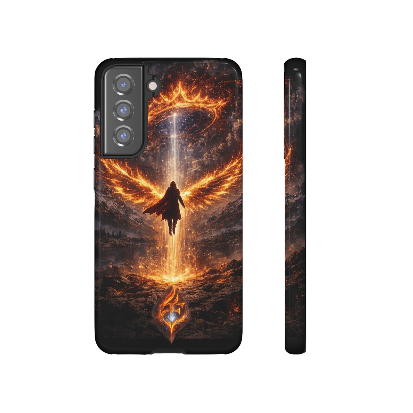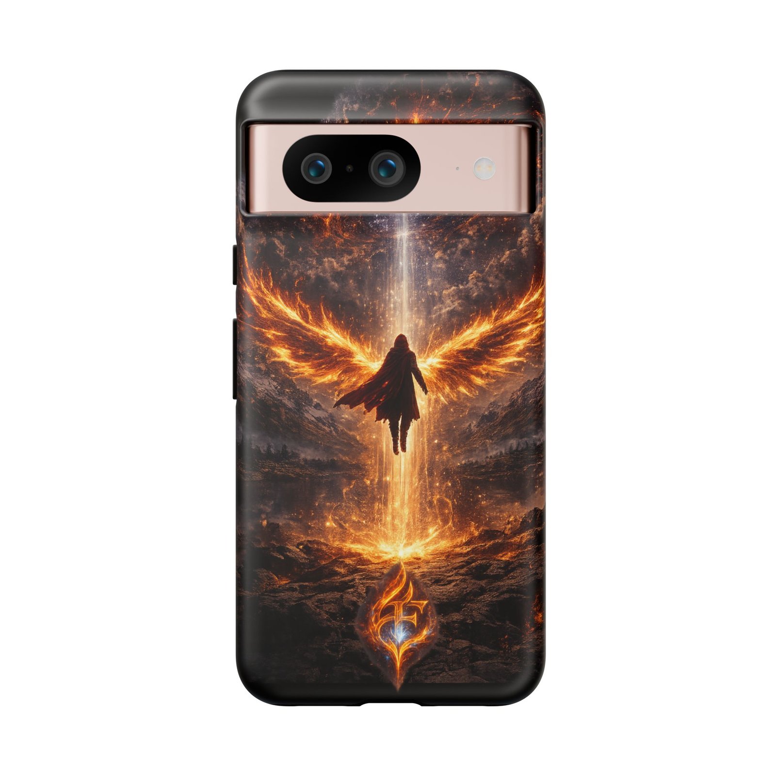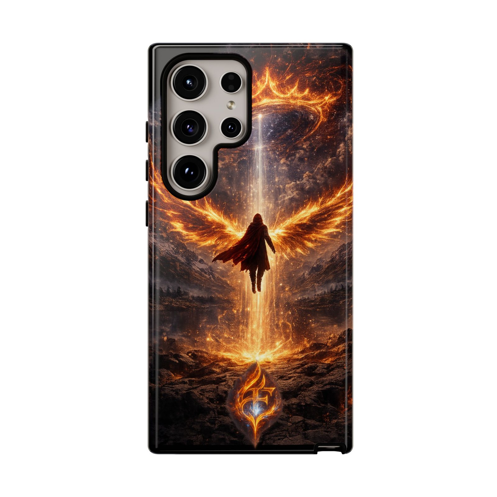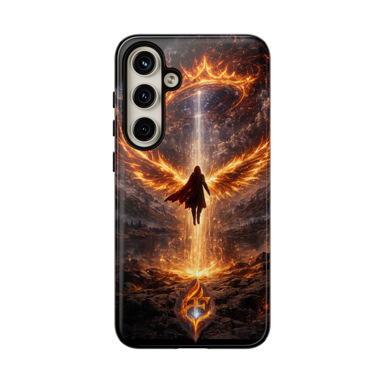 Slide your phone into armor that feels alive. This tough phone case pairs a dual-layer polycarbonate shell with a shock-absorbing TPU liner and a high-density 3D wrap print of a rising, fiery angel — wings unfurling into a halo of flame over a scorched landscape. It reads like a talisman in your hand: resilient, weather-resistant, and made to keep your device intact through daily drops and scrapes while keeping that dramatic artwork vivid. The slim profile preserves wireless charging and clear port access, and finishes are available in glossy or matte to match your look. Follow care notes to keep the colors sharp and the surface pristine.