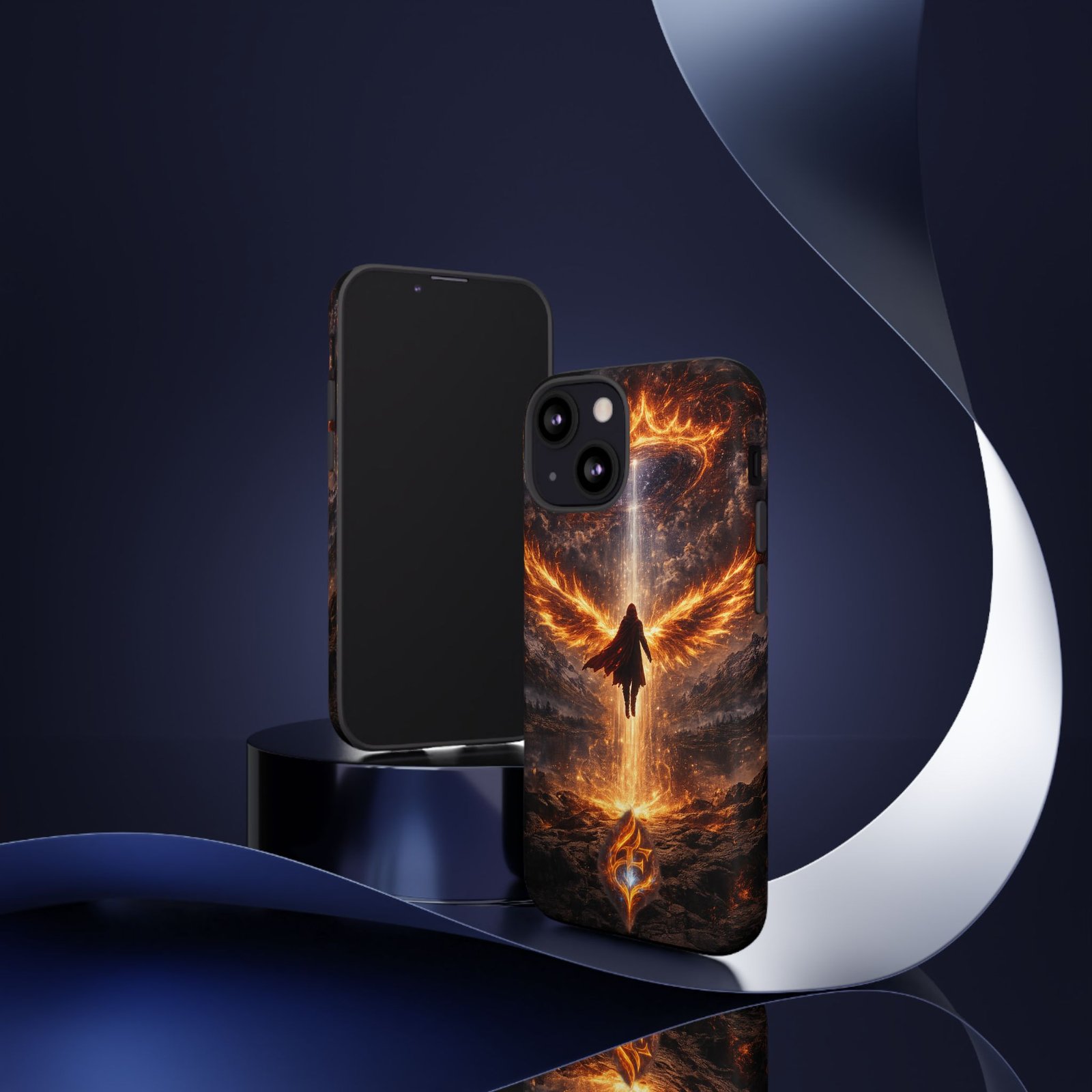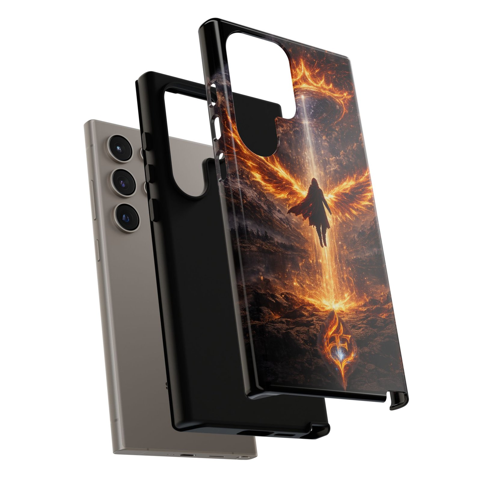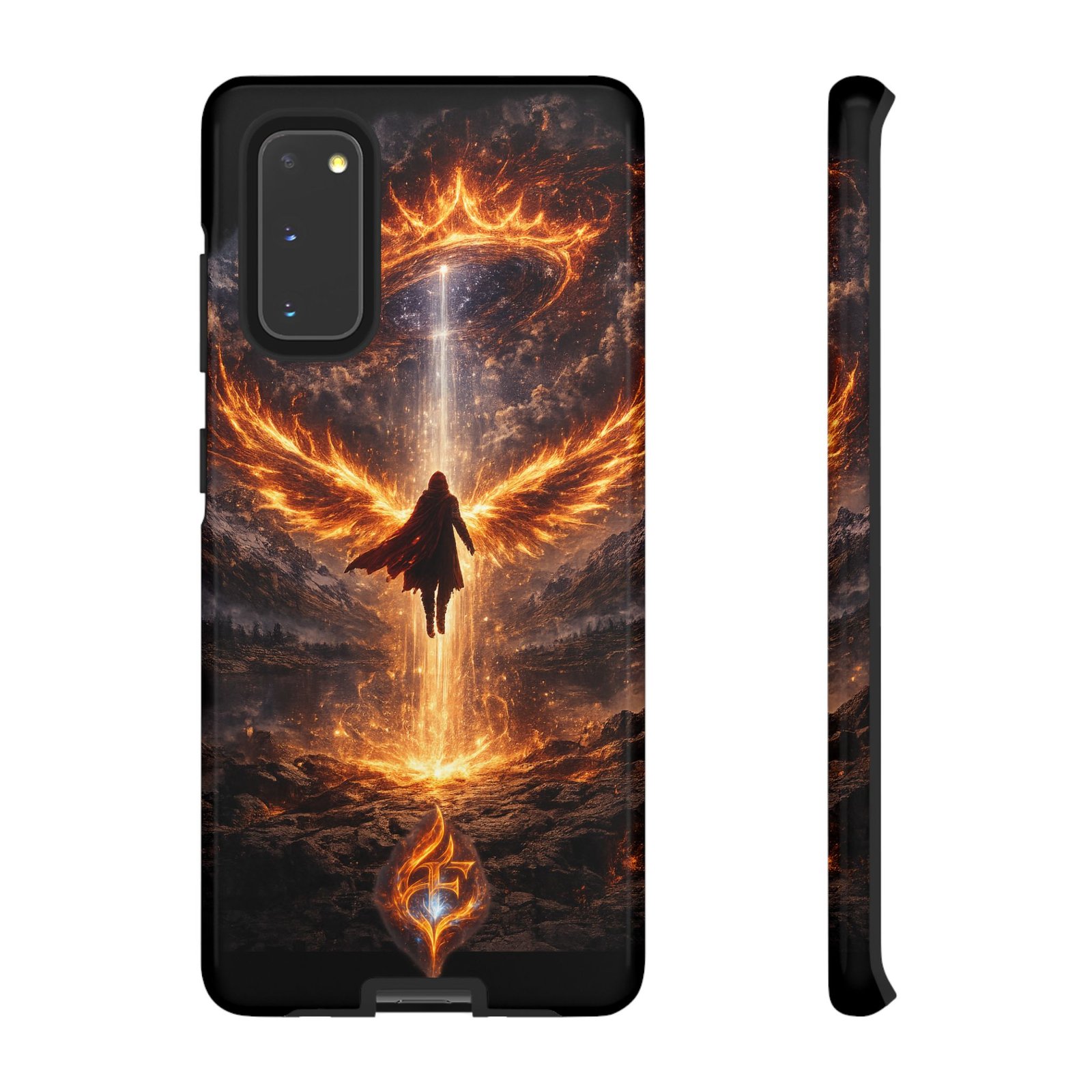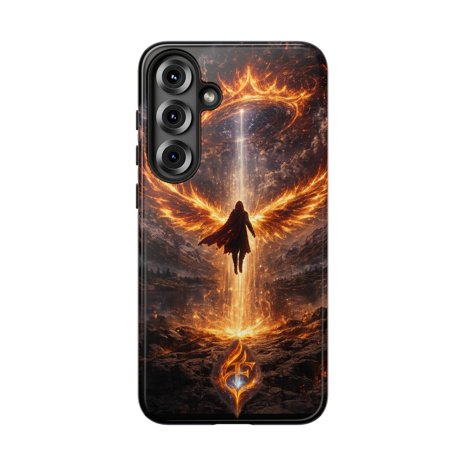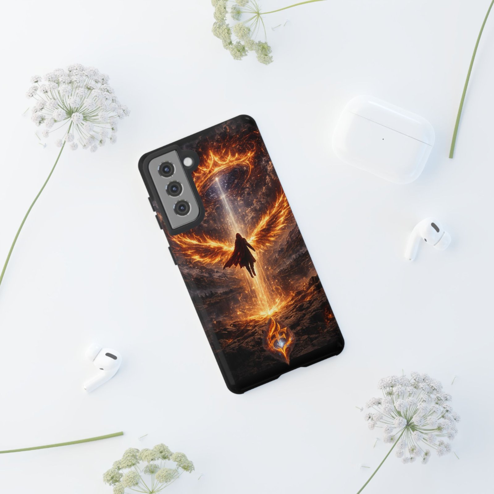 Slide your phone into armor that feels alive. This tough phone case pairs a dual-layer polycarbonate shell with a shock-absorbing TPU liner and a high-density 3D wrap print of a rising, fiery angel — wings unfurling into a halo of flame over a scorched landscape. It reads like a talisman in your hand: resilient, weather-resistant, and made to keep your device intact through daily drops and scrapes while keeping that dramatic artwork vivid. The slim profile preserves wireless charging and clear port access, and finishes are available in glossy or matte to match your look. Follow care notes to keep the colors sharp and the surface pristine.