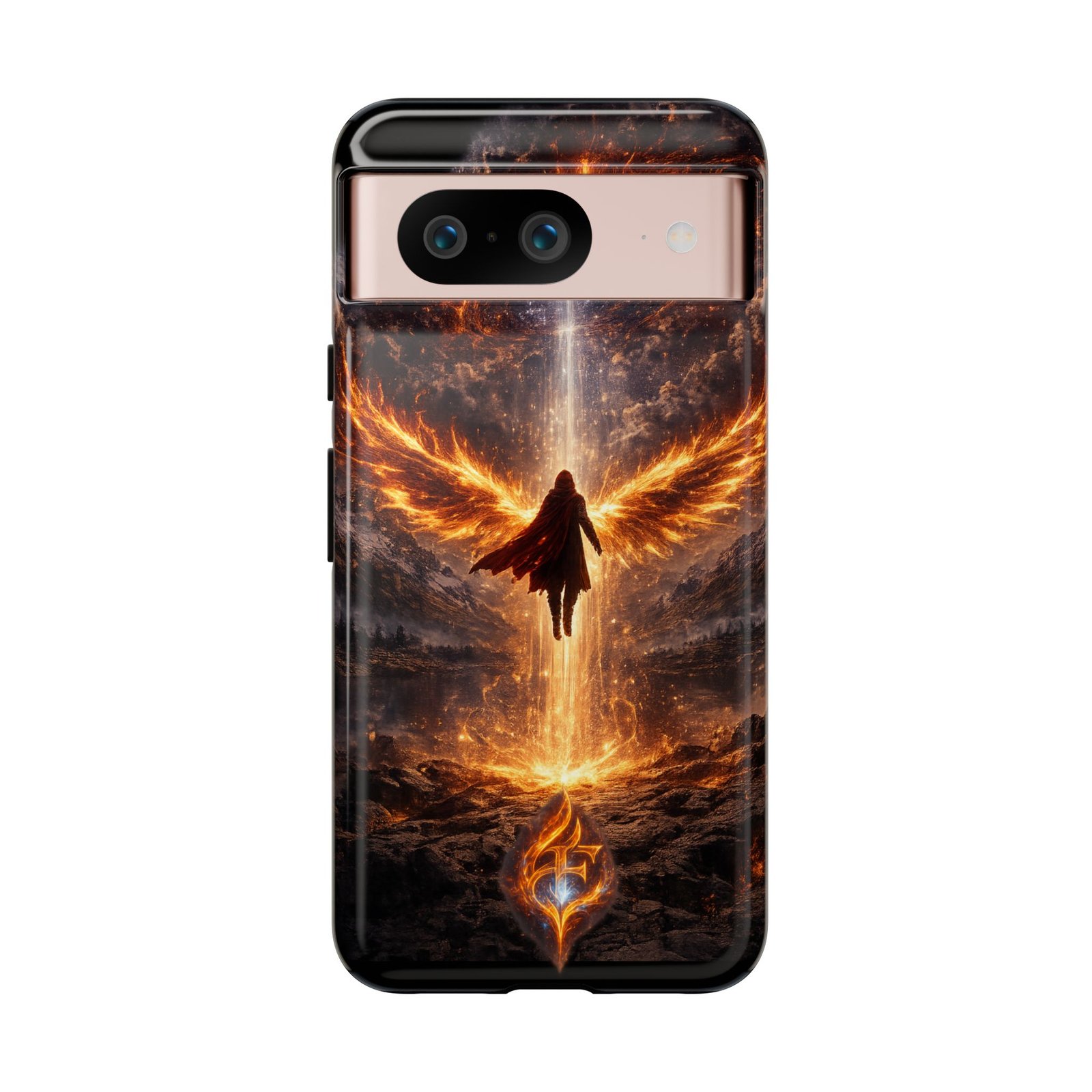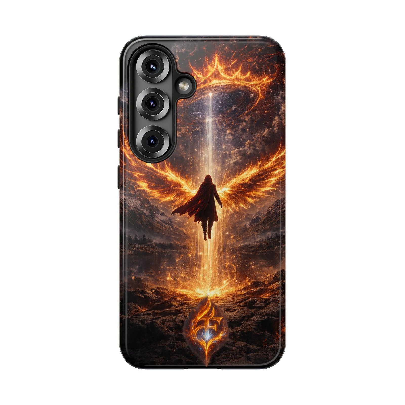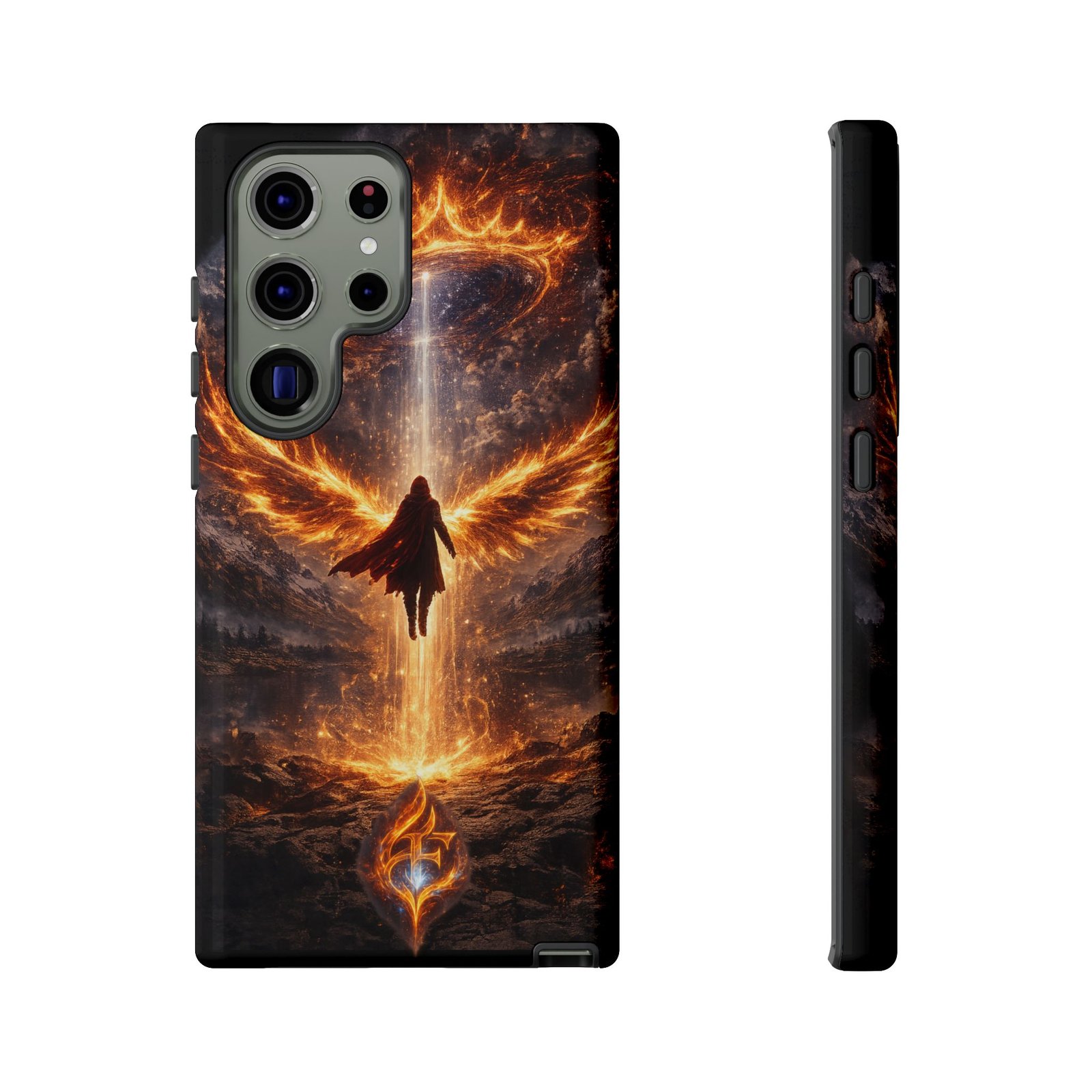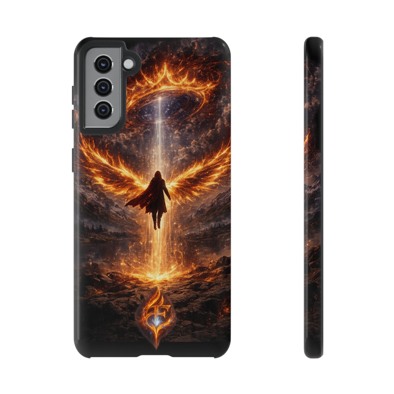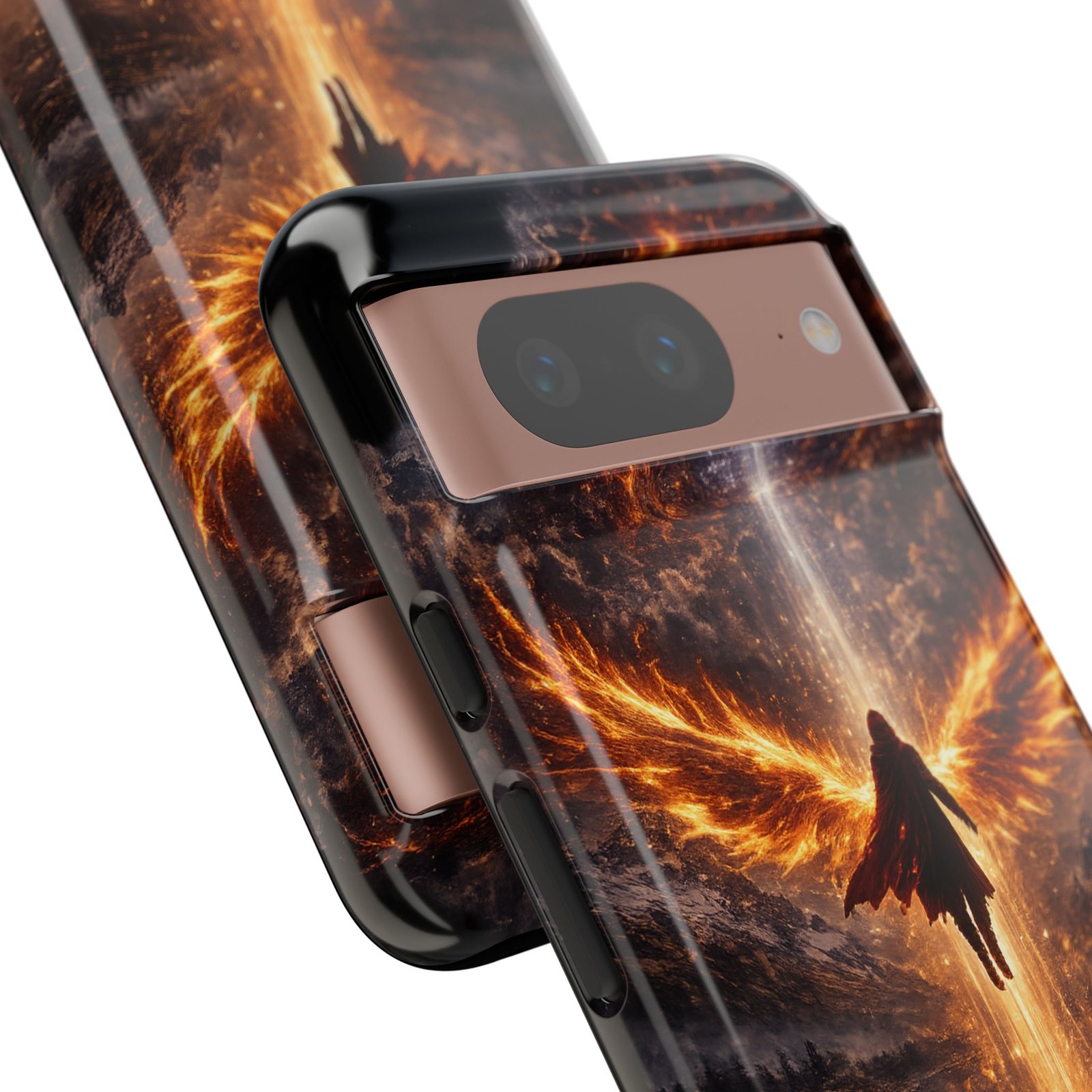 Slide your phone into armor that feels alive. This tough phone case pairs a dual-layer polycarbonate shell with a shock-absorbing TPU liner and a high-density 3D wrap print of a rising, fiery angel — wings unfurling into a halo of flame over a scorched landscape. It reads like a talisman in your hand: resilient, weather-resistant, and made to keep your device intact through daily drops and scrapes while keeping that dramatic artwork vivid. The slim profile preserves wireless charging and clear port access, and finishes are available in glossy or matte to match your look. Follow care notes to keep the colors sharp and the surface pristine.