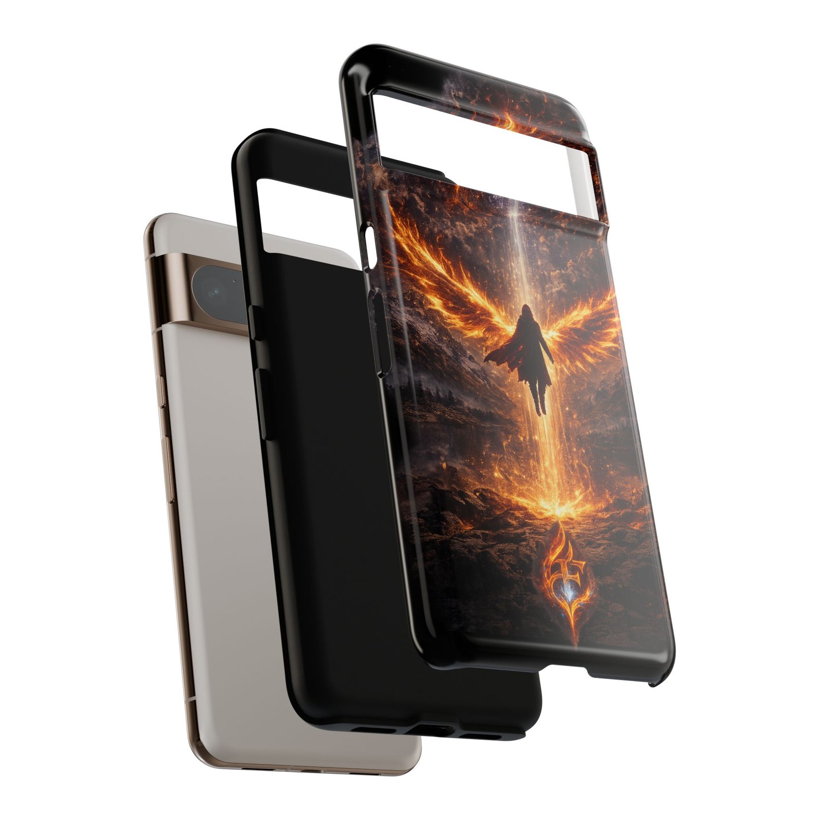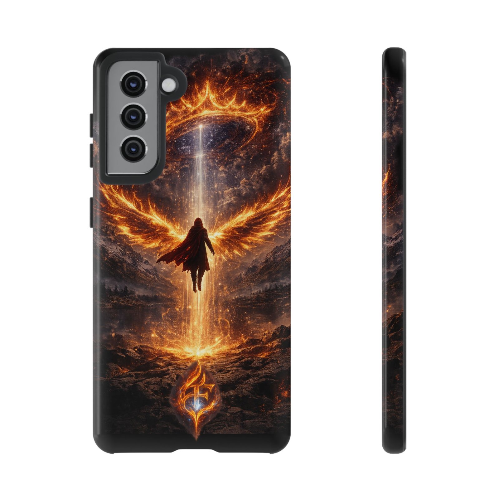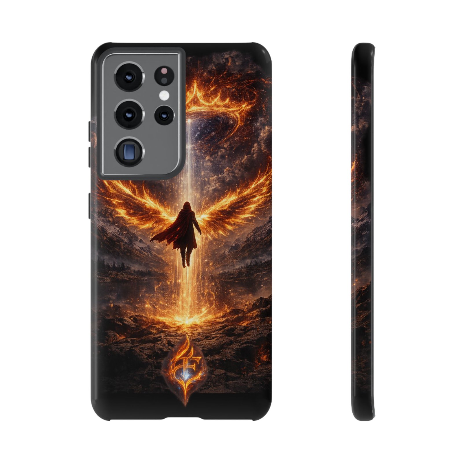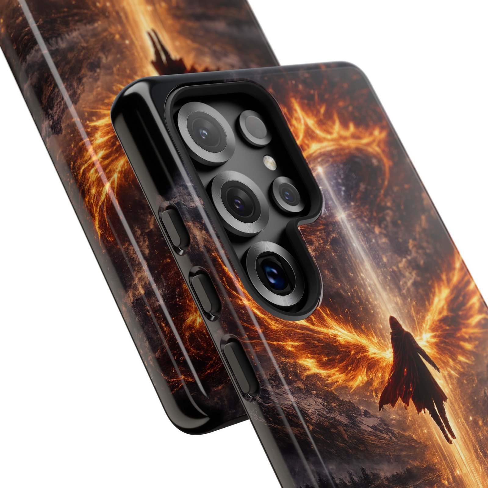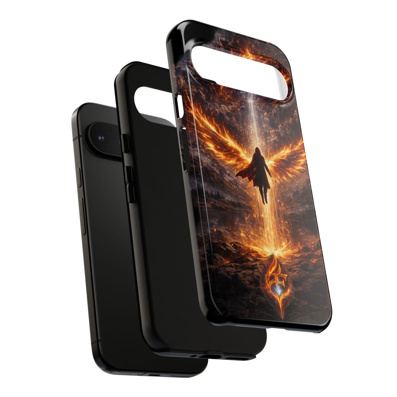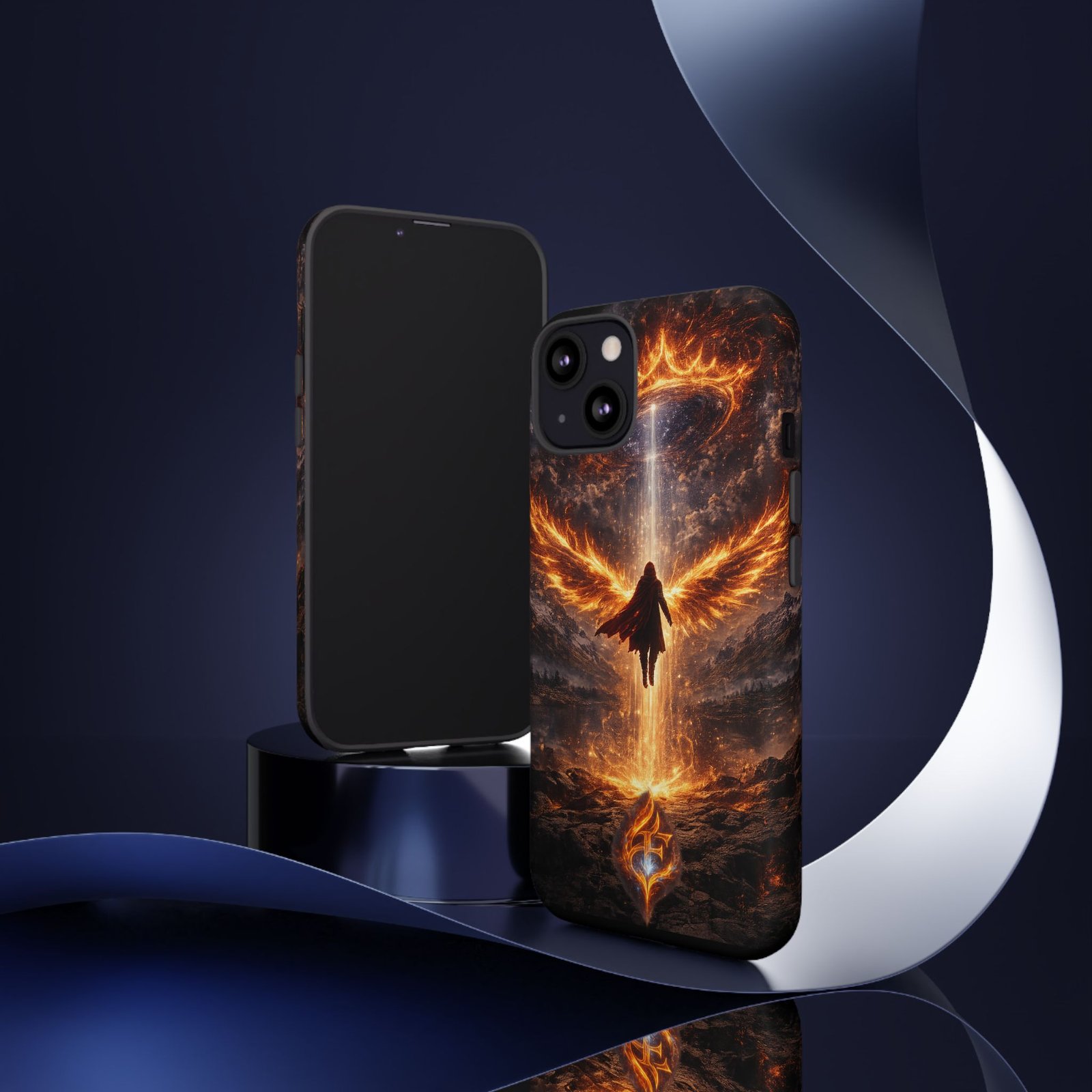Slide your phone into armor that feels alive. This tough phone case pairs a dual-layer polycarbonate shell with a shock-absorbing TPU liner and a high-density 3D wrap print of a rising, fiery angel — wings unfurling into a halo of flame over a scorched landscape. It reads like a talisman in your hand: resilient, weather-resistant, and made to keep your device intact through daily drops and scrapes while keeping that dramatic artwork vivid. The slim profile preserves wireless charging and clear port access, and finishes are available in glossy or matte to match your look. Follow care notes to keep the colors sharp and the surface pristine.