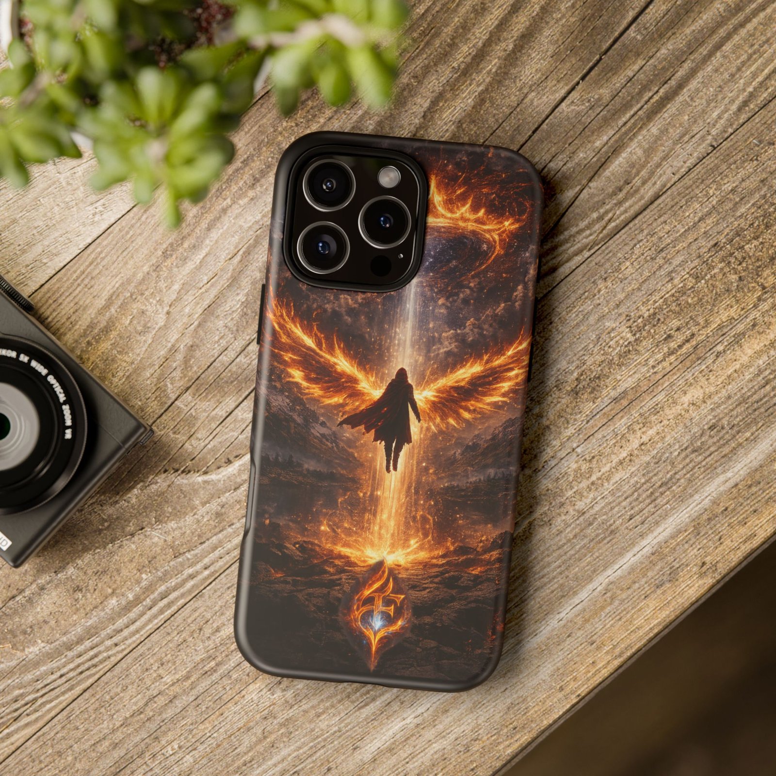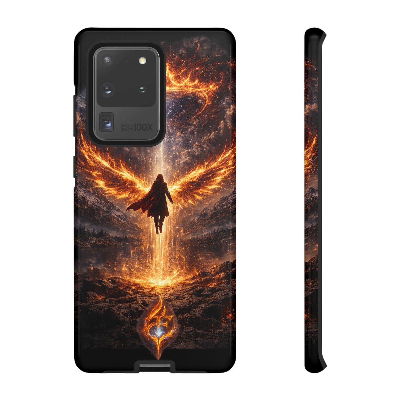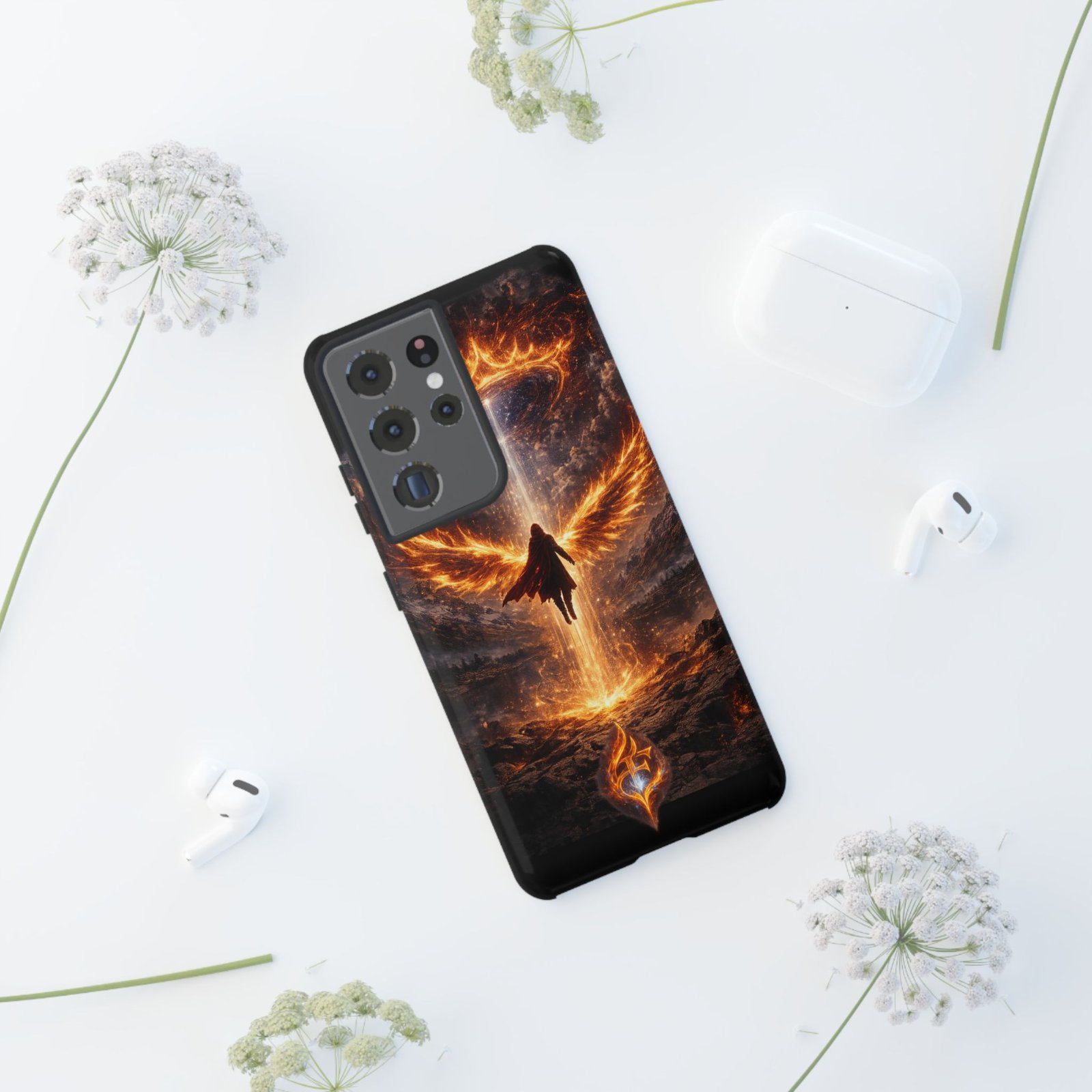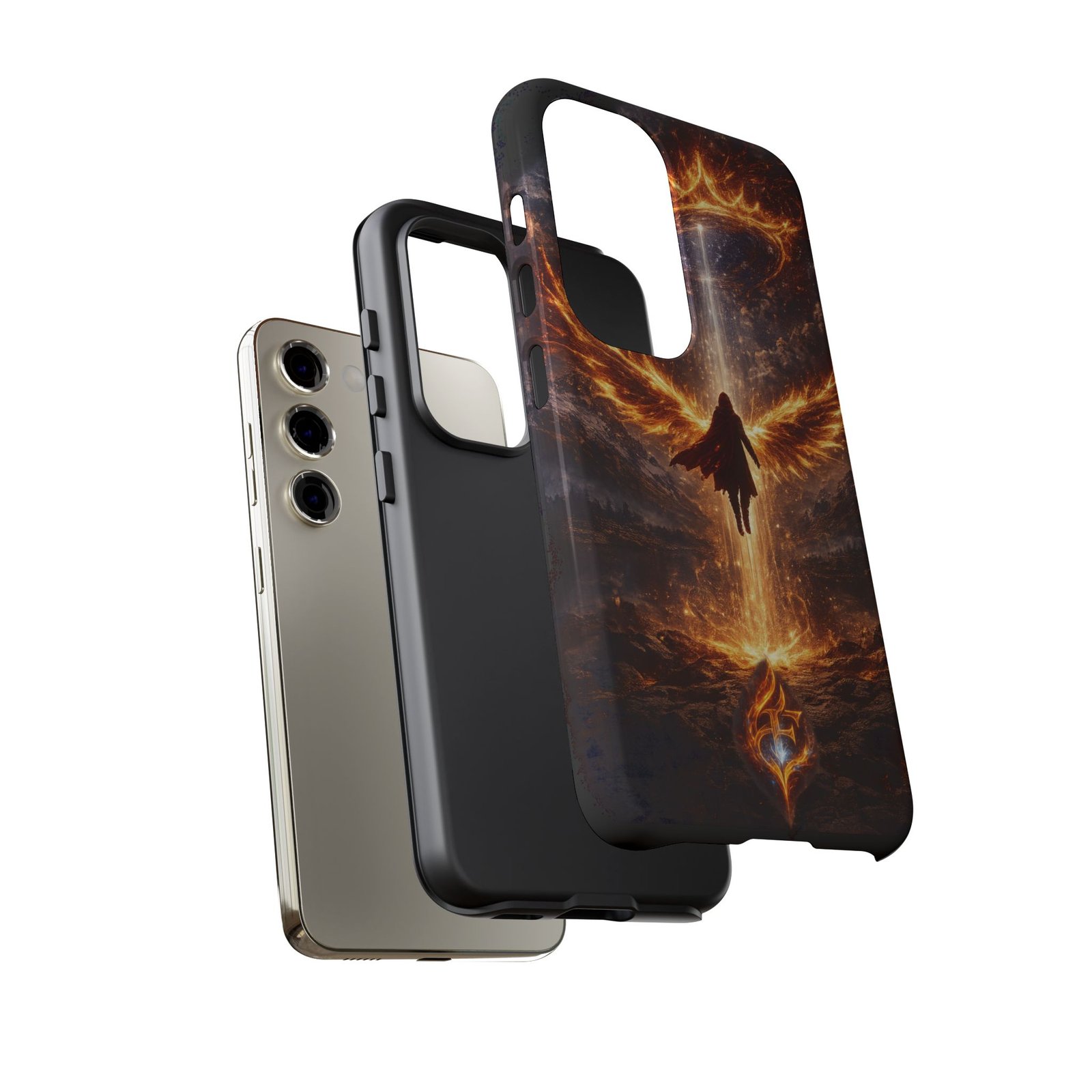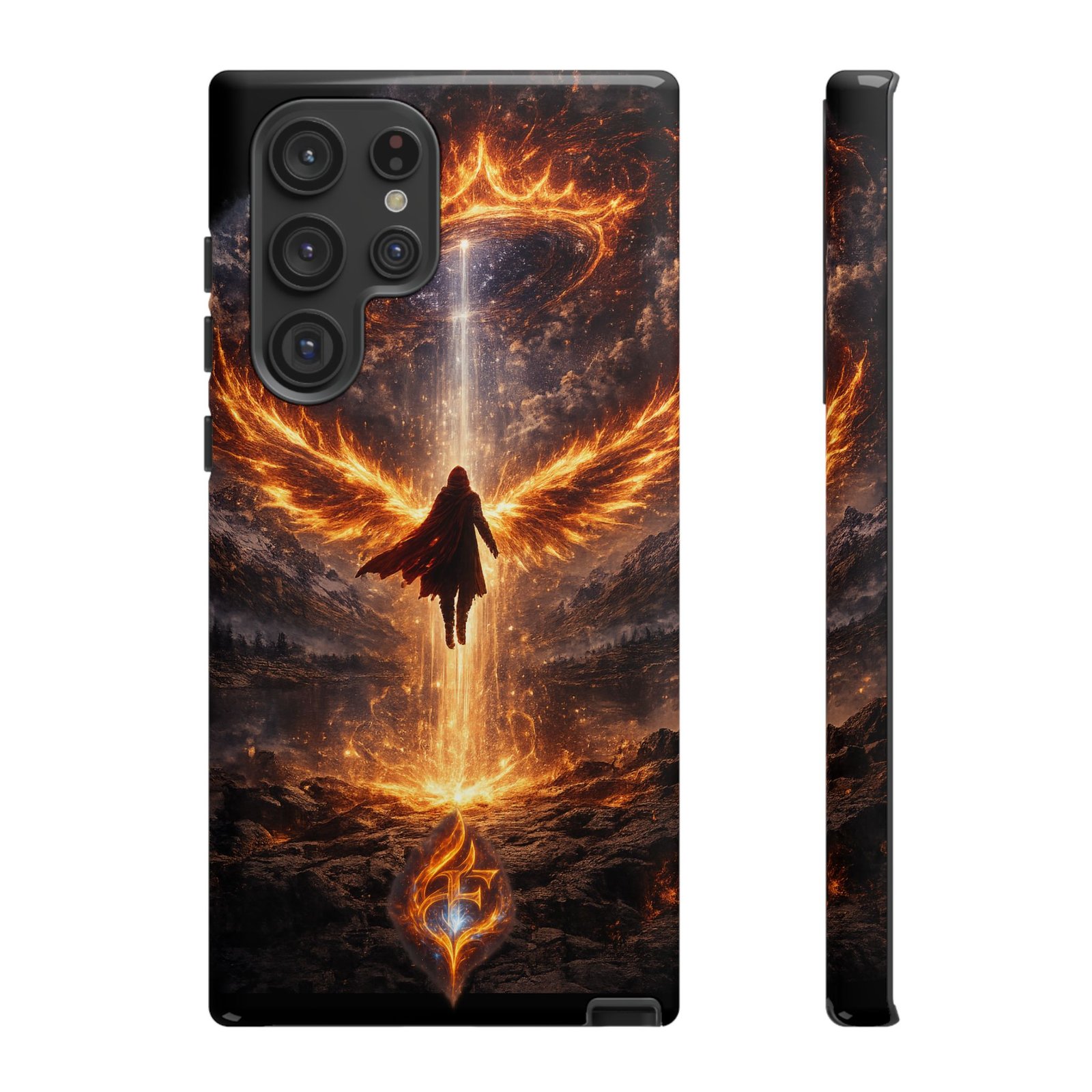 Slide your phone into armor that feels alive. This tough phone case pairs a dual-layer polycarbonate shell with a shock-absorbing TPU liner and a high-density 3D wrap print of a rising, fiery angel — wings unfurling into a halo of flame over a scorched landscape. It reads like a talisman in your hand: resilient, weather-resistant, and made to keep your device intact through daily drops and scrapes while keeping that dramatic artwork vivid. The slim profile preserves wireless charging and clear port access, and finishes are available in glossy or matte to match your look. Follow care notes to keep the colors sharp and the surface pristine.