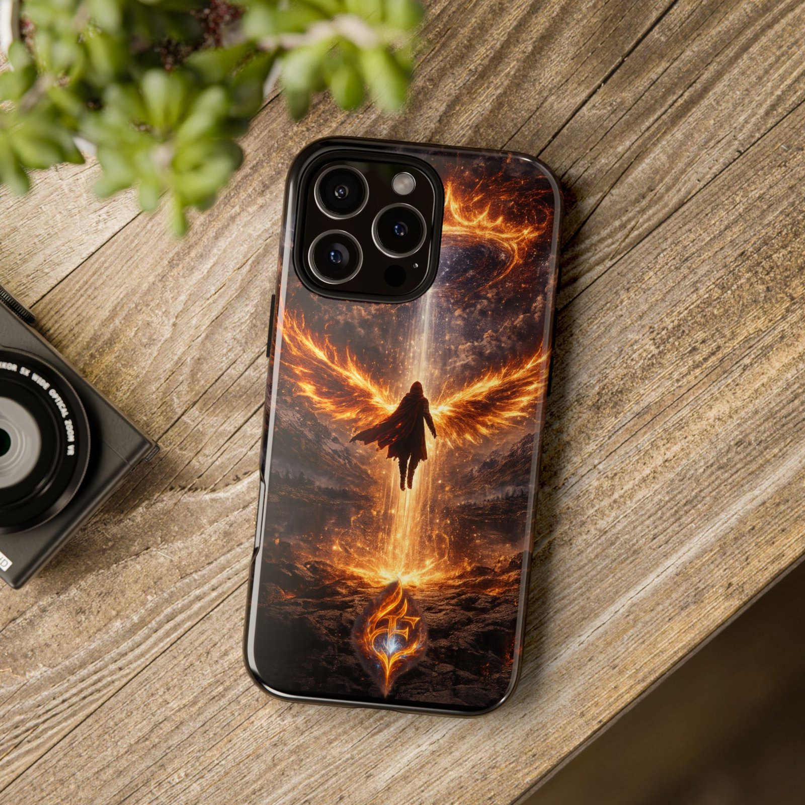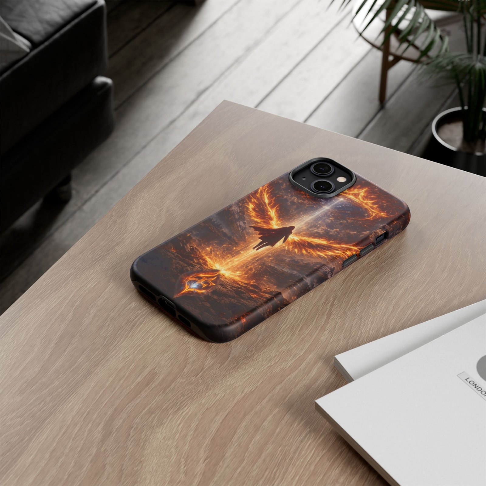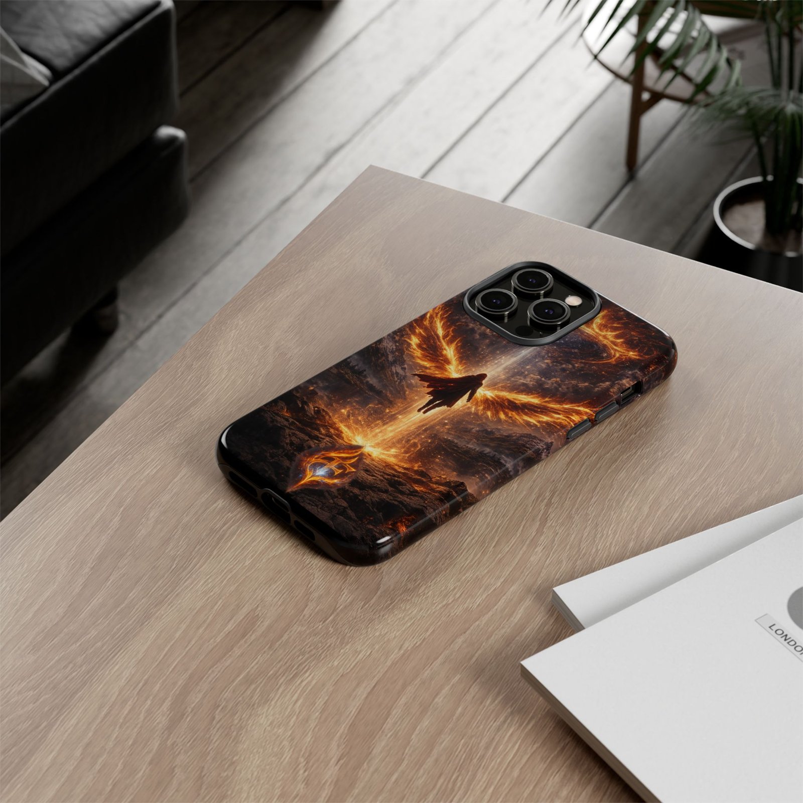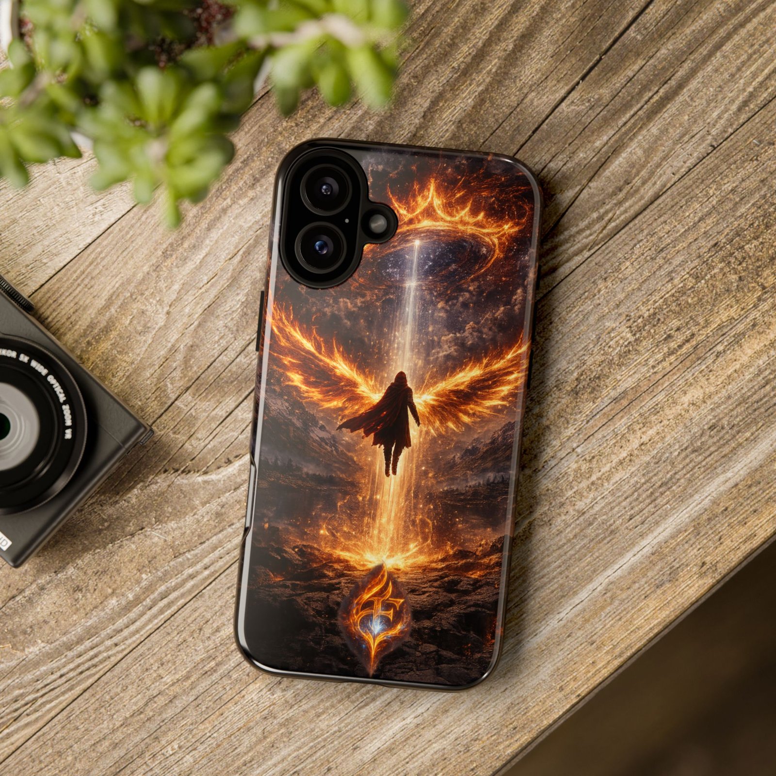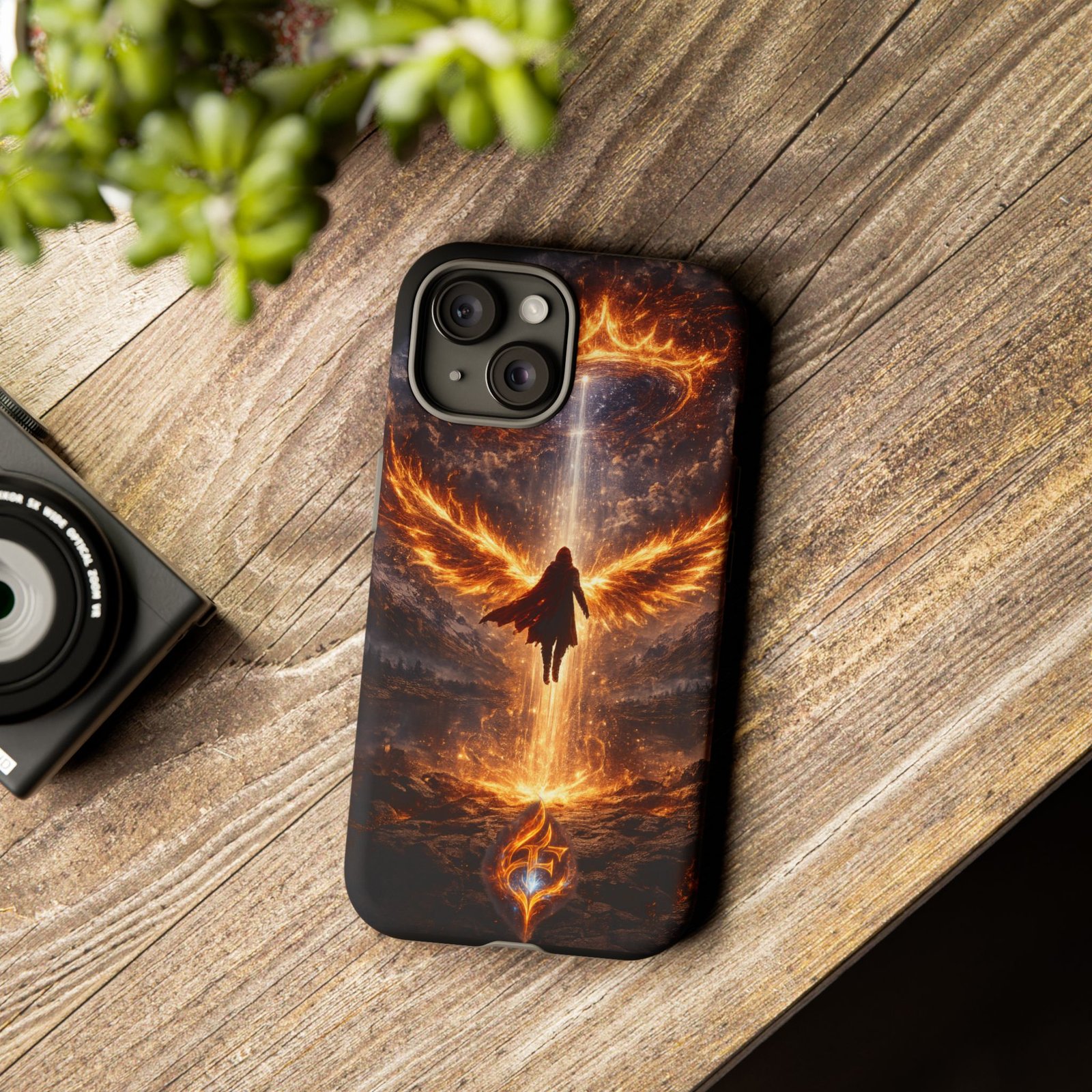 Slide your phone into armor that feels alive. This tough phone case pairs a dual-layer polycarbonate shell with a shock-absorbing TPU liner and a high-density 3D wrap print of a rising, fiery angel — wings unfurling into a halo of flame over a scorched landscape. It reads like a talisman in your hand: resilient, weather-resistant, and made to keep your device intact through daily drops and scrapes while keeping that dramatic artwork vivid. The slim profile preserves wireless charging and clear port access, and finishes are available in glossy or matte to match your look. Follow care notes to keep the colors sharp and the surface pristine.