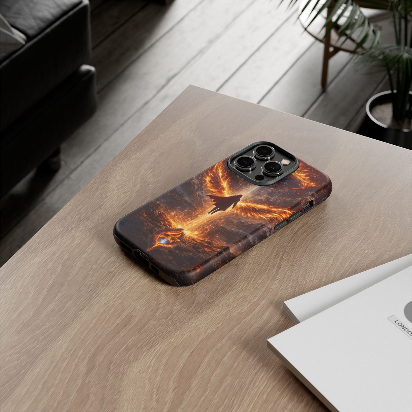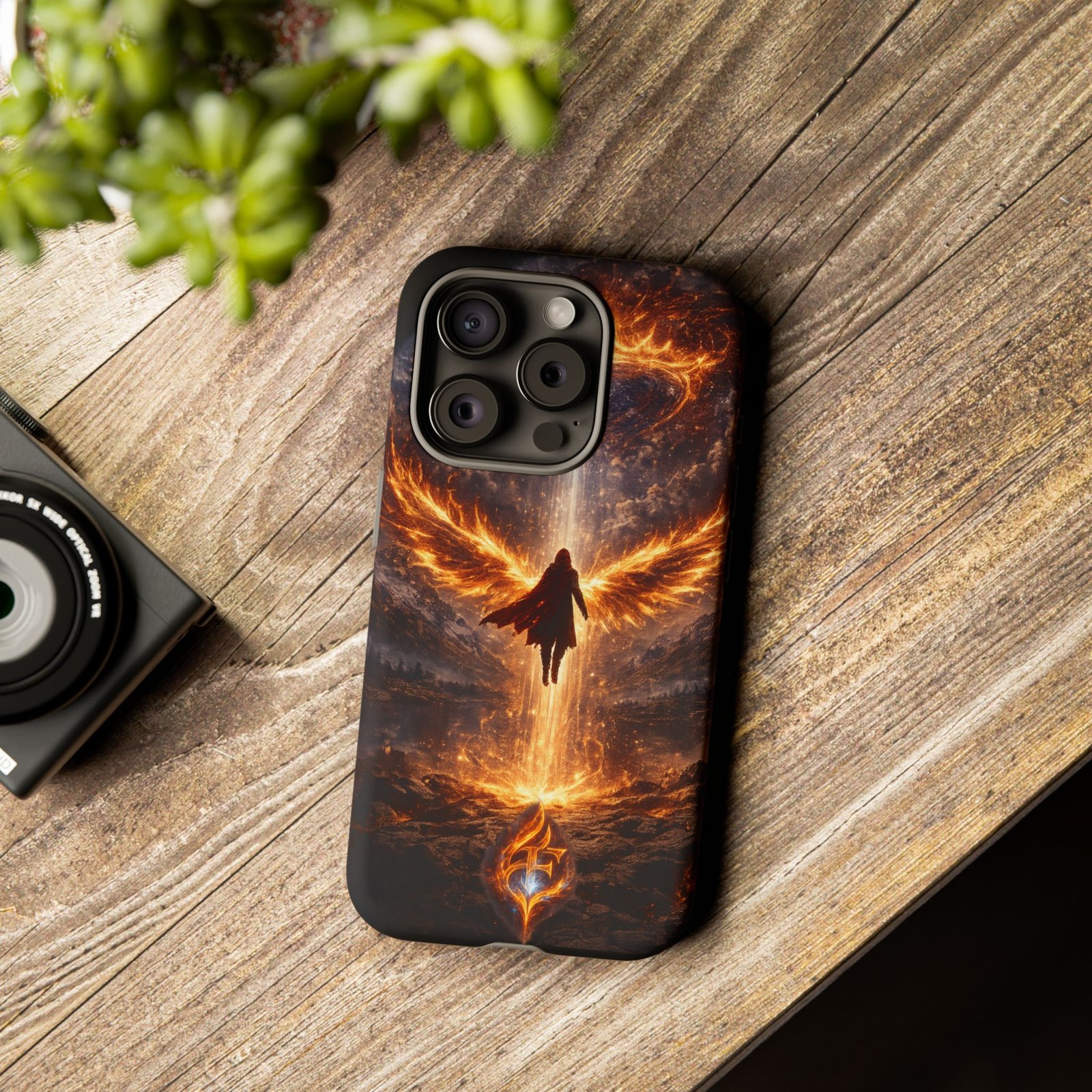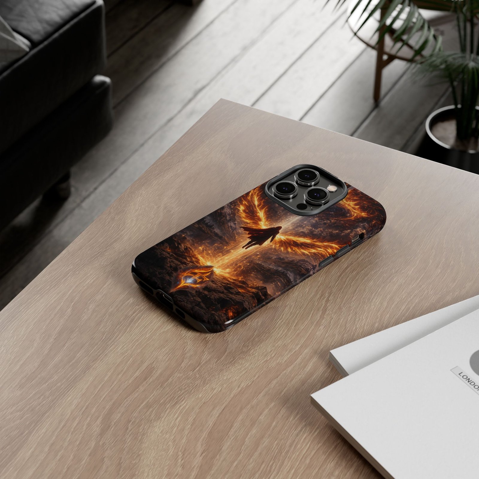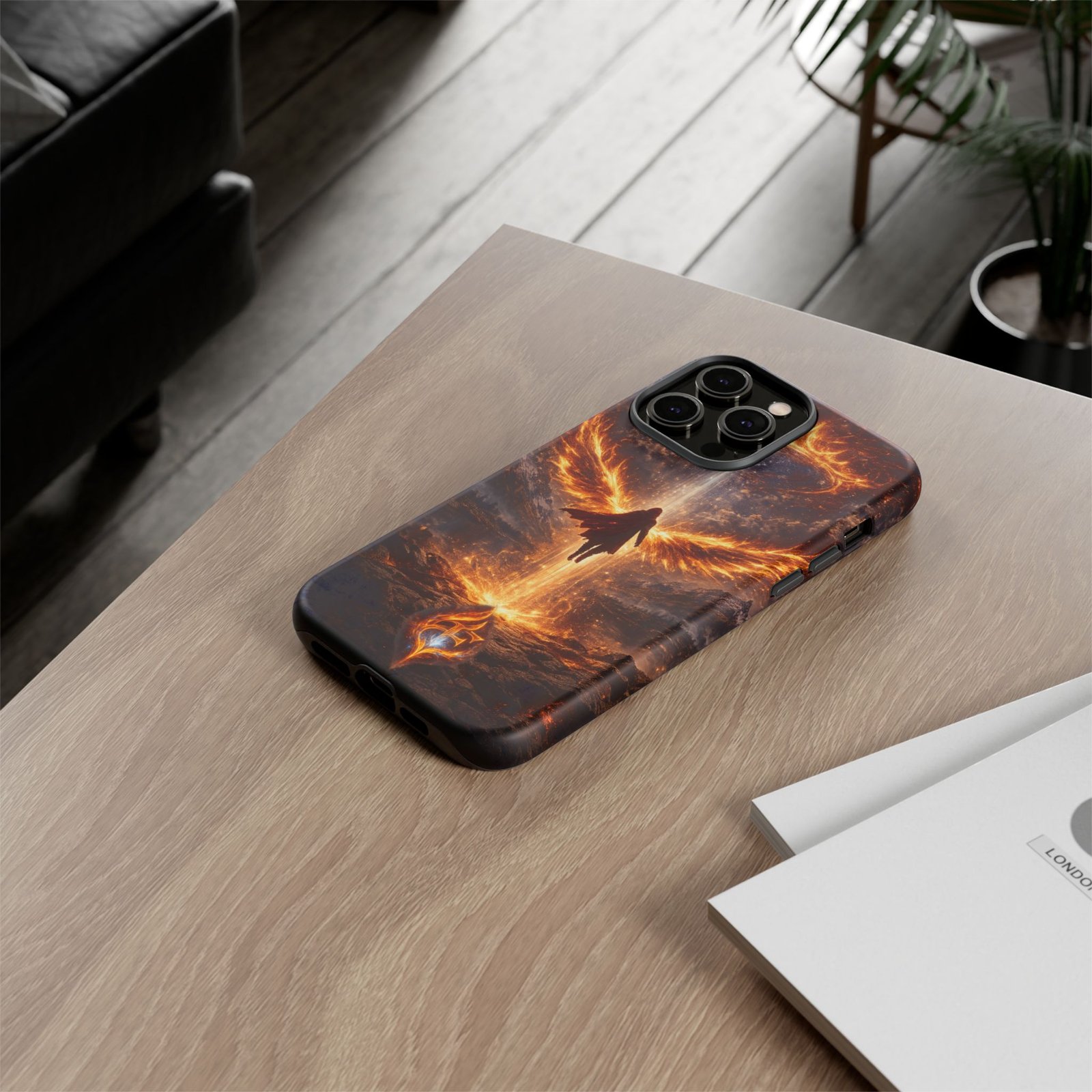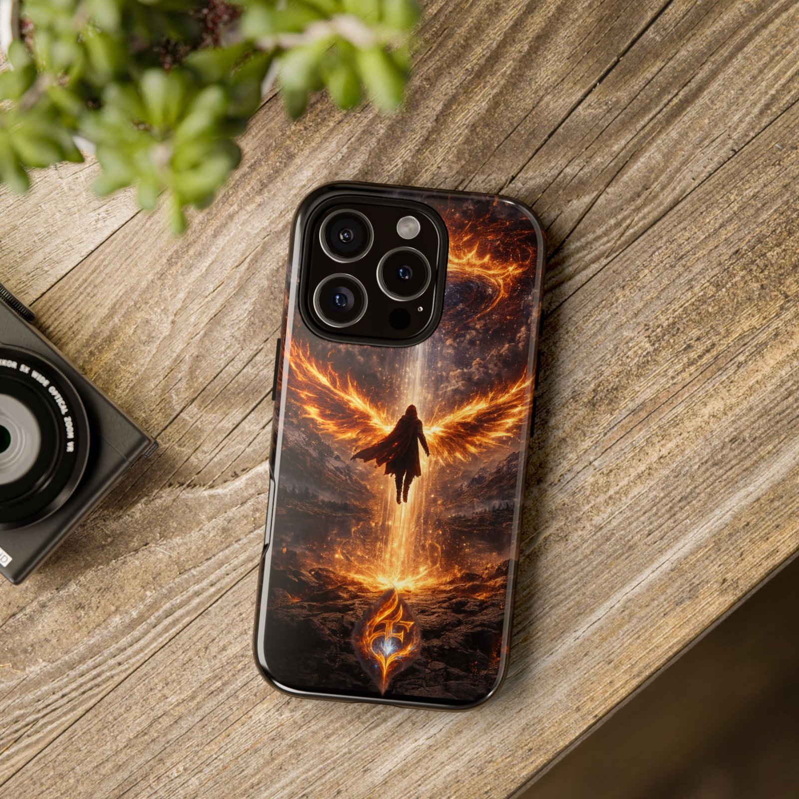 Slide your phone into armor that feels alive. This tough phone case pairs a dual-layer polycarbonate shell with a shock-absorbing TPU liner and a high-density 3D wrap print of a rising, fiery angel — wings unfurling into a halo of flame over a scorched landscape. It reads like a talisman in your hand: resilient, weather-resistant, and made to keep your device intact through daily drops and scrapes while keeping that dramatic artwork vivid. The slim profile preserves wireless charging and clear port access, and finishes are available in glossy or matte to match your look. Follow care notes to keep the colors sharp and the surface pristine.