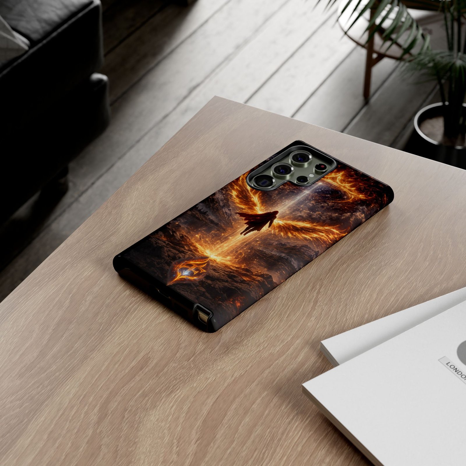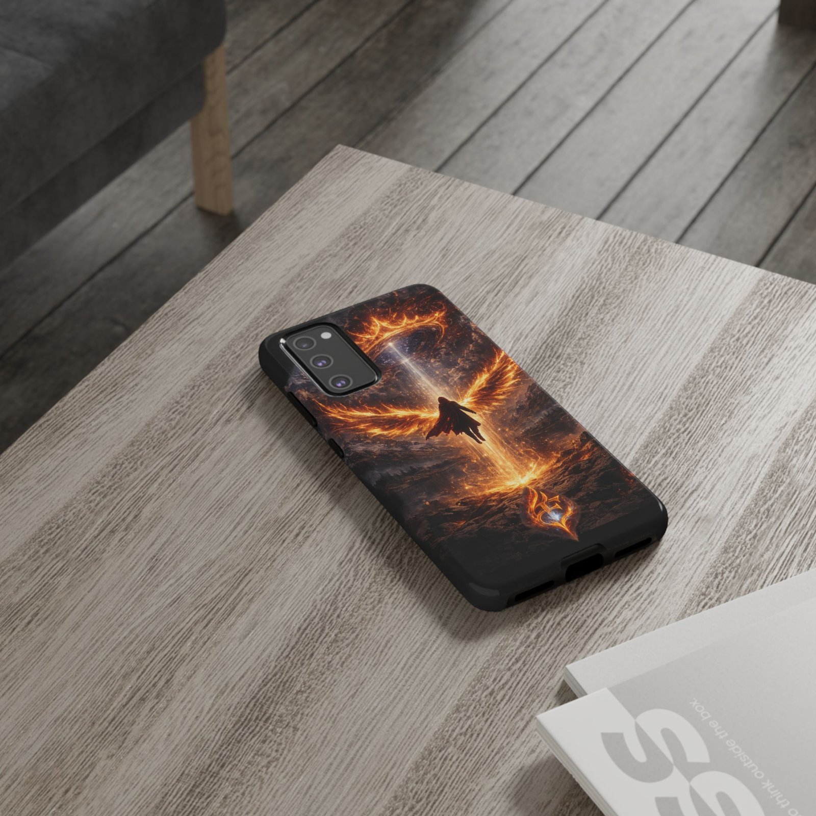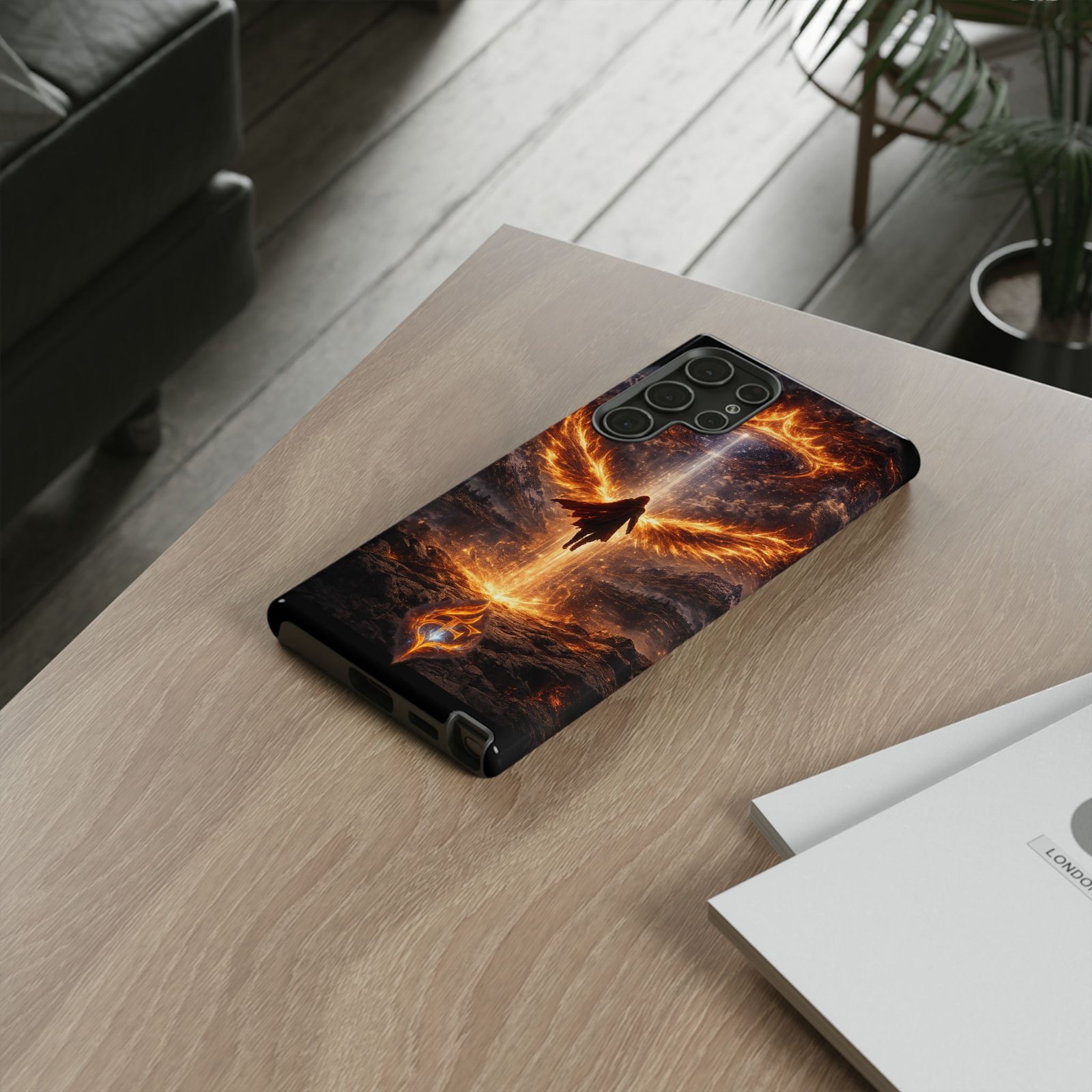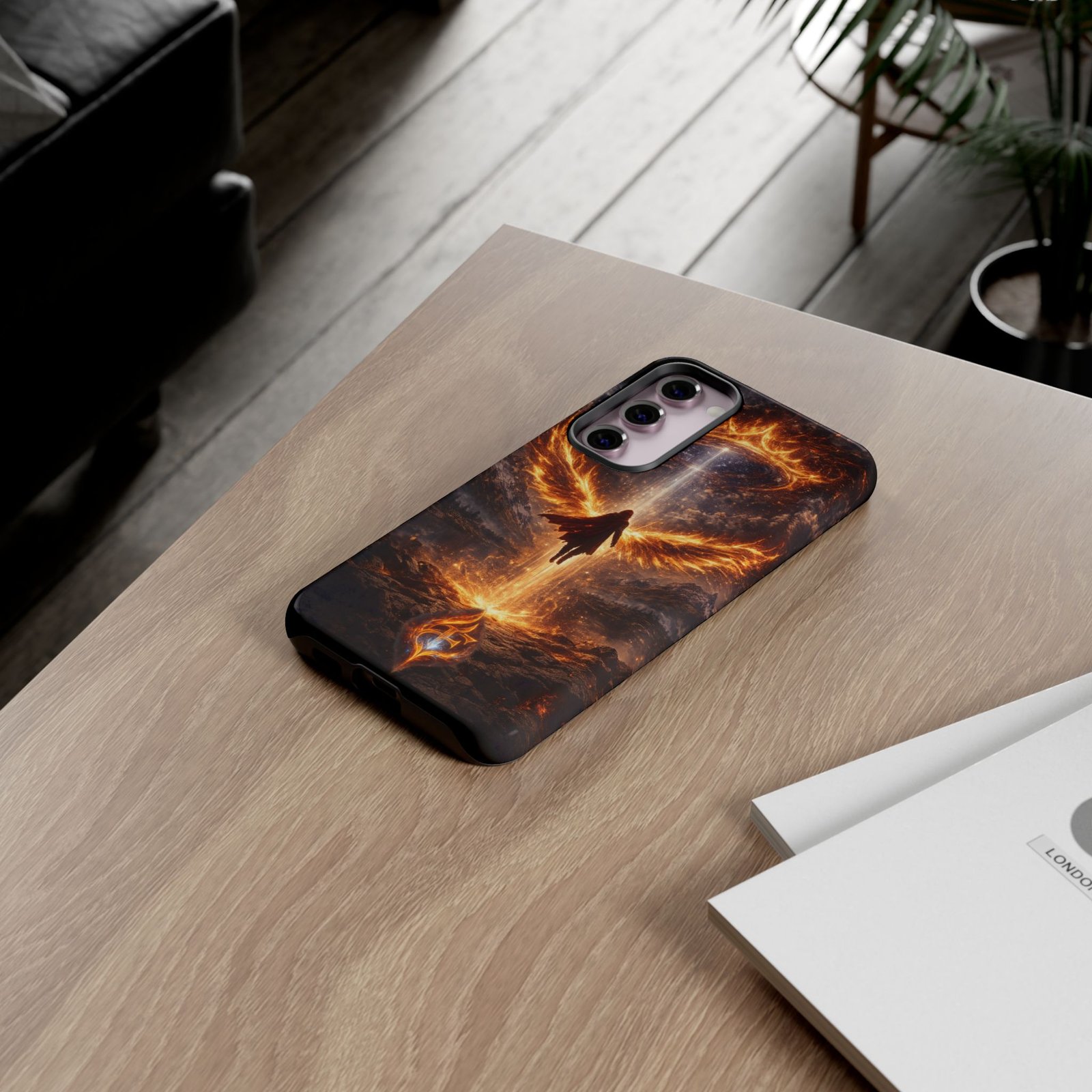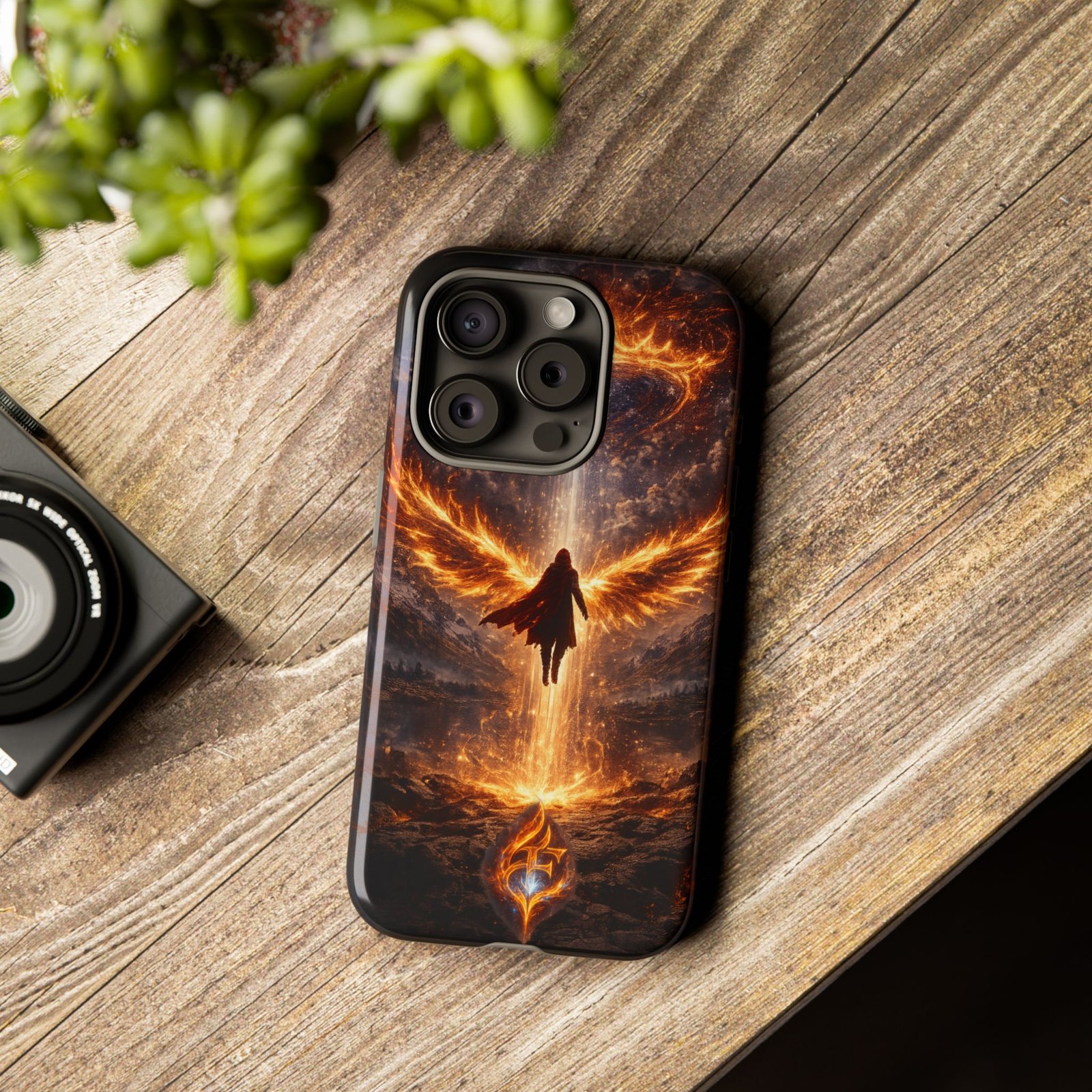 Slide your phone into armor that feels alive. This tough phone case pairs a dual-layer polycarbonate shell with a shock-absorbing TPU liner and a high-density 3D wrap print of a rising, fiery angel — wings unfurling into a halo of flame over a scorched landscape. It reads like a talisman in your hand: resilient, weather-resistant, and made to keep your device intact through daily drops and scrapes while keeping that dramatic artwork vivid. The slim profile preserves wireless charging and clear port access, and finishes are available in glossy or matte to match your look. Follow care notes to keep the colors sharp and the surface pristine.