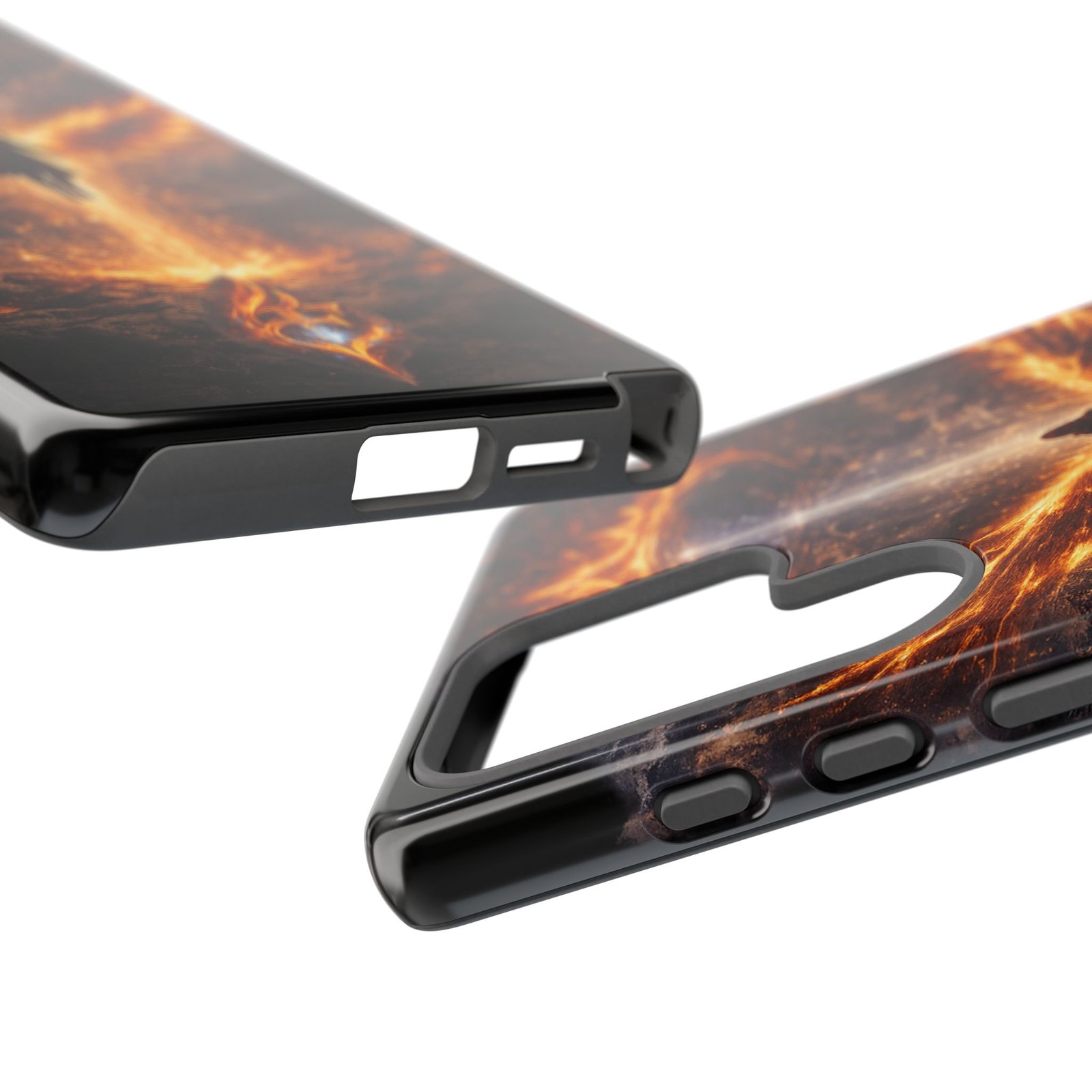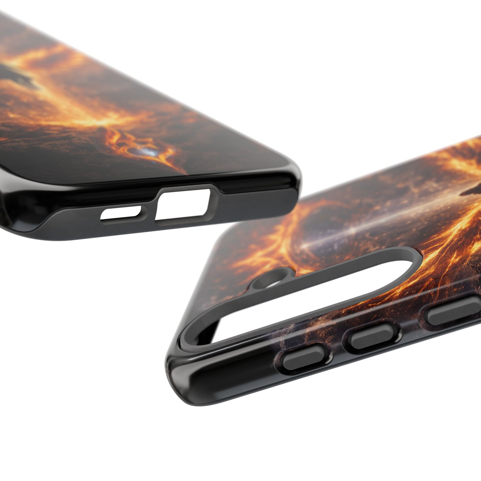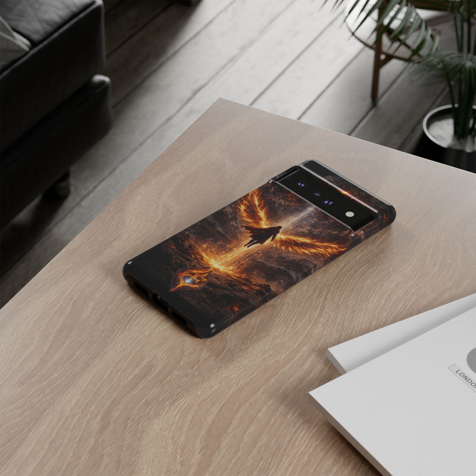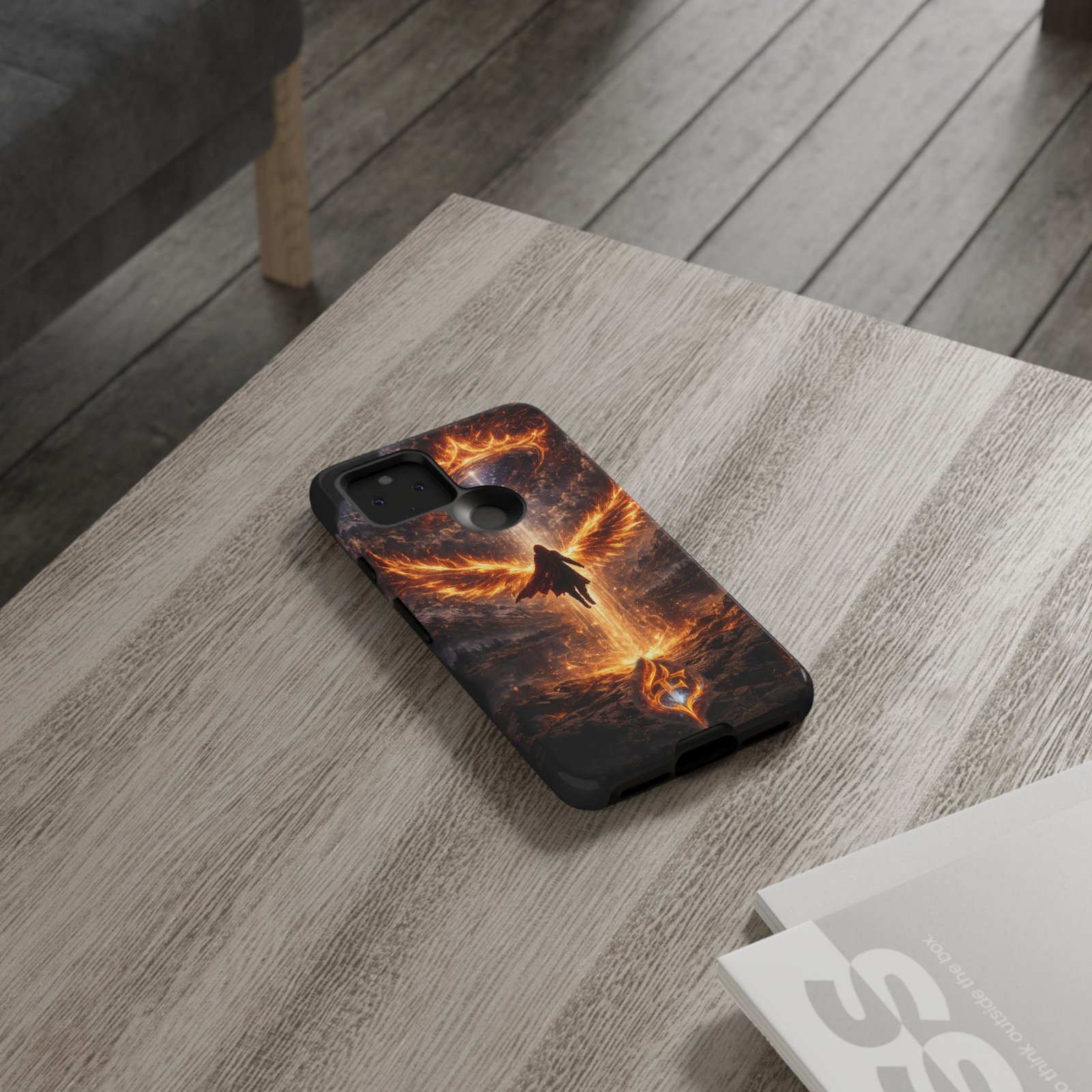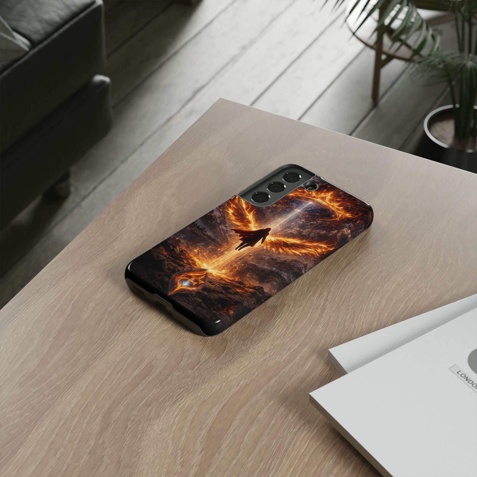 Slide your phone into armor that feels alive. This tough phone case pairs a dual-layer polycarbonate shell with a shock-absorbing TPU liner and a high-density 3D wrap print of a rising, fiery angel — wings unfurling into a halo of flame over a scorched landscape. It reads like a talisman in your hand: resilient, weather-resistant, and made to keep your device intact through daily drops and scrapes while keeping that dramatic artwork vivid. The slim profile preserves wireless charging and clear port access, and finishes are available in glossy or matte to match your look. Follow care notes to keep the colors sharp and the surface pristine.