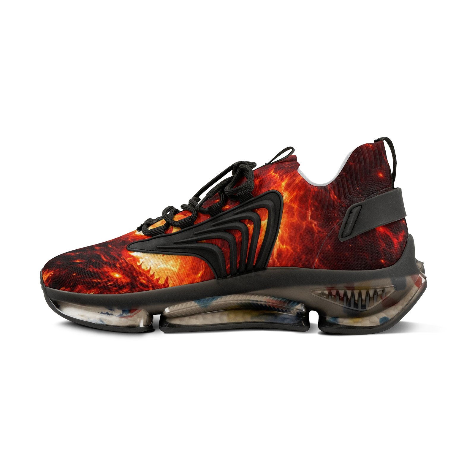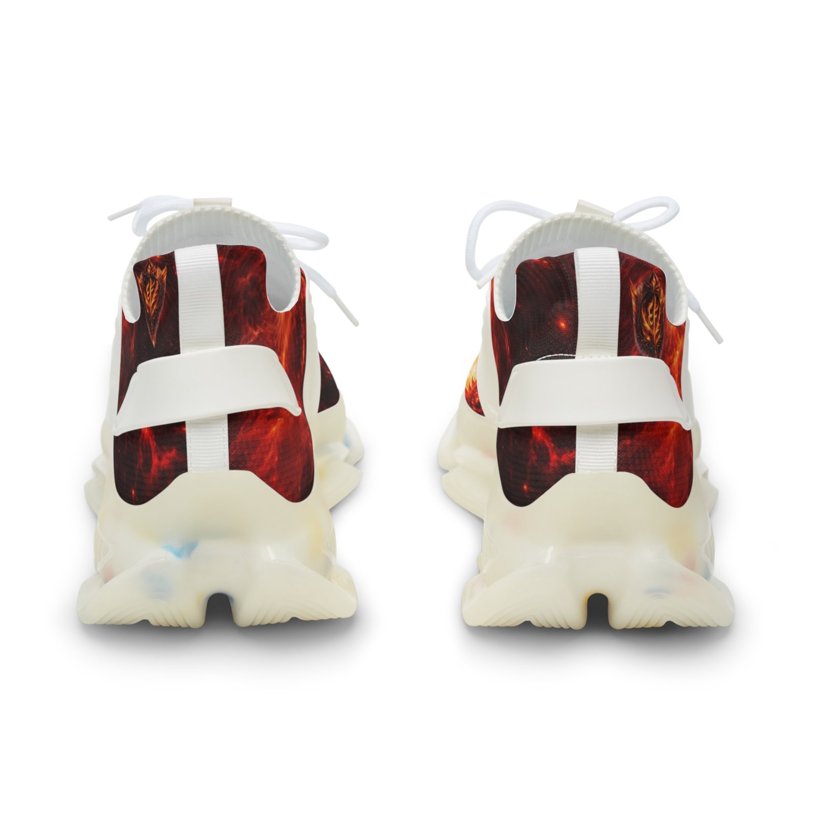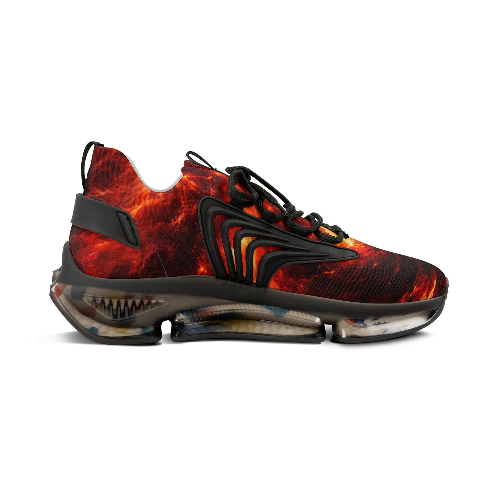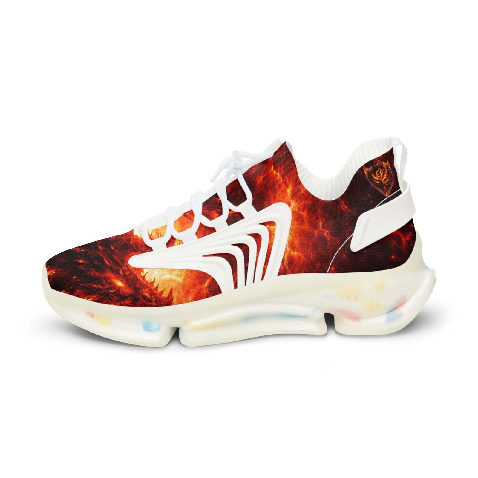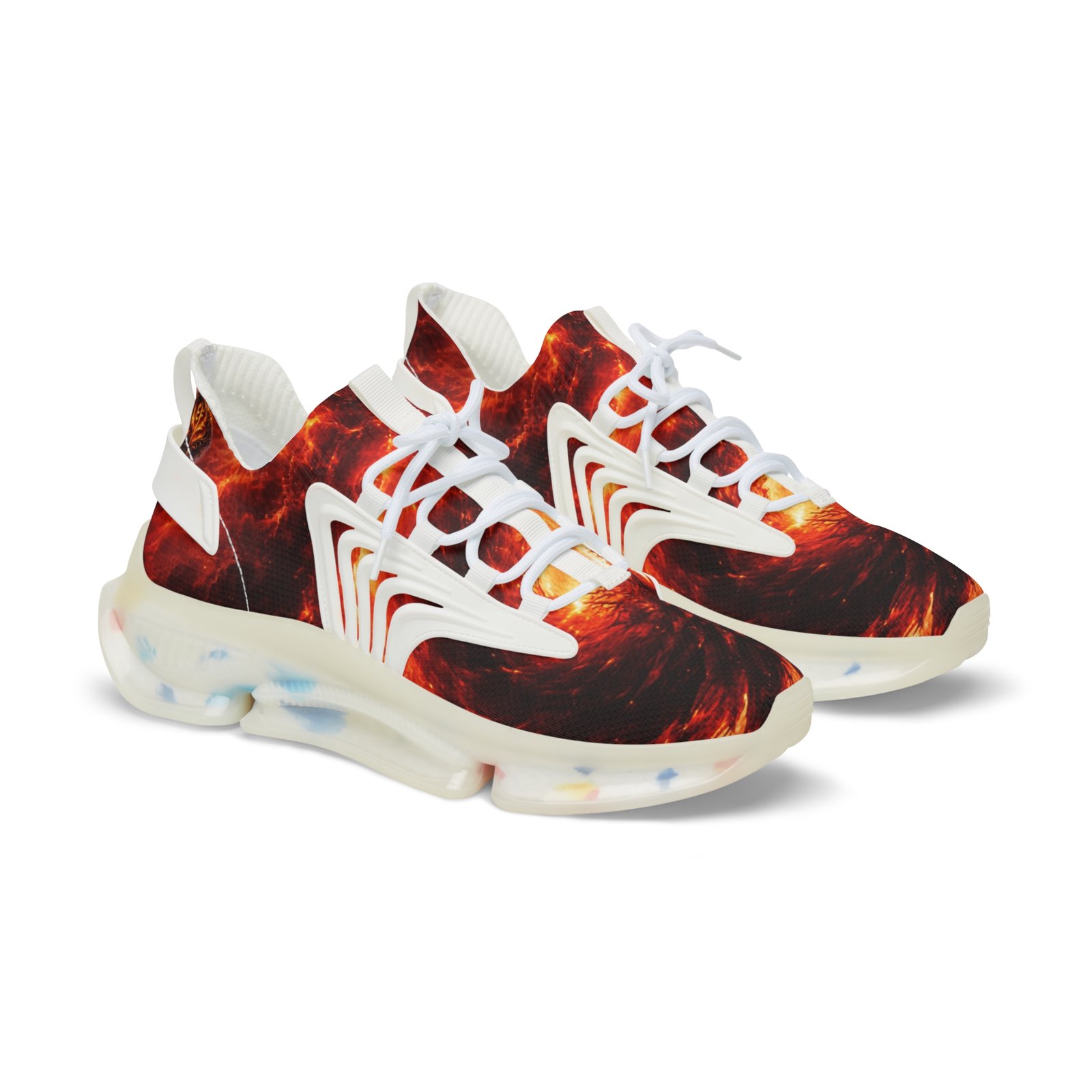 These lightweight mesh sneakers bring bold, kinetic energy to every step. The all-over fiery print wraps a breathable mesh-knit upper, while a cushioned EVA sole and deodorant memory foam insole absorb impact and keep feet fresh through long days. Durable KPU overlays hold structure and detail in wet or rough conditions. Lace-up closure and clean black or white detailing let you dial the look to your mood. Wear them when you want movement and color that feels alive — city streets, late-night meetups, or travel days where comfort matters as much as presence. Product features – Breathable mesh-knit polyester upper with full all-over print – Lightweight EVA shock-absorbing sole for responsive cushioning – Deodorant memory foam insole for breathable, odor-resistant comfort – Durable KPU (polyurethane elastomer) decorations that withstand weather – Lace-up closure with contrasting black or white detailing and matched stitching Care instructions – To maintain clean, use warm water with dish soap to clean off any dirt spots. It’s not necessary to soak the whole item. For hard-to-clean spots, use a soft-bristled brush.