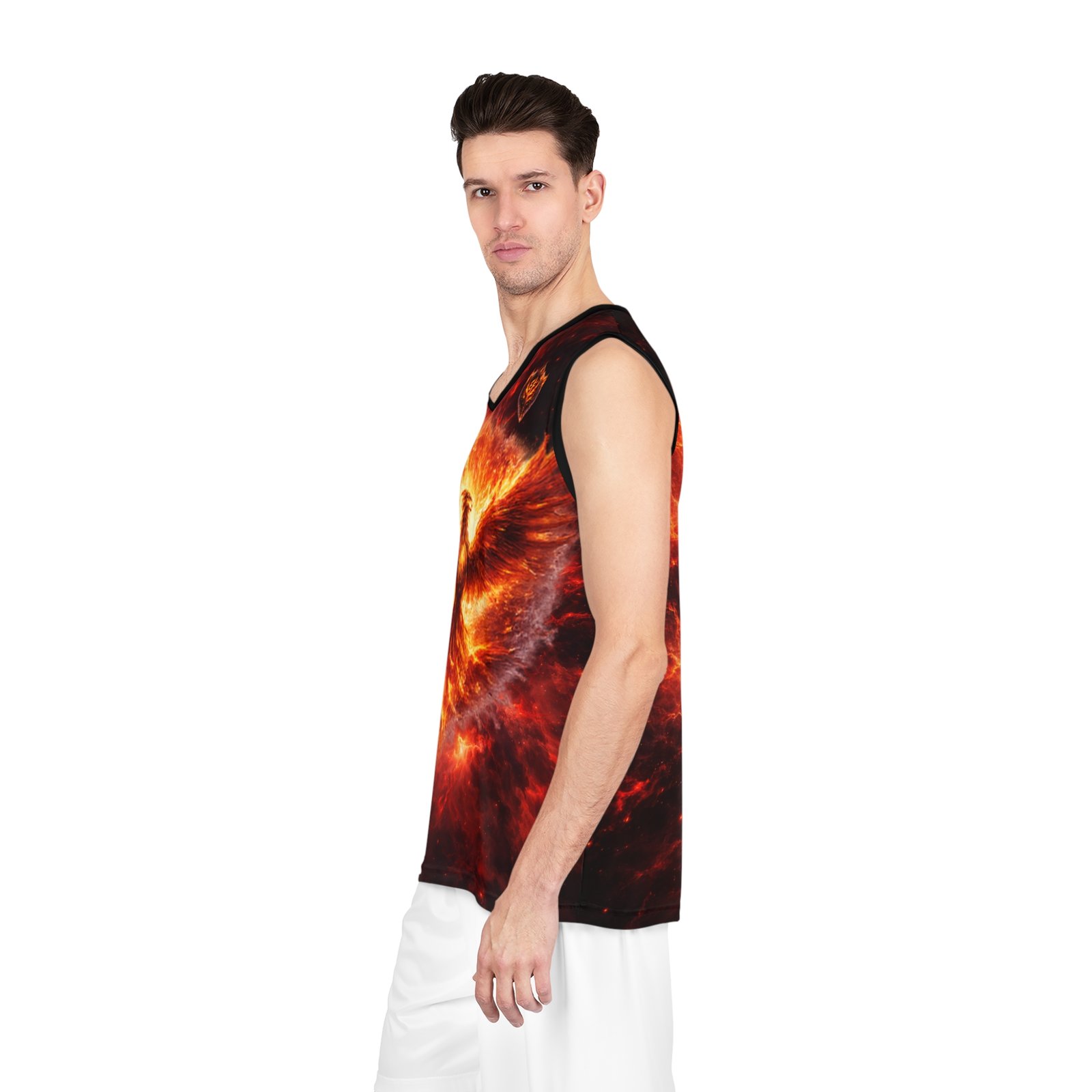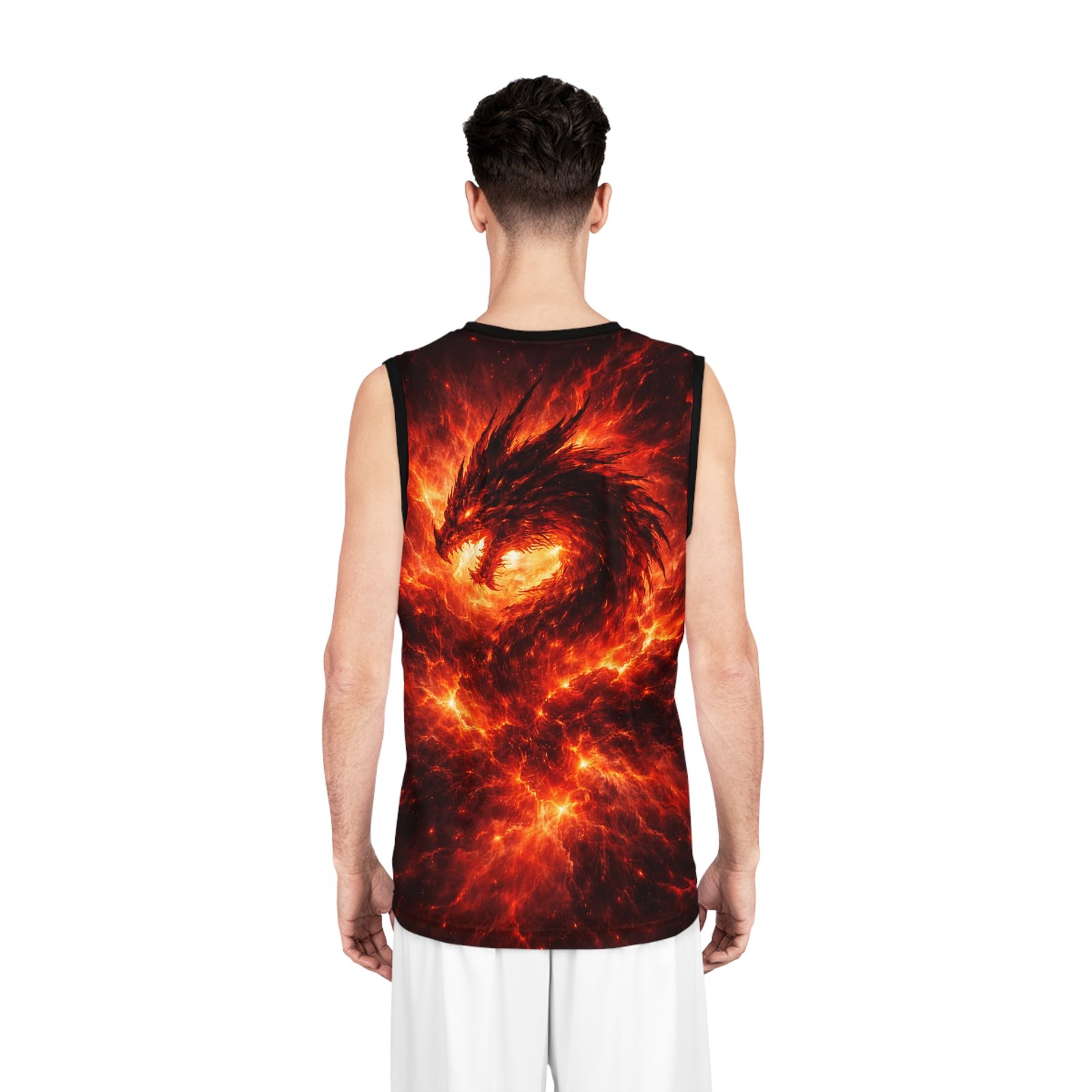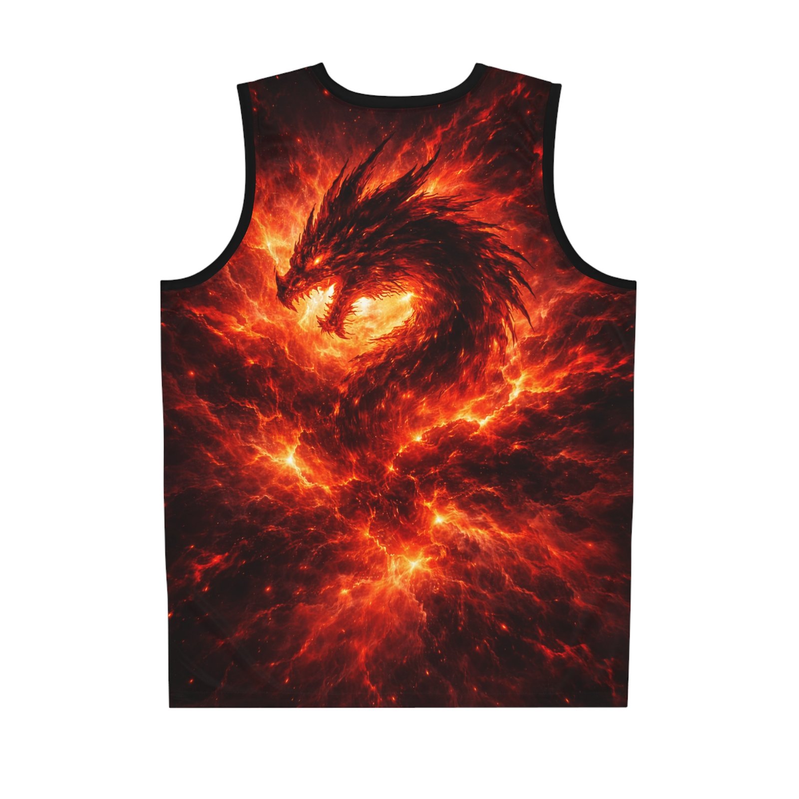 This all-over print basketball jersey channels raw fire and myth — a phoenix rising in molten light across the front, and a coiling, ember-dragon on the back. The imagery feels alive: roaring heat, drifting sparks, and deep, shadowed contrast that makes the colors pop in motion. Lightweight and breathable, it moves with you on the court or through a crowded street, carrying an untamed energy that suits players and fans who want their gear to tell a story. Wear it when you need to feel fierce and focused — when the game tightens, when you want to stand out during pickup, or when you’re heading to a themed event and want an intense, dramatic look.
