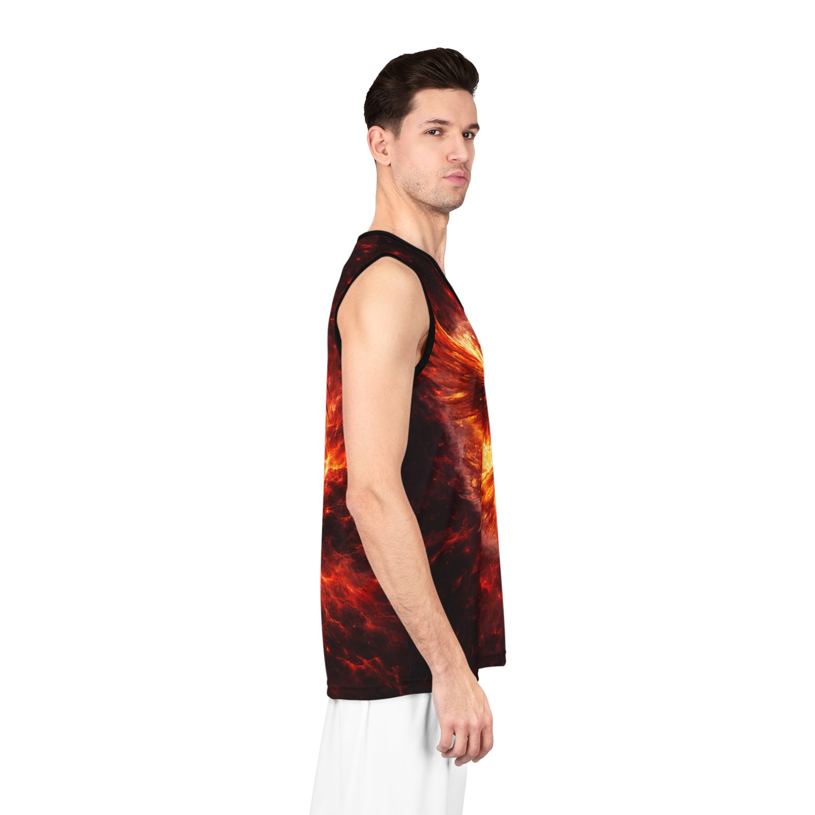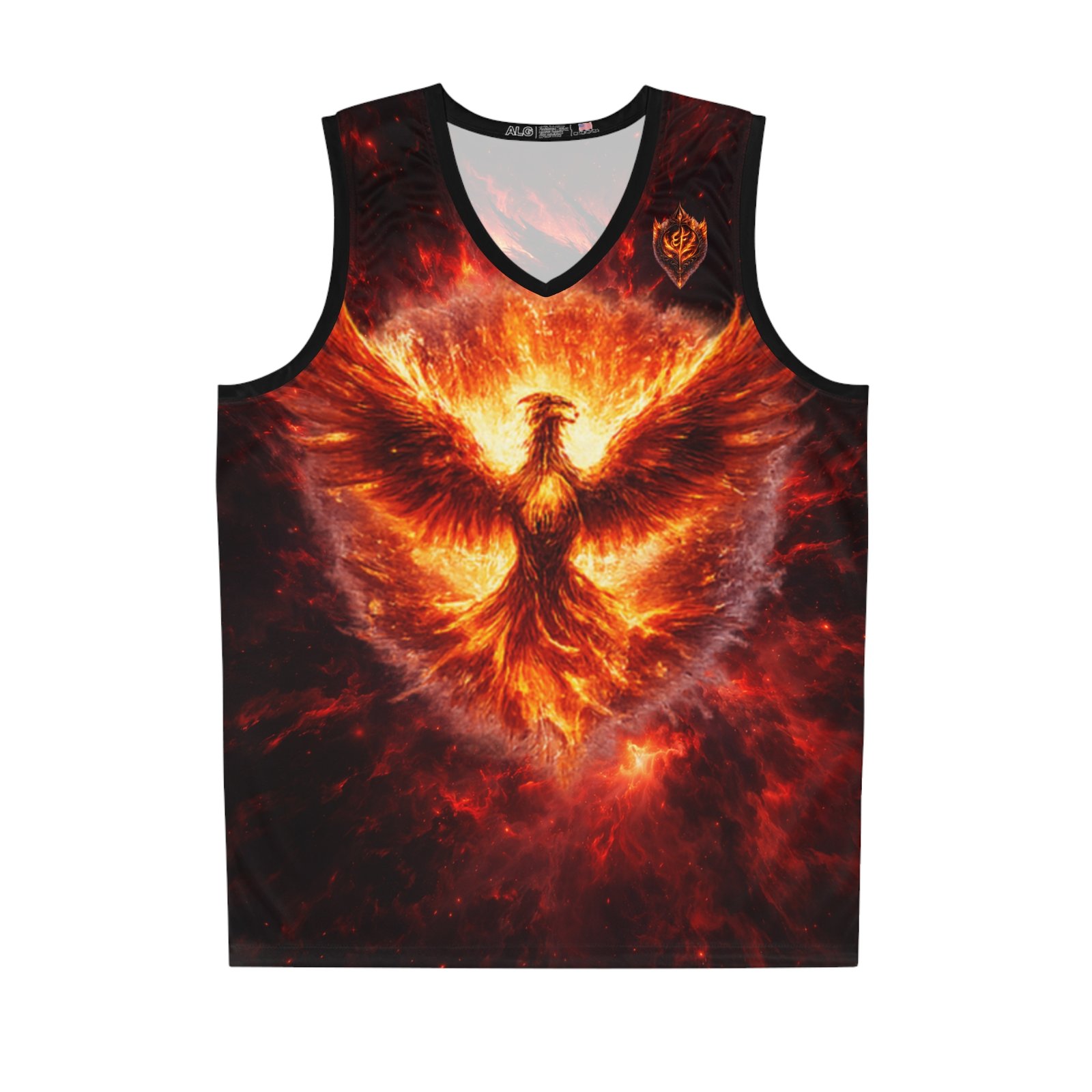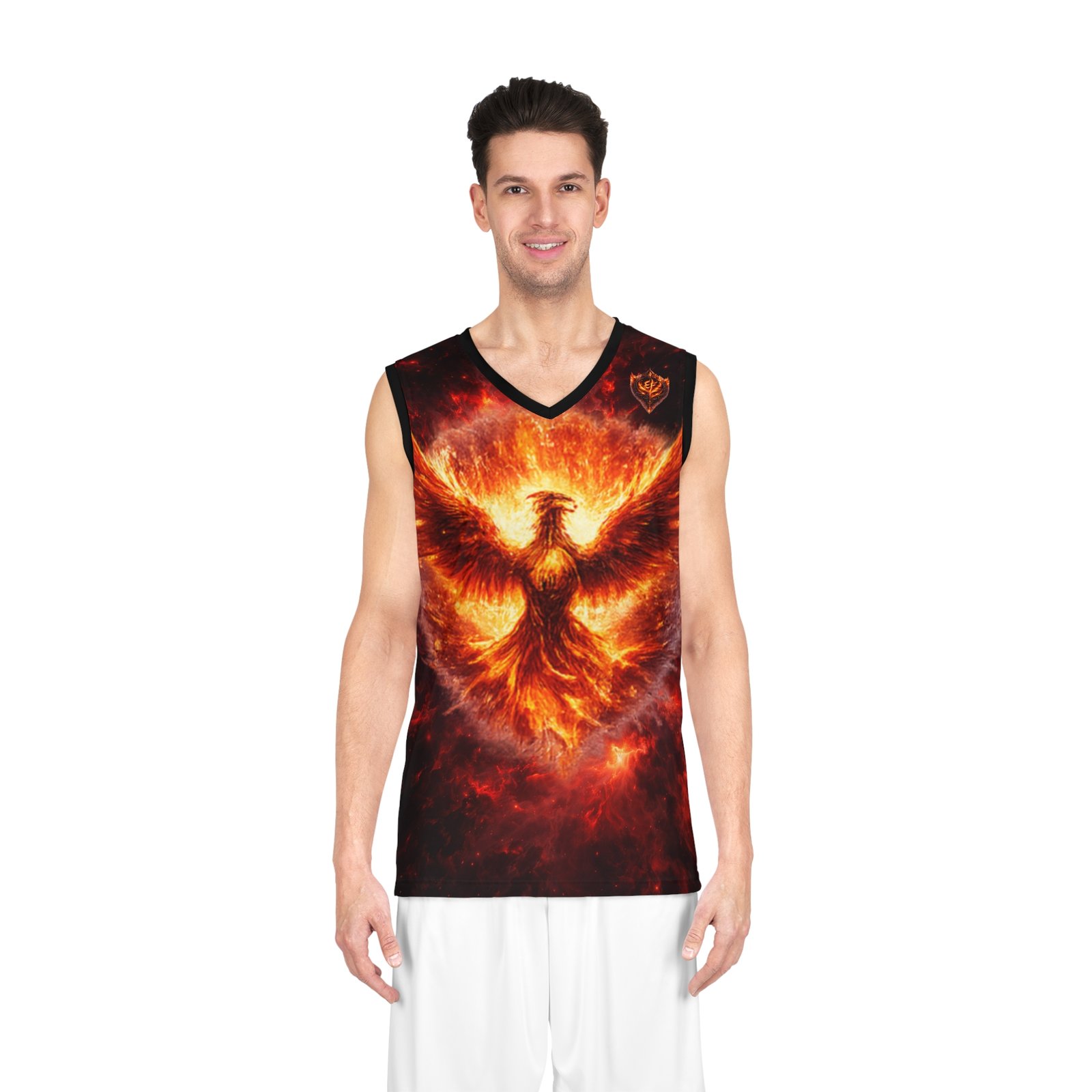This all-over print basketball jersey channels raw fire and myth — a phoenix rising in molten light across the front, and a coiling, ember-dragon on the back. The imagery feels alive: roaring heat, drifting sparks, and deep, shadowed contrast that makes the colors pop in motion. Lightweight and breathable, it moves with you on the court or through a crowded street, carrying an untamed energy that suits players and fans who want their gear to tell a story. Wear it when you need to feel fierce and focused — when the game tightens, when you want to stand out during pickup, or when you’re heading to a themed event and want an intense, dramatic look.