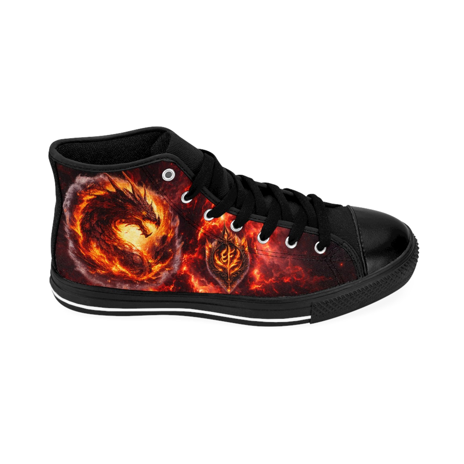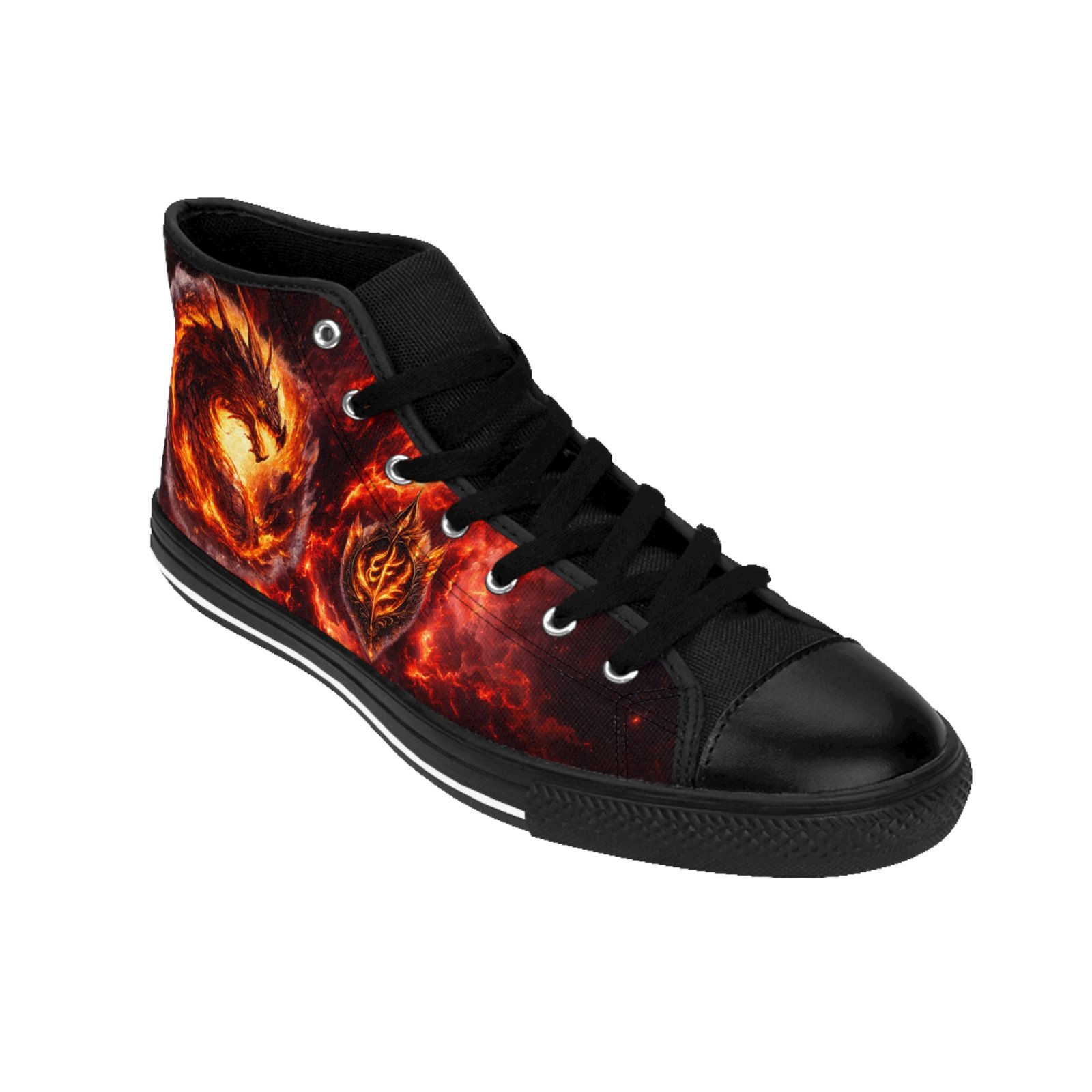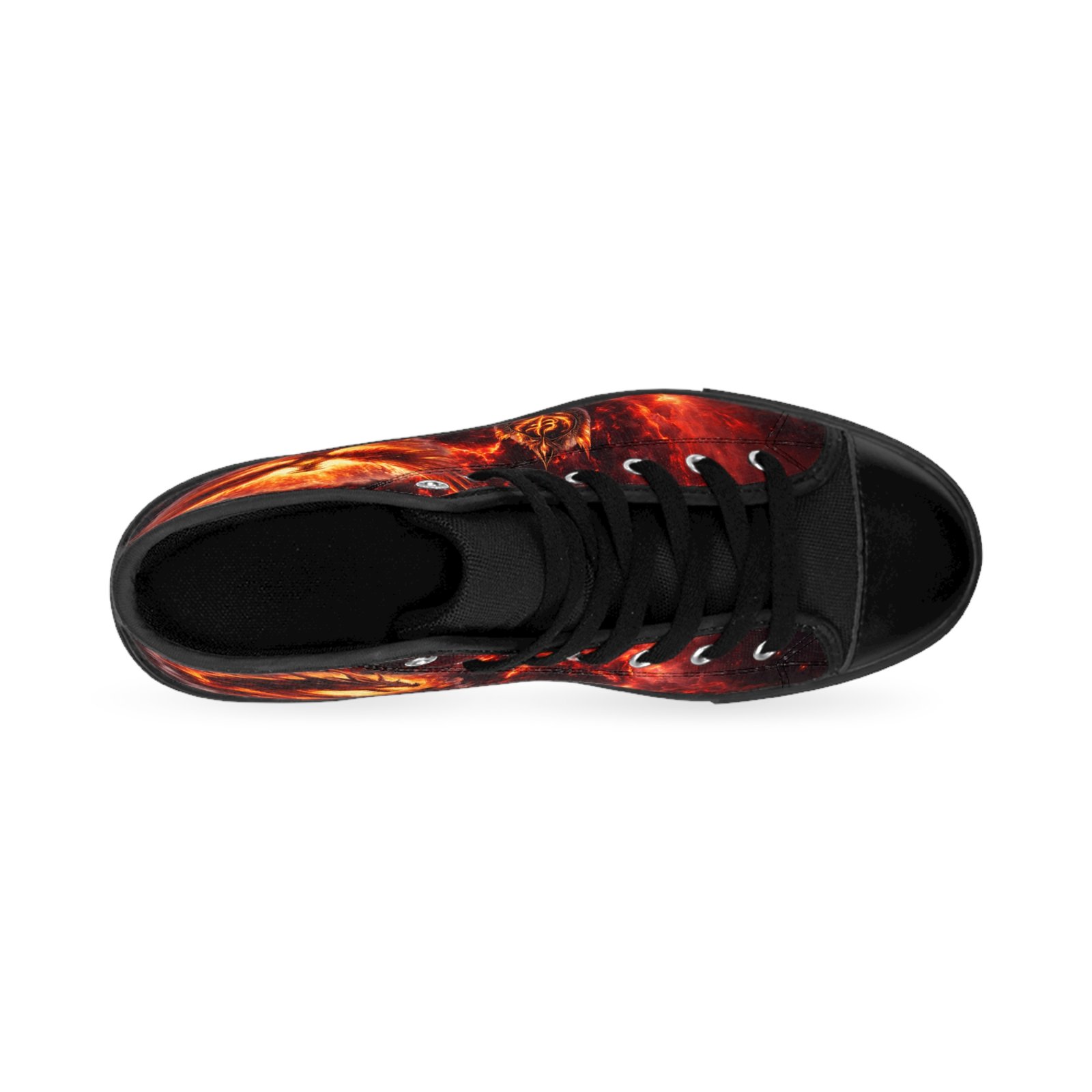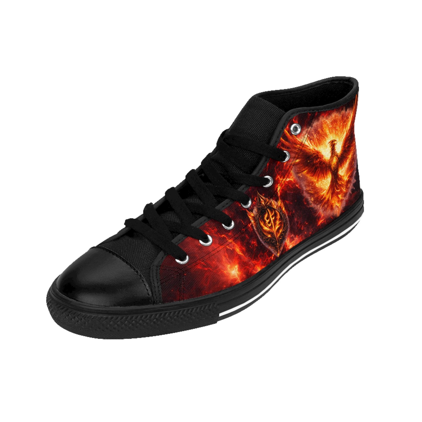 These high-top sneakers carry a fierce, fire-forged energy — bold phoenix and ember motifs swirl across a deep black nylon canvas for a look that’s equal parts mythic and streetwise. The cushioned foam insole keeps steps light and breathable while the reinforced pleather toe and durable rubber outsole stand up to everyday wear. Silver metal eyelets, black stitching, and a 5″ calf height give these shoes a rugged, finished silhouette that pairs with faded denim, leather jackets, or layered festival outfits. Wear them when you want your footwear to do the talking: raw, warm, and alive with movement.