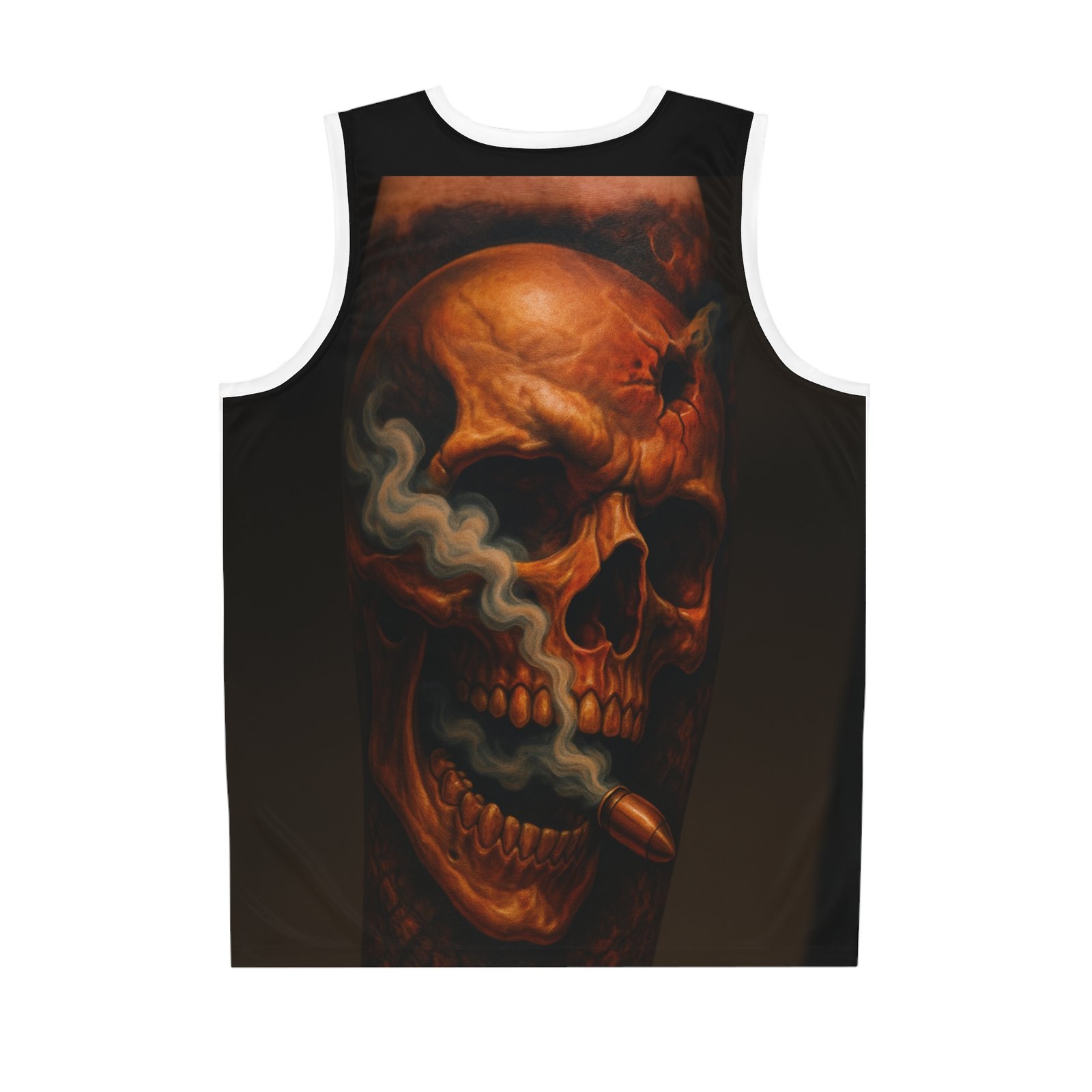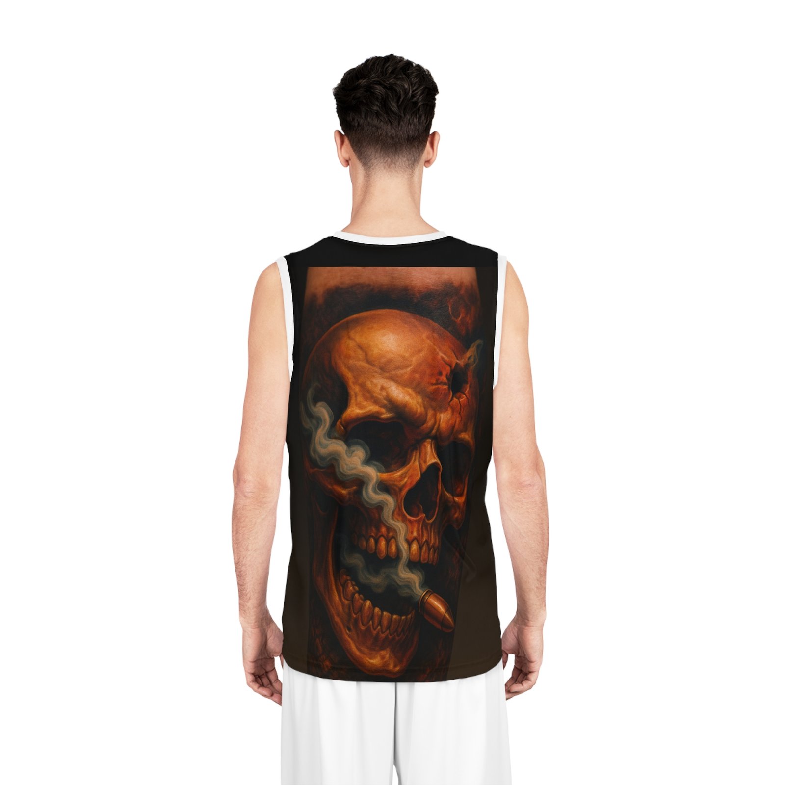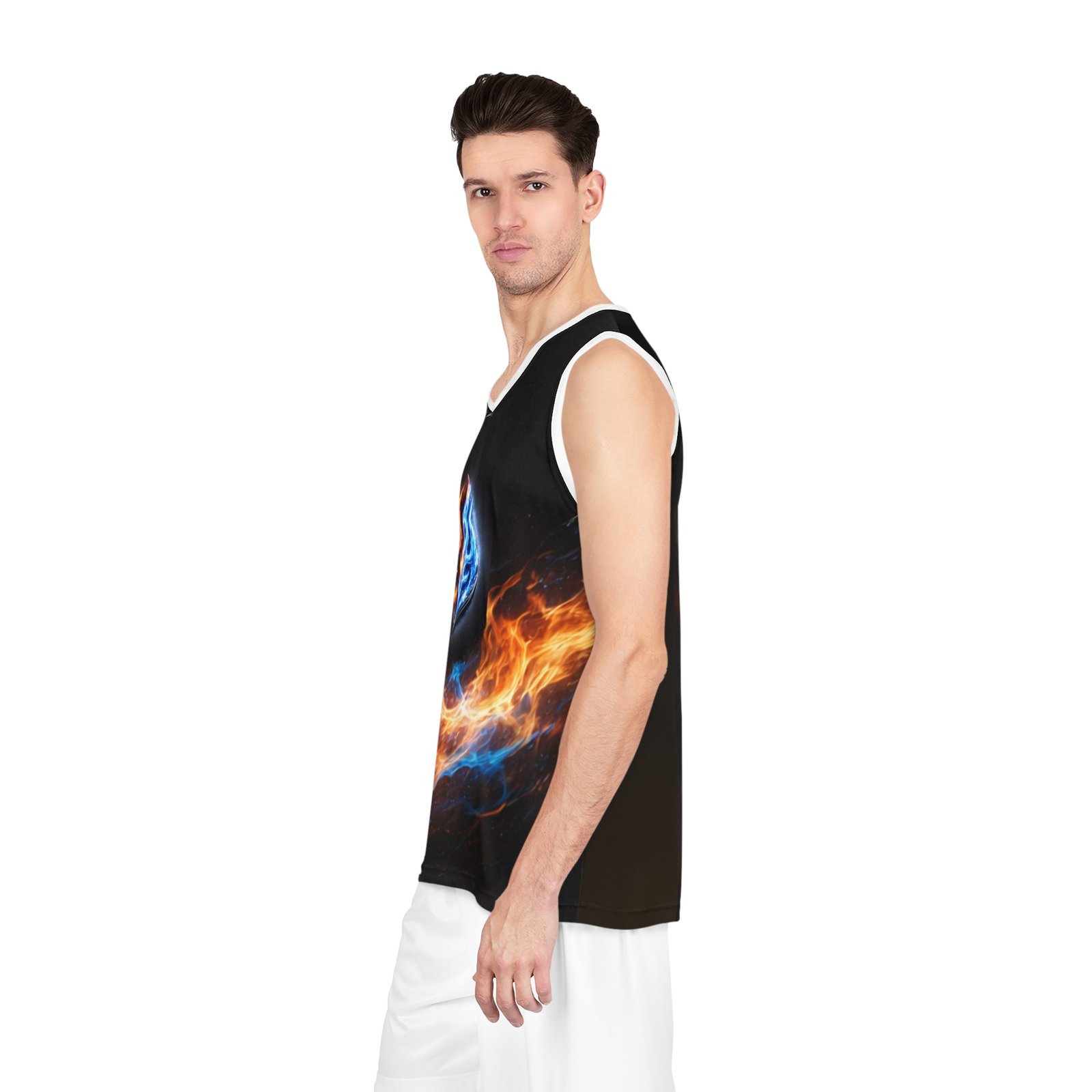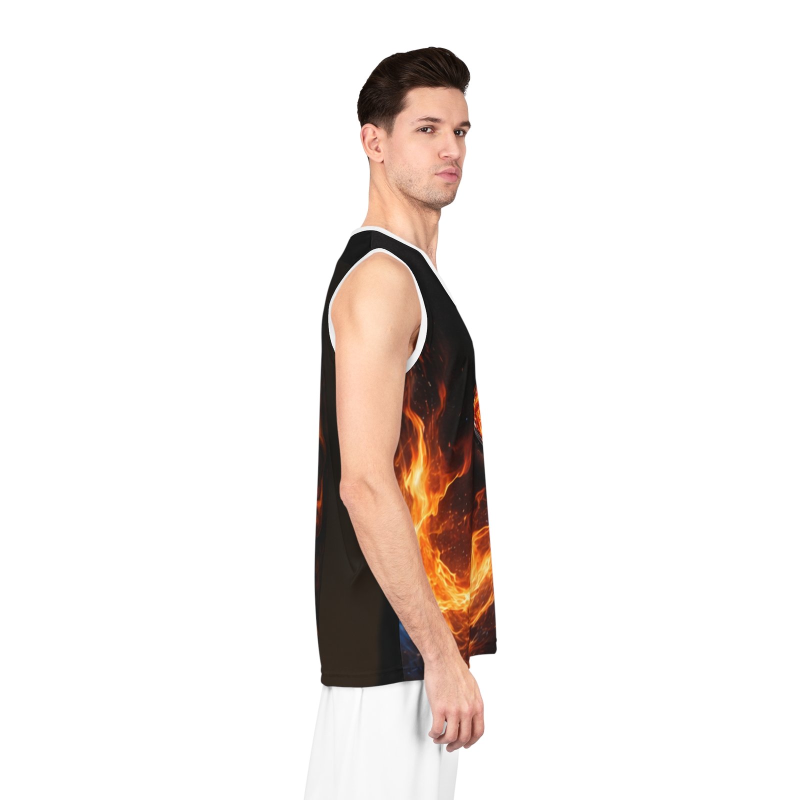 This lightweight basketball jersey brings bold, graphic energy to the court and the streets. Burnished flames and a striking elemental emblem meet a smoky, skull-backed design to create a look that’s equal parts fierce and cinematic. The extra-light, moisture-wicking polyester keeps you cool through fast breaks and late-night pickup games, while double-needle seams and side seams hold the shape through practice and wear. Wear it solo for hot-weather play or layered over a long sleeve when the evening cools — it carries attitude without slowing you down.
