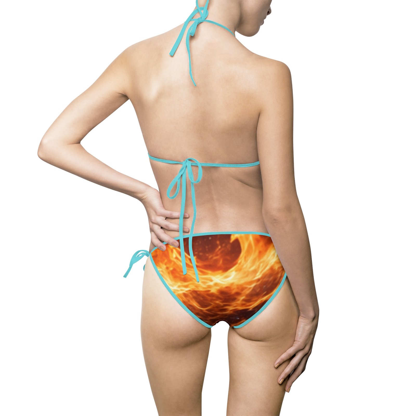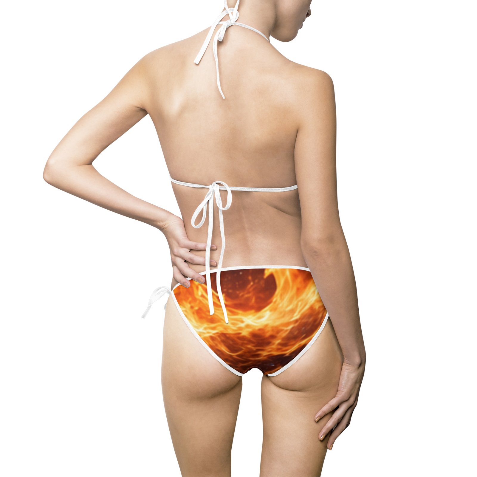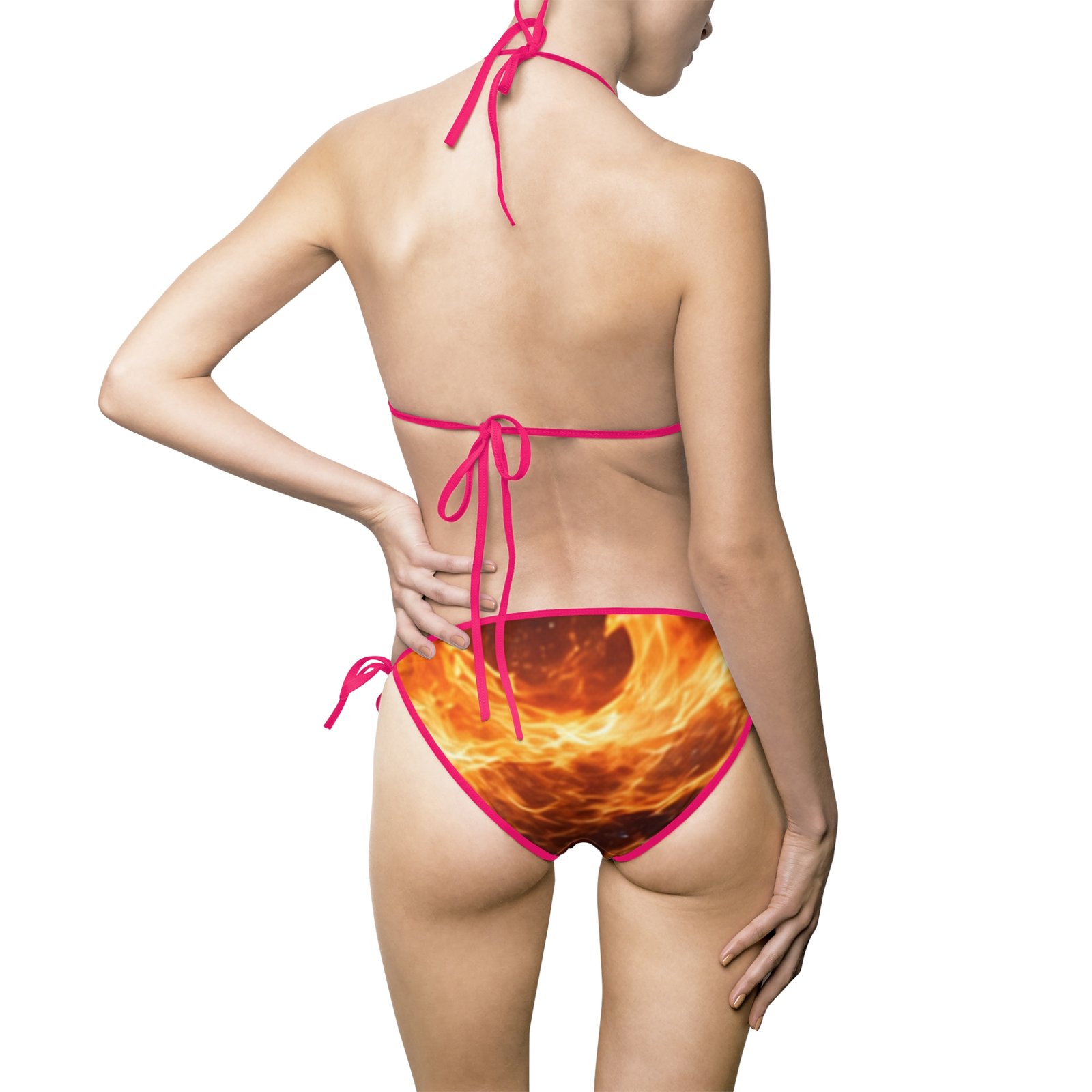 A bold, fire-print bikini made for confident summer days and late-night bonfires. Lightweight fabric and stretchy polyester-spandex blend move with you — swim, dance, or lounge — while removable padding lets you adjust shaping and coverage. The tie-side bottoms and adjustable halter straps create a customized fit that flatters curves and stays comfortable under sun and surf. The all-over vibrant print keeps its color after repeated wear, so the flame motif stays vivid through beach weekends and pool parties. Product features – 85% polyester / 15% spandex for strong stretch and durability – Lightweight fabric (146 g/m²) for comfortable, breathable wear – Removable padded inner lining for customizable shaping – Adjustable tie-side bottoms and elastic halter straps for a tailored fit – Vibrant, high-resolution all-over print that resists fading Care instructions – Do not dryclean – Iron, steam or dry: low heat – Dry flat – Do not bleach – Machine wash: warm (max 40C or 105F)