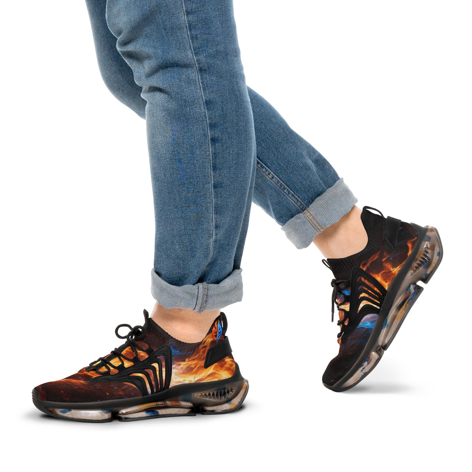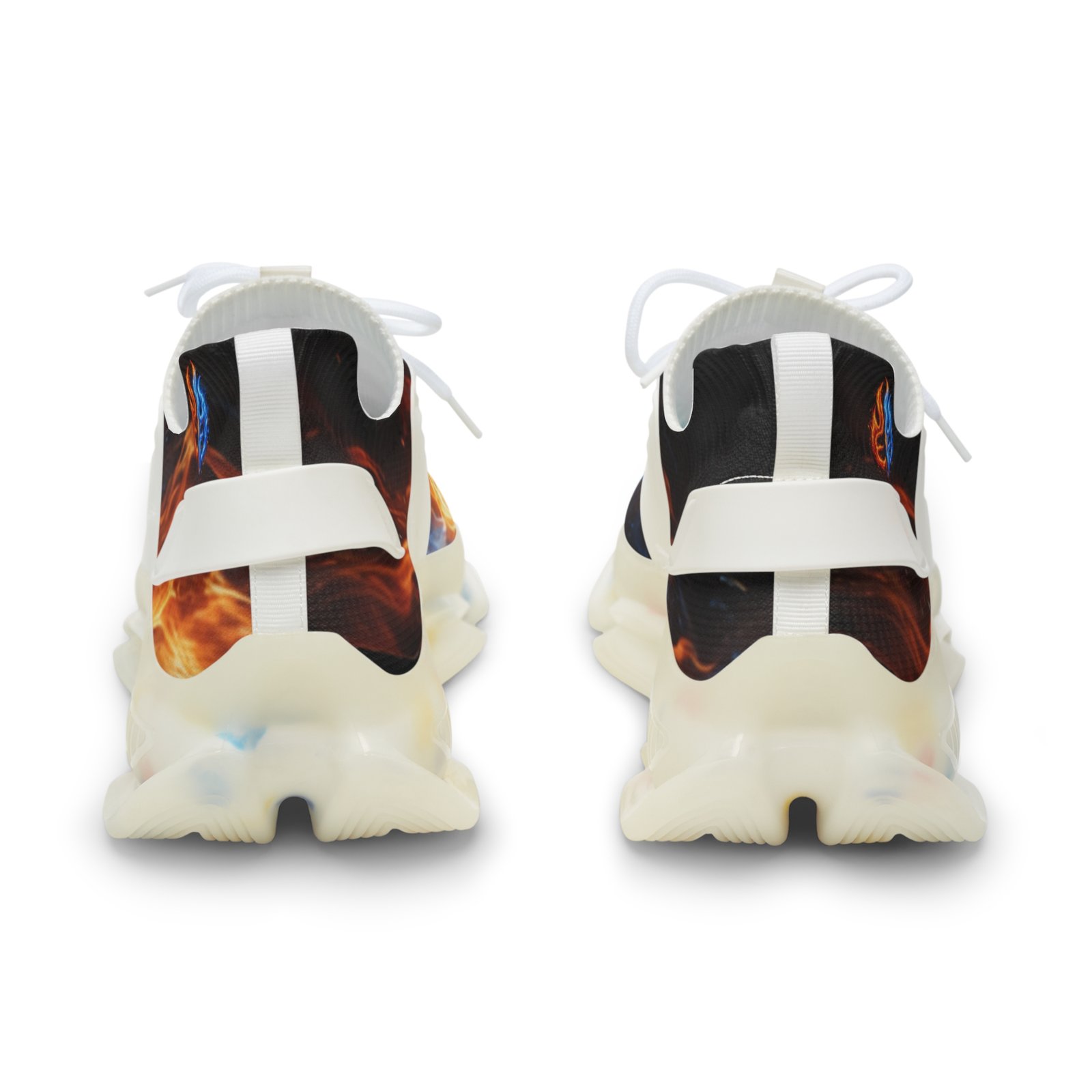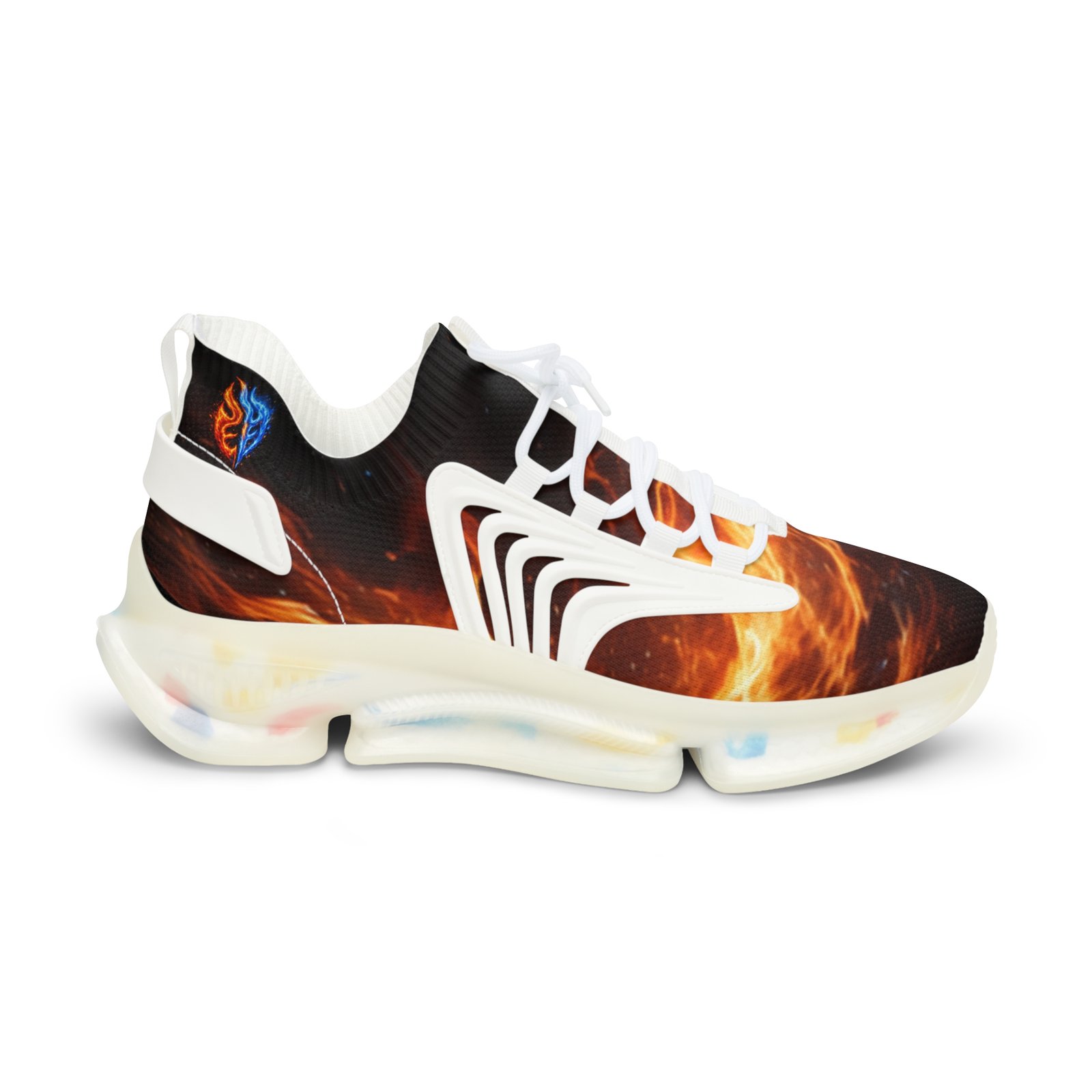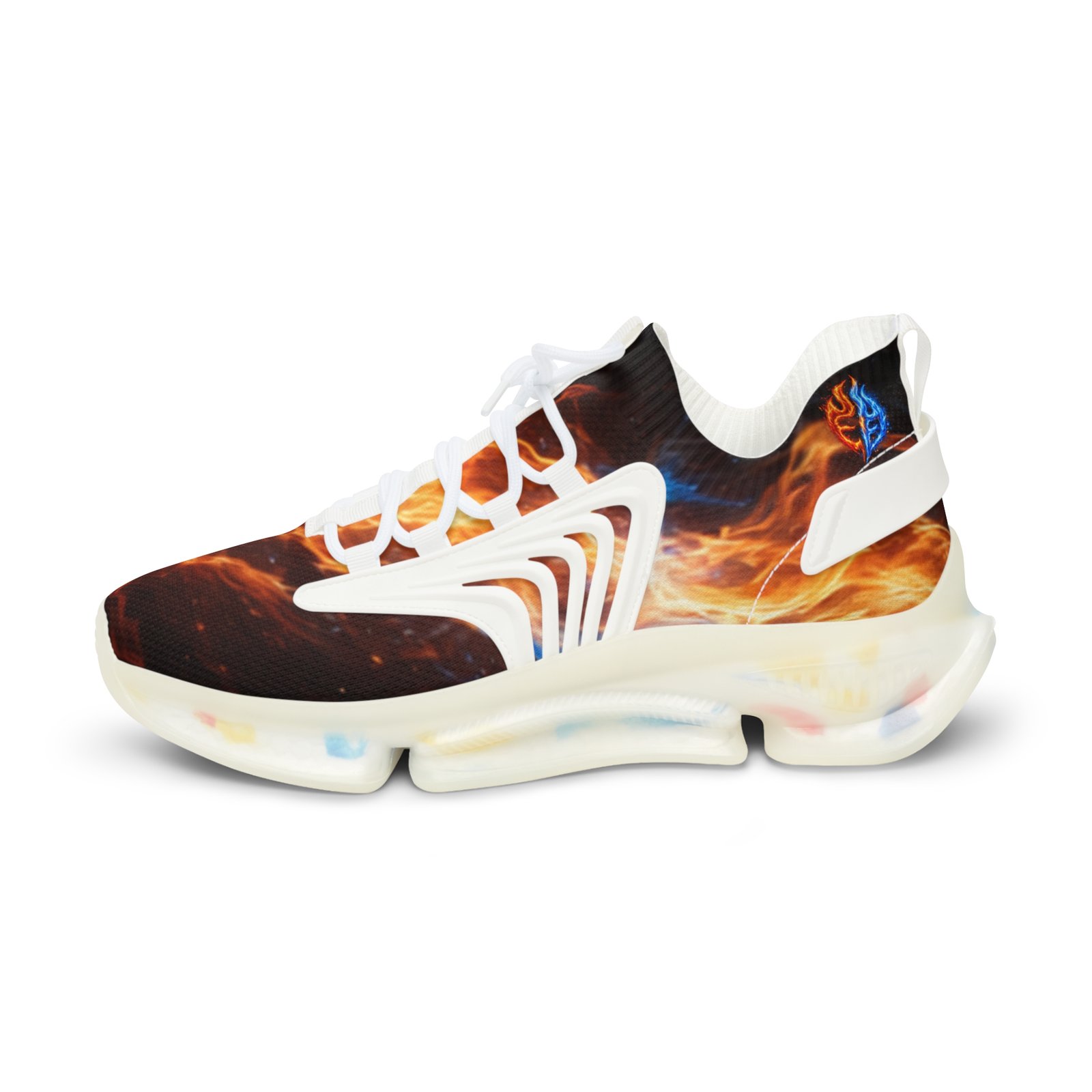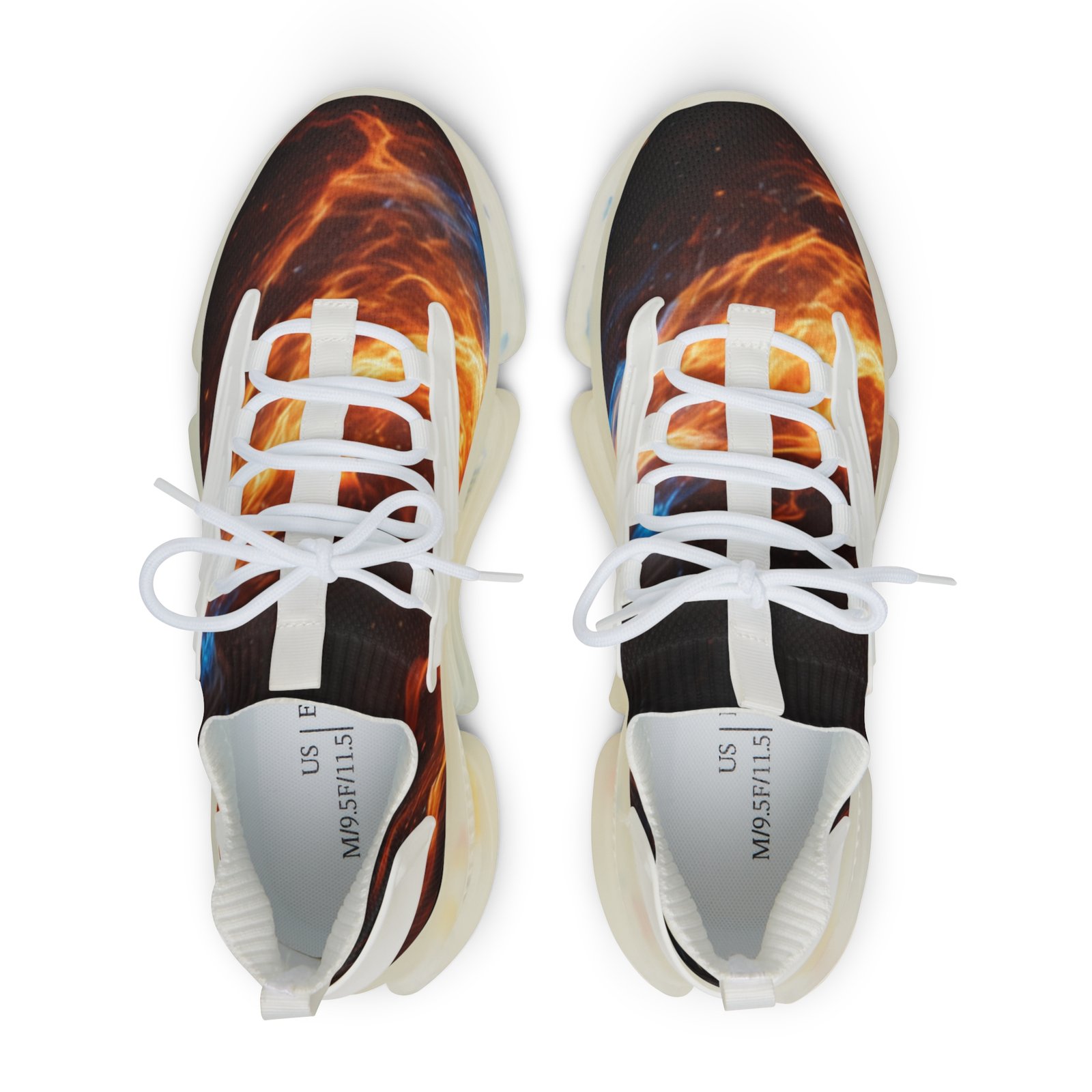 Lightweight mesh sneakers that blend bold, dynamic graphics with everyday comfort. The breathable knit upper carries an all-over fiery print that feels energetic and expressive. A soft, deodorant memory-foam insole cushions each step and helps keep feet cool. The EVA-backed sole with TPU shock-absorbing layer adds flexible support while KPU overlays reinforce high-wear areas for weather-ready durability. Clean lace-up styling and contrasting black or white detailing let the design pop, whether you’re pacing city streets or heading out for a weekend of creative errands. Product features – All-over print on breathable mesh-knit polyester upper – Deodorant memory-foam insole for breathability and cushioning – EVA + TPU sole with shock-absorbing layer for lightweight support – Durable KPU (polyurethane elastomer) decorative overlays – Lace-up closure with black or white detailing and matching stitching Care instructions – To maintain clean, use warm water with dish soap to clean off any dirt spots. It’s not necessary to soak the whole item. For hard-to-clean spots, use a soft-bristled brush.